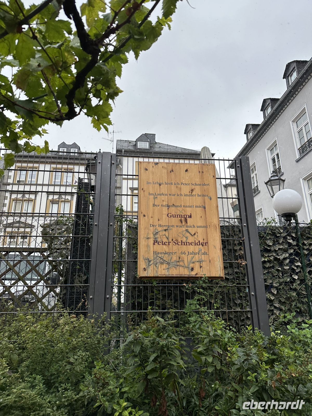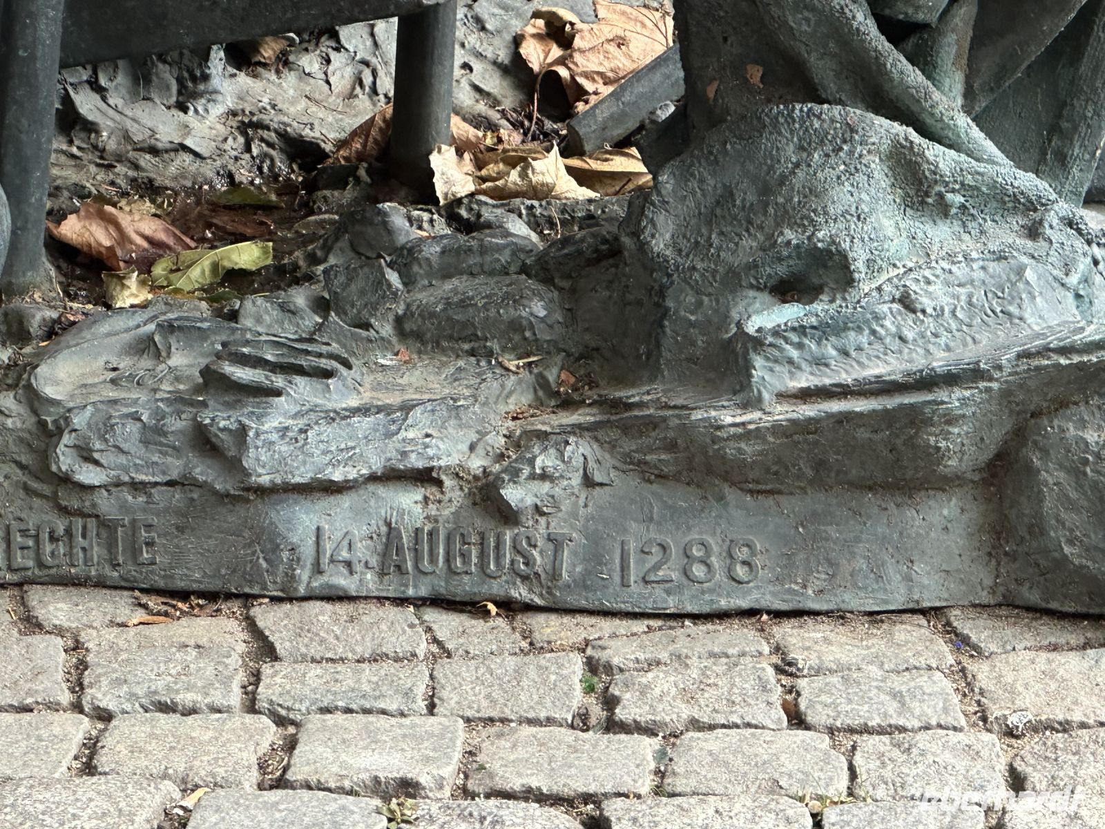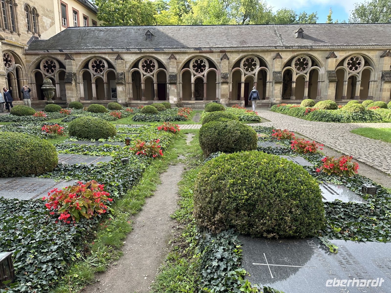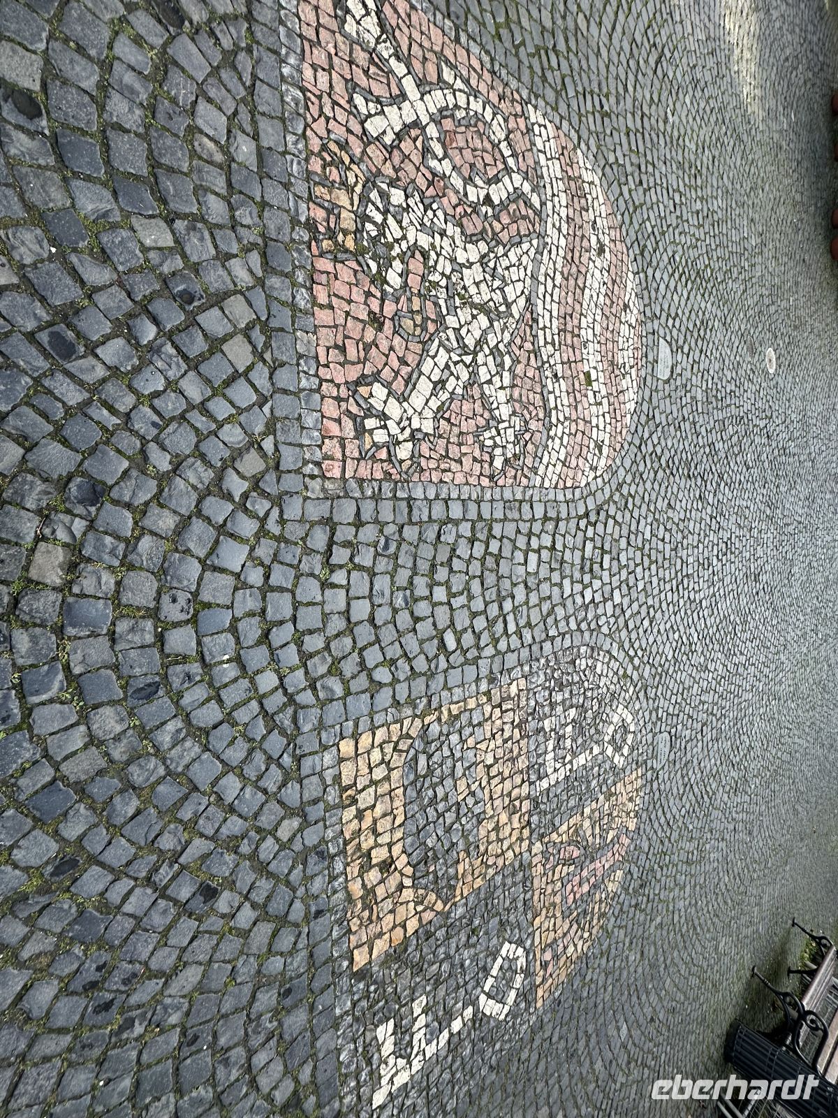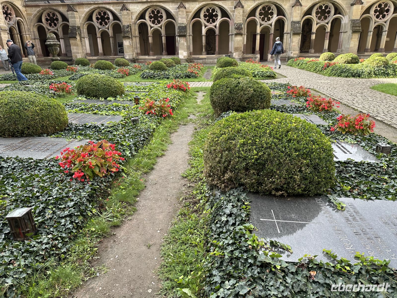 Wir fahren nun zum Schlossberg, wo wir unsere Mittagspause einlegen. Anschließend stellt uns Gabi, unsere Stadtführerin das „Unsichtbare Denkmal“ vor. Es ist kein herkömmliches Denkmal, das man sehen kann, sondern besteht aus 2.146 individuell gestalteten Pflastersteinen, die die Namen jüdischer Friedhöfe in Deutschland tragen. Die Steine wurden bei den Sanierungsarbeiten am Schlossplatz in den 1990er Jahren in den Boden eingelassen und von oben mit Platten abgedeckt. So entstand ein Denkmal, das zwar existiert, aber nicht sichtbar ist. Die Idee dahinter ist, die Erinnerung an die Opfer nicht öffentlich zur Schau zu stellen, sondern in den Alltag der Menschen zu integrieren.