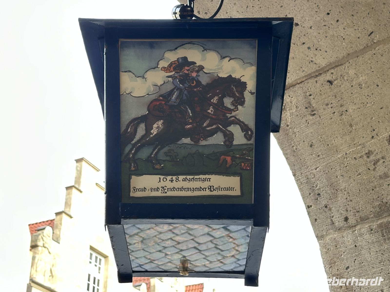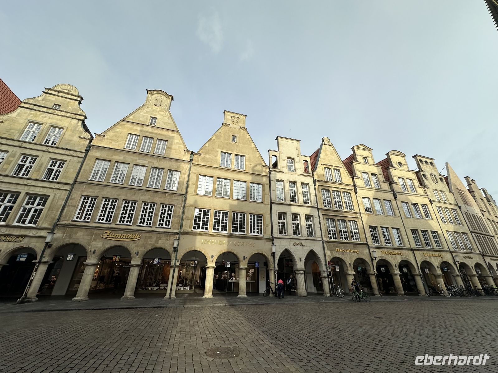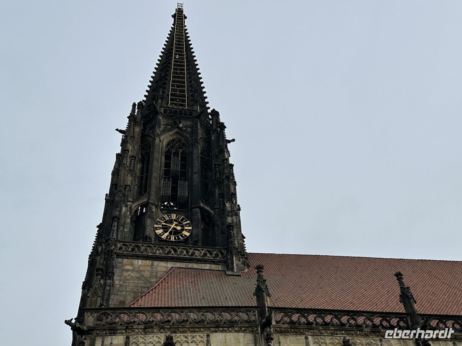 Wir verlassen vorübergehend den Reisebus und gehen zu Fuß weiter. Wir kommen an den wichtigsten Sehenswürdigkeiten von Münster vorbei. So zum Beispiel am historischen Rathaus. Das Rathaus, auch als das Rathaus des Westfälischen Friedens bezeichnet, ist eines der wichtigsten und bekanntesten Bauwerke der Stadt. Es liegt am Prinzipalmarkt im Herzen Münsters und ist ein Meisterwerk der gotischen Architektur. Das Rathaus wurde im 14. Jahrhundert erbaut. Wir bewundern die beeindruckende Fassade mit den drei markanten Giebeln und den hohen Fenstern. Im Inneren befindet sich der berühmte Friedenssaal, in dem am 15. Mai 1648 der Spanisch-Niederländische Friedensvertrag unterzeichnet wurde – ein Schlüsselereignis, das zum Ende des Dreißigjährigen Krieges beitrug. Zum Hineingehen haben wir jedoch keine Zeit. Wir spazieren weiter bis zur St. Lamberti-Kirche aus dem 14. Jahrhundert, die für ihre historische Verbindung zu den Wiedertäufern bekannt ist. Am Turm der Kirche hängen drei eiserne Körbe, die als Täuferkäfige bezeichnet werden. Der historische Hintergrund dazu ist das sogenannte Täuferreich zu Münster, eine radikal-reformatorische Bewegung, die von 1534 bis 1535 die Herrschaft in der Stadt innehatte. Die Anführer dieser Bewegung, Jan van Leiden, Bernhard Knipperdolling und Bernd Krechting, wurden nach der Niederschlagung der Täuferherrschaft im Jahr 1536 öffentlich hingerichtet. Ihre Leichen wurden anschließend zur Abschreckung in den drei Körben an den Kirchturm gehängt. Die Körbe sind bis heute ein markantes Mahnmal der Stadtgeschichte. Wir betreten Lamberti durch eine ungewöhnliche Tür. Der barrierefreie Eingang ist eine spezielle Glastür, die als Kunstwerk konzipiert wurde. Nach der Besichtigung schlendern wir über den Prinzipalmarkt zum St. Paulus Dom. Hier steht im Mittelpunkt der Besichtigung der Astronomischen Uhr, ein Meisterwerk aus dem 16. Jahrhundert, das Kunst, Wissenschaft und Handwerk vereint. Sie ist eine der wenigen vollständig erhaltenen astronomischen Großuhren aus dieser Zeit. Die Uhr besteht aus mehreren Teilen: dem Zifferblatt und Planetenzeiger: Das Hauptzifferblatt ist ein kreisförmiges Astrolabium. Es zeigt nicht nur die Uhrzeit an, sondern auch die Positionen der damals bekannten sieben Planeten (Sonne, Mond, Merkur, Venus, Mars, Jupiter, Saturn) sowie die Tierkreiszeichen. Eine Besonderheit ist, dass die Uhr entgegen dem heutigen Uhrzeigersinn linksherum läuft. Der nächste Teil ist das Kalendarium: Im unteren Teil befindet sich eine Kalenderscheibe, die das Datum, den Wochentag, den Monat und sogar die beweglichen Feiertage wie Ostern anzeigt. Das Originalkalendarium war bis 2071 ausgelegt. Und das Figurenspiel: Jeden Tag um 12 Uhr mittags findet ein kleines Spektakel statt. Ein Glockenspiel ertönt und eine Figur des Todes schlägt die Glocke zur vollen Stunde. Danach ziehen die Heiligen Drei Könige an einer Figur der Muttergottes mit dem Jesuskind vorbei und verneigen sich.
