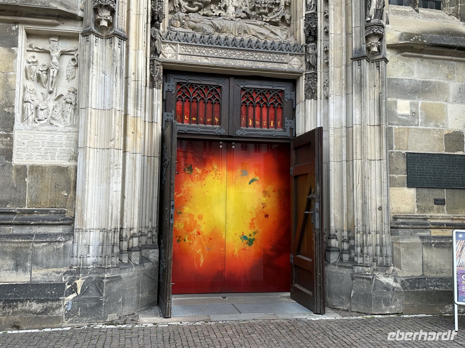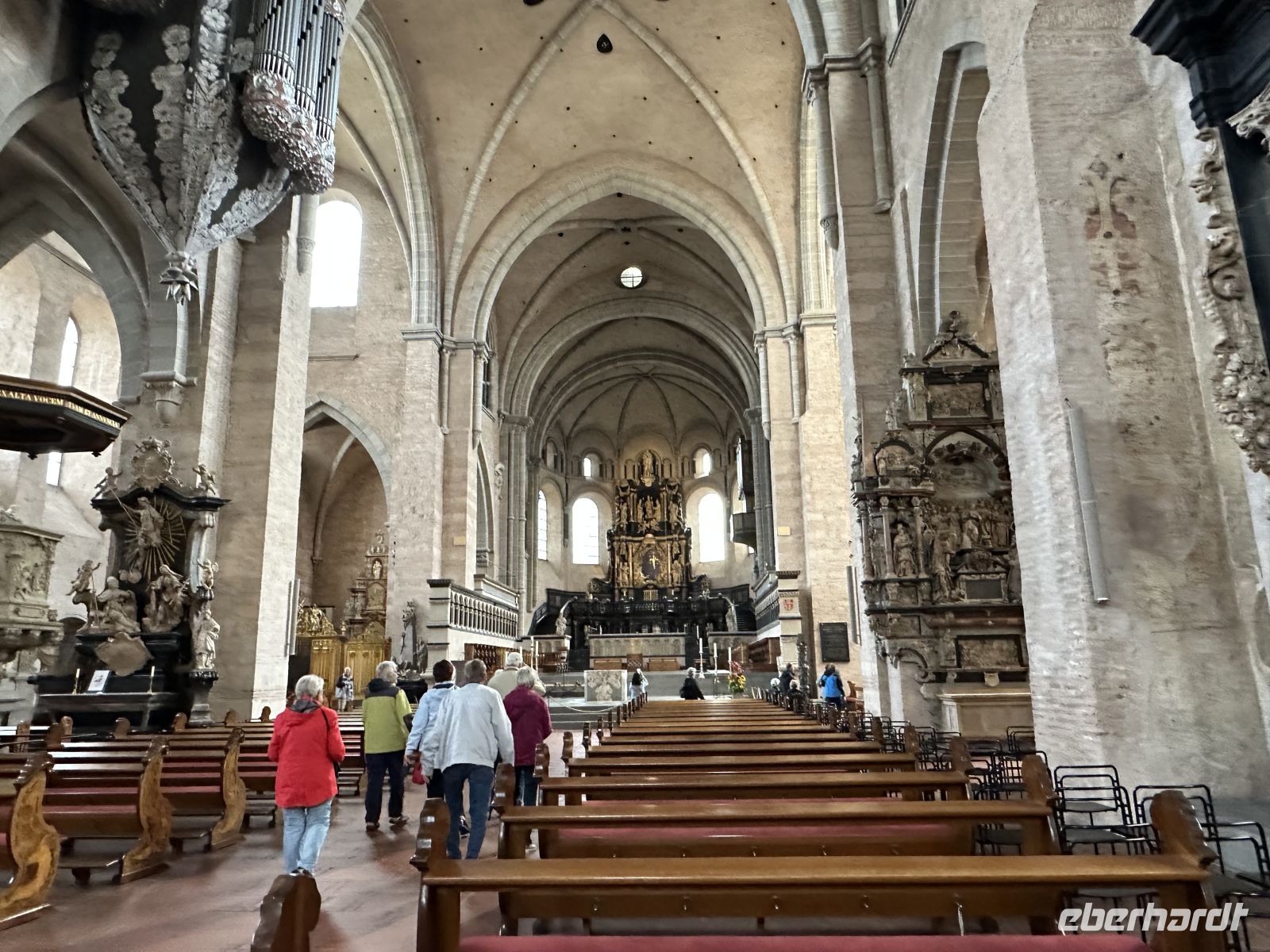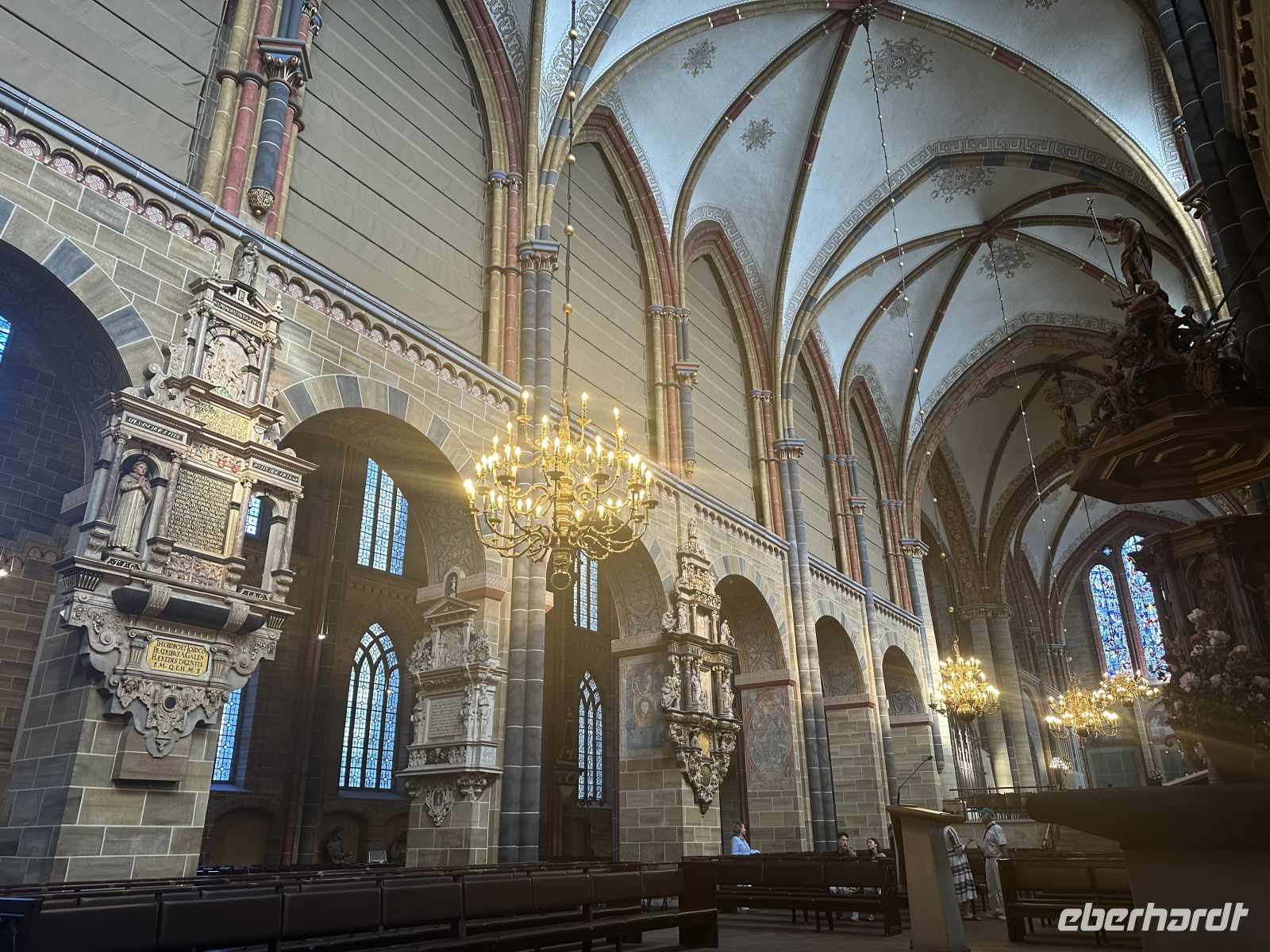 Wir verlassen vorübergehend den Reisebus und gehen zu Fuß weiter. Wir kommen an den wichtigsten Sehenswürdigkeiten von Münster vorbei. So zum Beispiel am historischen Rathaus. Das Rathaus, auch als das Rathaus des Westfälischen Friedens bezeichnet, ist eines der wichtigsten und bekanntesten Bauwerke der Stadt. Es liegt am Prinzipalmarkt im Herzen Münsters und ist ein Meisterwerk der gotischen Architektur. Das Rathaus wurde im 14. Jahrhundert erbaut. Wir bewundern die beeindruckende Fassade mit den drei markanten Giebeln und den hohen Fenstern. Im Inneren befindet sich der berühmte Friedenssaal, in dem am 15. Mai 1648 der Spanisch-Niederländische Friedensvertrag unterzeichnet wurde – ein Schlüsselereignis, das zum Ende des Dreißigjährigen Krieges beitrug. Zum Hineingehen haben wir jedoch keine Zeit. Wir spazieren weiter bis zur St. Lamberti-Kirche aus dem 14. Jahrhundert, die für ihre historische Verbindung zu den Wiedertäufern bekannt ist. Am Turm der Kirche hängen drei eiserne Körbe, die als Täuferkäfige bezeichnet werden. Der historische Hintergrund dazu ist das sogenannte Täuferreich zu Münster, eine radikal-reformatorische Bewegung, die von 1534 bis 1535 die Herrschaft in der Stadt innehatte. Die Anführer dieser Bewegung, Jan van Leiden, Bernhard Knipperdolling und Bernd Krechting, wurden nach der Niederschlagung der Täuferherrschaft im Jahr 1536 öffentlich hingerichtet. Ihre Leichen wurden anschließend zur Abschreckung in den drei Körben an den Kirchturm gehängt. Die Körbe sind bis heute ein markantes Mahnmal der Stadtgeschichte. Wir betreten Lamberti durch eine ungewöhnliche Tür. Der barrierefreie Eingang ist eine spezielle Glastür, die als Kunstwerk konzipiert wurde. Nach der Besichtigung schlendern wir über den Prinzipalmarkt zum St. Paulus Dom. Hier steht im Mittelpunkt der Besichtigung der Astronomischen Uhr, ein Meisterwerk aus dem 16. Jahrhundert, das Kunst, Wissenschaft und Handwerk vereint. Sie ist eine der wenigen vollständig erhaltenen astronomischen Großuhren aus dieser Zeit. Die Uhr besteht aus mehreren Teilen: dem Zifferblatt und Planetenzeiger: Das Hauptzifferblatt ist ein kreisförmiges Astrolabium. Es zeigt nicht nur die Uhrzeit an, sondern auch die Positionen der damals bekannten sieben Planeten (Sonne, Mond, Merkur, Venus, Mars, Jupiter, Saturn) sowie die Tierkreiszeichen. Eine Besonderheit ist, dass die Uhr entgegen dem heutigen Uhrzeigersinn linksherum läuft. Der nächste Teil ist das Kalendarium: Im unteren Teil befindet sich eine Kalenderscheibe, die das Datum, den Wochentag, den Monat und sogar die beweglichen Feiertage wie Ostern anzeigt. Das Originalkalendarium war bis 2071 ausgelegt. Und das Figurenspiel: Jeden Tag um 12 Uhr mittags findet ein kleines Spektakel statt. Ein Glockenspiel ertönt und eine Figur des Todes schlägt die Glocke zur vollen Stunde. Danach ziehen die Heiligen Drei Könige an einer Figur der Muttergottes mit dem Jesuskind vorbei und verneigen sich.