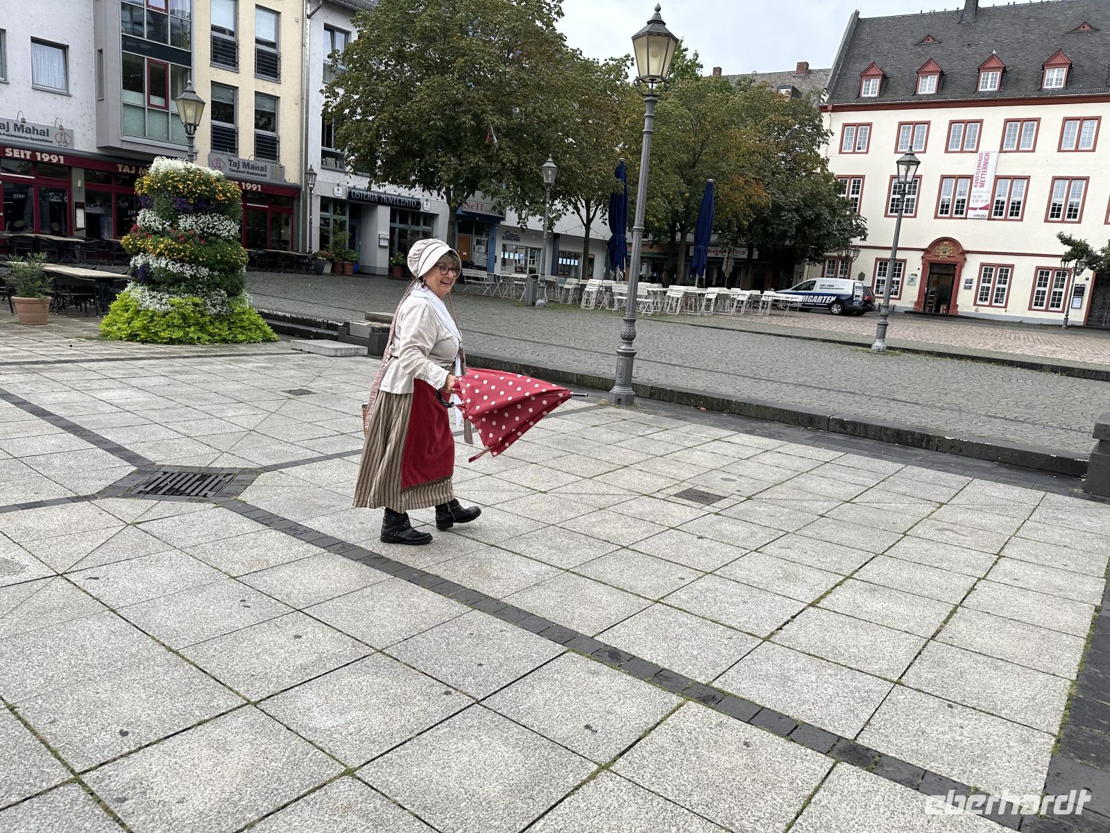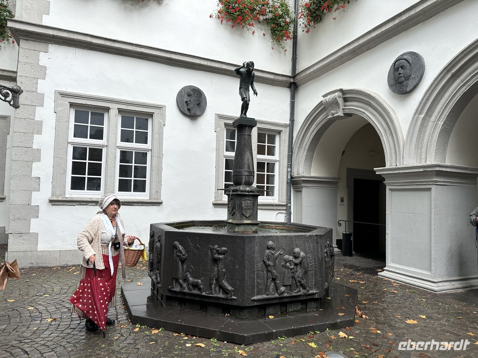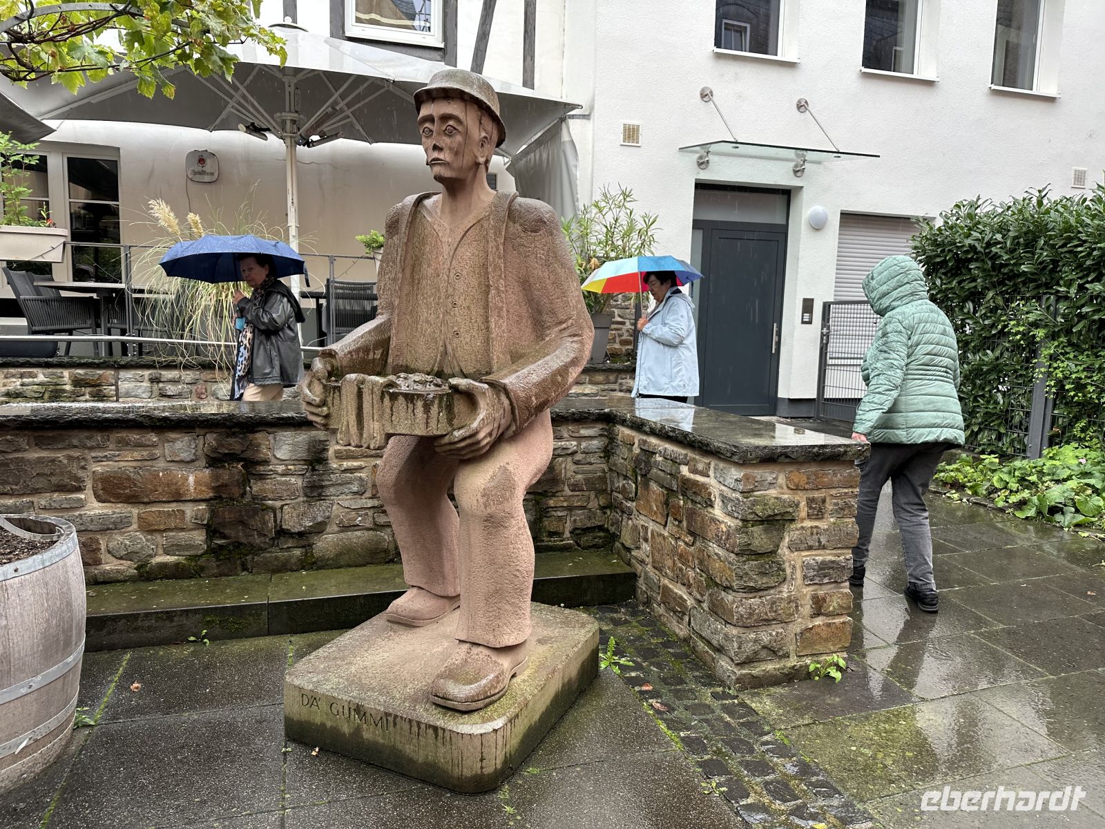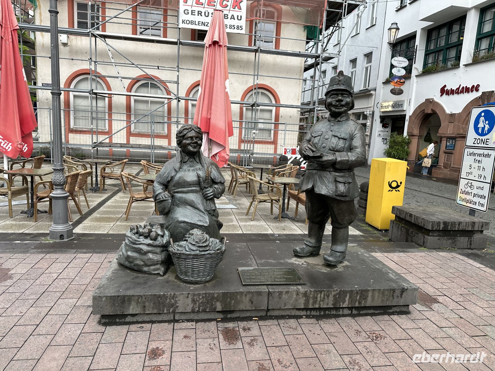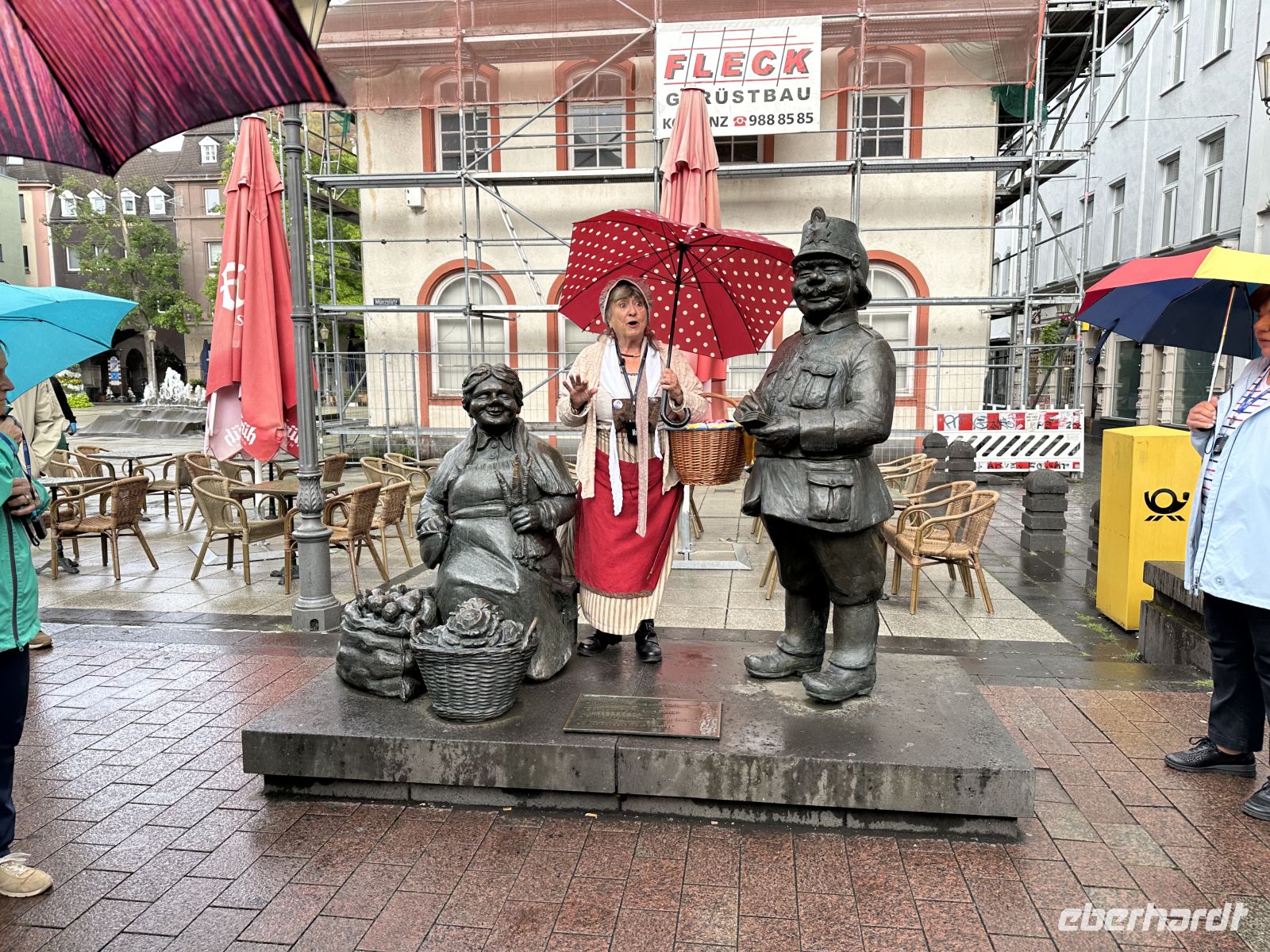 Am Vormittag erwartet uns die lustige Marktfrau Lisbeth, um uns versteckte Ecken in Koblenz zu zeigen und uns Koblenzer Originale vorzustellen. Unser Rundgang beginnt am Münzplatz bei Marktfrau Ringelstein und Schutzmann Otto. In typisch Koblenzer Dialekt berichtet uns Lisbeth über das Treiben auf dem Markt vor mehr als einhundert Jahren. Die Skulptur der Marktfrau Ringelstein und des Schutzmanns Otto erinnert an eine humorvolle Anekdote, die auf einer Plakette am Denkmal in Koblenzer Dialekt zu lesen ist. Der Spruch lautet: "Die Maatfrau sät zom Schutzmann: 'Dat es mir jetzt zo bont! Do hat gepinkelt an mein Mann, dä Nobersch ihre Hond!'" Übersetzt ins Hochdeutsche bedeutet das: "Die Marktfrau sagt zum Schutzmann: 'Das ist mir jetzt zu bunt! Da hat der Hund der Nachbarin auf meinen Mann gepinkelt!'" Die Anekdote wird dadurch besonders lustig, dass das Wort "Mann" im Koblenzer Dialekt nicht nur den Ehemann, sondern umgangssprachlich auch einen Weidenkorb bezeichnen kann. Es geht also nicht um den Ehemann der Marktfrau, sondern um einen ihrer Körbe, auf den der Hund der Nachbarin uriniert hat. Die Skulptur fängt diesen humorvollen Moment einer Alltagsszene zwischen Bürgern und der Polizei perfekt ein. Während wir versuchen, uns einigermaßen vor dem strömenden Regen zu schützen, begegnen wir einem weiteren Koblenzer Original: dem "Dä Gummi". Diese ist Peter Schneider gewidmet, der ein großer, hagerer Mann mit einer eigentümlichen, wackeligen Gangart war, die ihm diesen Spitznamen einbrachte. Trotz seiner Eigenheiten war er für seine fröhliche Art bekannt und beliebt. Weiter geht es zur Pfefferminzje: Die Steinfigur des "Pfefferminzje" finden wir in der Mehlgasse. Das Original, Anna Maria Stein, lebte im 20. Jahrhundert und verdiente ihren Lebensunterhalt mit dem Verkauf von Pfefferminzrollen in den Koblenzer Kneipen. Sie galt als schlagfertig und hatte immer einen flotten Spruch auf den Lippen. Wir flüchten uns nun vor dem immer stärker werdenden Regen in die Liebfrauenkirche. Im Inneren der Kirche gibt es eine Vielzahl von kunsthistorisch bedeutenden Elementen zu entdecken, die die lange Geschichte des Bauwerks widerspiegeln. Es gibt ein eindrucksvolles Sterngewölbe im Mittelschiff, das im 15. Jahrhundert entstand, das als Meisterwerk der Gotik gilt. Außerdem befinden sich hier zahlreiche Grabsteine und Epitaphe aus dem 16. bis 18. Jahrhundert, die an die Familien erinnern, die einst in der Gemeinde von Bedeutung waren. Trotz der Zerstörungen im Zweiten Weltkrieg sind einige ältere Ausstattungsstücke erhalten geblieben, darunter der Nikolaus-Altar. Nach den Zerstörungen im Krieg wurden die alten Fenster ersetzt. Die neuen, farbintensiven Glasfenster wurden von verschiedenen Künstlern geschaffen und erzählen unter anderem die Geschichte von Frauen in der Heilsgeschichte und das brennende Koblenz. Wir kommen nun zum berühmten Schängelbrunnen am Rathaushof. Lisbeth erzählt, dass der Begriff „Schängel“ eine liebevolle mundartliche Bezeichnung für die in Koblenz geborenen Kinder ist. Er hat seinen Ursprung in der Zeit der französischen Besatzung von 1794 bis 1814. Als französische Soldaten in Koblenz stationiert waren, gab es Beziehungen zwischen ihnen und deutschen Frauen. Die Kinder, die aus diesen Verbindungen hervorgingen, wurden häufig mit dem Namen „Jean“ getauft, der französische Name für Johann. Die Koblenzer Bevölkerung hatte Schwierigkeiten, den Namen "Jean" korrekt auszusprechen. Im lokalen Dialekt wurde aus "Jean" die Lautform "Schang". Aus dem "Schang" entwickelte sich dann die Verniedlichungsform "Schängel". Was anfangs oft als Schimpfwort für uneheliche Kinder verwendet wurde, wandelte sich im Laufe der Zeit zu einer stolzen Bezeichnung für jeden in Koblenz Geborenen. Und diesen wurde mit dem Schängelbrunnen ein Denkmal gesetzt. Aber Vorsicht, alle zwei Minuten spuckt der Gute. Inzwischen hat es aufgehört zu regnen und Lisbeths Mann erwartet uns mit „Dudebainchen“-Gebäck und Dähler Drobbe einem regionalen Kräuterschnaps. Am Ende unseres Rundgangs in Koblenz berichtet Lisbeth, die sich nun in eine Anna Wagner verwandelt hat, über das tragische Schicksal der Hexenverfolgung. Dann verabschieden wir uns und kehren zurück zum Schiff. Wir sind nun unterwegs auf dem Rhein Richtung Düsseldorf, das wir gegen 20 Uhr erreichen.