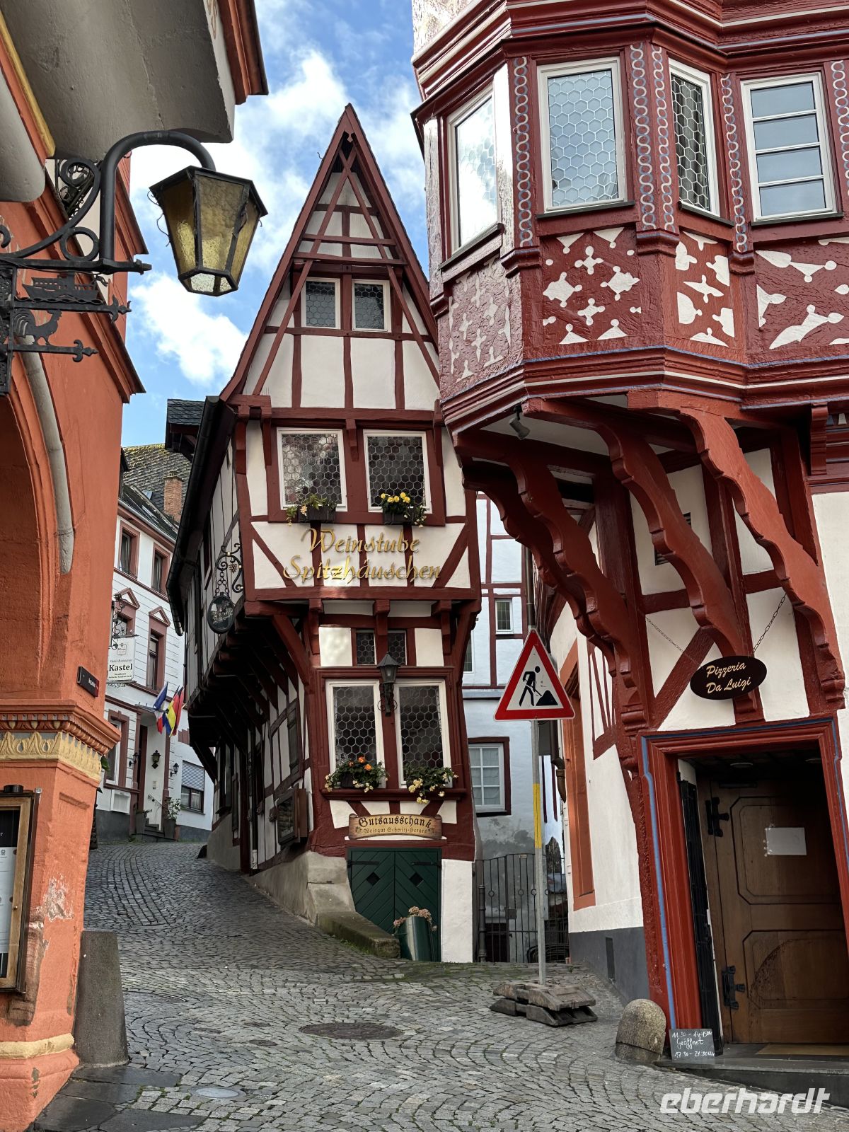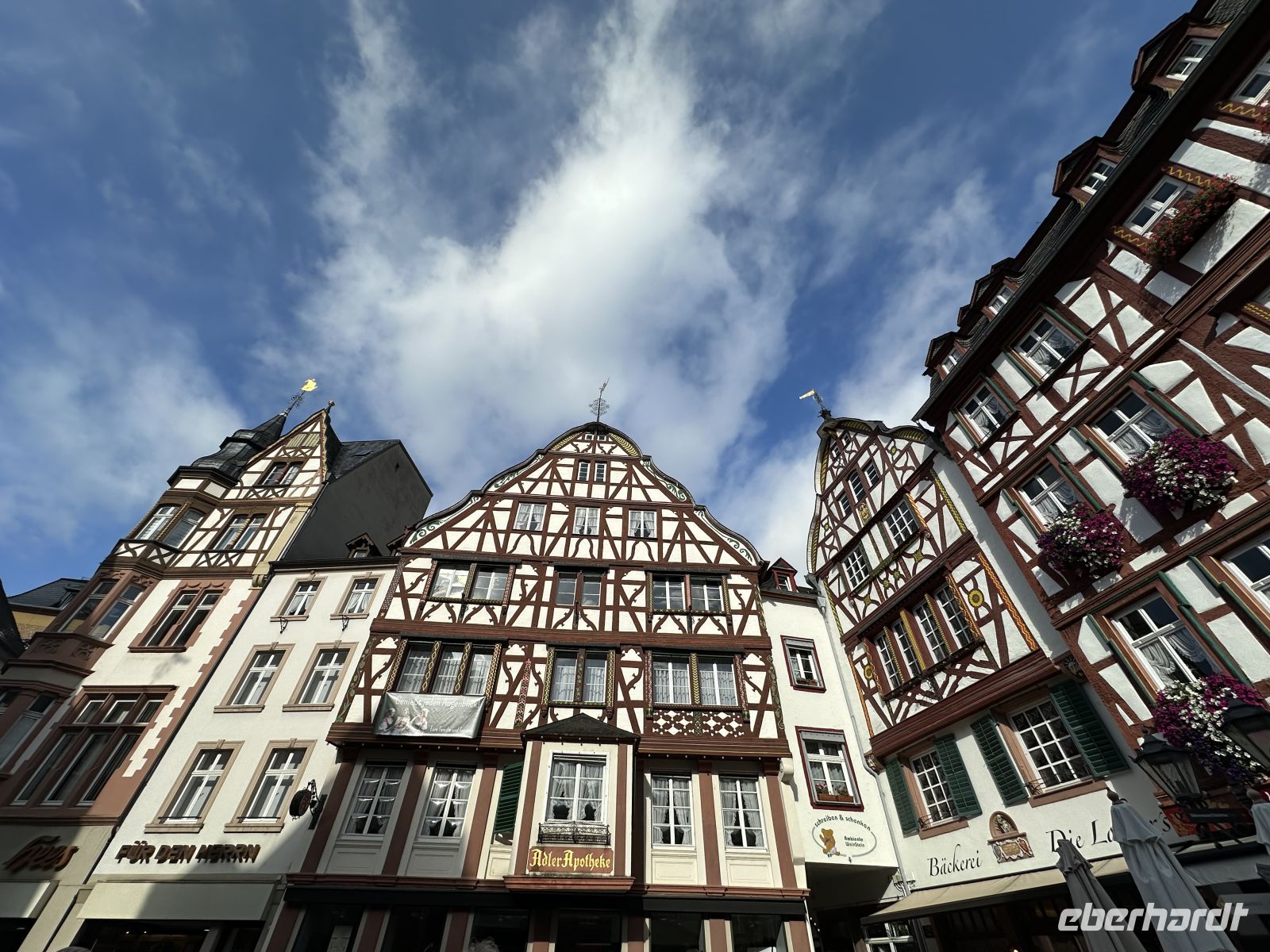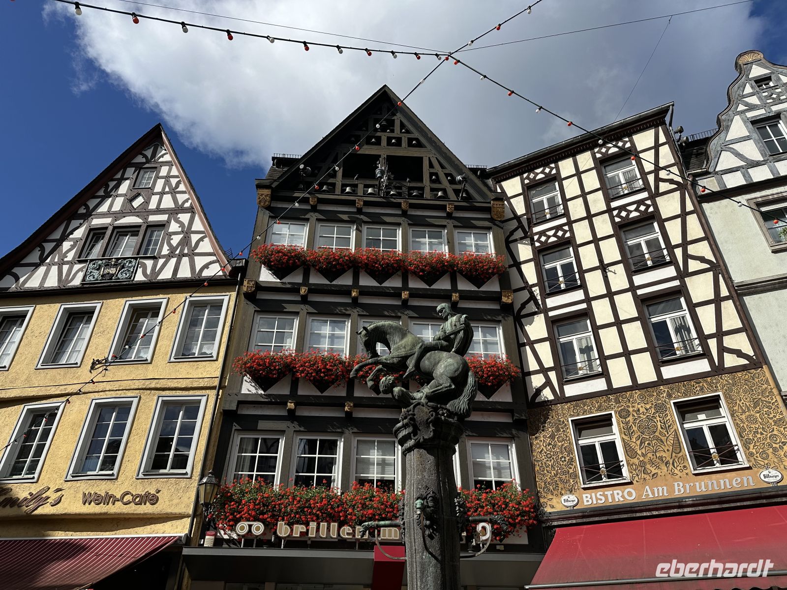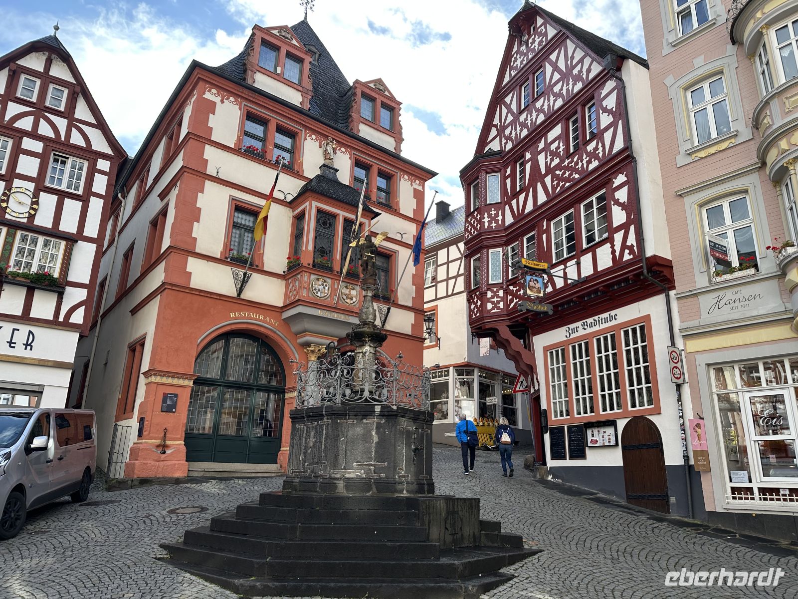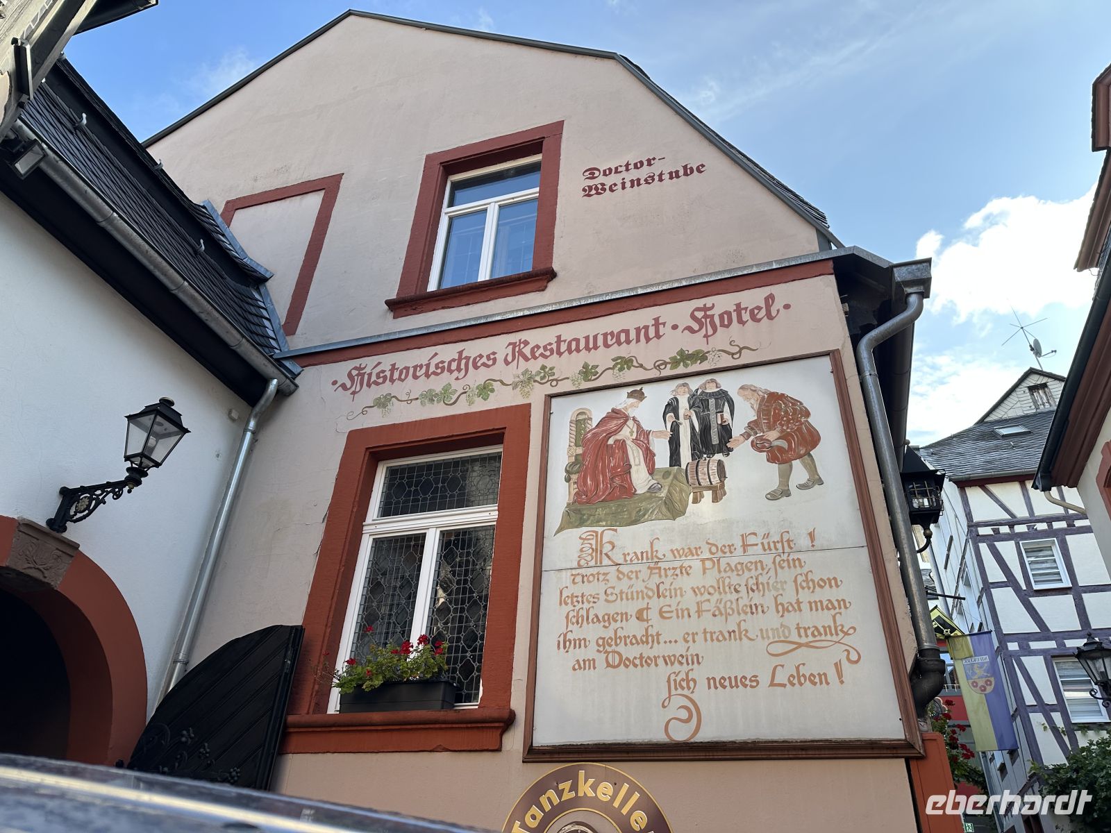 Der ehrenwerte Doctor erwartet uns zum Stadtrundgang. Zum Auftakt dürfen wir den berühmten Doktorwein verkosten (eine günstige Flasche kostet schon 24,- €). Der "Bernkasteler Doctor" hat seinen Namen einer Legende zu verdanken, die sich im 14. Jahrhundert zugetragen haben soll. Die Geschichte besagt, dass der Trierer Kurfürst Boemund II. schwer erkrankte und alle medizinischen Bemühungen fehlschlugen. In seiner Verzweiflung ließ er sich einen Wein von dem besten Weinberg in Bernkastel bringen. Nachdem er von diesem Wein getrunken hatte, soll er sich wundersam erholt haben und wieder gesund geworden sein. Daraufhin soll der Kurfürst ausgerufen haben: "Dies ist der wahre Doctor!", und so erhielt der Weinberg seinen berühmten Namen. Wussten Sie, dass der Bernkasteler Doctor zu den teuersten Weinlagen Deutschlands gehört und die Weine von dort auch von anderen berühmten Persönlichkeiten geschätzt wurden, wie dem britischen König Edward VII.? Nach einer zweiten Weinprobe führt uns der Doctor unterhaltsam durch seine Stadt. Wir flanieren durch die schmalen Gassen mit ihren wunderschönen Fachwerkhäusern und lauschen dabei den Geschichten des Doctors. So bewundern wir die ehemalige kurfürstliche Kellerei, ein historisches Gebäude, das eine besondere Geschichte und Funktion hatte. Sie diente ursprünglich als Verwaltungssitz ("Kellnerei") des Kurfürsten von Trier, wo der "Kellner" als sein Verwalter die Besitzungen des Kurfürsten vor Ort beaufsichtigte. Heute ist das Gebäude, auch bekannt als "Haus Astor", nicht mehr als Kellerei in Betrieb. Es ist das älteste Bruchsteinhaus der Stadt und hat im Laufe der Jahrhunderte verschiedene Nutzungen erfahren, unter anderem als Schule. Trotz Bränden wurde das Haus originalgetreu wieder aufgebaut. Am 08.03.1512 war hier Kaiser Maximilian I. zu Gast. Es ist dokumentiert, dass er acht Goldstücke als Trinkgeld gab.