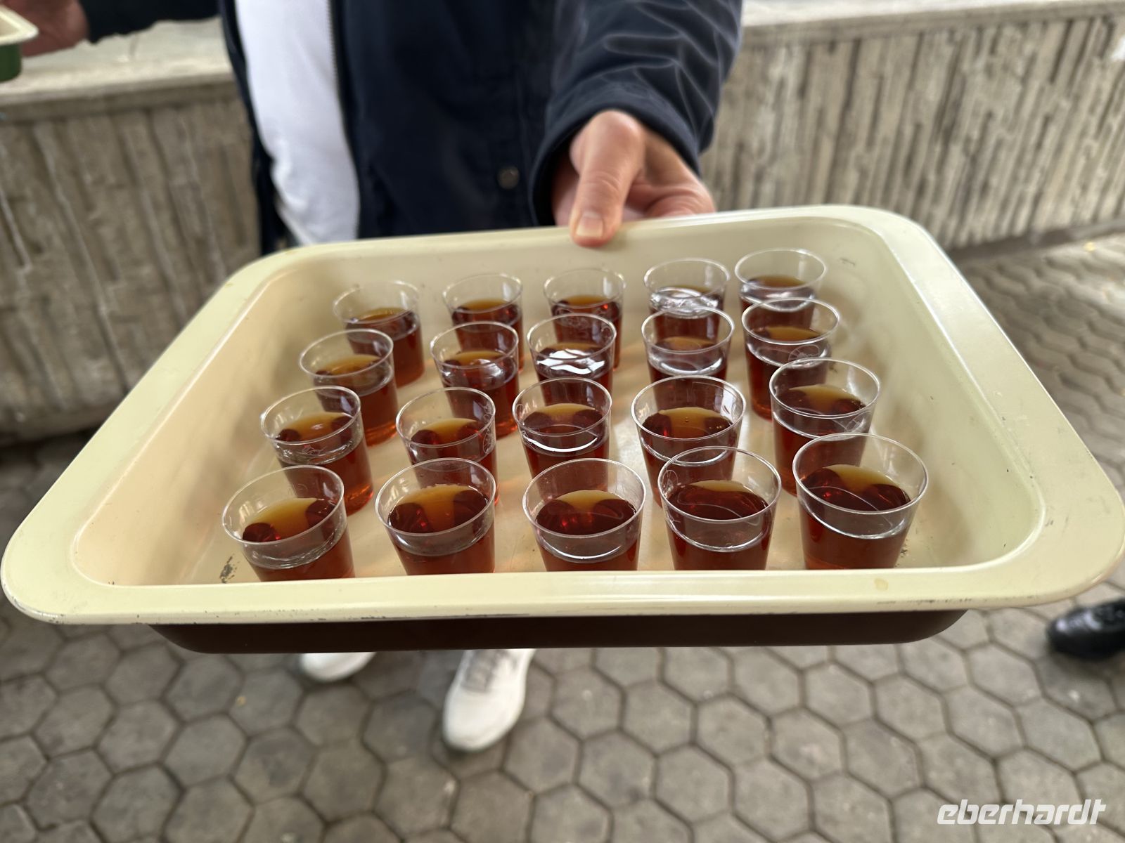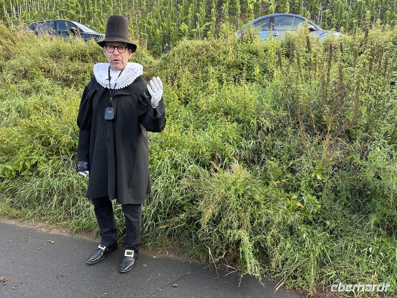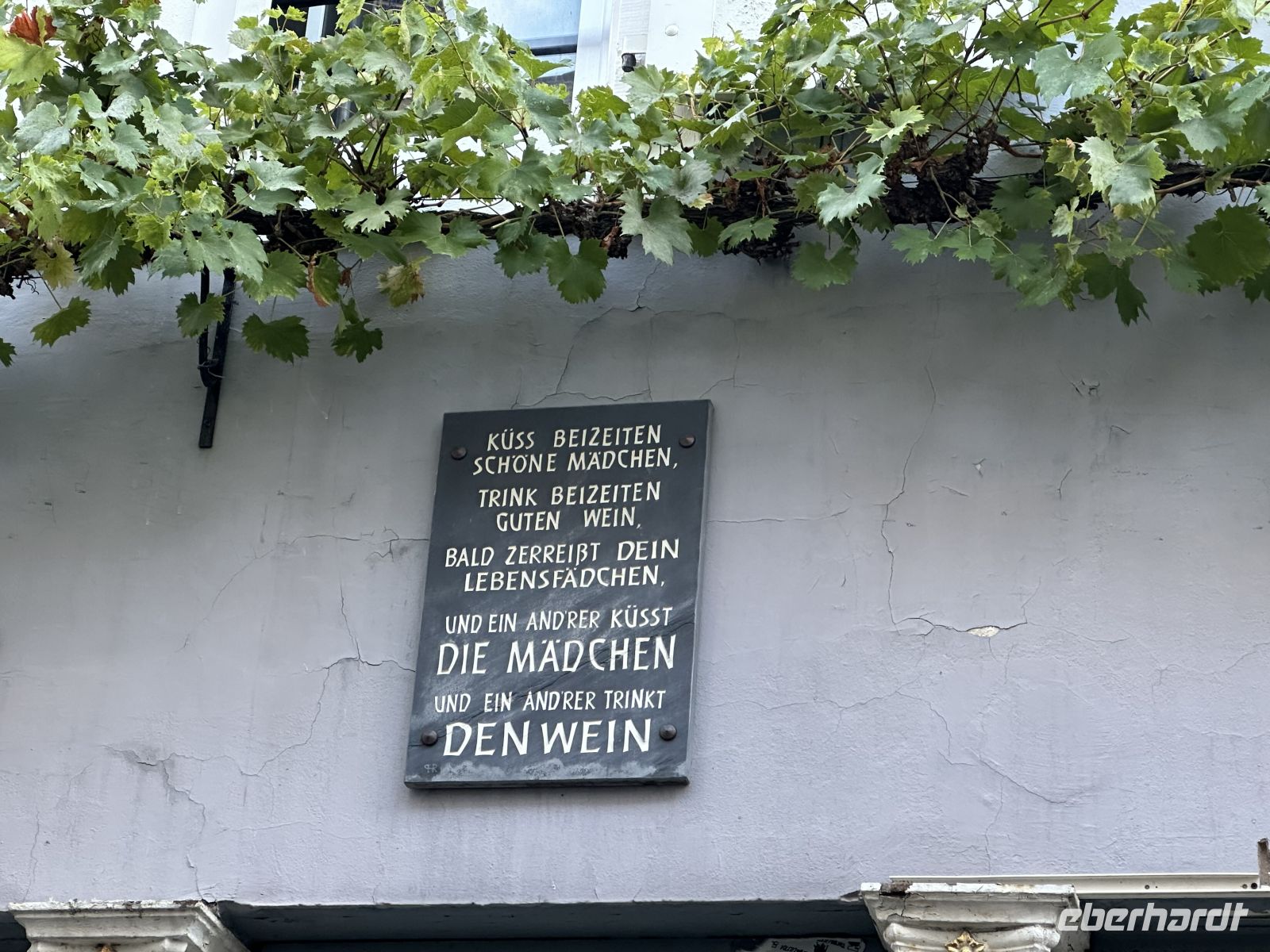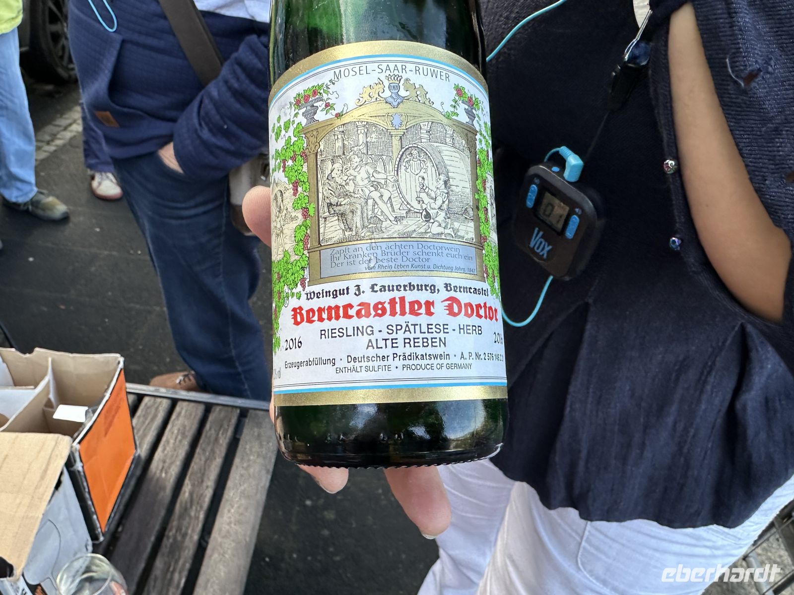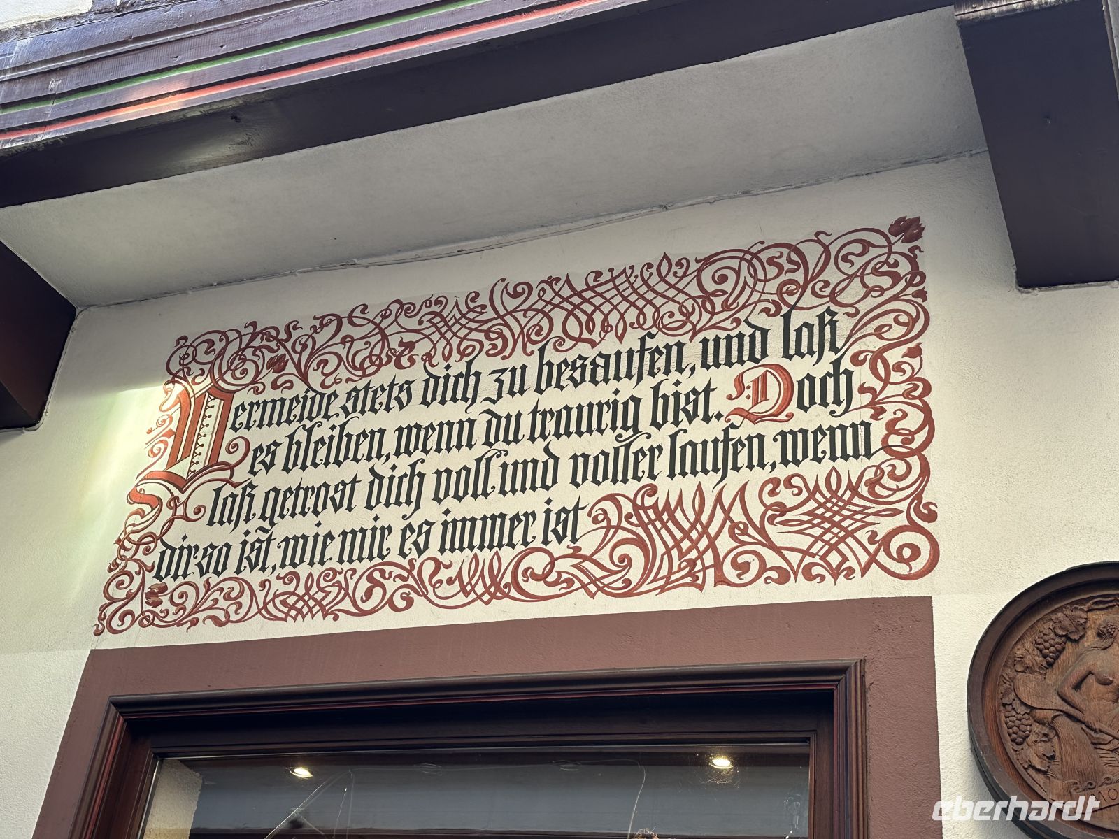 Der ehrenwerte Doctor erwartet uns zum Stadtrundgang. Zum Auftakt dürfen wir den berühmten Doktorwein verkosten (eine günstige Flasche kostet schon 24,- €). Der "Bernkasteler Doctor" hat seinen Namen einer Legende zu verdanken, die sich im 14. Jahrhundert zugetragen haben soll. Die Geschichte besagt, dass der Trierer Kurfürst Boemund II. schwer erkrankte und alle medizinischen Bemühungen fehlschlugen. In seiner Verzweiflung ließ er sich einen Wein von dem besten Weinberg in Bernkastel bringen. Nachdem er von diesem Wein getrunken hatte, soll er sich wundersam erholt haben und wieder gesund geworden sein. Daraufhin soll der Kurfürst ausgerufen haben: "Dies ist der wahre Doctor!", und so erhielt der Weinberg seinen berühmten Namen. Wussten Sie, dass der Bernkasteler Doctor zu den teuersten Weinlagen Deutschlands gehört und die Weine von dort auch von anderen berühmten Persönlichkeiten geschätzt wurden, wie dem britischen König Edward VII.? Nach einer zweiten Weinprobe führt uns der Doctor unterhaltsam durch seine Stadt. Wir flanieren durch die schmalen Gassen mit ihren wunderschönen Fachwerkhäusern und lauschen dabei den Geschichten des Doctors. So bewundern wir die ehemalige kurfürstliche Kellerei, ein historisches Gebäude, das eine besondere Geschichte und Funktion hatte. Sie diente ursprünglich als Verwaltungssitz ("Kellnerei") des Kurfürsten von Trier, wo der "Kellner" als sein Verwalter die Besitzungen des Kurfürsten vor Ort beaufsichtigte. Heute ist das Gebäude, auch bekannt als "Haus Astor", nicht mehr als Kellerei in Betrieb. Es ist das älteste Bruchsteinhaus der Stadt und hat im Laufe der Jahrhunderte verschiedene Nutzungen erfahren, unter anderem als Schule. Trotz Bränden wurde das Haus originalgetreu wieder aufgebaut. Am 08.03.1512 war hier Kaiser Maximilian I. zu Gast. Es ist dokumentiert, dass er acht Goldstücke als Trinkgeld gab.