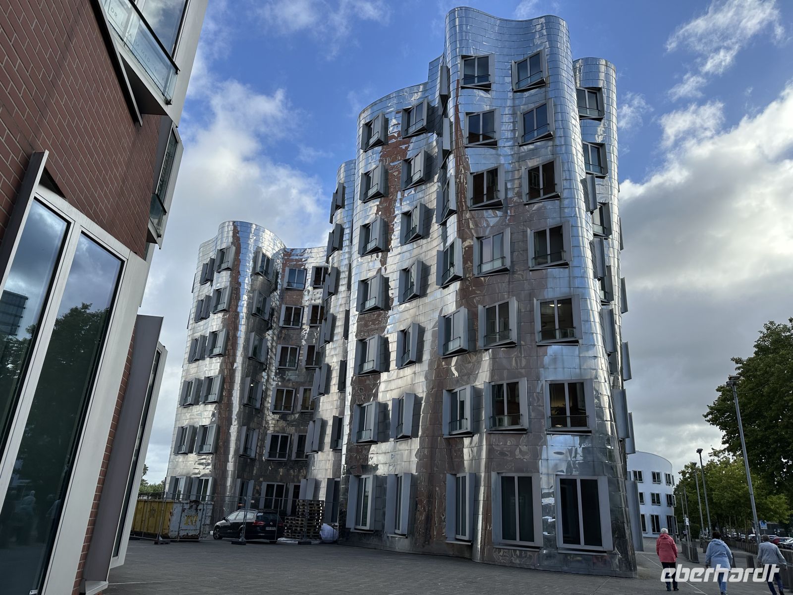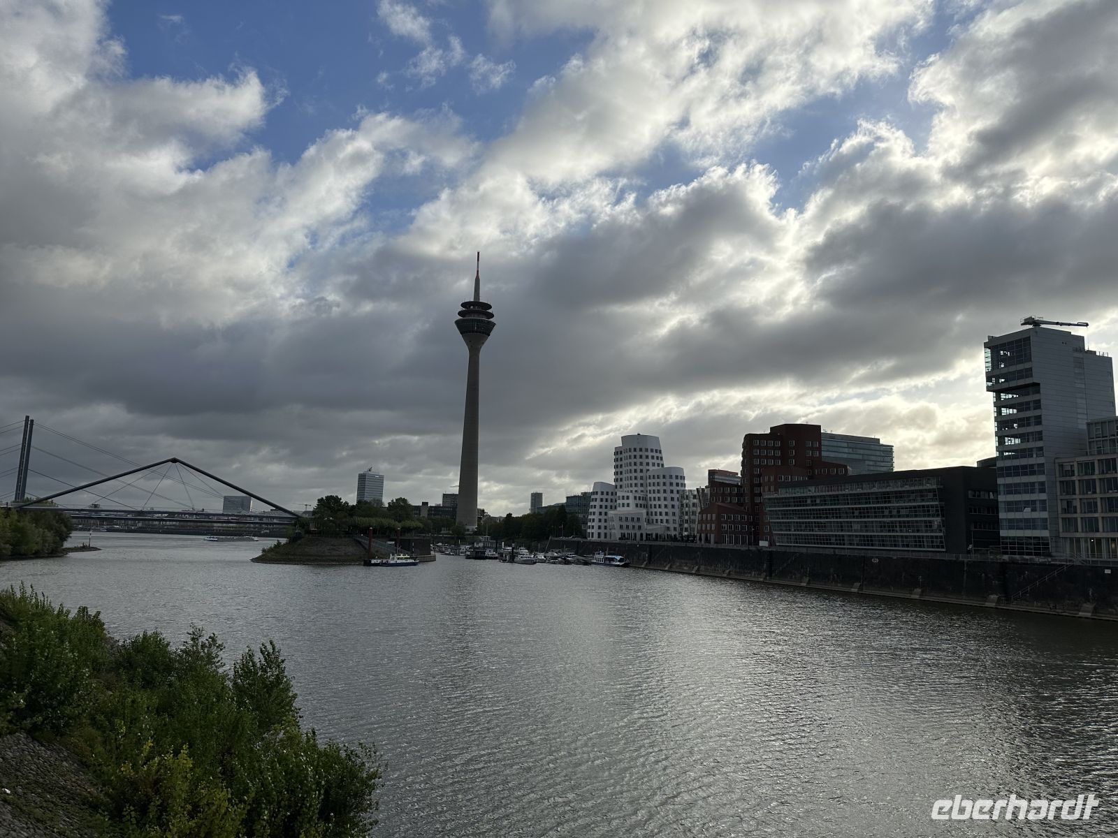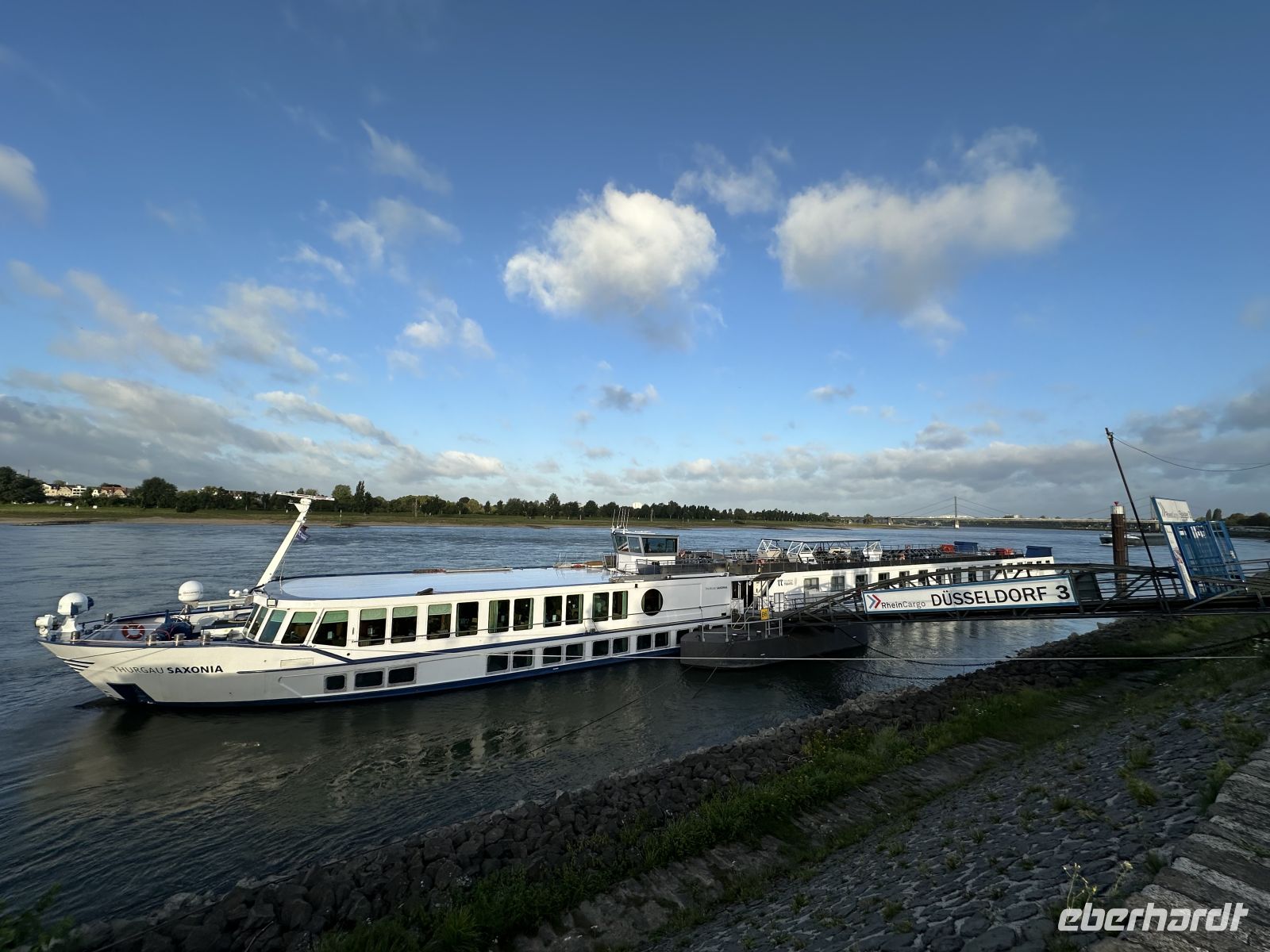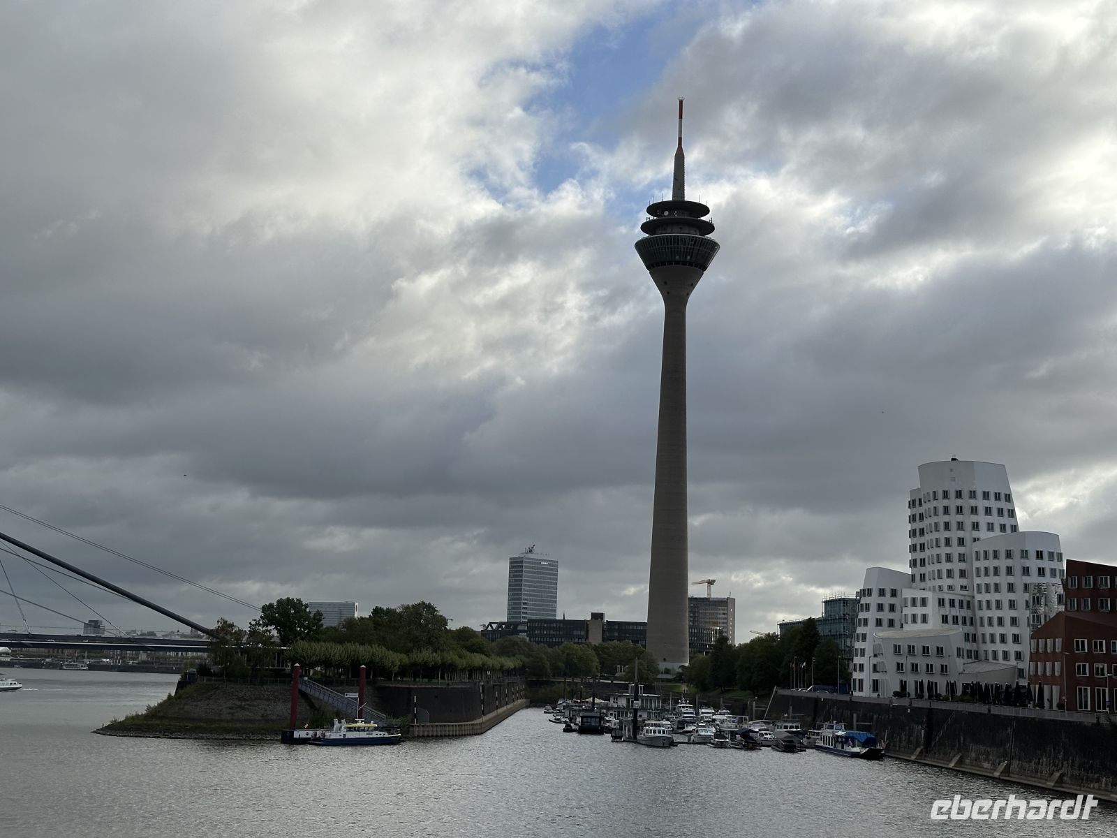 Der Bus wartet in unmittelbarer Nähe des Schiffes, wir starten zunächst mit der Rundfahrt und fahren als erstes zum Medienhafen. Früher gab es hier lange einen Industriehafen, heute ist es ein modernes Stadtviertel mit beeindruckender Architektur. International bekannte Stararchitekten durften sich hier verwirklichen. Das auffälligste Merkmal sind die sogenannten "Gehry-Bauten" am Neuen Zollhof, die mit ihren tanzenden Formen und Fassaden aus unterschiedlichen Materialien (Klinker, weißer Putz und Metall) zu einem Wahrzeichen der Stadt geworden sind. Neben diesen futuristischen Bauten sehen wir auch historische Elemente des alten Hafens, wie zum Beispiel alte Kräne und Lagerhäuser, die in das moderne Stadtbild integriert sind. Unsere Stadtführer berichten, dass der Medienhafen nicht nur ein architektonisches Highlight ist, sondern auch ein wichtiger Wirtschaftsstandort. Zahlreiche Unternehmen aus den Bereichen Medien, Kommunikation, Mode und Beratung haben hier ihren Sitz. Darüber hinaus hat sich das Viertel mit seinen Restaurants, Bars und Cafés zu einem beliebten Treffpunkt für Einheimische und Touristen entwickelt. Weiter geht es für uns nach Monkey Island. „Monkey Island" war eine legendäre Strandbar in Düsseldorf, die sich in den frühen 2000er Jahren großer Beliebtheit erfreute. Sie befand sich auf einer Landzunge am Düsseldorfer Hafen und war bekannt für ihr einzigartiges Konzept, bei dem Tonnen von Sand aufgeschüttet wurden, um ein urbanes Strandgefühl zu schaffen. Die Bar war nicht nur ein beliebter Treffpunkt zum Entspannen am Wasser und zum Sonnenuntergang, sondern auch ein Ort für Kunst und Kultur. Sie wurde vom Kunsthändler Helge Achenbach gegründet und war für ihre lockere Atmosphäre sowie die regelmäßig stattfindenden Partys bekannt. "Monkey Island" existierte allerdings nur für wenige Jahre und musste 2006 dem Bau des Hyatt-Hotels weichen, das heute die Spitze des Medienhafens ziert und zahlreiche bekannte Prominente beherbergt. Zu Fuß spazieren wir durch die Düsseldorfer Altstadt die als Zentrum für Gastronomie, Kultur und Nachtleben bekannt ist. Man sagt international: "die längste Theke der Welt" – ein Spitzname, der auf die außergewöhnlich hohe Dichte von über 260 Bars, Kneipen und Hausbrauereien in den engen Gassen zurückgeht. Wir besichtigen den Burgplatz, das Herzstück der Altstadt. Hier steht der Schlossturm, das einzige Überbleibsel des ehemaligen Düsseldorfer Schlosses, das heute das Schifffahrtmuseum beherbergt. Auch mit der Tradition der Brauhäuser werden wir bekannt gemacht, allerdings nur theoretisch, eine Verkostung gibt es nicht. In einem der Brauhäuser wird das berühmte Düsseldorfer Altbier gebraut und ausgeschenkt. Brauereien wie "Im Füchschen", "Uerige" und "Zum Schlüssel" sind feste Institutionen, in denen man das traditionelle Bier direkt vom Fass probieren kann, wenn man die Zeit dafür hat. Wir kehren zurück zum Schiff und setzen unsere Reise fort.