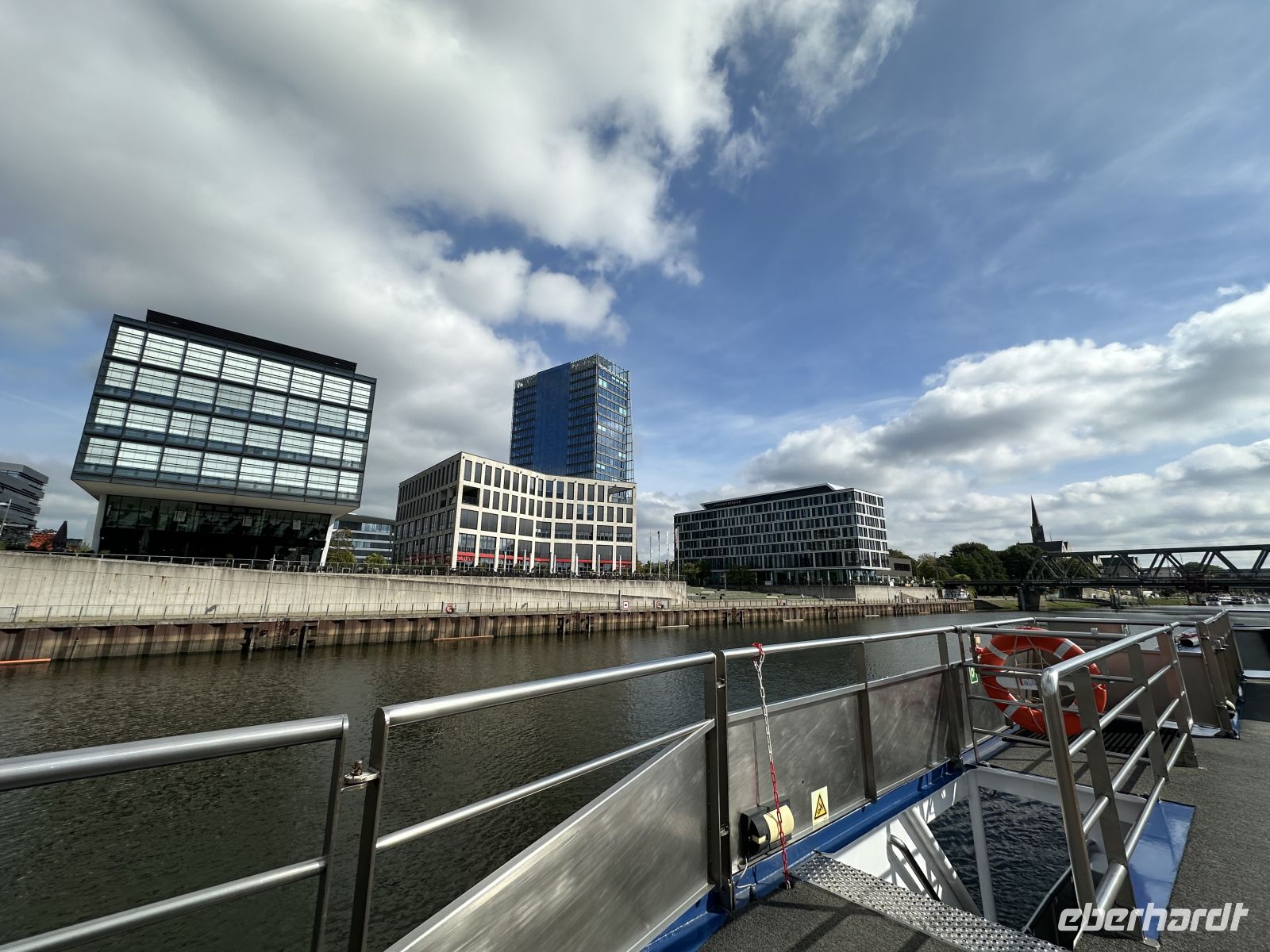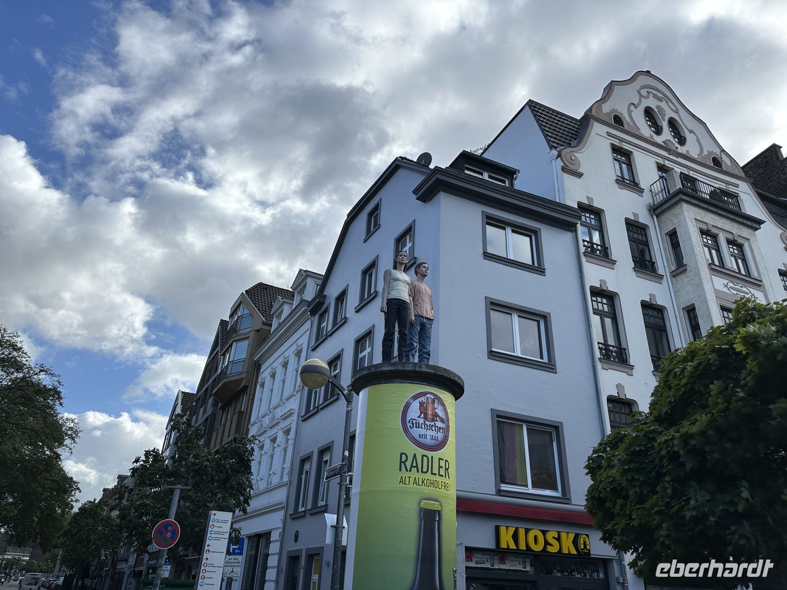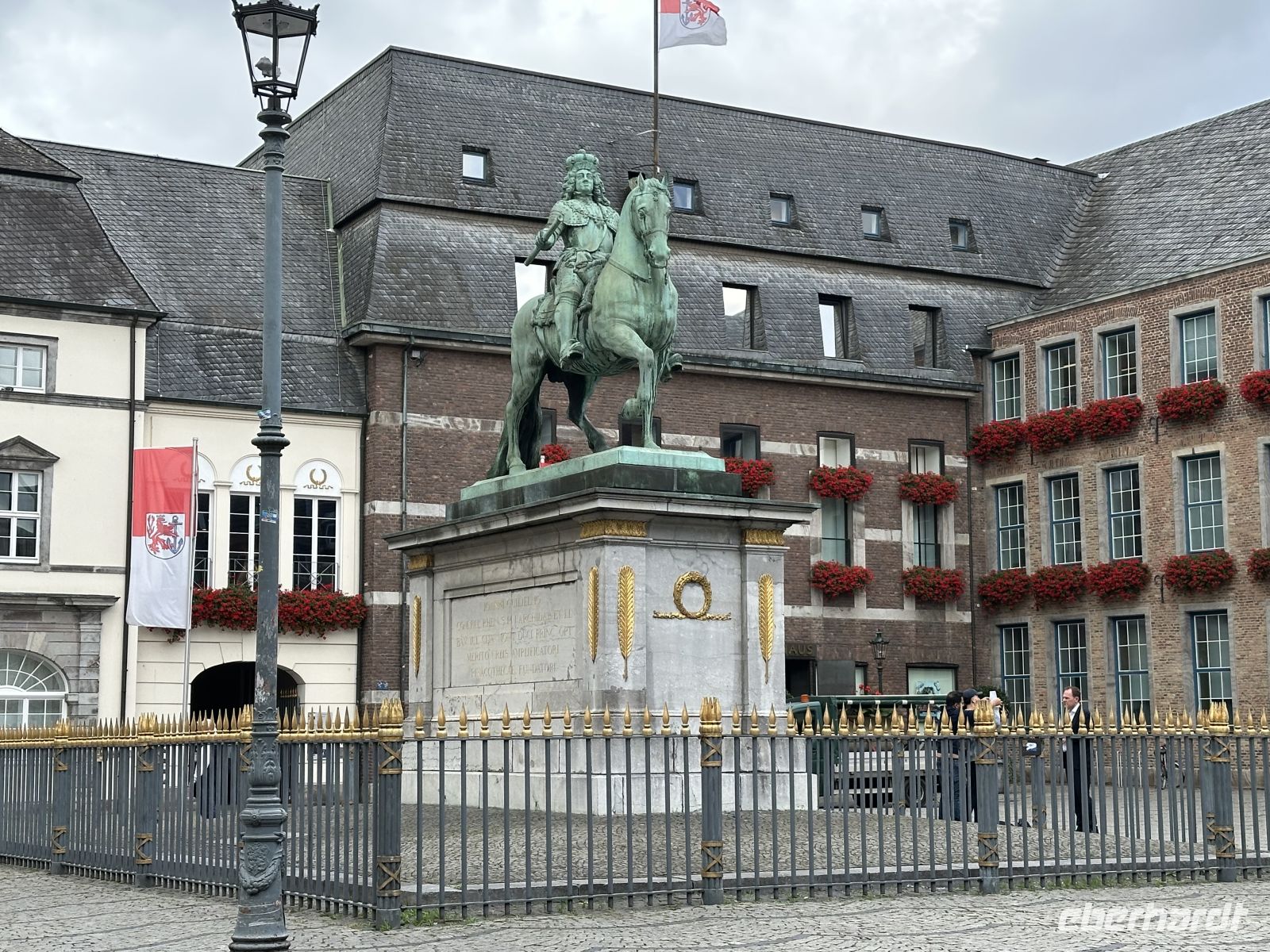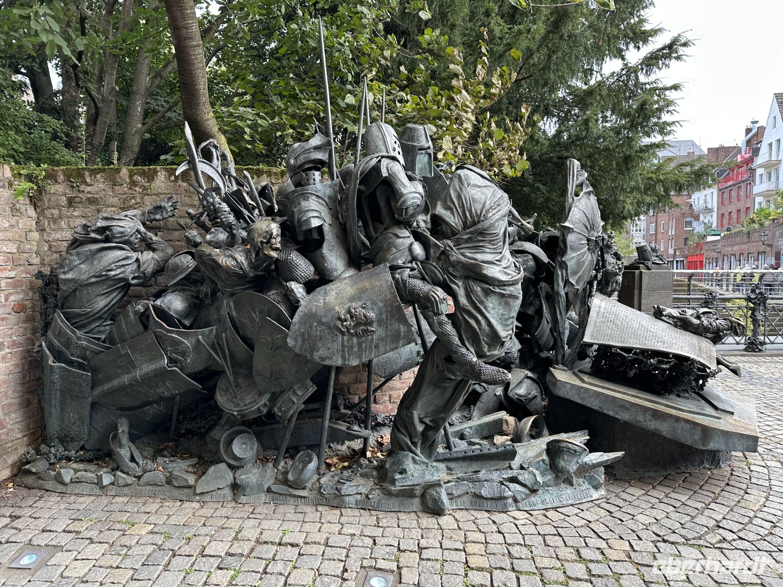Der Bus wartet in unmittelbarer Nähe des Schiffes, wir starten zunächst mit der Rundfahrt und fahren als erstes zum Medienhafen. Früher gab es hier lange einen Industriehafen, heute ist es ein modernes Stadtviertel mit beeindruckender Architektur. International bekannte Stararchitekten durften sich hier verwirklichen. Das auffälligste Merkmal sind die sogenannten "Gehry-Bauten" am Neuen Zollhof, die mit ihren tanzenden Formen und Fassaden aus unterschiedlichen Materialien (Klinker, weißer Putz und Metall) zu einem Wahrzeichen der Stadt geworden sind. Neben diesen futuristischen Bauten sehen wir auch historische Elemente des alten Hafens, wie zum Beispiel alte Kräne und Lagerhäuser, die in das moderne Stadtbild integriert sind. Unsere Stadtführer berichten, dass der Medienhafen nicht nur ein architektonisches Highlight ist, sondern auch ein wichtiger Wirtschaftsstandort. Zahlreiche Unternehmen aus den Bereichen Medien, Kommunikation, Mode und Beratung haben hier ihren Sitz. Darüber hinaus hat sich das Viertel mit seinen Restaurants, Bars und Cafés zu einem beliebten Treffpunkt für Einheimische und Touristen entwickelt. Weiter geht es für uns nach Monkey Island. „Monkey Island" war eine legendäre Strandbar in Düsseldorf, die sich in den frühen 2000er Jahren großer Beliebtheit erfreute. Sie befand sich auf einer Landzunge am Düsseldorfer Hafen und war bekannt für ihr einzigartiges Konzept, bei dem Tonnen von Sand aufgeschüttet wurden, um ein urbanes Strandgefühl zu schaffen. Die Bar war nicht nur ein beliebter Treffpunkt zum Entspannen am Wasser und zum Sonnenuntergang, sondern auch ein Ort für Kunst und Kultur. Sie wurde vom Kunsthändler Helge Achenbach gegründet und war für ihre lockere Atmosphäre sowie die regelmäßig stattfindenden Partys bekannt. "Monkey Island" existierte allerdings nur für wenige Jahre und musste 2006 dem Bau des Hyatt-Hotels weichen, das heute die Spitze des Medienhafens ziert und zahlreiche bekannte Prominente beherbergt. Zu Fuß spazieren wir durch die Düsseldorfer Altstadt die als Zentrum für Gastronomie, Kultur und Nachtleben bekannt ist. Man sagt international: "die längste Theke der Welt" – ein Spitzname, der auf die außergewöhnlich hohe Dichte von über 260 Bars, Kneipen und Hausbrauereien in den engen Gassen zurückgeht. Wir besichtigen den Burgplatz, das Herzstück der Altstadt. Hier steht der Schlossturm, das einzige Überbleibsel des ehemaligen Düsseldorfer Schlosses, das heute das Schifffahrtmuseum beherbergt. Auch mit der Tradition der Brauhäuser werden wir bekannt gemacht, allerdings nur theoretisch, eine Verkostung gibt es nicht. In einem der Brauhäuser wird das berühmte Düsseldorfer Altbier gebraut und ausgeschenkt. Brauereien wie "Im Füchschen", "Uerige" und "Zum Schlüssel" sind feste Institutionen, in denen man das traditionelle Bier direkt vom Fass probieren kann, wenn man die Zeit dafür hat. Wir kehren zurück zum Schiff und setzen unsere Reise fort.