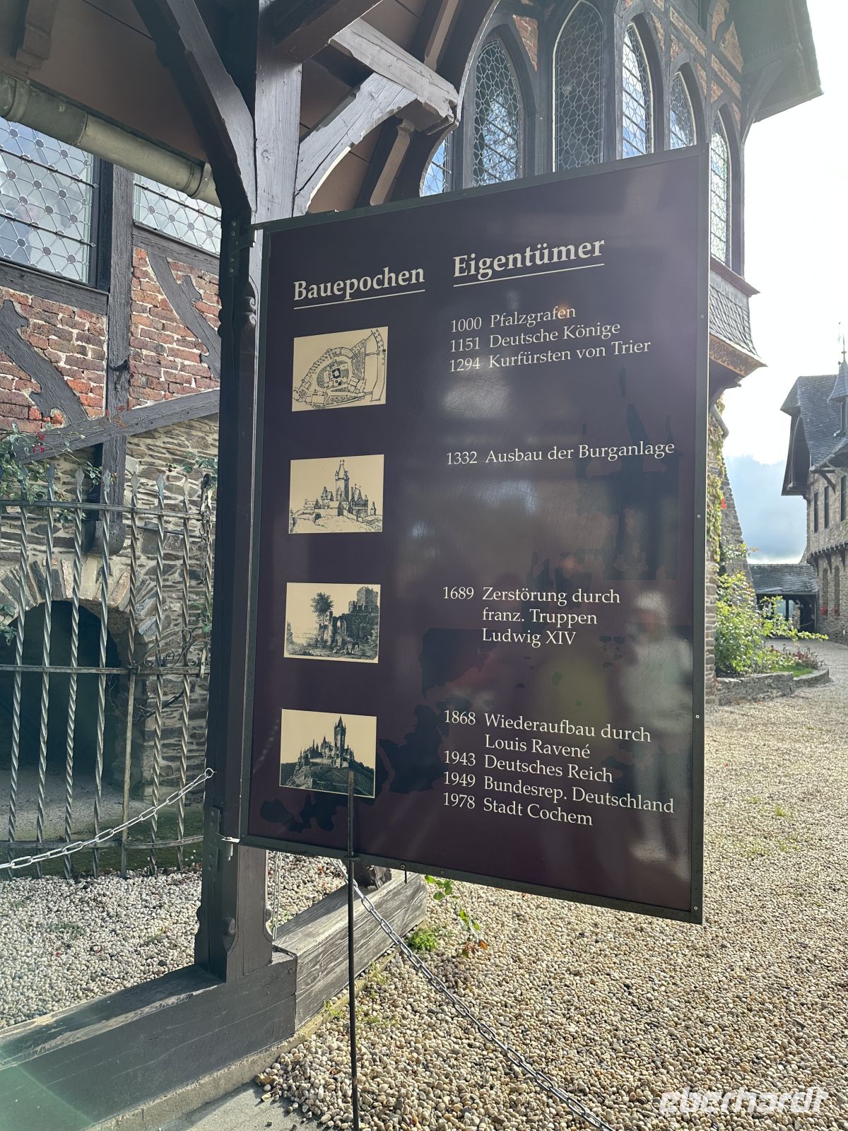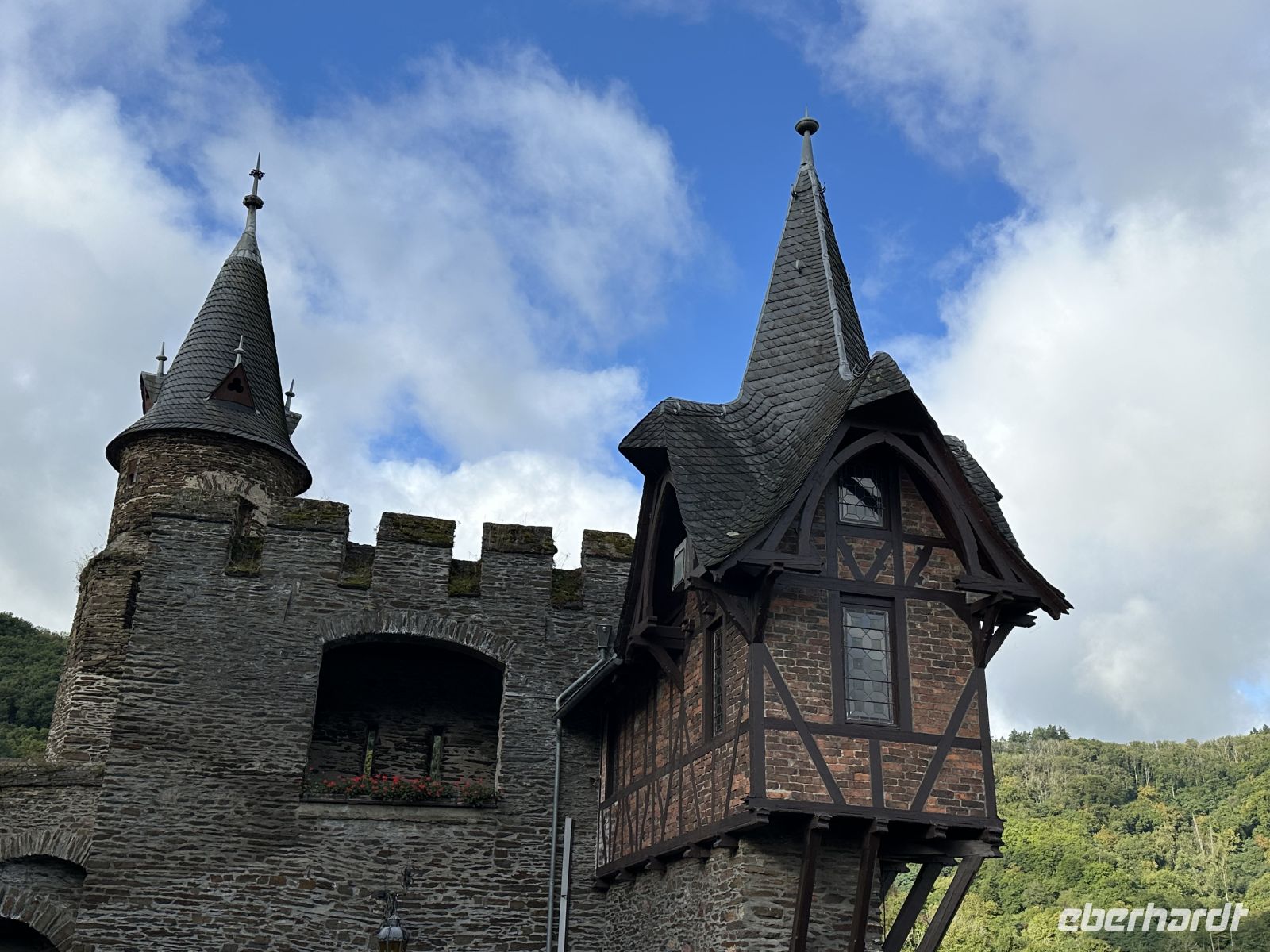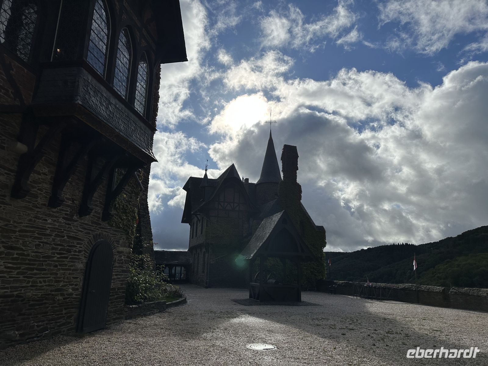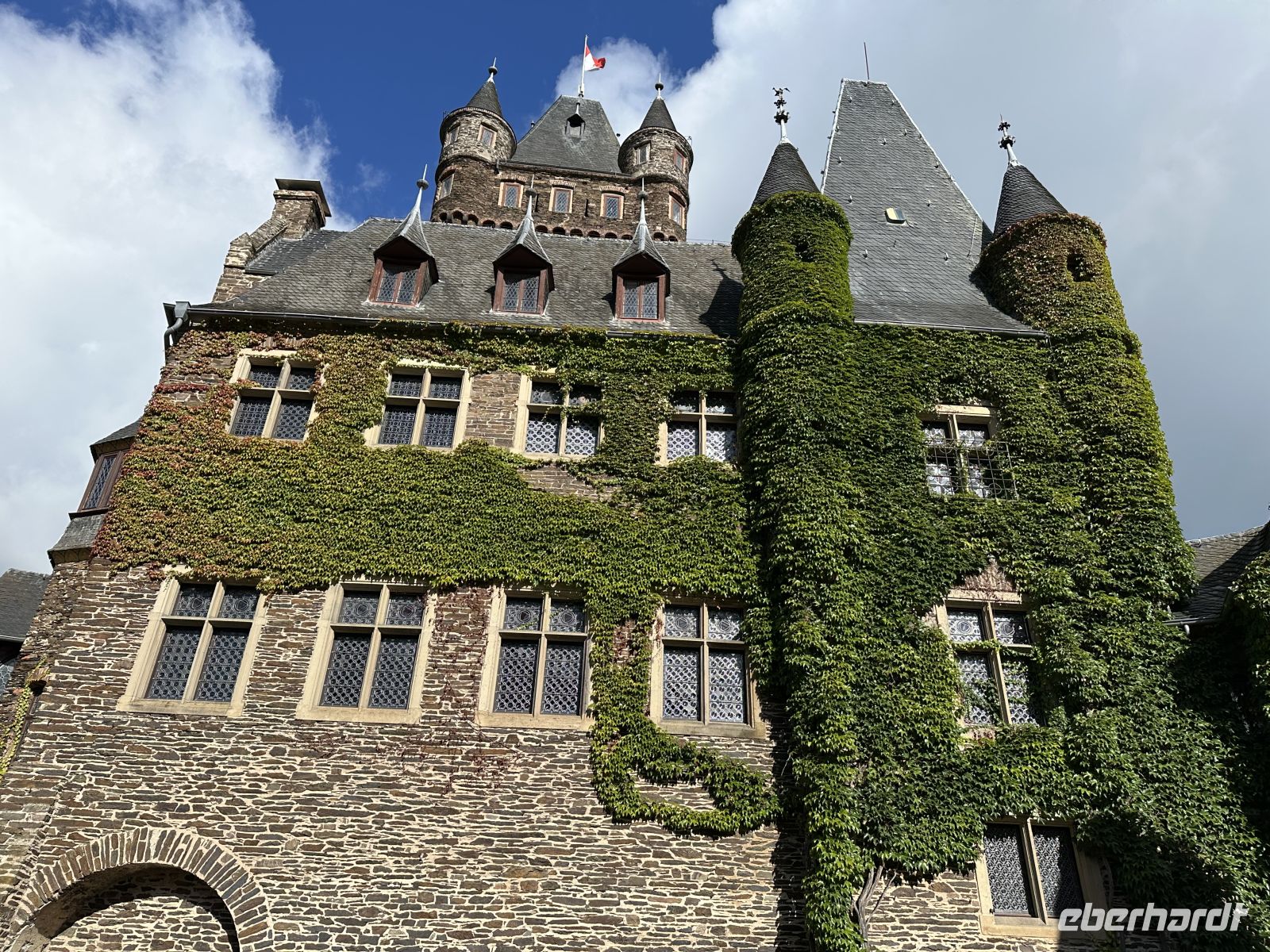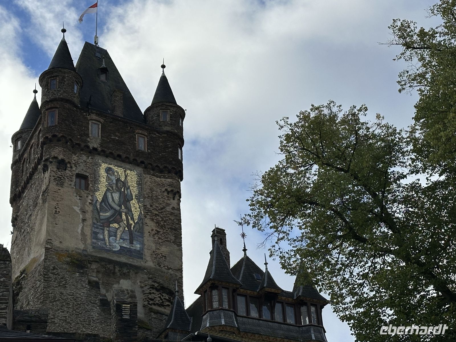 Unsere Führung durch die Reichsburg Cochem beginnt im sogenannten gotischen Zimmer, das auch Kemenate genannt wird. Der Begriff "Kemenate" stammt ursprünglich vom lateinischen Wort "caminata" ab, was "beheizbarer Raum" bedeutet. Im Mittelalter war eine Kemenate oft der einzige beheizbare Wohnraum in einer Burg. Sie war meist für die Herrschaftsfamilie, besonders für die Burgherrin, und Kranke reserviert und diente als gemütlicher Rückzugsort. Daher wird sie oft als "Frauengemach" oder "Damenstube" bezeichnet. Bei der Wiederherstellung der Burg wurde die Kemenate mit einem kunstvollen Kreuzrippengewölbe gestaltet, das dem Raum seinen Namen „gotisches Zimmer“ verleiht. Das Zimmer hat eine reiche Ausstattung. Die Wände sind mit einer hohen Holzvertäfelung und handbemalten Ornamenten verziert, die teilweise mit Blattgold ausgelegt sind. Die Decke ist ebenfalls aufwendig gestaltet. Ein besonderes Highlight ist der große Kamin, der mit Delfter Kacheln ausgelegt ist. Die Möbel, darunter ein wertvoller Tisch aus Ebenholz und Nussbaum sowie ein großes Buffet mit Delfter Keramik, stammen aus dem 17. und 18. Jahrhundert und spiegeln den gehobenen Wohnstil dieser Zeit wider. Als Nächstes kommen wir in das romanische Zimmer. Der Raum ist in schlichtem, romanischem Stil gehalten und vermittelt einen Eindruck davon, wie die Burg in ihrer frühen Bauphase ausgesehen haben könnte. Ein besonderes Merkmal dieses Zimmers sind die kleinen Fenster mit den Butzenscheiben. Diese Glasscheiben sind nicht flach, sondern haben eine konvexe, butzenartige Wölbung. Der Speisesaal ist ein weiterer Raum, der ebenfalls mit viel Liebe zum Detail im neugotischen Stil gestaltet wurde. Er hat eine kunstvolle hölzerne Balkendecke und ist mit wertvollen Möbeln ausgestattet, die dem gehobenen Wohnstil des 19. Jahrhunderts entsprechen. In der Mitte befindet sich ein eingedeckter Tisch, der darauf wartet, dass endlich die Gäste kommen. Das Jagdzimmer, durch welches wir ebenfalls kommen, dient als Vorraum zum Rittersaal und ist von der Jagdleidenschaft des Bauherrn Louis Ravené geprägt. Der Raum ist reich mit Jagdtrophäen und Holzschnitzereien verziert. An den Wänden finden sich Trophäen von Tieren aus den umliegenden Wäldern von Eifel und Hunsrück, zum Beispiel ein riesengroßes Wildschwein. Der Raum ist außerdem mit Möbeln im Stil der Neorenaissance ausgestattet und enthält einen großen Schrank aus dem 16. Jahrhundert, der aus Süddeutschland stammt. Es ist ein Übergangszimmer, von dem aus man über eine prachtvolle Holztreppe in den Waffensaal gelangt, wo Rüstungen ausgestellt sind. Die Burg verfügt über viele weitere Zimmer, die jedoch heute nicht zur Besichtigung vorgesehen sind. Und so kehren wir zurück zu unserer Stadtführerin, die mit uns zu Fuß zum Schiff zurück spaziert.