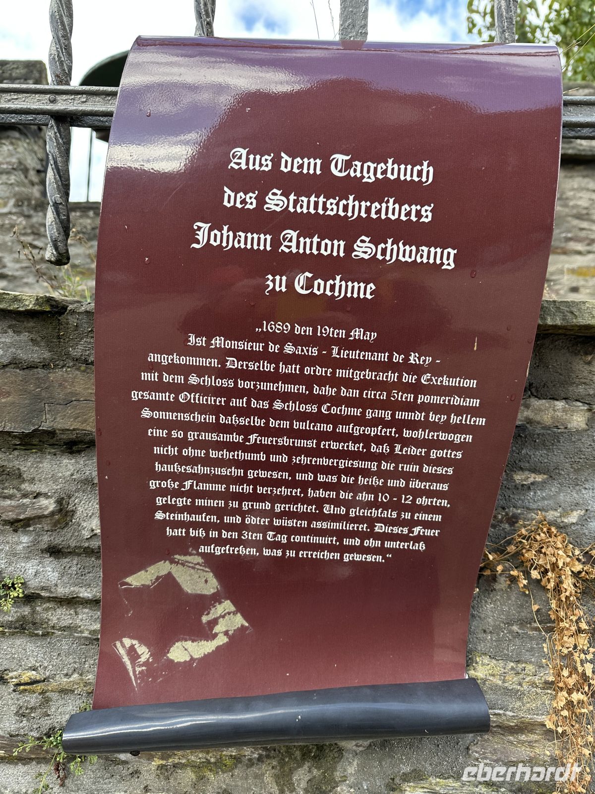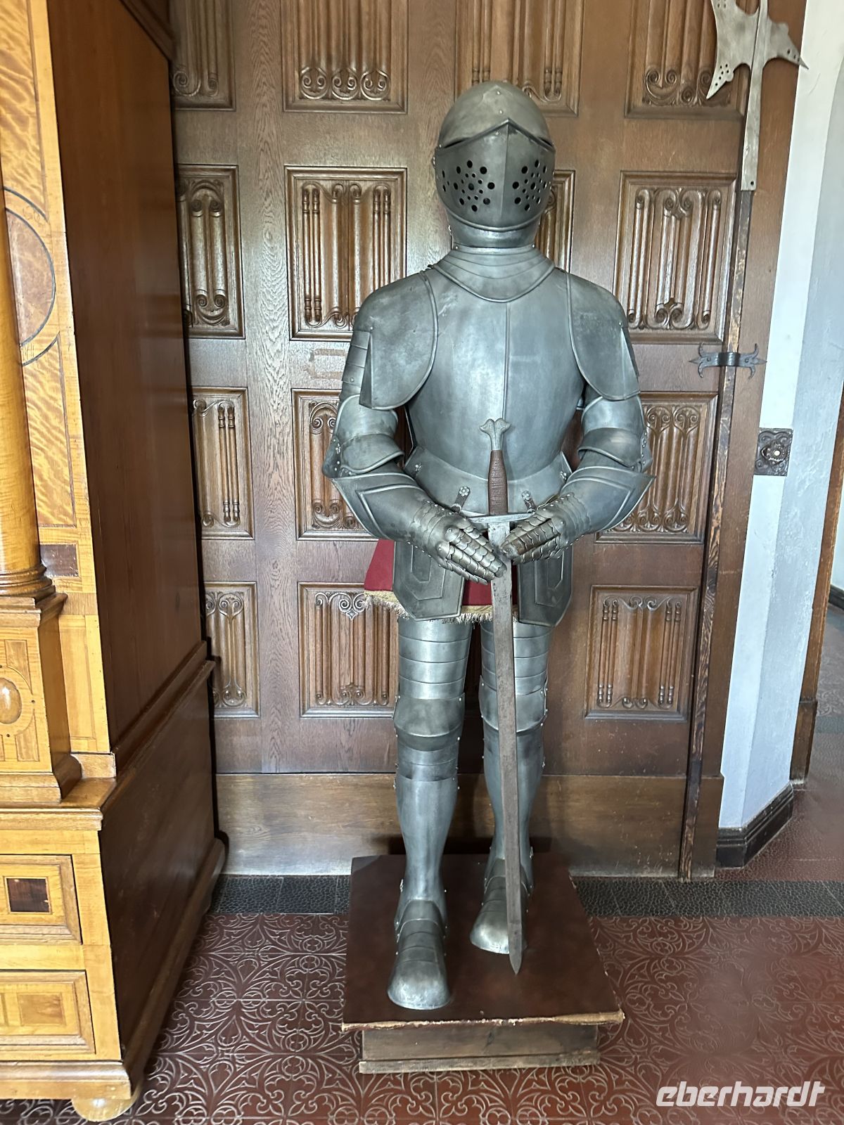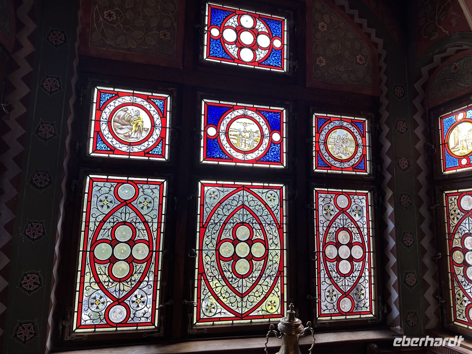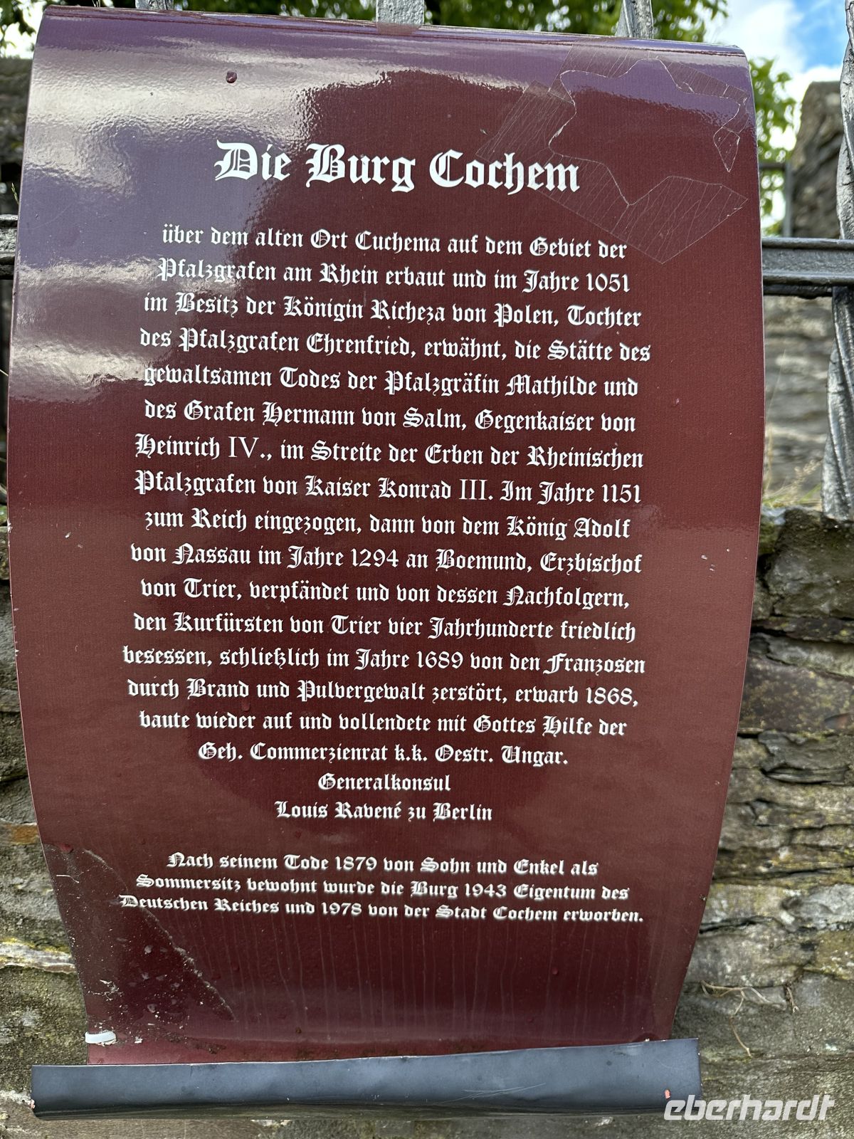 Unsere Führung durch die Reichsburg Cochem beginnt im sogenannten gotischen Zimmer, das auch Kemenate genannt wird. Der Begriff "Kemenate" stammt ursprünglich vom lateinischen Wort "caminata" ab, was "beheizbarer Raum" bedeutet. Im Mittelalter war eine Kemenate oft der einzige beheizbare Wohnraum in einer Burg. Sie war meist für die Herrschaftsfamilie, besonders für die Burgherrin, und Kranke reserviert und diente als gemütlicher Rückzugsort. Daher wird sie oft als "Frauengemach" oder "Damenstube" bezeichnet. Bei der Wiederherstellung der Burg wurde die Kemenate mit einem kunstvollen Kreuzrippengewölbe gestaltet, das dem Raum seinen Namen „gotisches Zimmer“ verleiht. Das Zimmer hat eine reiche Ausstattung. Die Wände sind mit einer hohen Holzvertäfelung und handbemalten Ornamenten verziert, die teilweise mit Blattgold ausgelegt sind. Die Decke ist ebenfalls aufwendig gestaltet. Ein besonderes Highlight ist der große Kamin, der mit Delfter Kacheln ausgelegt ist. Die Möbel, darunter ein wertvoller Tisch aus Ebenholz und Nussbaum sowie ein großes Buffet mit Delfter Keramik, stammen aus dem 17. und 18. Jahrhundert und spiegeln den gehobenen Wohnstil dieser Zeit wider. Als Nächstes kommen wir in das romanische Zimmer. Der Raum ist in schlichtem, romanischem Stil gehalten und vermittelt einen Eindruck davon, wie die Burg in ihrer frühen Bauphase ausgesehen haben könnte. Ein besonderes Merkmal dieses Zimmers sind die kleinen Fenster mit den Butzenscheiben. Diese Glasscheiben sind nicht flach, sondern haben eine konvexe, butzenartige Wölbung. Der Speisesaal ist ein weiterer Raum, der ebenfalls mit viel Liebe zum Detail im neugotischen Stil gestaltet wurde. Er hat eine kunstvolle hölzerne Balkendecke und ist mit wertvollen Möbeln ausgestattet, die dem gehobenen Wohnstil des 19. Jahrhunderts entsprechen. In der Mitte befindet sich ein eingedeckter Tisch, der darauf wartet, dass endlich die Gäste kommen. Das Jagdzimmer, durch welches wir ebenfalls kommen, dient als Vorraum zum Rittersaal und ist von der Jagdleidenschaft des Bauherrn Louis Ravené geprägt. Der Raum ist reich mit Jagdtrophäen und Holzschnitzereien verziert. An den Wänden finden sich Trophäen von Tieren aus den umliegenden Wäldern von Eifel und Hunsrück, zum Beispiel ein riesengroßes Wildschwein. Der Raum ist außerdem mit Möbeln im Stil der Neorenaissance ausgestattet und enthält einen großen Schrank aus dem 16. Jahrhundert, der aus Süddeutschland stammt. Es ist ein Übergangszimmer, von dem aus man über eine prachtvolle Holztreppe in den Waffensaal gelangt, wo Rüstungen ausgestellt sind. Die Burg verfügt über viele weitere Zimmer, die jedoch heute nicht zur Besichtigung vorgesehen sind. Und so kehren wir zurück zu unserer Stadtführerin, die mit uns zu Fuß zum Schiff zurück spaziert.