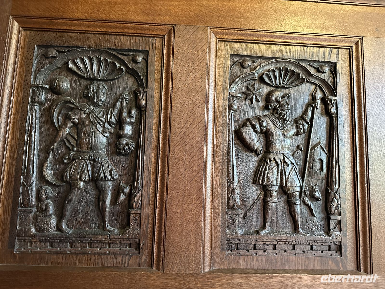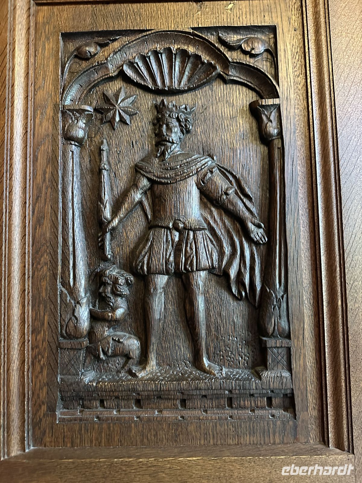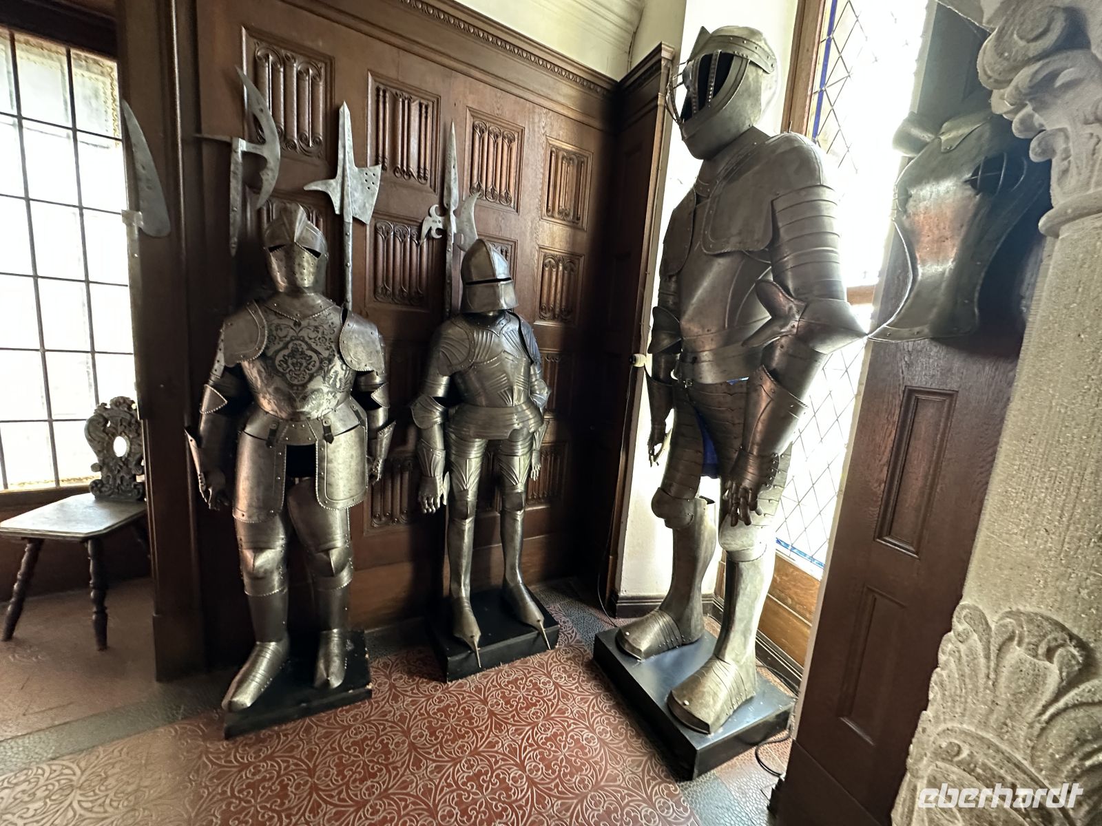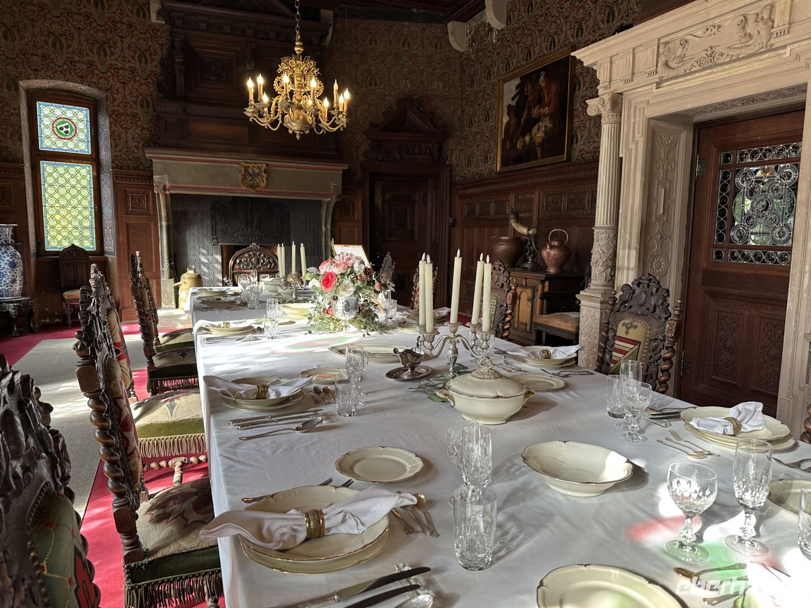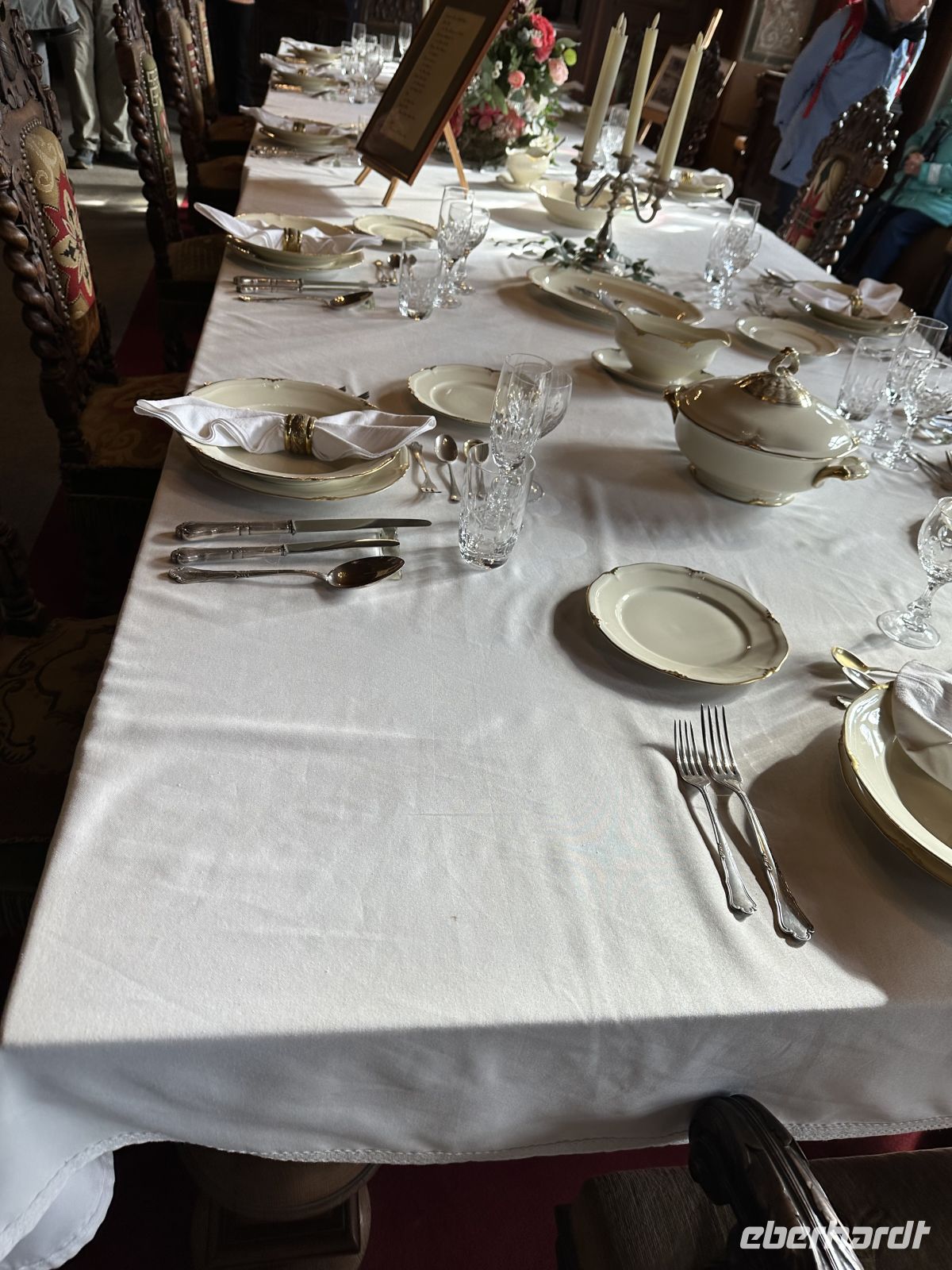Unsere Führung durch die Reichsburg Cochem beginnt im sogenannten gotischen Zimmer, das auch Kemenate genannt wird. Der Begriff "Kemenate" stammt ursprünglich vom lateinischen Wort "caminata" ab, was "beheizbarer Raum" bedeutet. Im Mittelalter war eine Kemenate oft der einzige beheizbare Wohnraum in einer Burg. Sie war meist für die Herrschaftsfamilie, besonders für die Burgherrin, und Kranke reserviert und diente als gemütlicher Rückzugsort. Daher wird sie oft als "Frauengemach" oder "Damenstube" bezeichnet. Bei der Wiederherstellung der Burg wurde die Kemenate mit einem kunstvollen Kreuzrippengewölbe gestaltet, das dem Raum seinen Namen „gotisches Zimmer“ verleiht. Das Zimmer hat eine reiche Ausstattung. Die Wände sind mit einer hohen Holzvertäfelung und handbemalten Ornamenten verziert, die teilweise mit Blattgold ausgelegt sind. Die Decke ist ebenfalls aufwendig gestaltet. Ein besonderes Highlight ist der große Kamin, der mit Delfter Kacheln ausgelegt ist. Die Möbel, darunter ein wertvoller Tisch aus Ebenholz und Nussbaum sowie ein großes Buffet mit Delfter Keramik, stammen aus dem 17. und 18. Jahrhundert und spiegeln den gehobenen Wohnstil dieser Zeit wider. Als Nächstes kommen wir in das romanische Zimmer. Der Raum ist in schlichtem, romanischem Stil gehalten und vermittelt einen Eindruck davon, wie die Burg in ihrer frühen Bauphase ausgesehen haben könnte. Ein besonderes Merkmal dieses Zimmers sind die kleinen Fenster mit den Butzenscheiben. Diese Glasscheiben sind nicht flach, sondern haben eine konvexe, butzenartige Wölbung. Der Speisesaal ist ein weiterer Raum, der ebenfalls mit viel Liebe zum Detail im neugotischen Stil gestaltet wurde. Er hat eine kunstvolle hölzerne Balkendecke und ist mit wertvollen Möbeln ausgestattet, die dem gehobenen Wohnstil des 19. Jahrhunderts entsprechen. In der Mitte befindet sich ein eingedeckter Tisch, der darauf wartet, dass endlich die Gäste kommen. Das Jagdzimmer, durch welches wir ebenfalls kommen, dient als Vorraum zum Rittersaal und ist von der Jagdleidenschaft des Bauherrn Louis Ravené geprägt. Der Raum ist reich mit Jagdtrophäen und Holzschnitzereien verziert. An den Wänden finden sich Trophäen von Tieren aus den umliegenden Wäldern von Eifel und Hunsrück, zum Beispiel ein riesengroßes Wildschwein. Der Raum ist außerdem mit Möbeln im Stil der Neorenaissance ausgestattet und enthält einen großen Schrank aus dem 16. Jahrhundert, der aus Süddeutschland stammt. Es ist ein Übergangszimmer, von dem aus man über eine prachtvolle Holztreppe in den Waffensaal gelangt, wo Rüstungen ausgestellt sind. Die Burg verfügt über viele weitere Zimmer, die jedoch heute nicht zur Besichtigung vorgesehen sind. Und so kehren wir zurück zu unserer Stadtführerin, die mit uns zu Fuß zum Schiff zurück spaziert.