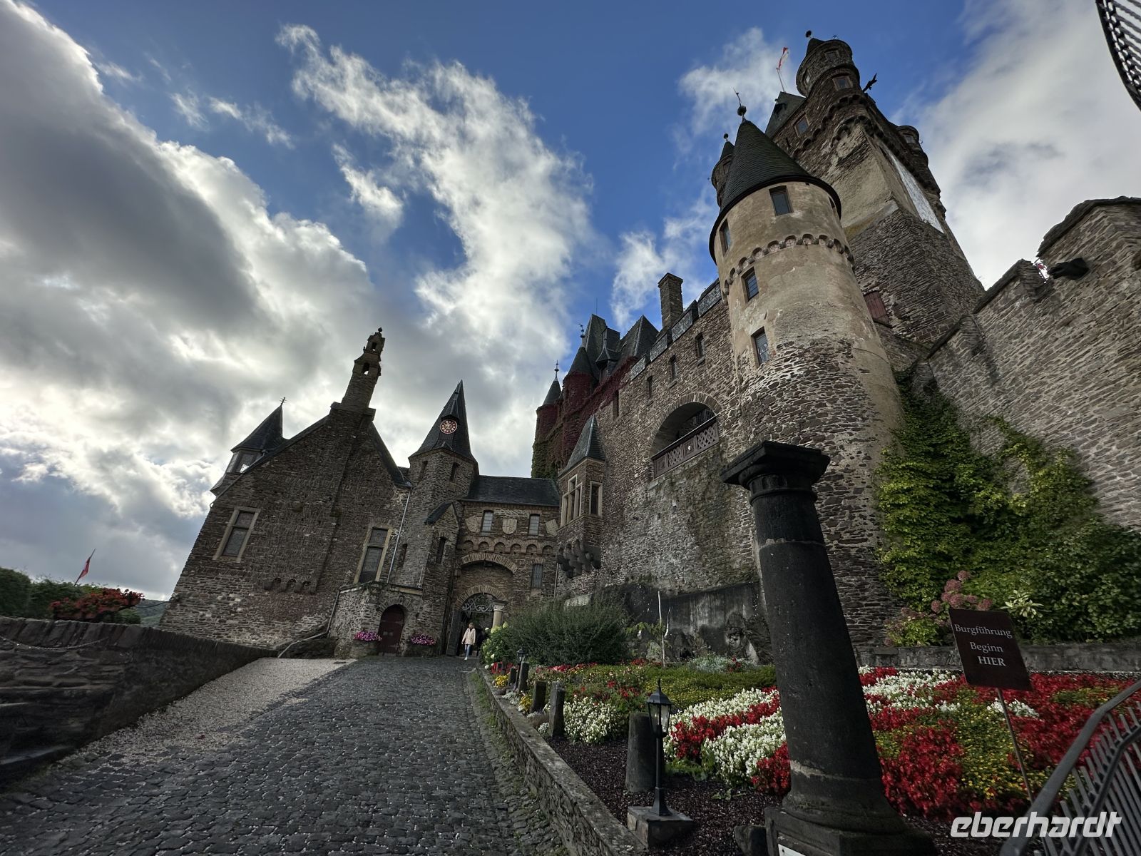 Nach dem Frühstück beginnt unsere Stadtbesichtigung in Cochem. Zur Fuß geht es zunächst über die Brücke bis zur Kirche. Von hier aus bringen uns zwei Shuttlebusse auf den Burgberg. Hier wartet die Reichsburg Cochem darauf, von uns erobert zu werden. Die Burg hat eine lange Geschichte, die vom Aufbau, Zerstörung und Wiederaufbau erzählt. Nachdem die Burg 1689 von französischen Truppen zerstört und fast 200 Jahre lang eine Ruine war, kaufte sie der wohlhabende Berliner Industrielle Louis Fréderic Jacques Ravené im Jahr 1868. Er war ein Vertreter des aufkommenden Bürgertums und ließ die Burg nicht nach den originalen Plänen wieder aufbauen. Stattdessen beauftragte er Architekten, sie im damals beliebten neugotischen Stil neu zu gestalten. Dieser Stil zeichnet sich durch spitze Bögen, filigrane Verzierungen und Zinnen aus, die an die Gotik des Mittelalters erinnern sollten. Es ging weniger um historische Authentizität als vielmehr um eine romantische, idealisierte Vorstellung einer Ritterburg.