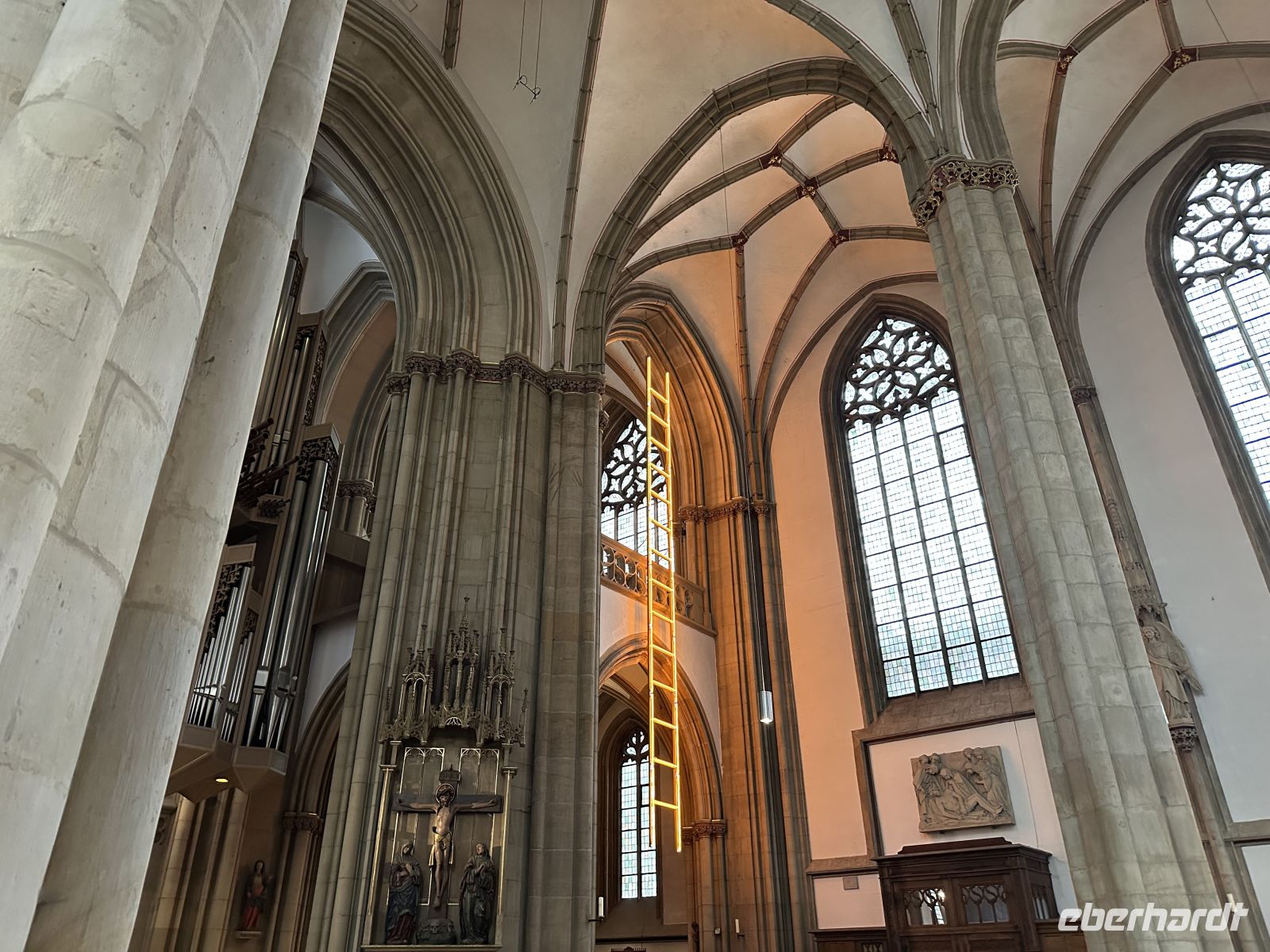 Hier können wir in kleinen Geschäften traditionelles Kunsthandwerk betrachten, Bonbons kosten und kaufen. Ein Stück weiter treffen wir auf das Paula Modersohn-Becker-Haus und Helga stellt uns diese ungewöhnliche Frau vor. Am Ende der Böttcherstraße, kurz bevor wir den Marktplatz erreichen, sehen wir das Hauptportal des Haus Atlantis. Wir blicken nach oben und sehen die monumentale, vergoldete Skulptur des Lichtbringers, die einen Mann auf einem Adler reitend darstellt. Sie symbolisiert die Suche nach Erleuchtung und ist ein starker visueller Kontrast zu den anderen Gebäuden. Wir gehen aus der Böttcherstraße heraus und betreten den Bremer Marktplatz. Gleich vor uns sehen wir die beiden Wahrzeichen der Stadt: den Bremer Roland, der die Freiheitsrechte Bremens symbolisiert und das Rathaus mit seiner beeindruckenden Fassade. Zunächst aber besuchen wir den St. Petri Dom. Dieser ist eines der ältesten und imposantesten Gebäude Bremens. Wir betreten die Kirche und sehen die eindrucksvolle Architektur, die Elemente der Romanik und der Gotik in sich vereint. Verblüffend ist auch, wie viele Orgeln es hier gibt. Im Bremer St. Petri Dom gibt es insgesamt fünf Orgeln, die alle unterschiedliche Bauweisen und Klangfarben haben. Jede Orgel erfüllt eine spezifische Rolle in der Kirchenmusik.