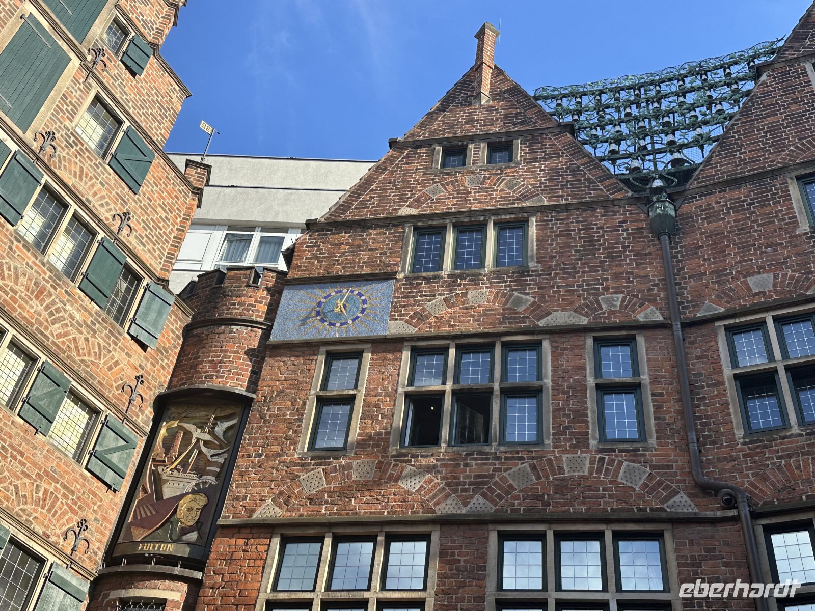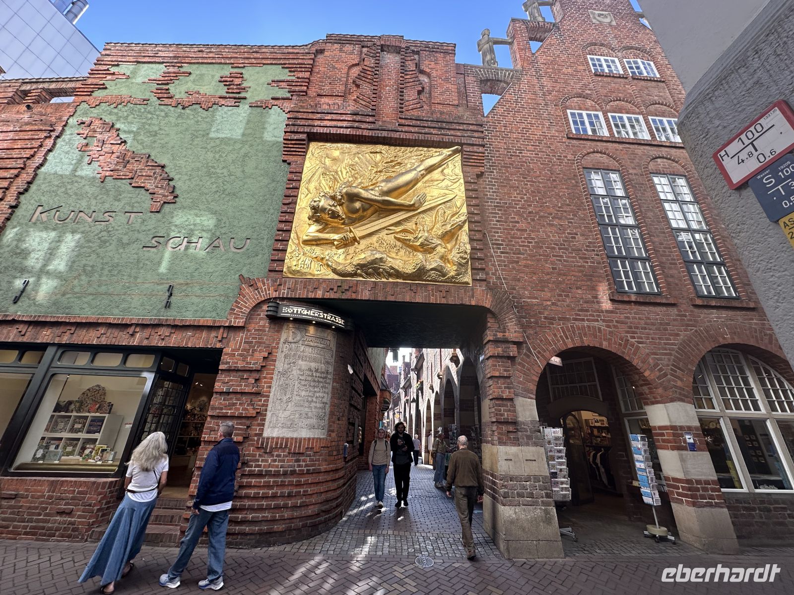 Nach vielen Schleusen, deren Ampeln für uns auf GRÜN standen, erreichen wir bereits am frühen Nachmittag Bremen. Das Wetter meint es heute gut mit uns und so können wir die Einfahrt vom Oberdeck beobachten. Unser Reiseveranstalter Eberhardt TRAVEL hat für uns eine private Stadtführung organisiert, die am Nachmittag stattfindet. Mit unserer Stadtführerin Helga spazieren wir entlang der Weser zur Böttcherstraße. Diese ist eine 110 Meter lange Gasse, die ein bedeutendes architektonisches Gesamtkunstwerk darstellt. Zuerst kommen wir zum Haus des Glockenspiels. Jede volle Stunde erklingen 30 Porzellan Glocken und ein Teil der Wand beginnt, sich zu drehen. Auf großen Holztafeln erscheinen Bilder von Ozeanbezwingern. Die Auswahl der dargestellten Persönlichkeiten spiegelt das Interesse des Bauherrn Ludwig Roselius am technischen und kulturellen Fortschritt wider. Insbesondere die Luftfahrtpioniere, wie die Besatzung des Flugzeugs "Bremen", waren für Roselius von großer Bedeutung. Sie symbolisieren den Mut, die Innovation und den globalen Geist, der seiner Meinung nach auch die Bremer Hansestadt auszeichnete. Weiter geht es in die enge Gasse, wo wir auf der linken Seite das Roselius-Haus erblicken. Wir könnten hineingehen und die Kunst- und Kunsthandwerkssammlungen aus der Renaissance und dem Barock bewundern, das bleibt aber für die Freizeit stehen. Daneben sehen wir das Haus der Sieben Faulen, dessen Name von einer alten Bremer Sage inspiriert ist. Die Sage von den „Sieben Faulen“ ist eine Bremer Volkssage, die von dem Schriftsteller Friedrich Wagenfeld im 19. Jahrhundert erfunden wurde. Die Geschichte erzählt von einem Bauern, der sieben Söhne hatte, die von allen als faul angesehen wurden, weil sie sich weigerten, die schwere und schmutzige Feldarbeit zu verrichten. Die Nachbarn spotteten über sie und nannten sie "die sieben Faulen". Doch die Söhne waren nicht faul, sondern erfinderisch: Sie zogen Gräben, um ihr Land zu entwässern, damit sie nicht ständig nasse Füße bekamen. Sie befestigten die Wege, damit sie nicht durch den Schlamm gehen mussten. Sie bauten einen Brunnen, um nicht ständig Wasser von der weit entfernten Weser holen zu müssen. Was die Leute für Faulheit hielten, war in Wirklichkeit eine kluge und innovative Art, die Arbeit zu vereinfachen und das Leben effizienter zu gestalten. Die Sage wurde so zu einem Symbol für den Bremer Erfindergeist.