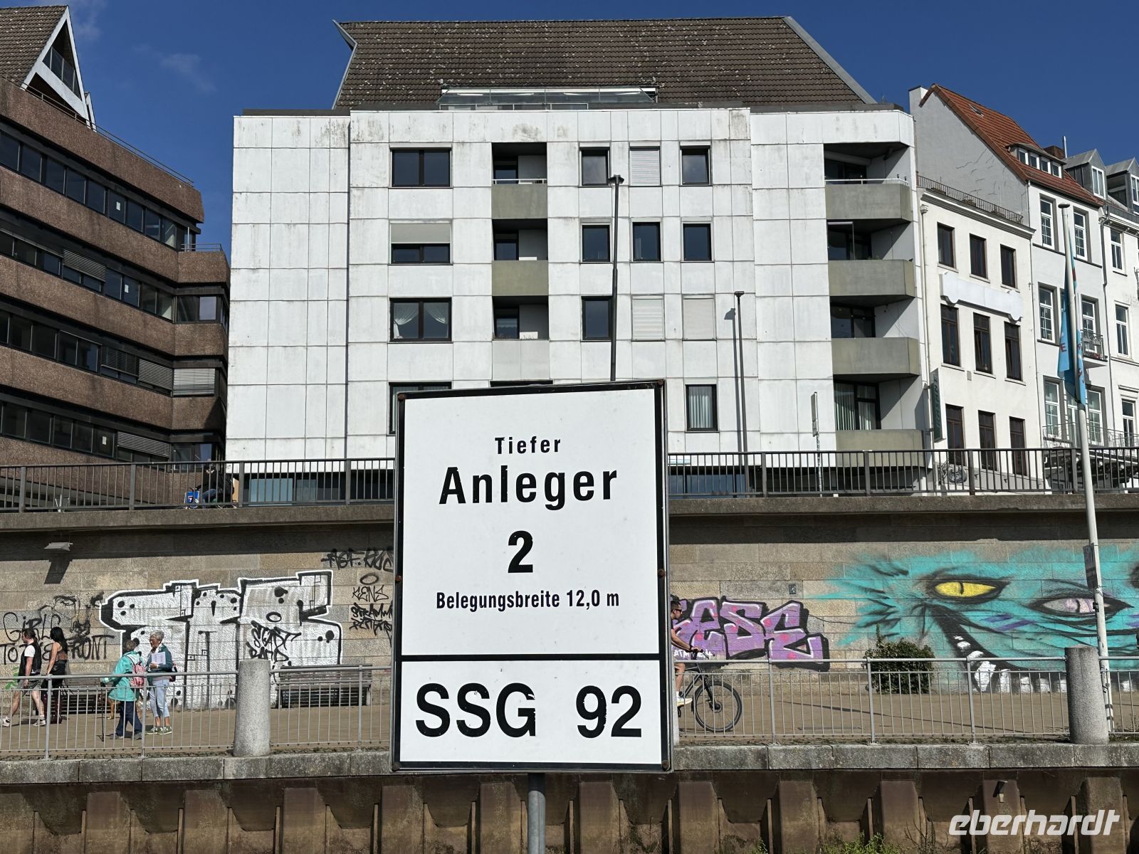 Unsere MS Thurgau Saxonia liegt in Lingen am gegenüberliegenden Ufer der Stadt. Bevor wir jedoch aussteigen, wird ein Liegeplatz frei, den unser Kapitän nutzt und uns somit den Weg ins Stadtzentrum verkürzt. Nach circa zehn Minuten Fußweg (600 m) sind wir bereits mitten in der Altstadt. Es ist noch vor neun Uhr und alle Läden sind geschlossen. Außer uns ist hier auch kaum jemand unterwegs. So können wir ein Bummeln und, was besonders wichtig ist, uns ein bisschen bewegen. Bereits um elf Uhr legen wir wieder ab und fahren weiter auf dem Dortmund-Ems-Kanal. Wir verlassen Lingen, wo Industrie und Wasserstraßen in besonderer Weise miteinander verbunden sind. Der Kanalhafen ist ein wichtiger Umschlagplatz für Güter, die über die Binnenschifffahrt transportiert werden, wie Baustoffe, Futtermittel und Container. Die nahe gelegenen Industriegebiete und Kraftwerke prägen die Kulisse und unterstreichen Lingens Rolle als Wirtschaftszentrum im Emsland. Neben der industriellen Seite hat Lingen auch einen historischen Kern, den wir gerade besucht haben.
