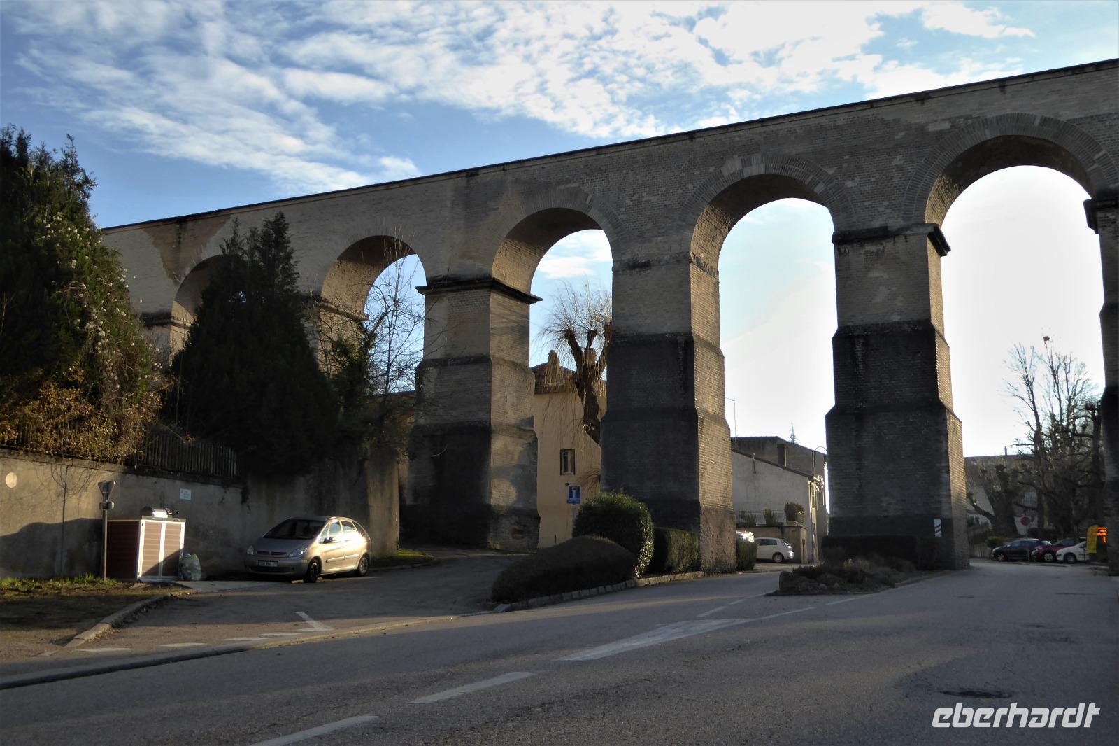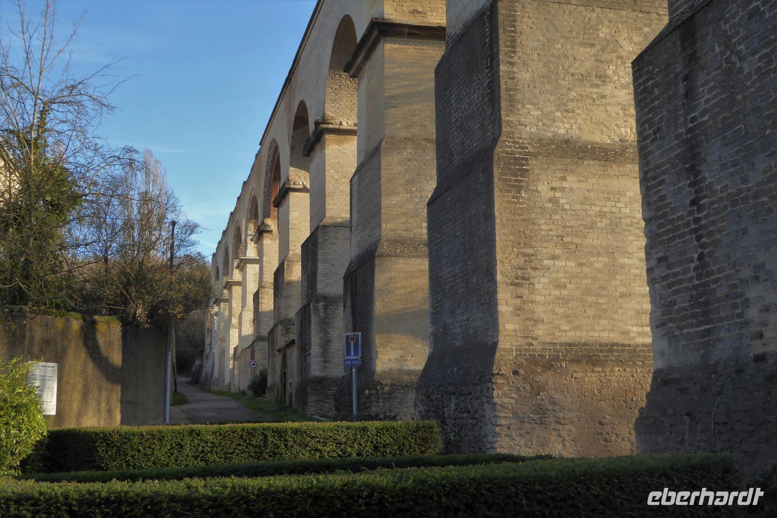 Am frühen Nachmittag setzten wir unsere Rundreise fort nach Jouy-aux-Arches. Das herrlich sonnige Wetter lockte uns zu einem Spaziergang entlang der gemächlich dahinfließenden Mosel. Dort konnten wir uns von einer beeindruckenden Leistung römischer Ingenieurskunst überzeugen: ein Aquädukt, das über 22 Kilometer Frischwasser von der Quelle in Gorze über die Mosel in die von den Römern Divodurum, Sitz der Götter, genannte Stadt Metz leitet. Dort lebten im zweiten Jahrhundert bereits über 40.000 Menschen. Die imposanten Reste der Anlage, 16 Bögen mit einer Höhe von bis zu 26 Metern, befinden sich mitten in dem kleinen Ort und der Straßenverkehr zwängt sich zwischen den gewaltigen Pfeilern der fast 2000 Jahre alten Konstruktion hindurch. In mediterranen Regionen sind solche Anlagen touristische Höhepunkte, Weltkulturerbe gar- hier in der Provinz gibt es nicht einmal einen Parkplatz für Reisebusse und so schlummert der Ort wie auch die Sehenswürdigkeit einen friedlichen Dornröschenschlaf. Anschließend besuchten wir eine kleine Destillerie, die Mélanie und ihr Mann vor zehn Jahren übernommen haben. Dort wird seit hundert Jahren Eau de Vie, Wasser des Lebens, edler Obstschnaps gebrannt. Dass man aus Mirabellen, der bevorzugten Obstsorte der Region Lothringen, auch noch andere köstliche Produkte herstellen kann, davon konnten wir uns bei einer Verkostung selber überzeugen.