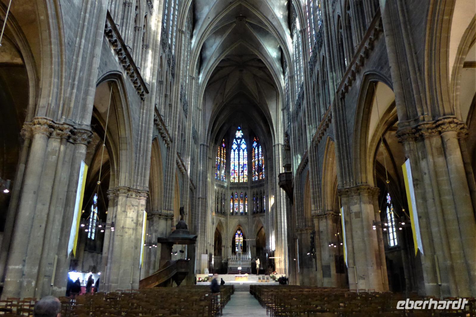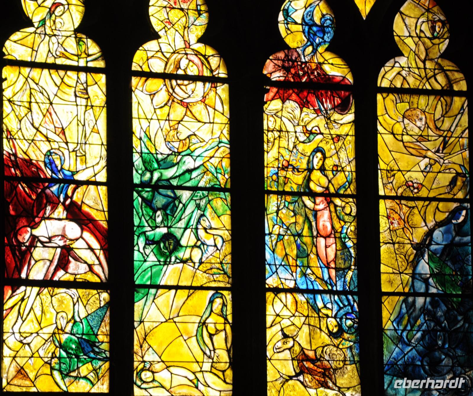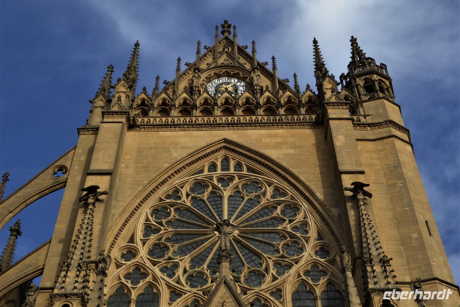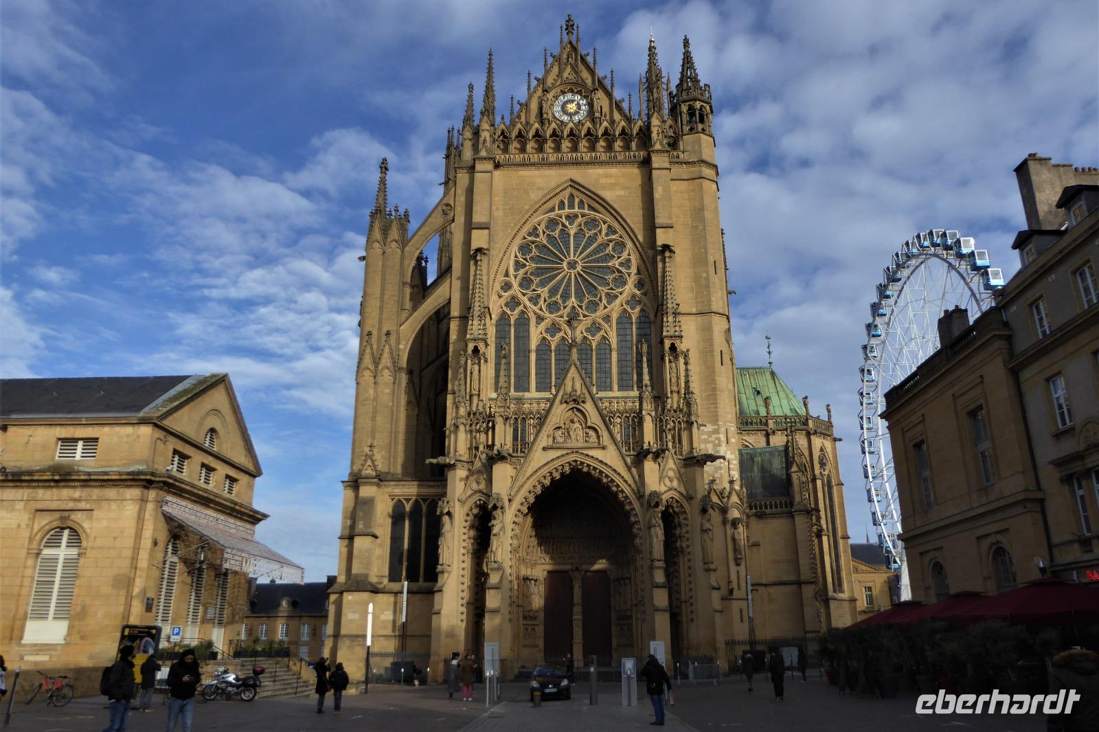 Heute führte unsere Rundreise nach Frankreich. Die Stadtgrenze Saarbrückens, der Landeshauptstadt des Saarlandes, ist gleichzeitig Landes- und auf 19 Kilometer auch Ländergrenze zu Frankreich. Gleich hinter der Grenze der "Goldenen Bremm" beginnt Lothringen, Lorraine, die von den beiden Weltkriegen schwer gebeutelte Region, die von 1871- 1919 Reichsland des Deutschen Reiches war. Die Franzosen haben sich längst mit der Geschichte des 20. Jahrhundert und den Deutschen ausgesöhnt. Konrad Adenauer, Helmut Kohl, Joachim Gauck und zuletzt Angela Merkel kamen als Freunde und setzten mit ihren Besuchen an den Stätten des Ersten Weltkriegs Zeichen der Versöhnung. Metz ist heute eine Stadt mit viel moderner Architektur, wie dem von Shigeru Ban 2010 errichteten Ausstellungsgebäude Centre Pompidou, mit seiner an einen chinesischen Reishut erinnernden Dachkonstruktion und einem neuen Stadtviertel, in dem international renommierte Architekten, wie Paul Chemetov, Nicolas Michelin, Christian de Portzamparc, Jean-Paul Viguier, Francois Valentiny, Philippe Starck oder Jean-Michel Wilmotte mit ihren Bauwerken wetteifern. Bei unserer Stadtrundfahrt begegnete uns auch Mettis, das neue supermoderne Nahverkehrsmittel, ein Hybridgelenkbus, und wir bestaunten die Gebäude, die einen großen Bogen von der römischen Antike, über das Mittelalter zur Kaiserzeit spannen. Doch die gotische Kathedrale St. Étienne, mit ihren flammenzungenartig nach oben strebenden zarten Fialen und Spitzen ist sicherlich die beeindruckendste Leistung der Baumeister vor 800 Jahren, die das damals Menschenmögliche zum Lobe Gottes errichteten. Wir stärkten uns bei einem leckeren Glühwein auf dem Weihnachtsmarkt direkt vor der Kathedrale, wo ein Riesenrad gemächlich seine Runden dreht und grandiose Blicke auf die fantastische Architektur des Gotteshauses bietet. Die Kathedrale von Metz gehört zu den schönsten Zeugnissen der gotischen Baukunst. Die "Laterne Gottes", wie sie gerne genannt wird, beeindruckt durch ihre leuchtenden Glasfenster aus acht Jahrhunderten, darunter auch die von Marc Chagall gestalteten Fenster im Chor mit ihren biblischen Geschichten. Eine besondere Betrachtung widmeten wir dem strahlend gelben Fenster Chagalls im Querhaus, das die Schöpfungsgeschichte in eindrücklichen Bildern in Szene setzt.