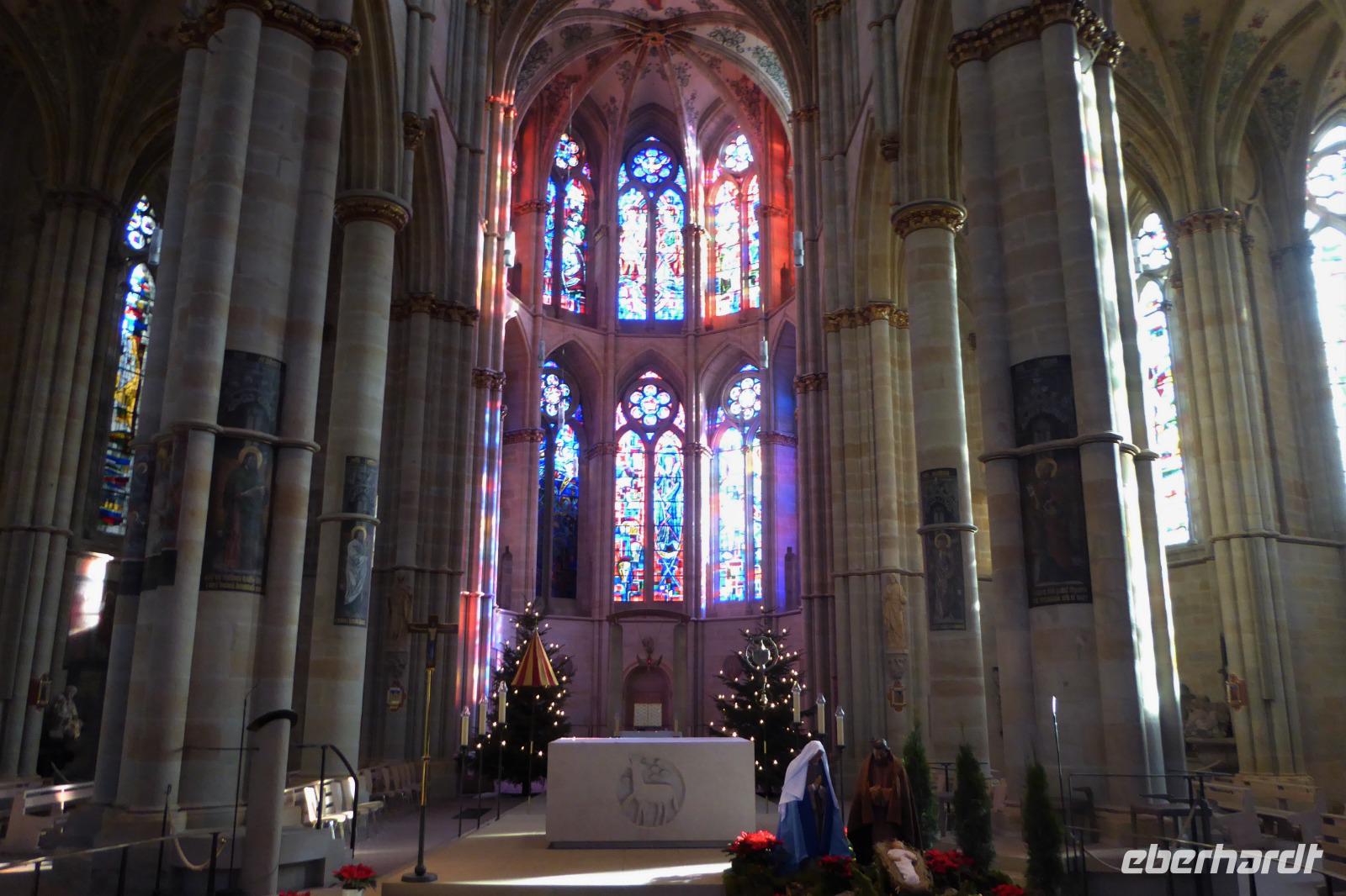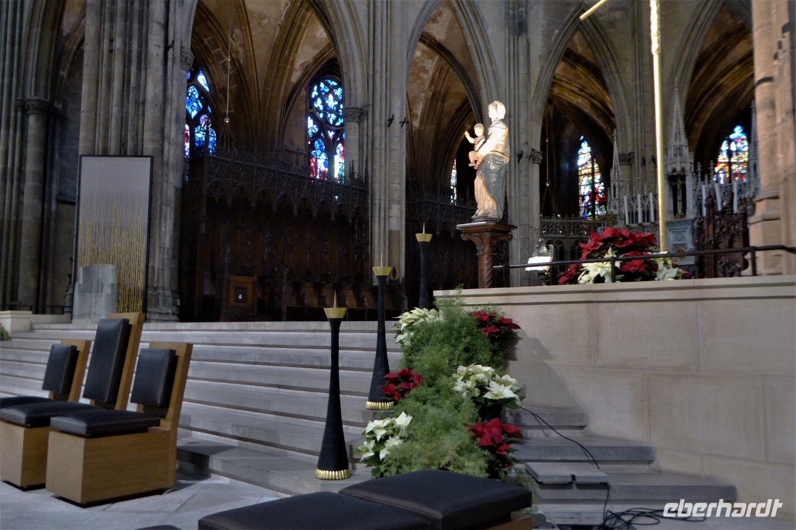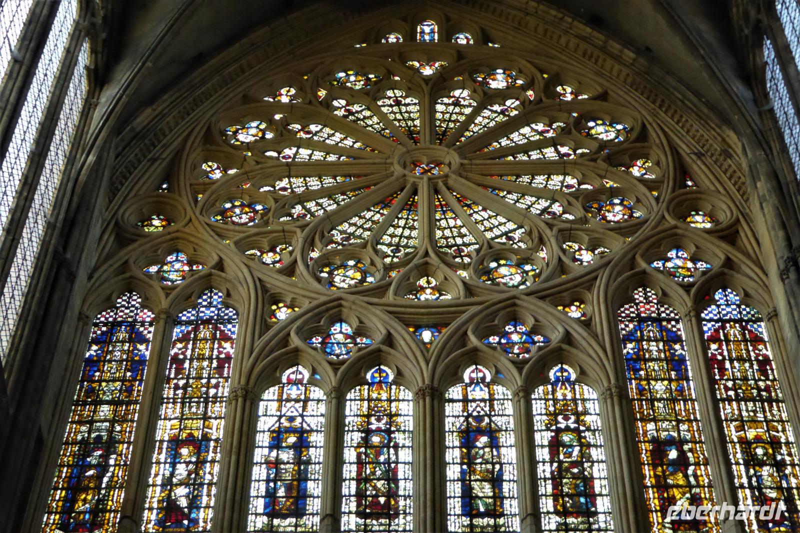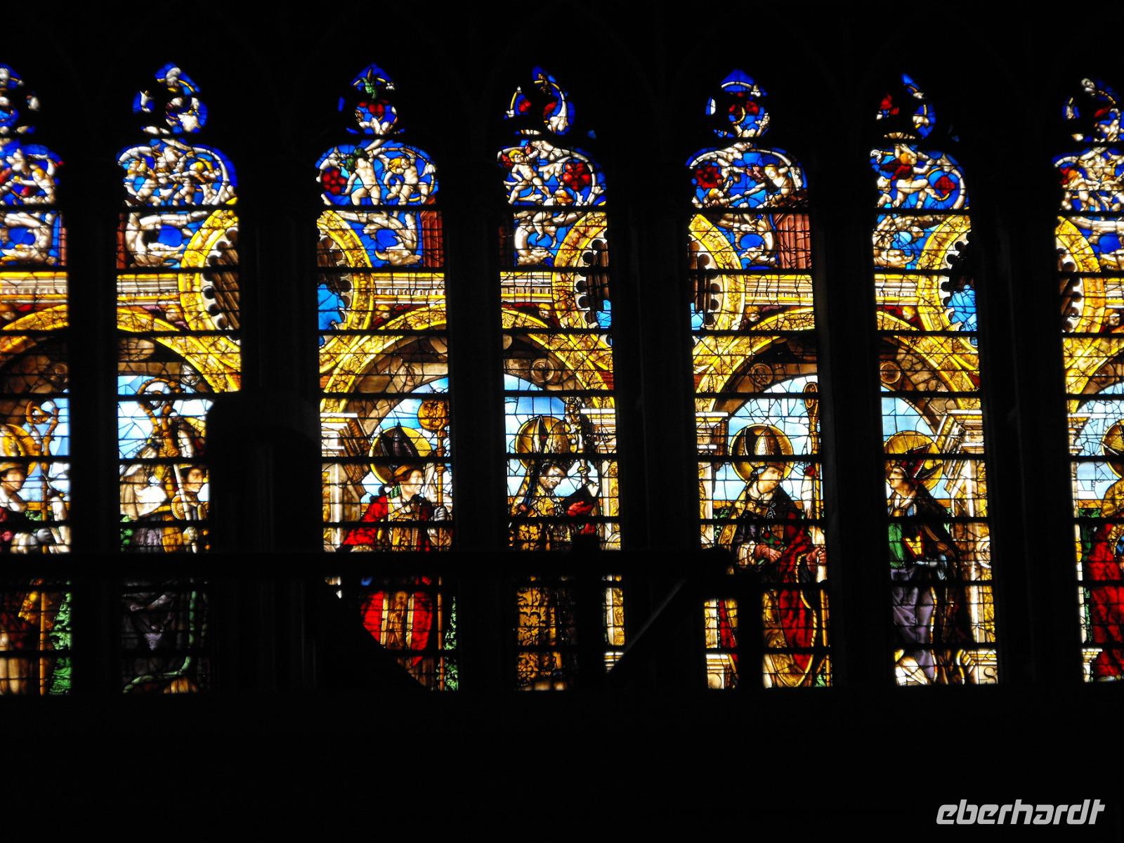 Heute führte unsere Rundreise nach Frankreich. Die Stadtgrenze Saarbrückens, der Landeshauptstadt des Saarlandes, ist gleichzeitig Landes- und auf 19 Kilometer auch Ländergrenze zu Frankreich. Gleich hinter der Grenze der "Goldenen Bremm" beginnt Lothringen, Lorraine, die von den beiden Weltkriegen schwer gebeutelte Region, die von 1871- 1919 Reichsland des Deutschen Reiches war. Die Franzosen haben sich längst mit der Geschichte des 20. Jahrhundert und den Deutschen ausgesöhnt. Konrad Adenauer, Helmut Kohl, Joachim Gauck und zuletzt Angela Merkel kamen als Freunde und setzten mit ihren Besuchen an den Stätten des Ersten Weltkriegs Zeichen der Versöhnung. Metz ist heute eine Stadt mit viel moderner Architektur, wie dem von Shigeru Ban 2010 errichteten Ausstellungsgebäude Centre Pompidou, mit seiner an einen chinesischen Reishut erinnernden Dachkonstruktion und einem neuen Stadtviertel, in dem international renommierte Architekten, wie Paul Chemetov, Nicolas Michelin, Christian de Portzamparc, Jean-Paul Viguier, Francois Valentiny, Philippe Starck oder Jean-Michel Wilmotte mit ihren Bauwerken wetteifern. Bei unserer Stadtrundfahrt begegnete uns auch Mettis, das neue supermoderne Nahverkehrsmittel, ein Hybridgelenkbus, und wir bestaunten die Gebäude, die einen großen Bogen von der römischen Antike, über das Mittelalter zur Kaiserzeit spannen. Doch die gotische Kathedrale St. Étienne, mit ihren flammenzungenartig nach oben strebenden zarten Fialen und Spitzen ist sicherlich die beeindruckendste Leistung der Baumeister vor 800 Jahren, die das damals Menschenmögliche zum Lobe Gottes errichteten. Wir stärkten uns bei einem leckeren Glühwein auf dem Weihnachtsmarkt direkt vor der Kathedrale, wo ein Riesenrad gemächlich seine Runden dreht und grandiose Blicke auf die fantastische Architektur des Gotteshauses bietet. Die Kathedrale von Metz gehört zu den schönsten Zeugnissen der gotischen Baukunst. Die "Laterne Gottes", wie sie gerne genannt wird, beeindruckt durch ihre leuchtenden Glasfenster aus acht Jahrhunderten, darunter auch die von Marc Chagall gestalteten Fenster im Chor mit ihren biblischen Geschichten. Eine besondere Betrachtung widmeten wir dem strahlend gelben Fenster Chagalls im Querhaus, das die Schöpfungsgeschichte in eindrücklichen Bildern in Szene setzt.