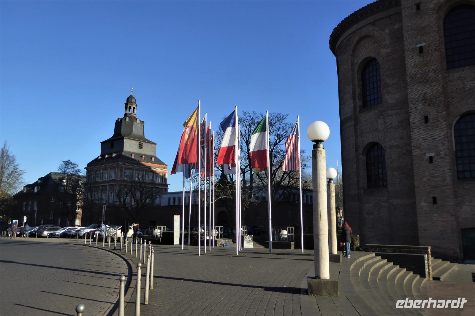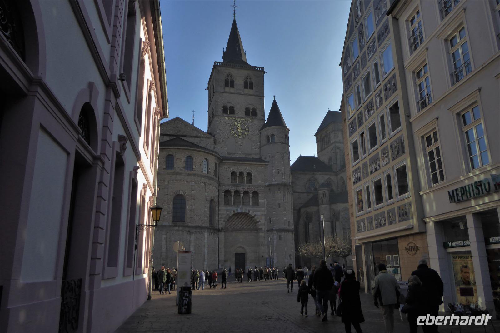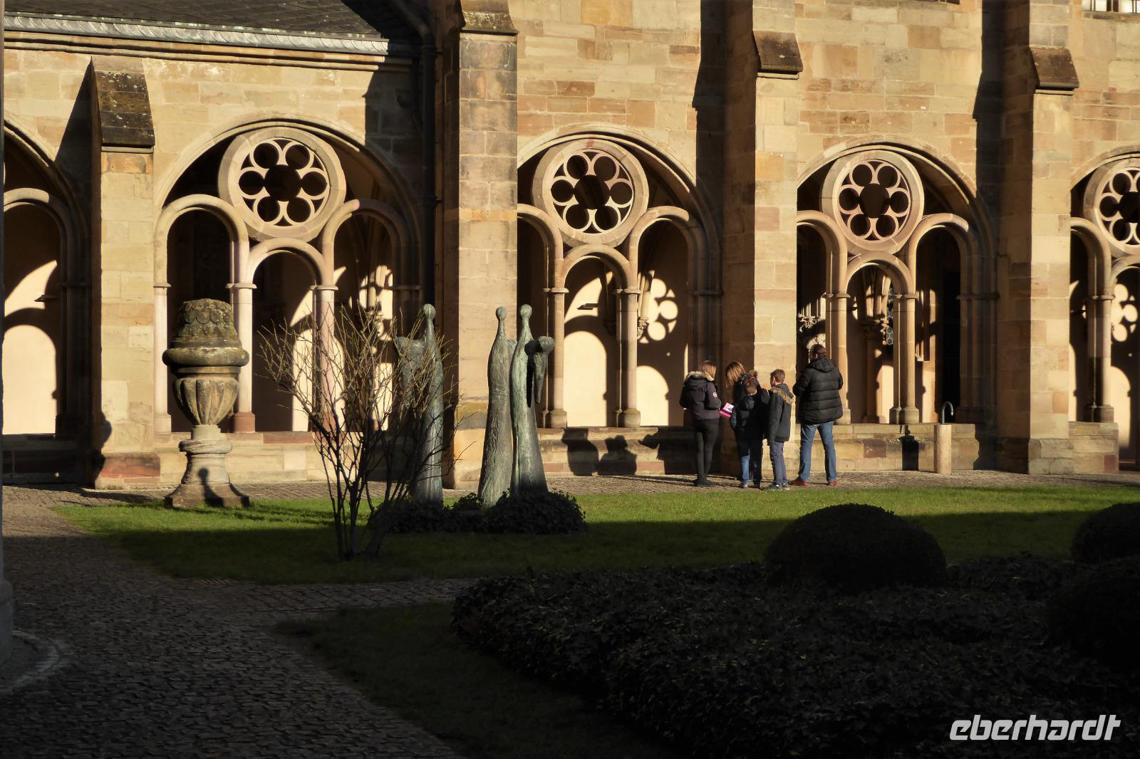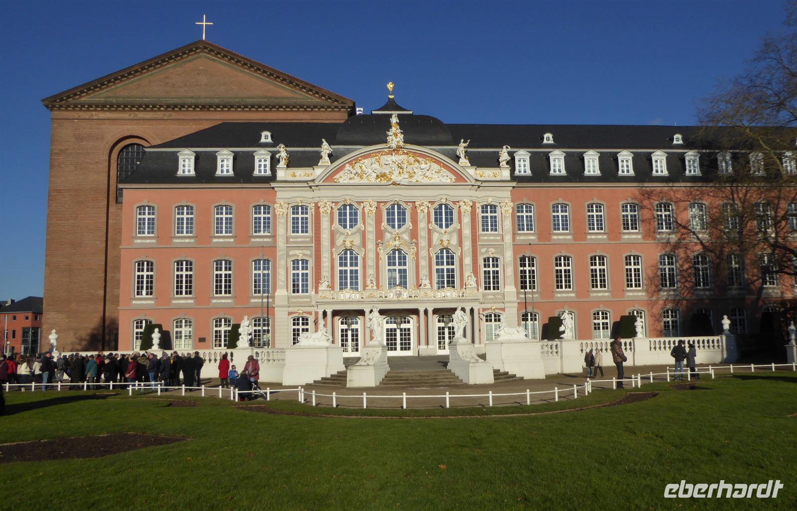 Über die A1 erreichten wir in einer guten Stunde den Rastplatz Moselblick. Die vermeintlich älteste Stadt Deutschlands, Trier, lag noch im dichten Morgennebel, der erst langsam einen Blick auf die Weinberge der Mosel gestattete, die sich bis an die Stadtgrenze Triers ausdehnen. Vorbei an der Römerbrücke, den Ausgrabungen an der Barbara Therme, der mittelalterlichen Stadtmauer, der Synagoge, den Resten der gewaltigen Konstantin Therme und dem Rheinischen Landesmuseum erreichten wir die imposante Porta Nigra. Sie war eines der fünf Stadttore in der fast sechseinhalb Kilometer langen, von fünfzig Türmen bewehrten römischen Stadtmauer. Gleich daneben steht seit Mai 2018 die Statue von Karl Marx. Das 5.50 Meter hohe Bronzestandbild des Künstlers Wu Weishan ist ein Geschenk der Volksrepublik China an die Stadt Trier zum zweihundertsten Geburtstag des deutschen Philosophen, Ökonomen, Gesellschaftstheoretikers und politischem Journalisten Karl Marx, der in der Brückenstraße 10 geboren wurde. Ein Stadtspaziergang führte uns zum Judenviertel, zum Hauptmarkt und zum Domfreihof. Vor dem Dom liegt der Domstein, um den sich teuflische Legenden ranken. Der Dom steht auf den Fundamenten des Palastes der Helena, der Mutter Konstantin des Großen. Sie war es auch, die den Heiligen Rock nach Trier brachte. Der Heilige Rock, im Trierer Dom aufbewahrt, ist eine Reliquie, die vermeintlich Fragmente der Tunika Jesu Christi enthält. Die nächste Wallfahrt soll im Jahre 2033 stattfinden, als ein lebendiges Zeichen des Glaubens. Im Inneren des gewaltigen Gebäudes zeigen sich die Spuren der Bautätigkeit durch die Jahrhunderte. Eindrucksvoll hängt die Schwalbennestorgel des Orgelbauers Johannes Klais aus Bonn von 1974 mit ihren 5602 Orgelpfeifen und einem Gewicht von über 30 Tonnen, im Schiff über den Häuptern der Gläubigen. Die wärmende Wintersonne lockte uns wieder ins Freie und wir spazierten durch die belebte Innenstadt zur Konstantinbasilika, der ursprünglich römischen Palastaula des 4. Jahrhunderts. Sie misst 71 x 32,6 Meter bei einer Höhe von 36 Metern und ist somit das größte erhaltene Bauwerk aus der Römerzeit. In ihrem Inneren hätte die Porta Nigra drei Mal Platz! Das daran angebaute Kurfürstliche Palais glänzte in seiner barocken Pracht in der Sonne.