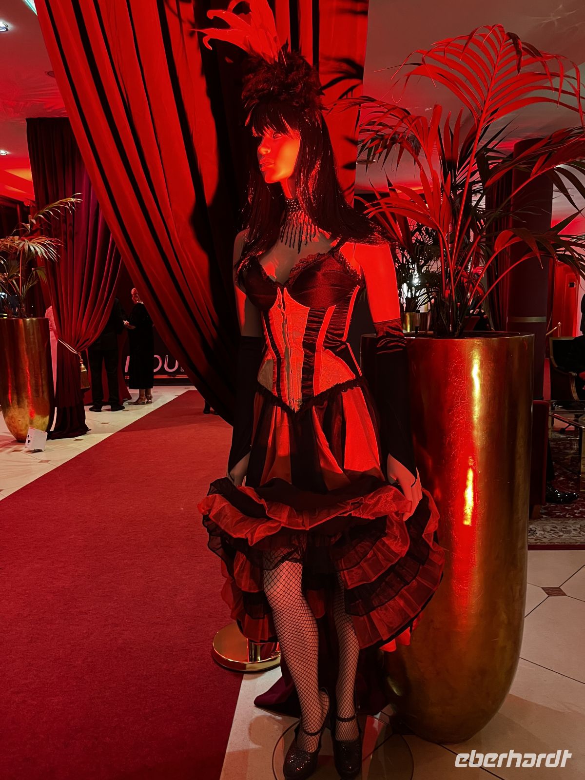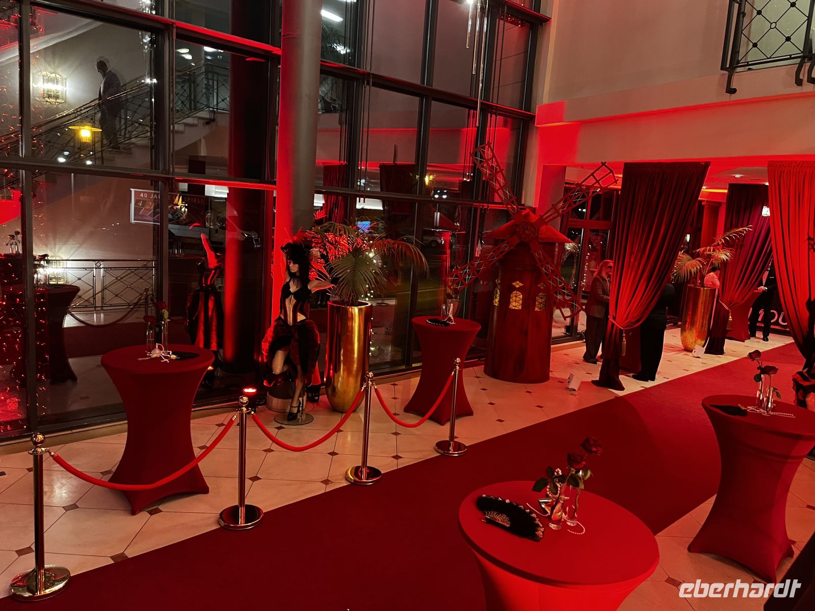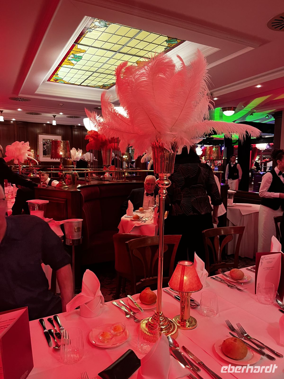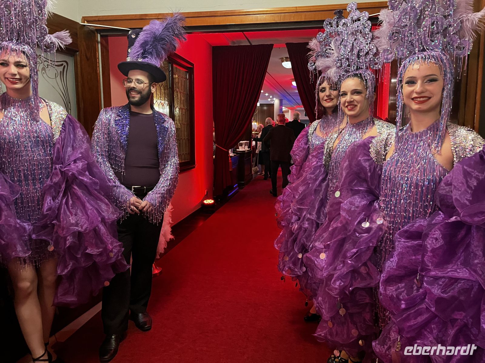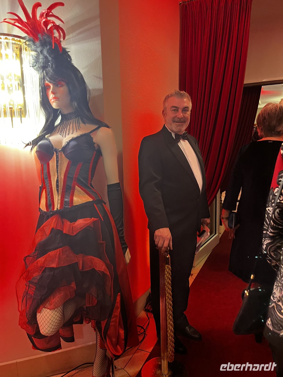 Um 19 Uhr werden wir dann ins Moulin Rouge entführt. Treffpunkt ist im toll geschmückten Foyer, wo es für jeden Gast ein Glas Champagner und Häppchen gibt. Die Künstler des Abends - direkt aus Paris eingeflogen ;-) - beginnen schon dort mit ihrer Animation. Großartige Kostüme, alles glänzt und funkelt zum großen französischen Thema, ein toller Anblick! 19:30 geht es dann hinein in den toll geschmückten Saal. Ich schmücke unseren Tisch dann noch mit Eberhardt – Karten und mitgebrachter Spaßdeko.