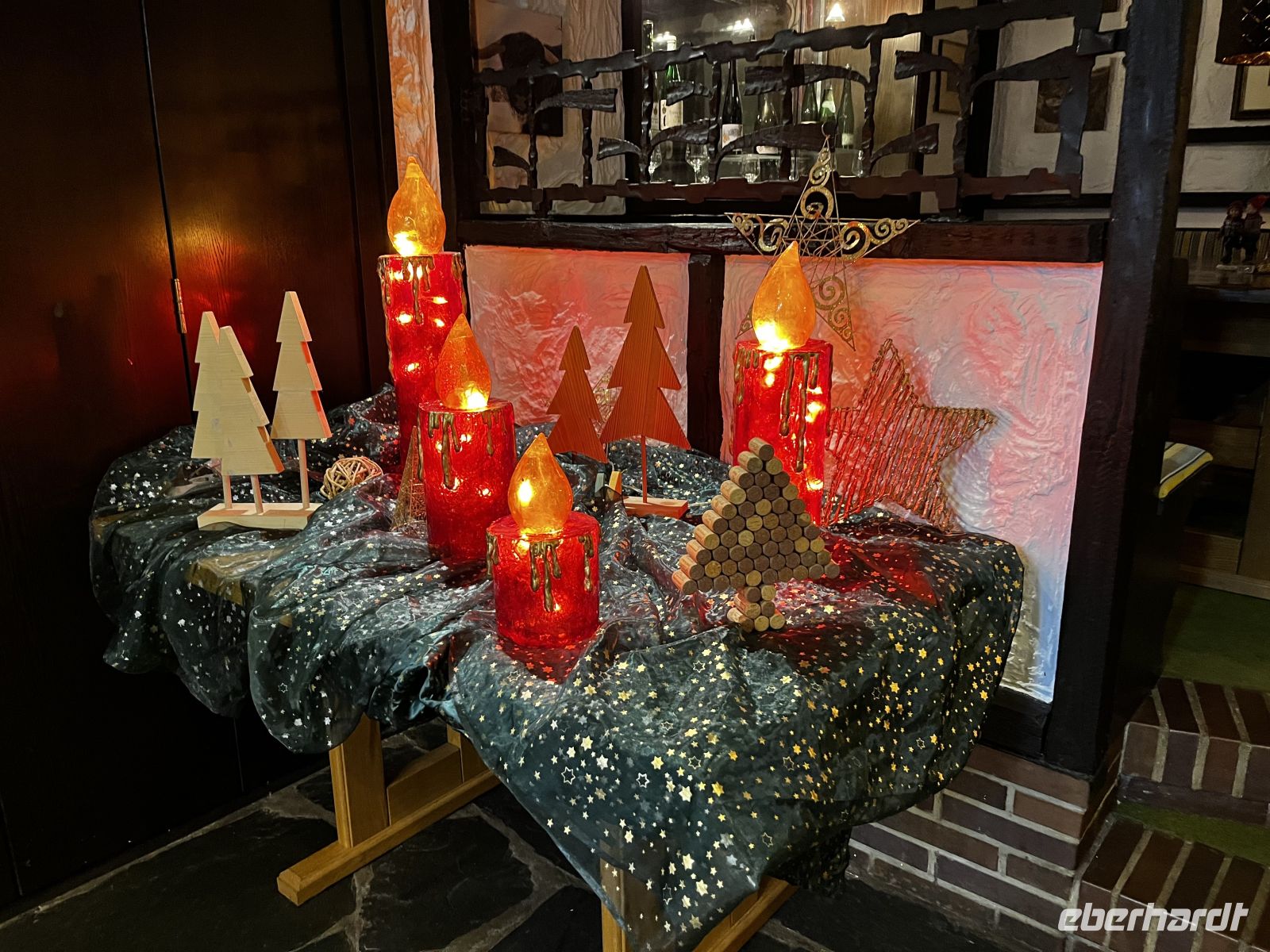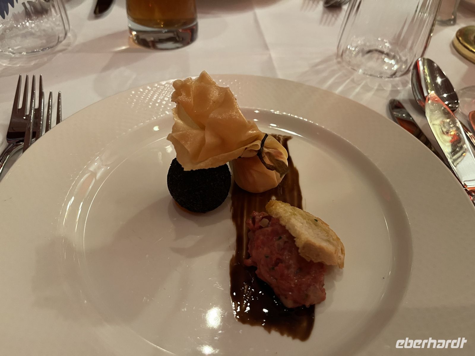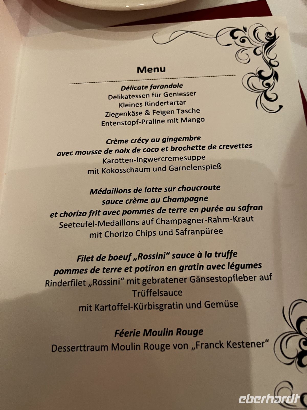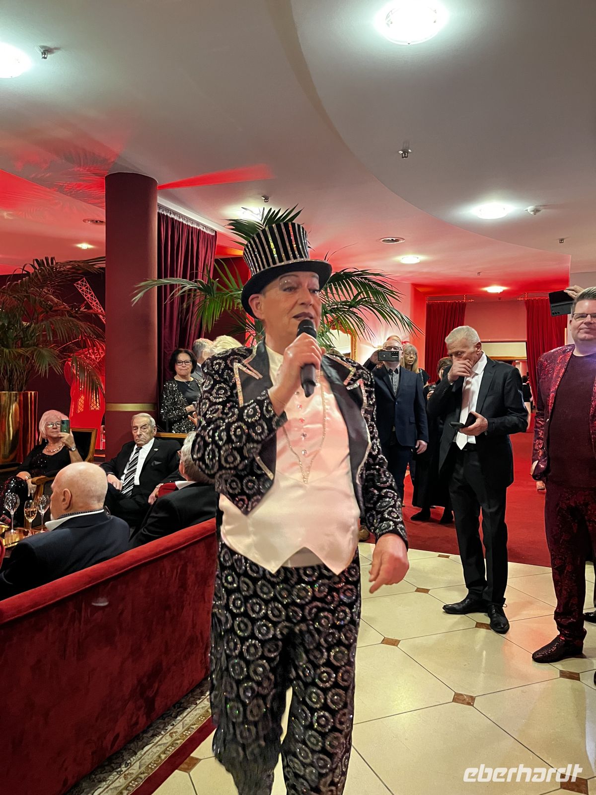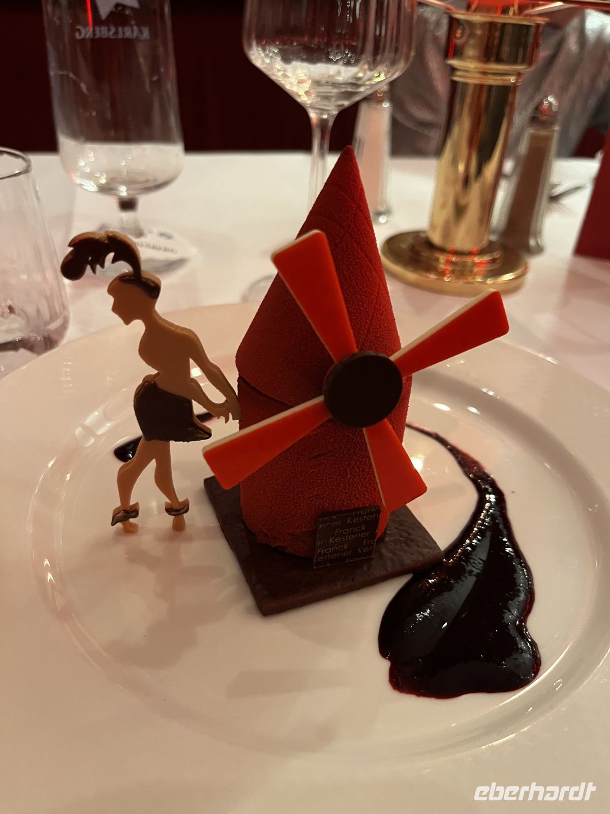 Um 19 Uhr werden wir dann ins Moulin Rouge entführt. Treffpunkt ist im toll geschmückten Foyer, wo es für jeden Gast ein Glas Champagner und Häppchen gibt. Die Künstler des Abends - direkt aus Paris eingeflogen ;-) - beginnen schon dort mit ihrer Animation. Großartige Kostüme, alles glänzt und funkelt zum großen französischen Thema, ein toller Anblick! 19:30 geht es dann hinein in den toll geschmückten Saal. Ich schmücke unseren Tisch dann noch mit Eberhardt – Karten und mitgebrachter Spaßdeko.