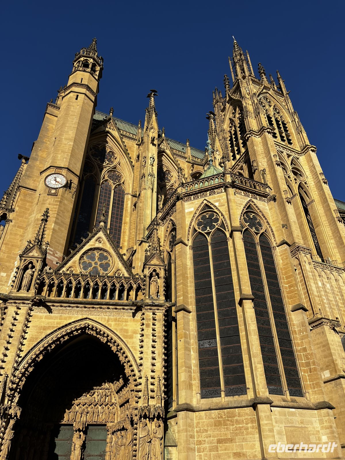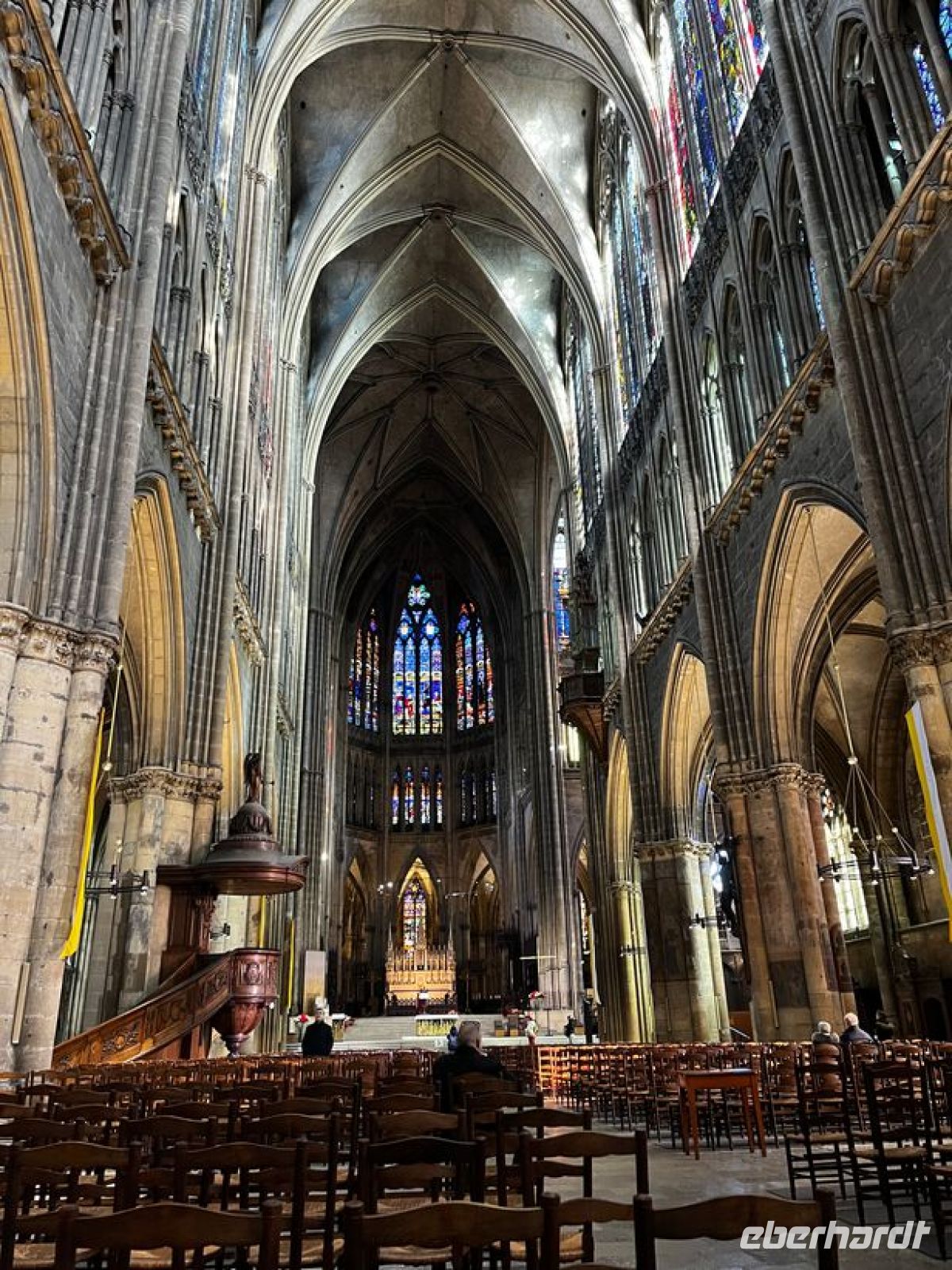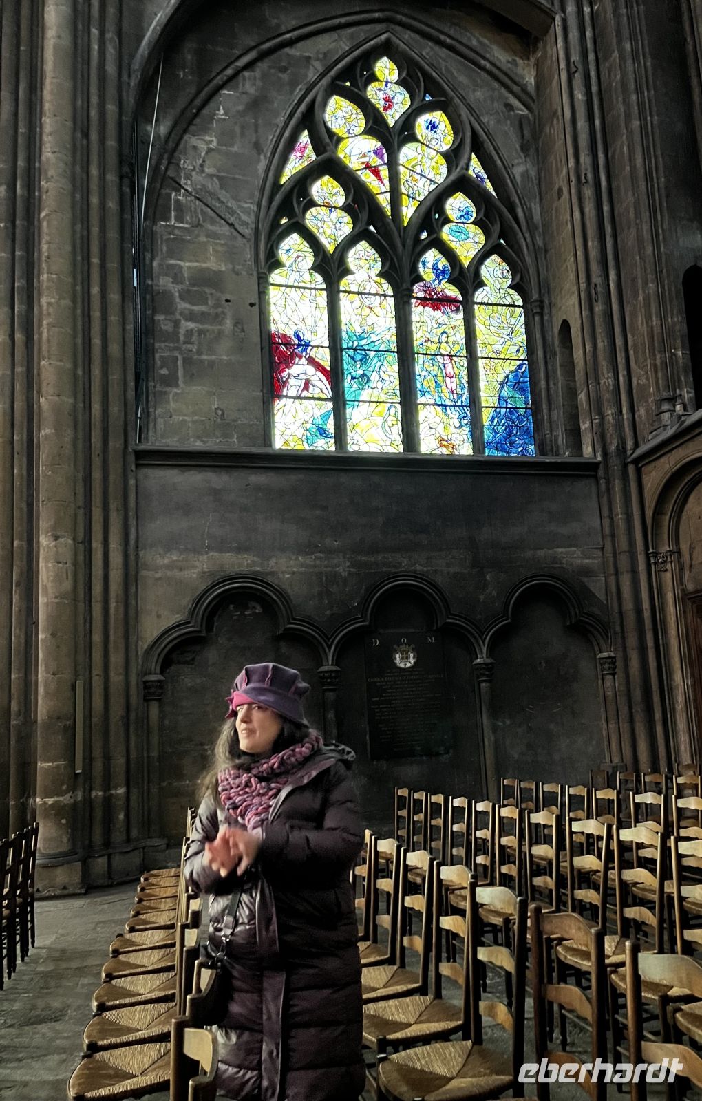 Vom Busparkplatz an der Mosel in der Nähe der Kathedrale sind ca. 10 min Fußweg zur Tourist-Information. Dort treffen uns unsere örtl. Stadtführerin. Leider gibt es hier KEIN WC! Nach dem Finden eines anderen WC im Kloster geht es endlich los: Rundgang durch dieses wunderschöne Städtchen mit Hügeln und Kopfsteinpflaster, Gassen und Stufen. Wir enden mit einer Besichtigung der Kathedrale – ein unglaublich großes und beeindruckendes architektonisches Kunstwerk! Innen mehr als 40 m hohe Gewölbe, unglaublich viele und tolle Fensterflächen und eine Außenlänge von 136m! Damit ist sie deutlich größer als die Westminster Abbey und nur unwesentlich kleiner als der Kölner Dom. Eine der meist unterschätzten Kathedralen der Welt und künstlerisch absolut hochwertig ausgestattet, nicht nur wegen der berühmten Fenster von Marc Chagall. Wir sind echt beeindruckt! Für dieses Bauwerk sollte man sich wirklich Zeit nehmen!