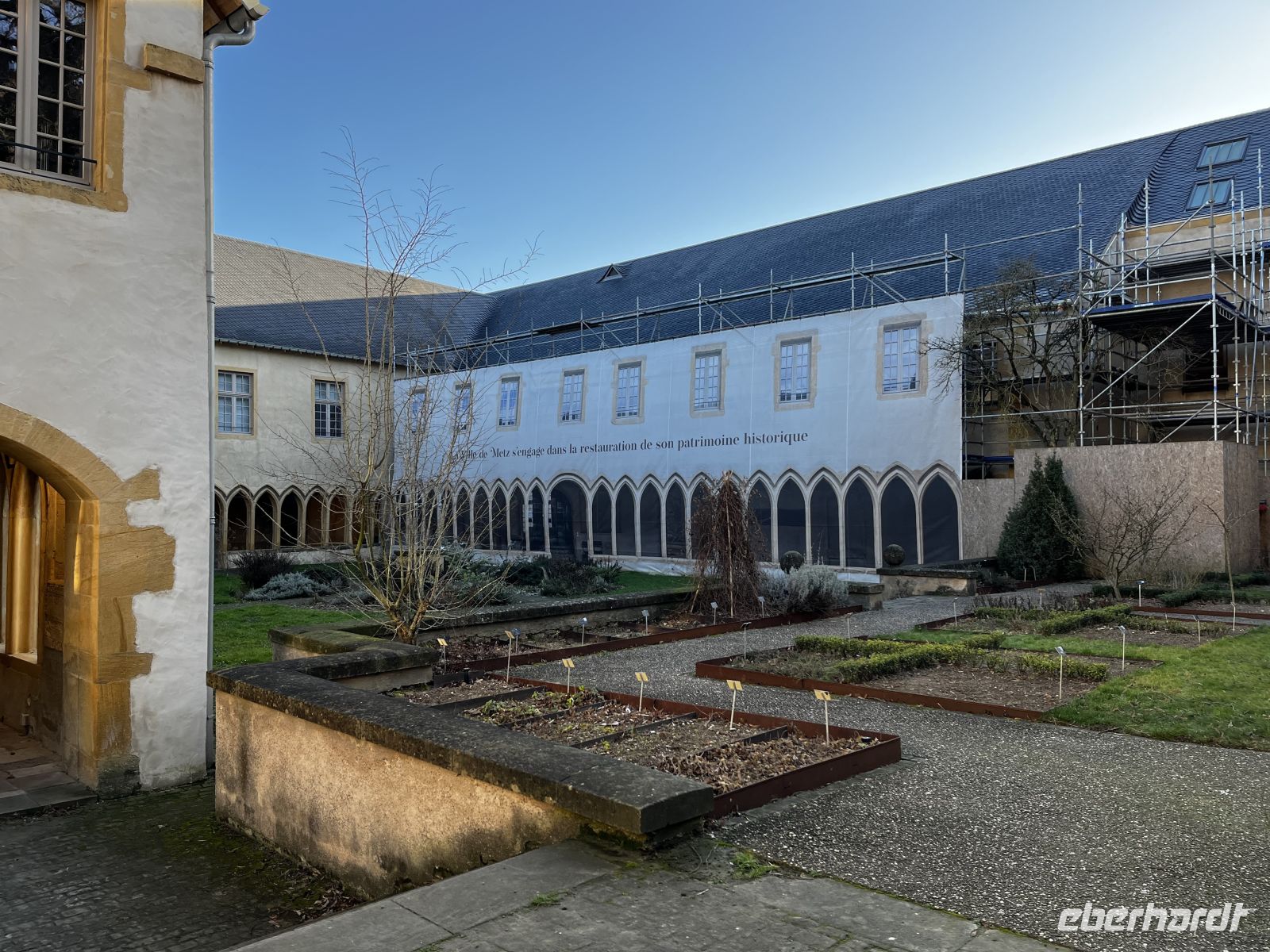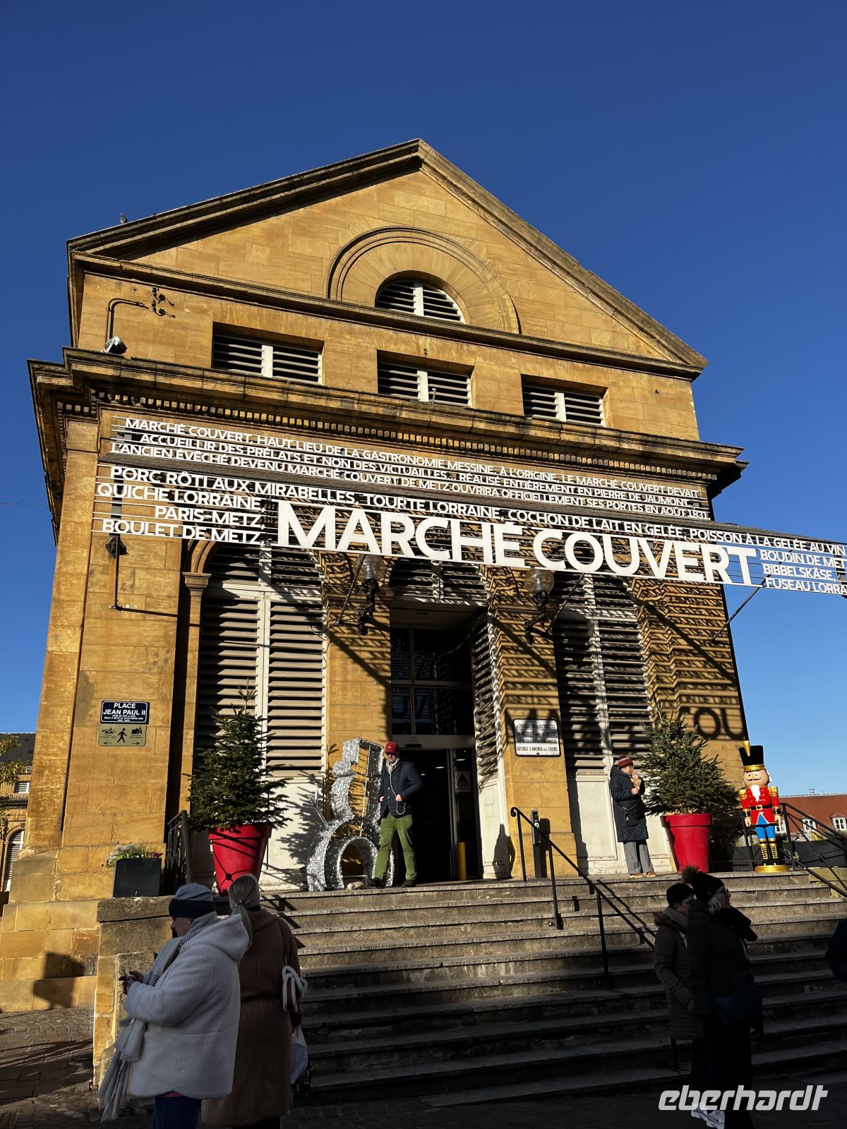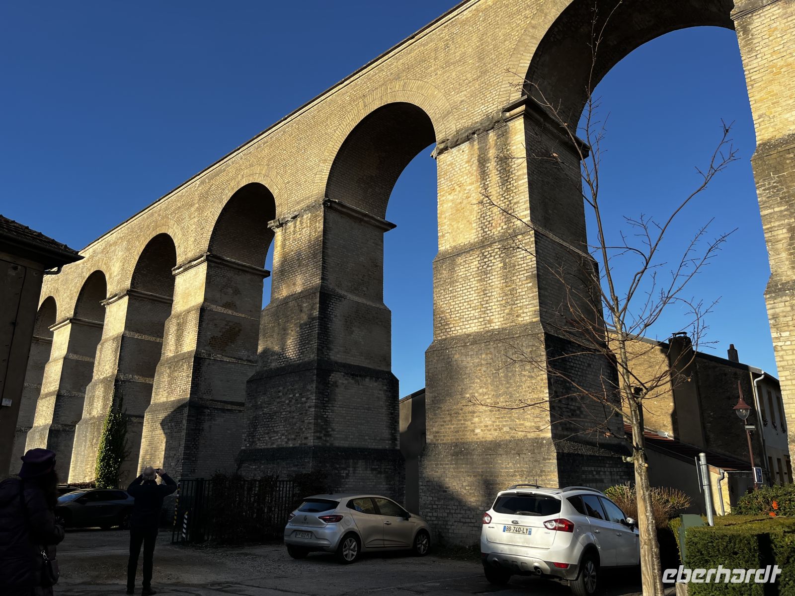 Im Anschluss verbringt jeder individuell seine Mittagspause (z. B. in der Markthalle) 13:30 treffen wir uns auf einen von Eberhardt spendierten Glühwein auf dem Weihnachtsmarkt. Die Sonne scheint, wir haben die Wahl zwischen rot oder weiß, und es schmeckt sehr lecker! Wir spazieren gemeinsam zurück zum Bus und fahren mit der örtl. Stadtführerin weiter durch die Metz, so dass wir auch noch mehr von dieser schönen Stadt sehen. Sogar ein römisches Äquadukt schauen wir uns auf unserem Weg Richtung Süden an.