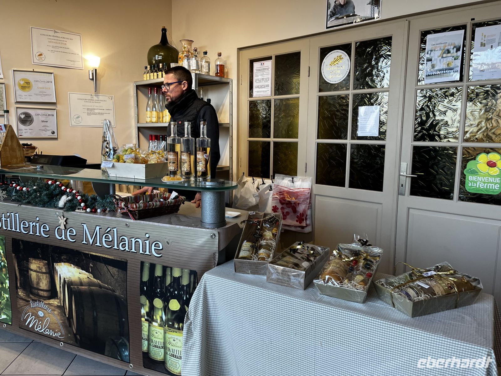 Kurz nach 15 Uhr kommen wir dann in der Destillerie Melanie an, welche für ihren leckeren Mirabellenbrand berühmt ist. Zur Begrüßung gibt es heißen Apfelsaft, bei den Temperaturen sehr willkommen! Jeanne erklärt uns sehr anschaulich die Herstellungstechnik des leckeren Mirabellenbrandes, und dann gibt es auch noch Tarteletts mit Mirabellen. Anschließend geht es nach nebenan in den Verkaufsraum. Dort können die Gäste reichlich verkosten und kaufen. Es dauert auch dementsprechend lange, ist einfach zu lecker ;-)