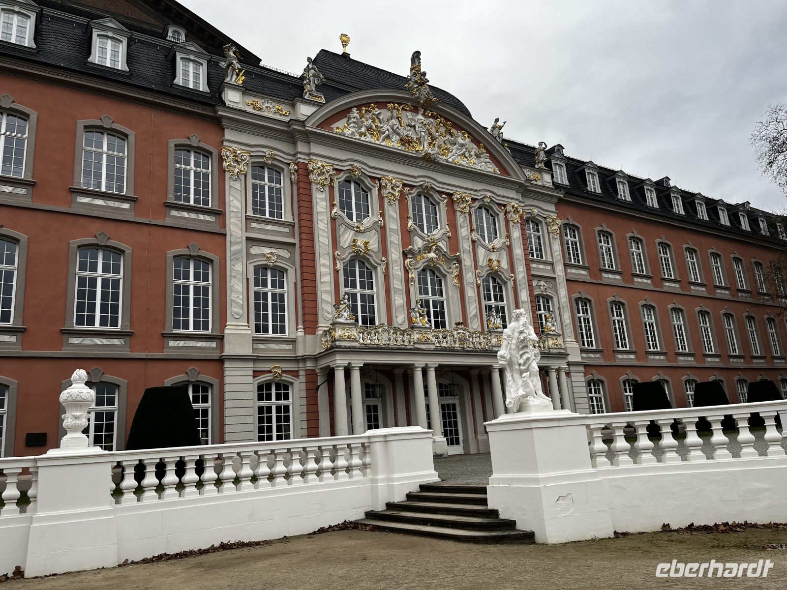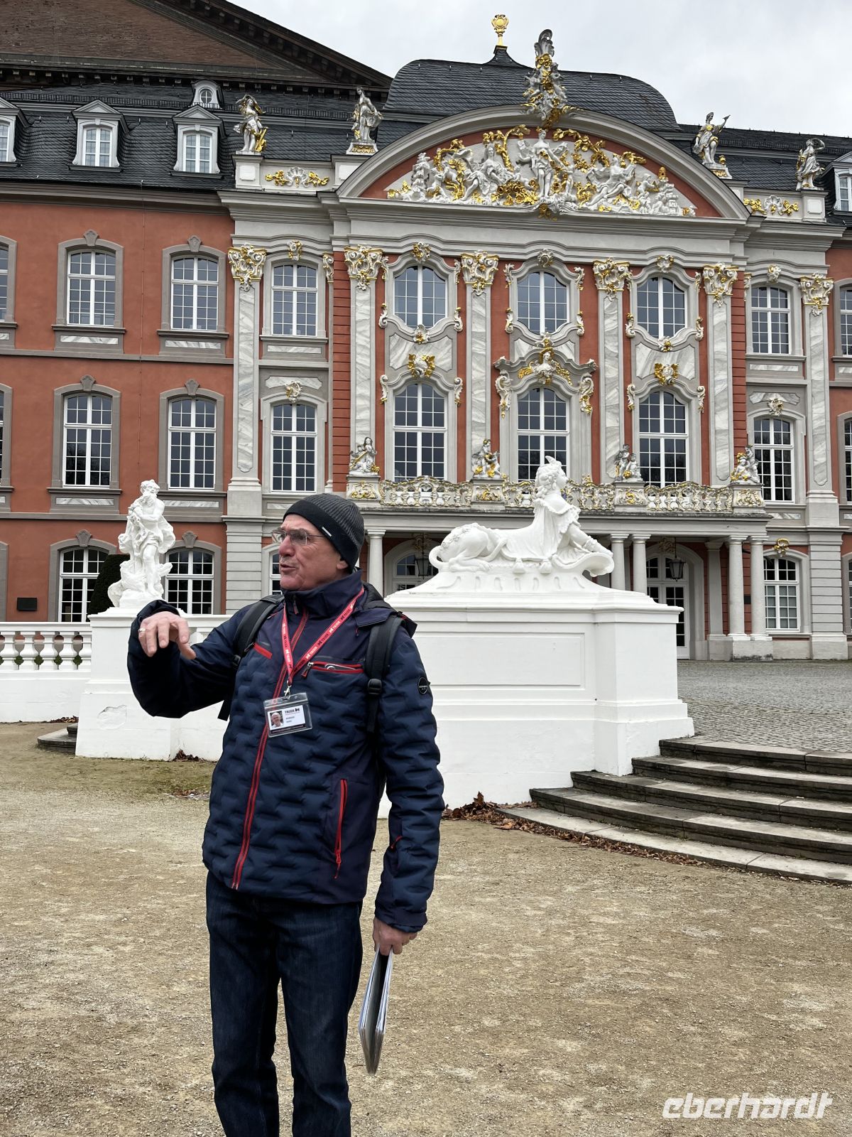 Nach einem späten Frühstück starten wir erst 10:30 mit dem Bus nach Trier. Es ist nasskalt und windig, aber Micha bringt uns gut in die wahrscheinlich älteste Stadt Deutschlands. An der Porta Nigra steigt dann der Örtl. Stadtführer zu uns in den Bus und begleitet uns auf der Rundfahrt durch Trier. Am Schloss steigen wir kurz aus und bestaunen diese beeindruckende und eigentlich täuschende Fassade. Im Anschluss gibt es von ihm als Insider noch eine sehr gute Stadtführung zu Fuß - incl. Dom, wo gerade ein herrliches Glockenspiel zu hören ist. Die wirklich interessante Tour endet 14 Uhr an der Porta Nigra. Die Gäste sind sehr zufrieden mit unserem Guide, aber ziemlich durchgefroren. Also heißt es jetzt etwas suchen, wo man etwas Warmes trinken kann. Das ist im fußläufigen Umfeld der Porta Nigra zu finden, die Gruppe teilt sich also auf. Um 15:30 sind alle wieder am Bus und wir starten zum Weingut Nell. Es sollte der Höhepunkt unserer Reise werden ;-)