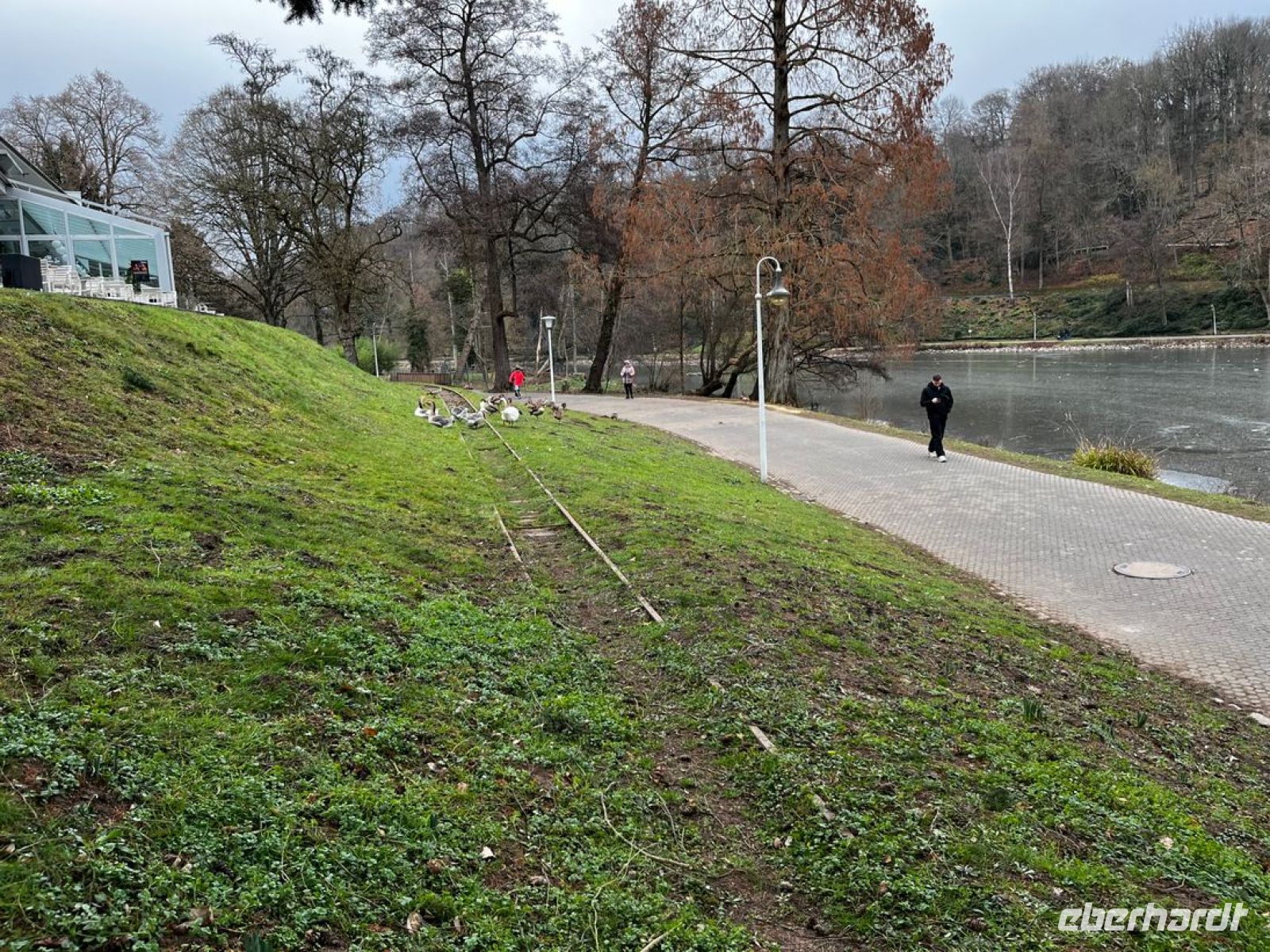 13:30 fahren wir zurück ins Hotel, wo bei unserer Rückkehr schon alles für die abendliche Moulin-Rouge-Party dekoriert und aufgebaut ist. Den Rest des Tages haben die Gäste Freizeit - für Wellness, Spaziergang um den See, schlafen oder oder ... Im Hotel gibt es einen sehr netten Wellnessbereich mit Sauna. Einige gehen nach Ende des Regens noch um den See spazieren. Das Gartengelände hinter dem Hotel gehörte zum Deutsch-Französischen Garten im Rahmen der Gartenschau 1960.