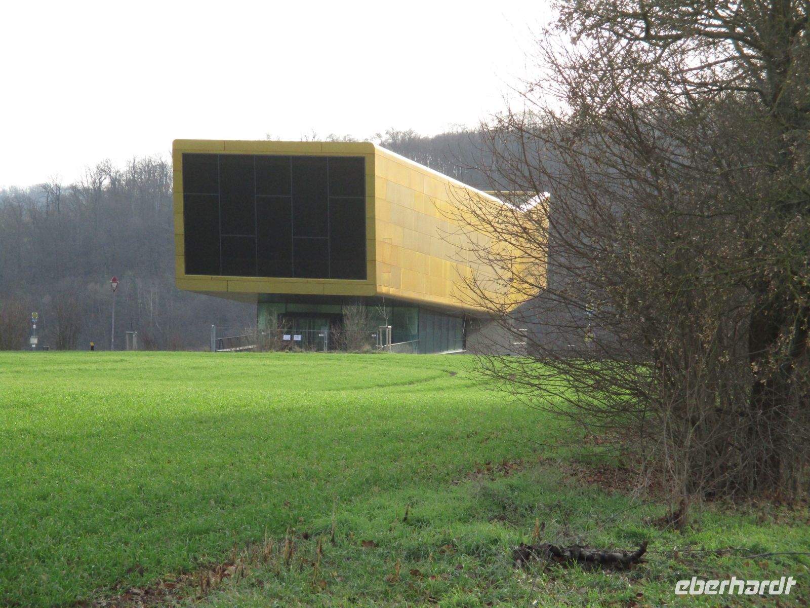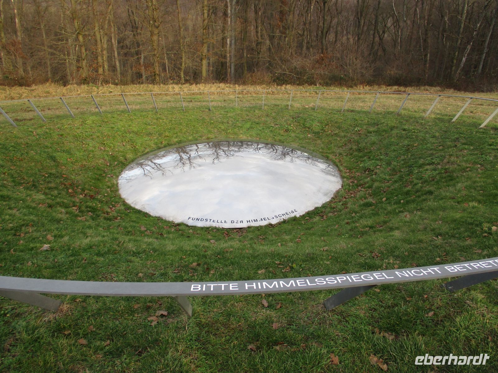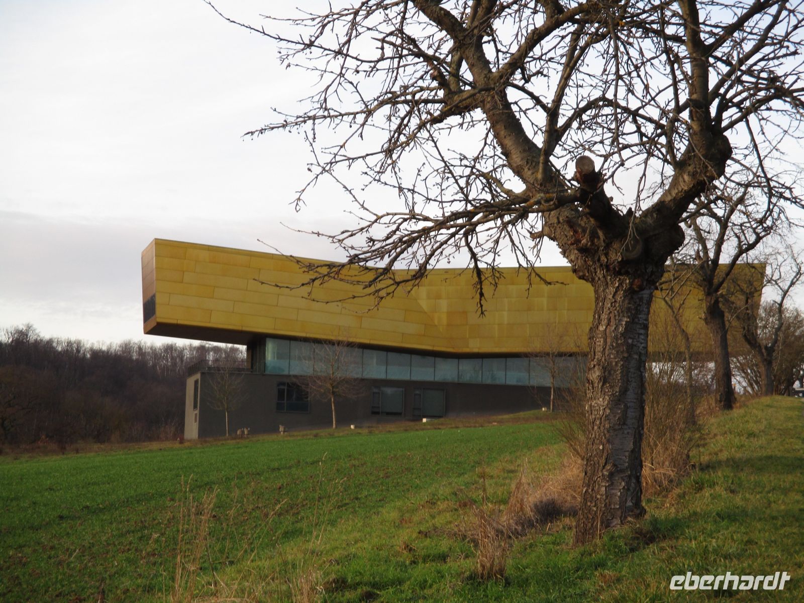 Nach dem Frühstück treffen sich die "Unentwegten",um die Fundstelle der Himmelsscheibe von Nebra zu sehen.Der Weg führt am wegen Umbaus geschlossenen Museum "Arche Nebra" vorbei ; eine Gelegenheit, den architektonisch interessanten Bau im Bild festzuhalten. Wir wandern ctwa eine Stunde den Mittelberg-vorbei an den "Wächtern" und dem " Waldpavillion" hinauf.Dort ist die Fundstelle durch eine gläserne Halbkugel gekennzeichnet, so dass man mit etwas Phantasie den Blick in den Himmel nacherleben kann.Ein- architektonisch passend - in zwei Teile gespaltener Aussichtsturm gibt einen wunderbaren Rundblick in die Saale- Unstrut - Landschaft und zeigt den Sonnenstand zur Sommer- und Wintersonnenwende an.