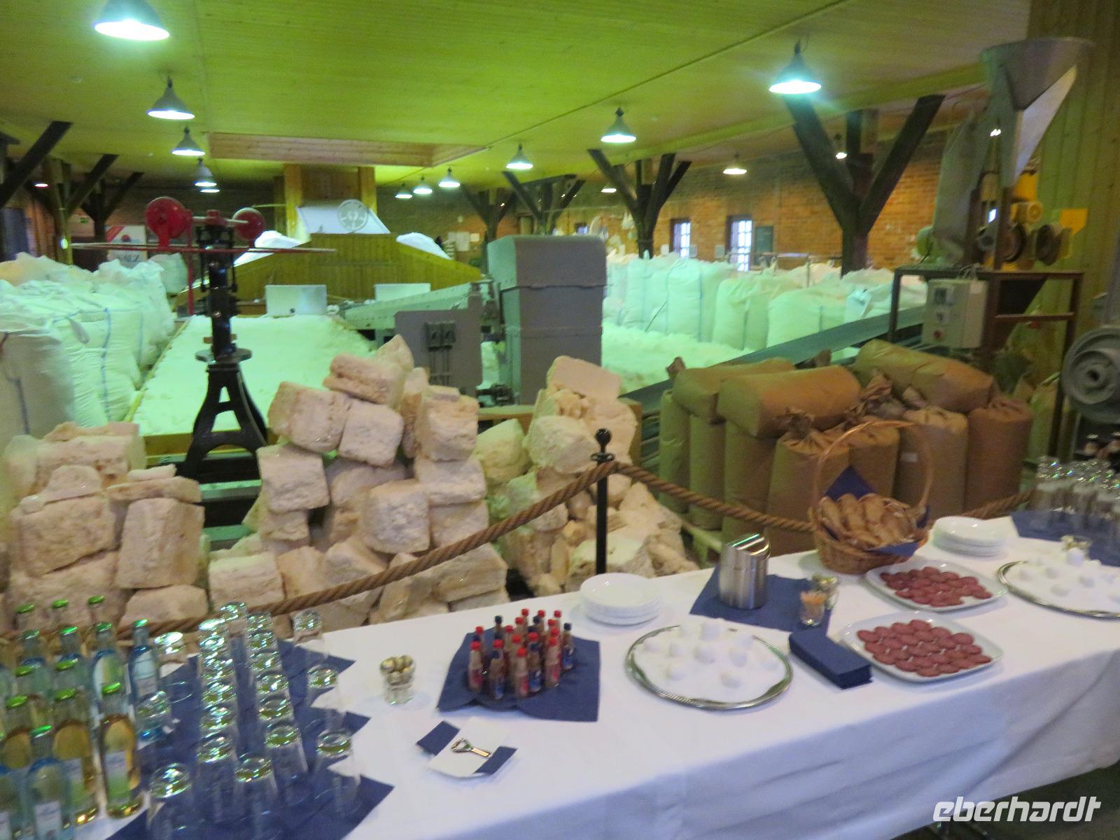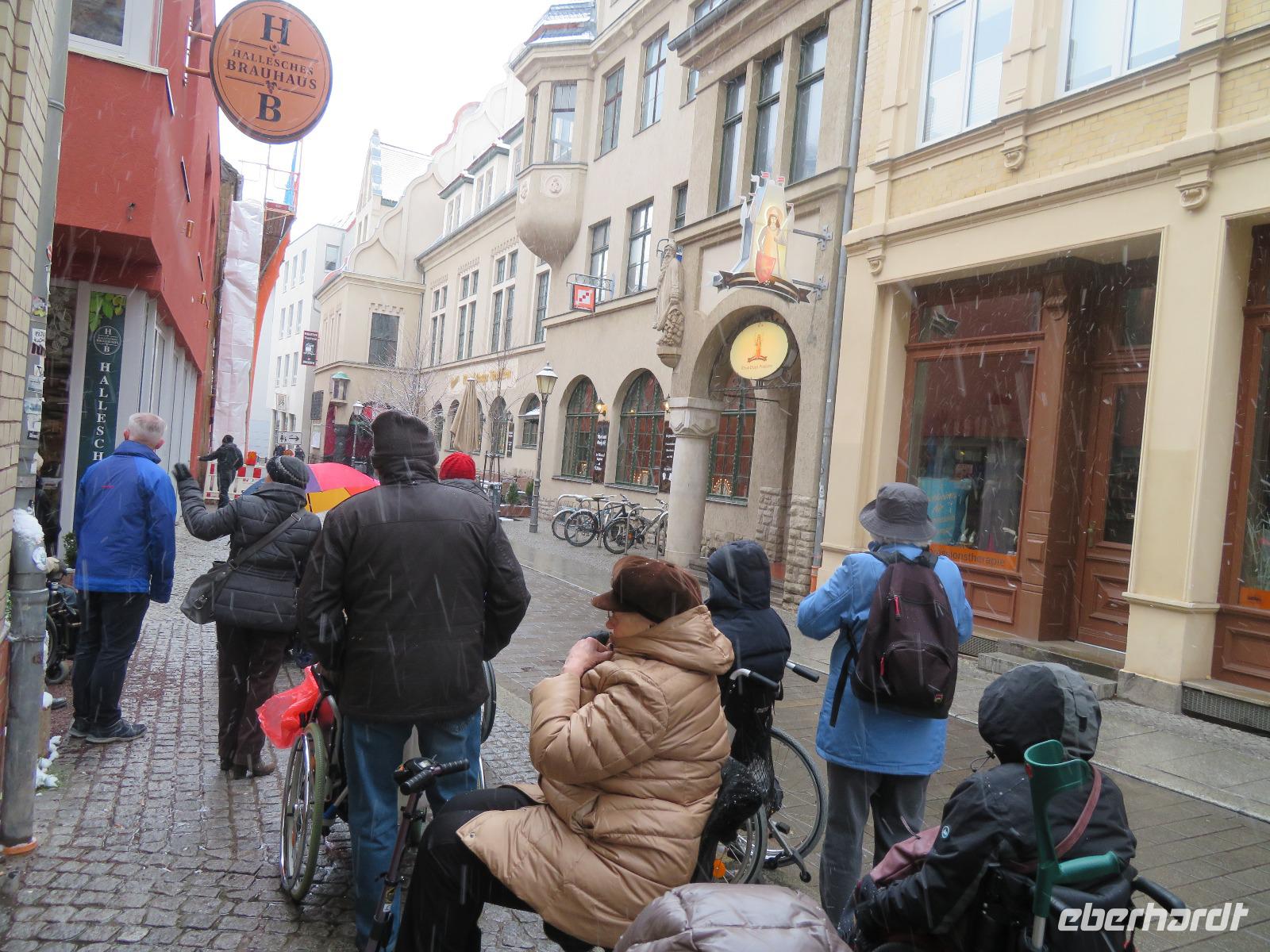 Bevor wir die Heimreise antreten, statten wir der Händelstadt Halle unseren Besuch ab. Leider kommen wir etwas später als geplant an und müssen erst einmal eine geeignete Toilette finden aber dann sind wir fertig für unsere gebuchte Schlemmertour. Diese führt uns vorbei am Weihnachtsmarkt zum Theater in Halle. Im barrierefreien Voraum sind Stühle und Tische für uns aufgebaut. So trinken wir eine Tasse Kaffee und erhalten dazu Hallorenkugel, die so typisch für Halle sind. Die Dame, die uns hier beköstigt, ist die Tochter des Schauspielers Peter Sodann und erzählt uns von ihrer Kindheit im Theater, von der Arbeit hier sowohl auch das ein oder andere aus dem Berufsleben Ihres Vaters. Unser nächstes Ziel ist das Brauhaus, wo wir ein typisch gebrautes Bier und ein kleines Stück Flammkuchen serviert bekommen. Wir spazieren weiter, vorbei am Händelmuseum und enden schließlich in der Saline. Bei einer kleinen Führung erhalten wir einen Einblick in die Salzgewinnung. Schlussendlich ist noch ein kleiner Imbiss mit Wurst, Brot, Salz und diversen Getränken aufgebaut. So zum Abschluss keine schlechte Sache.