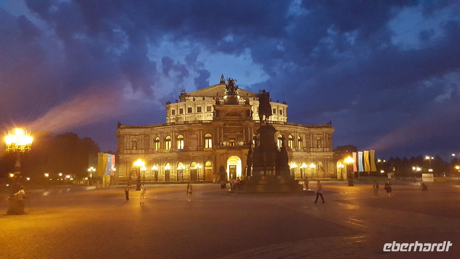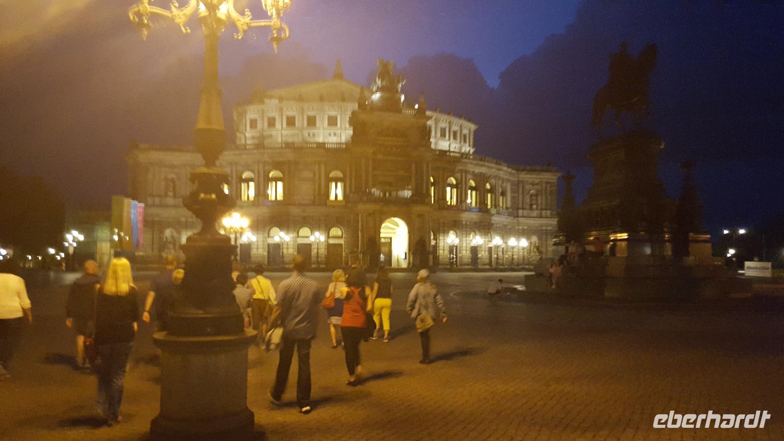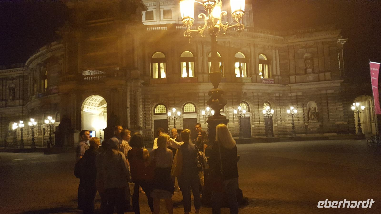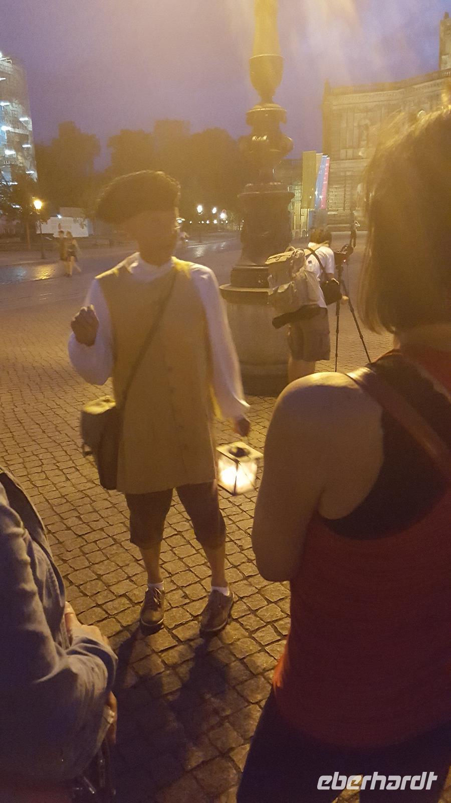 Nach der Kaffeepause in diesem Kleinod über der Elbe fahren wir mit dem Bus zurück in die Innenstadt, diesmal auf der Neustädter Seite. Einen kurzen Stopp in Pfunds Molkerei dürfen wir allerdings nicht verpassen! Der angeblich schönste Milchladen der Welt steht sogar im Guiness Buch der Rekorde und natürlich in jedem Dresden-Reiseführer. Wir werfen einen Blick in den wirklich schönen, mit handbemalten Villeroy & Boch Fliesen ausgeschmückten Laden. Dann geht unsere Rundfahrt auch gleich weiter durch die Neustadt, über den Albertplatz und die Königstraße mit ihren herrlichen restaurierten Barock-Bürgerhäusern. Es ist der einzige Straßenzug in Dresden, der noch die ursprüngliche barocke Bürgerhaus-Architektur wie zu Zeiten Augusts des Starken zeigt. Unsere Stadtrundfahrt führt schließlich zurück in die Altstadt mit Stopp am Albertinum und am Altmarkt zurück zum Zwinger, wo wir gegen 17 Uhr ankommen. Es bleibt ein bisschen Zeit, zum Hotel zurück zu gehen und sich etwas frisch zu machen, bevor Kristin uns zum Abendessen in der Dresdner Altstadt abholt. Heute werden wir zu unserem zweiten Spezialitäten-Abendessen eingeladen - im Restaurant und Steakhaus El Rodizio. Aufgrund des herrlichen Sommerabends können wir draußen sitzen und einen typischen südamerikanischen Rodizio-Grillabend genießen. Salat und verschiedene Dipsaucen werden auf unseren Tisch gestellt und die Kellner-Gauchos kommen alle paar Minuten mit gebackenem Gemüse oder einem großen Grillspieß verschiedenster Fleischsorten an den Tisch. Jeder kann nun entscheiden, ob und wie viel er von den Grillspezialitäten auf seinen Teller haben möchte. Wir schlemmen wieder über zwei Stunden lang bei lauer Sommerbrise, netten Gesprächen und kühlen Getränken. Wir könnten noch ewig hier sitzen ... wenn uns nicht noch ein kleiner Rundgang mit dem Nachtwächter erwarten würde. Gegen 22 Uhr spazieren wir daher gemütlich vom Restaurant hinüber zum Theaterplatz, wo uns die Nachtwächter erwarten. Auf unterhaltsame Weise erzählt uns der Nachtwächter noch einige Geschichten aus dem Leben der sächsischen Kurfürsten, zur Semperoper und zum Dresdner Residenzschloss. Auch ein kurzes Sommergewitter mit Regenguss macht uns unter dem Torbogen des Georgenbaus nichts aus. Die Führung und der Regen enden schließlich und wir spazieren zurück zum Hotel. Ein erlebnisreicher Reisetag geht zu Ende und wir fallen müde in die Betten.