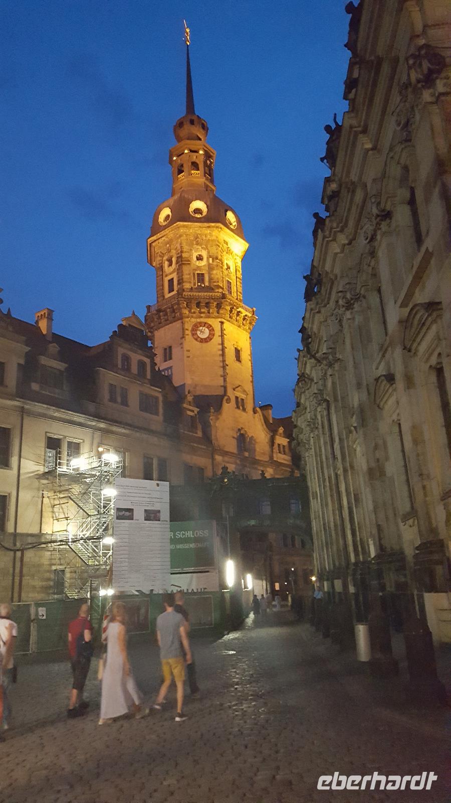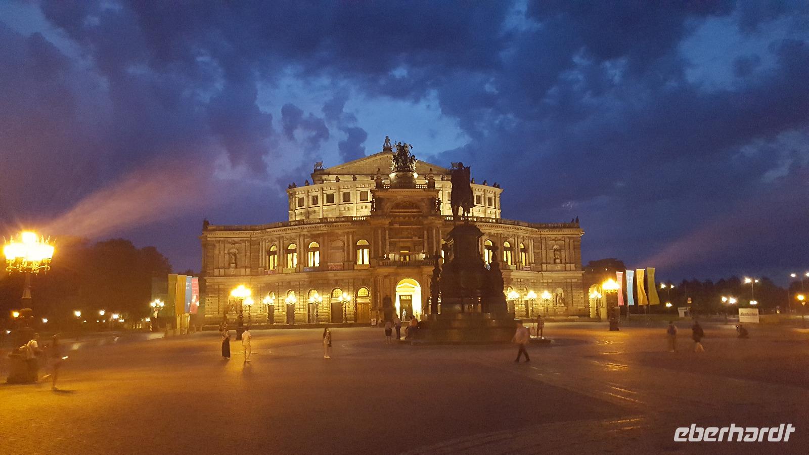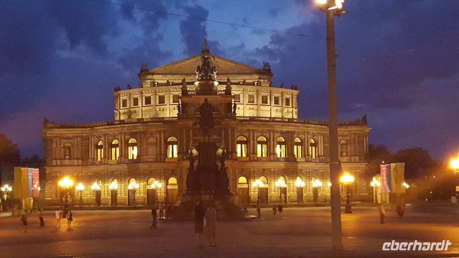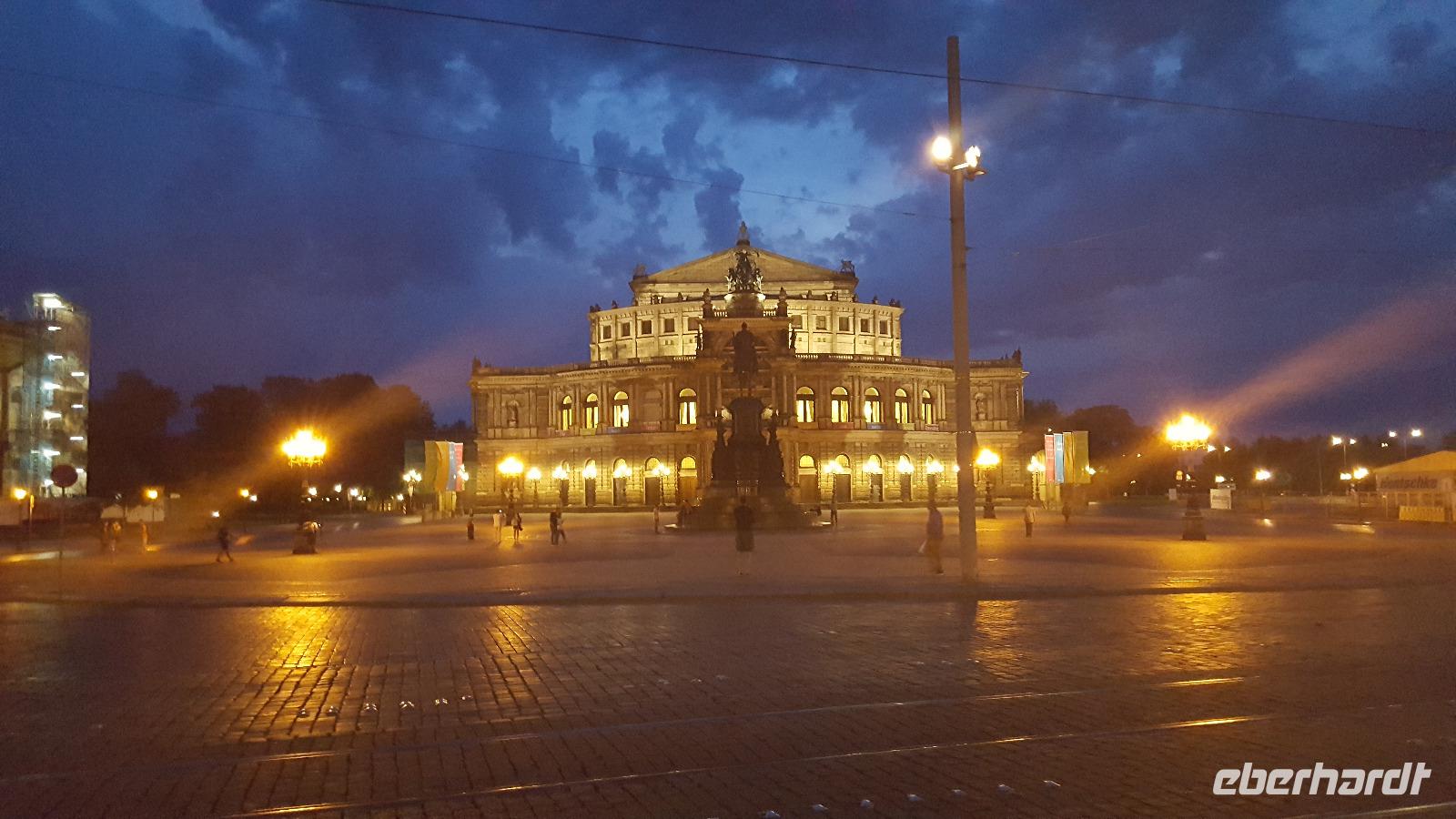 Nach der Kaffeepause in diesem Kleinod über der Elbe fahren wir mit dem Bus zurück in die Innenstadt, diesmal auf der Neustädter Seite. Einen kurzen Stopp in Pfunds Molkerei dürfen wir allerdings nicht verpassen! Der angeblich schönste Milchladen der Welt steht sogar im Guiness Buch der Rekorde und natürlich in jedem Dresden-Reiseführer. Wir werfen einen Blick in den wirklich schönen, mit handbemalten Villeroy & Boch Fliesen ausgeschmückten Laden. Dann geht unsere Rundfahrt auch gleich weiter durch die Neustadt, über den Albertplatz und die Königstraße mit ihren herrlichen restaurierten Barock-Bürgerhäusern. Es ist der einzige Straßenzug in Dresden, der noch die ursprüngliche barocke Bürgerhaus-Architektur wie zu Zeiten Augusts des Starken zeigt. Unsere Stadtrundfahrt führt schließlich zurück in die Altstadt mit Stopp am Albertinum und am Altmarkt zurück zum Zwinger, wo wir gegen 17 Uhr ankommen. Es bleibt ein bisschen Zeit, zum Hotel zurück zu gehen und sich etwas frisch zu machen, bevor Kristin uns zum Abendessen in der Dresdner Altstadt abholt. Heute werden wir zu unserem zweiten Spezialitäten-Abendessen eingeladen - im Restaurant und Steakhaus El Rodizio. Aufgrund des herrlichen Sommerabends können wir draußen sitzen und einen typischen südamerikanischen Rodizio-Grillabend genießen. Salat und verschiedene Dipsaucen werden auf unseren Tisch gestellt und die Kellner-Gauchos kommen alle paar Minuten mit gebackenem Gemüse oder einem großen Grillspieß verschiedenster Fleischsorten an den Tisch. Jeder kann nun entscheiden, ob und wie viel er von den Grillspezialitäten auf seinen Teller haben möchte. Wir schlemmen wieder über zwei Stunden lang bei lauer Sommerbrise, netten Gesprächen und kühlen Getränken. Wir könnten noch ewig hier sitzen ... wenn uns nicht noch ein kleiner Rundgang mit dem Nachtwächter erwarten würde. Gegen 22 Uhr spazieren wir daher gemütlich vom Restaurant hinüber zum Theaterplatz, wo uns die Nachtwächter erwarten. Auf unterhaltsame Weise erzählt uns der Nachtwächter noch einige Geschichten aus dem Leben der sächsischen Kurfürsten, zur Semperoper und zum Dresdner Residenzschloss. Auch ein kurzes Sommergewitter mit Regenguss macht uns unter dem Torbogen des Georgenbaus nichts aus. Die Führung und der Regen enden schließlich und wir spazieren zurück zum Hotel. Ein erlebnisreicher Reisetag geht zu Ende und wir fallen müde in die Betten.