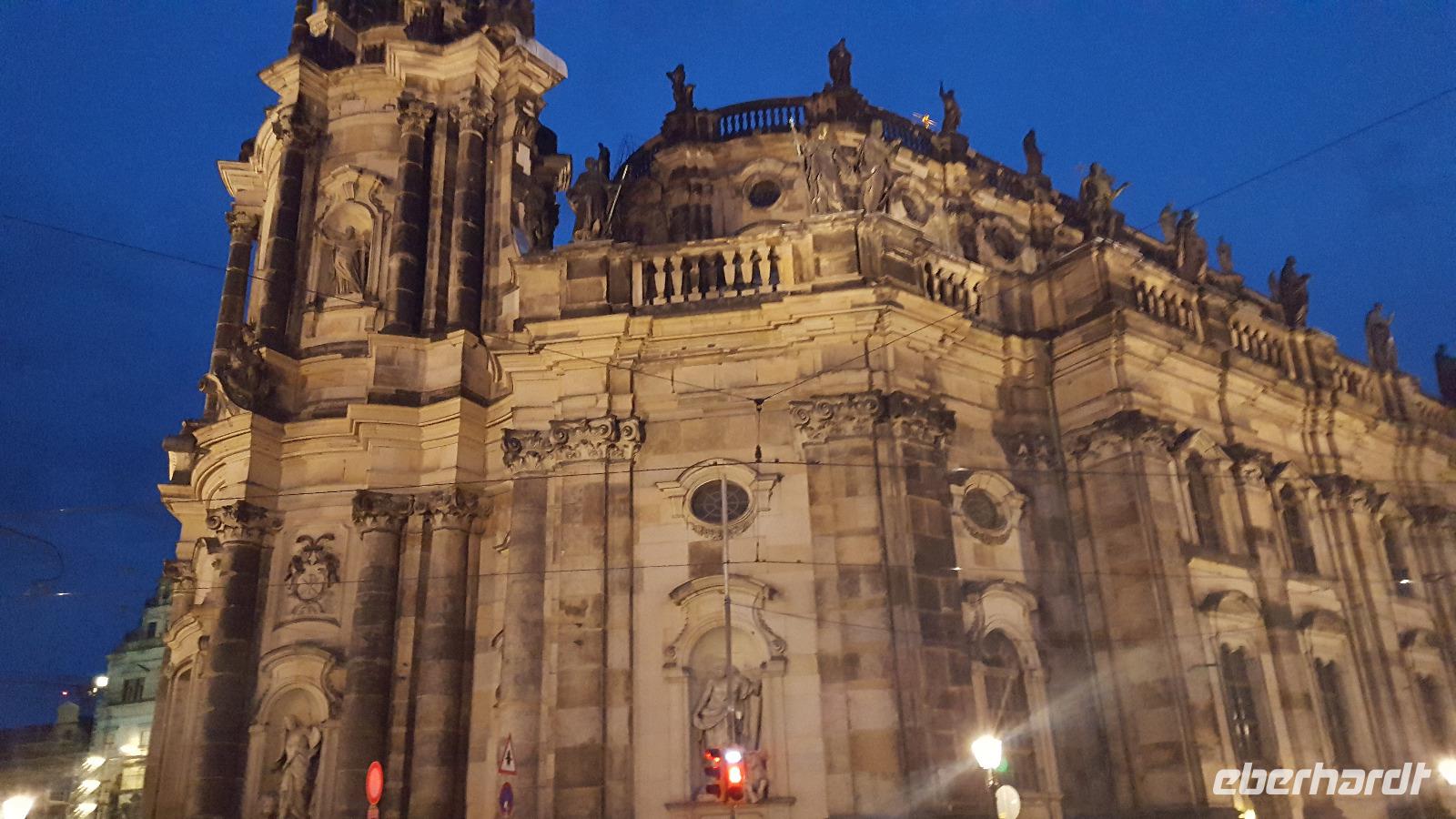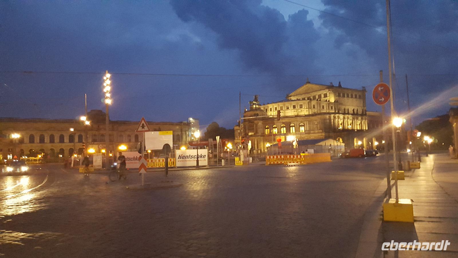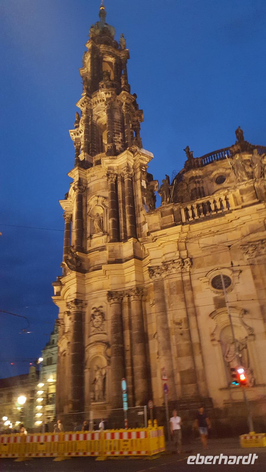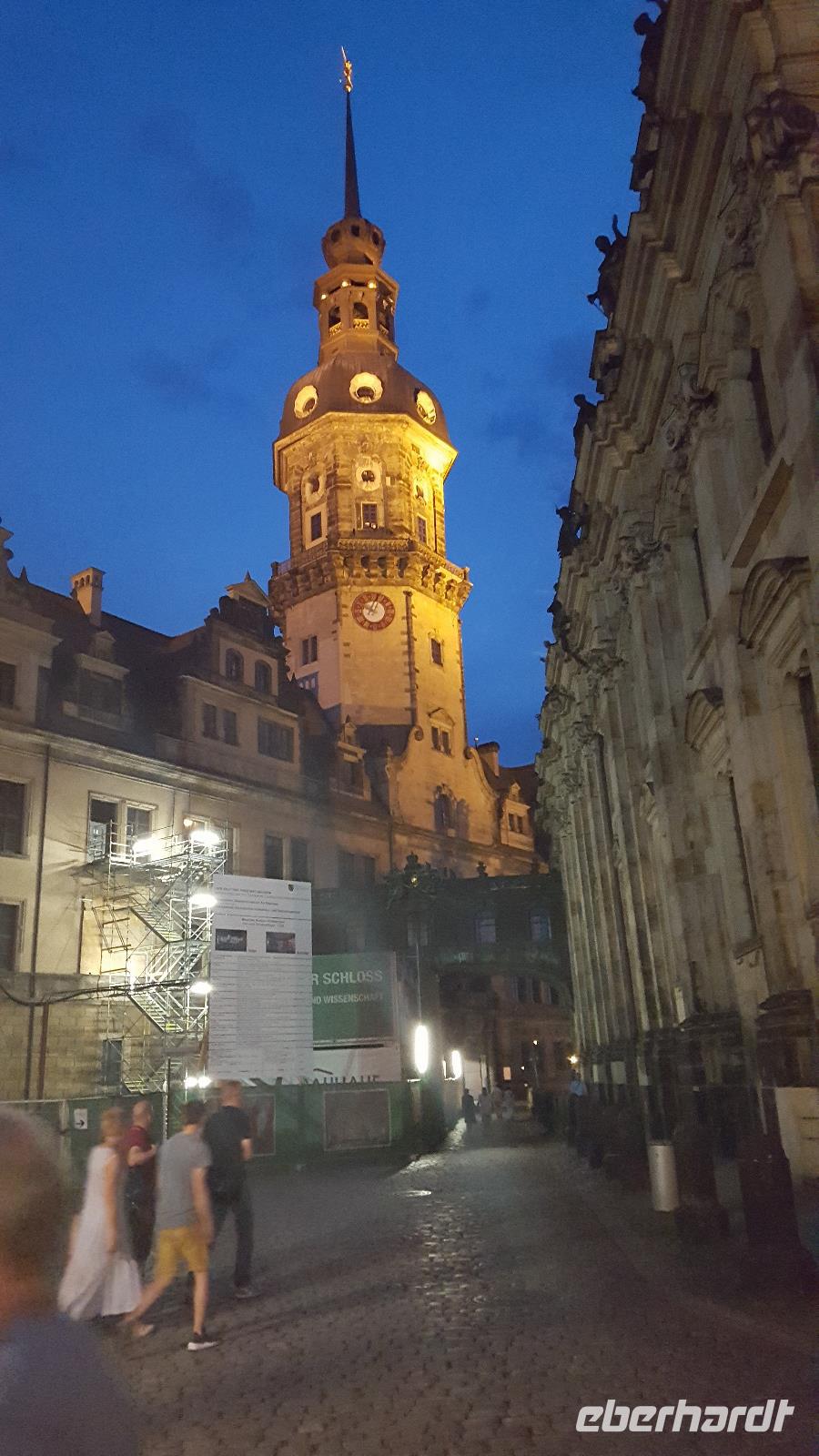 Nach der Kaffeepause in diesem Kleinod über der Elbe fahren wir mit dem Bus zurück in die Innenstadt, diesmal auf der Neustädter Seite. Einen kurzen Stopp in Pfunds Molkerei dürfen wir allerdings nicht verpassen! Der angeblich schönste Milchladen der Welt steht sogar im Guiness Buch der Rekorde und natürlich in jedem Dresden-Reiseführer. Wir werfen einen Blick in den wirklich schönen, mit handbemalten Villeroy & Boch Fliesen ausgeschmückten Laden. Dann geht unsere Rundfahrt auch gleich weiter durch die Neustadt, über den Albertplatz und die Königstraße mit ihren herrlichen restaurierten Barock-Bürgerhäusern. Es ist der einzige Straßenzug in Dresden, der noch die ursprüngliche barocke Bürgerhaus-Architektur wie zu Zeiten Augusts des Starken zeigt. Unsere Stadtrundfahrt führt schließlich zurück in die Altstadt mit Stopp am Albertinum und am Altmarkt zurück zum Zwinger, wo wir gegen 17 Uhr ankommen. Es bleibt ein bisschen Zeit, zum Hotel zurück zu gehen und sich etwas frisch zu machen, bevor Kristin uns zum Abendessen in der Dresdner Altstadt abholt. Heute werden wir zu unserem zweiten Spezialitäten-Abendessen eingeladen - im Restaurant und Steakhaus El Rodizio. Aufgrund des herrlichen Sommerabends können wir draußen sitzen und einen typischen südamerikanischen Rodizio-Grillabend genießen. Salat und verschiedene Dipsaucen werden auf unseren Tisch gestellt und die Kellner-Gauchos kommen alle paar Minuten mit gebackenem Gemüse oder einem großen Grillspieß verschiedenster Fleischsorten an den Tisch. Jeder kann nun entscheiden, ob und wie viel er von den Grillspezialitäten auf seinen Teller haben möchte. Wir schlemmen wieder über zwei Stunden lang bei lauer Sommerbrise, netten Gesprächen und kühlen Getränken. Wir könnten noch ewig hier sitzen ... wenn uns nicht noch ein kleiner Rundgang mit dem Nachtwächter erwarten würde. Gegen 22 Uhr spazieren wir daher gemütlich vom Restaurant hinüber zum Theaterplatz, wo uns die Nachtwächter erwarten. Auf unterhaltsame Weise erzählt uns der Nachtwächter noch einige Geschichten aus dem Leben der sächsischen Kurfürsten, zur Semperoper und zum Dresdner Residenzschloss. Auch ein kurzes Sommergewitter mit Regenguss macht uns unter dem Torbogen des Georgenbaus nichts aus. Die Führung und der Regen enden schließlich und wir spazieren zurück zum Hotel. Ein erlebnisreicher Reisetag geht zu Ende und wir fallen müde in die Betten.