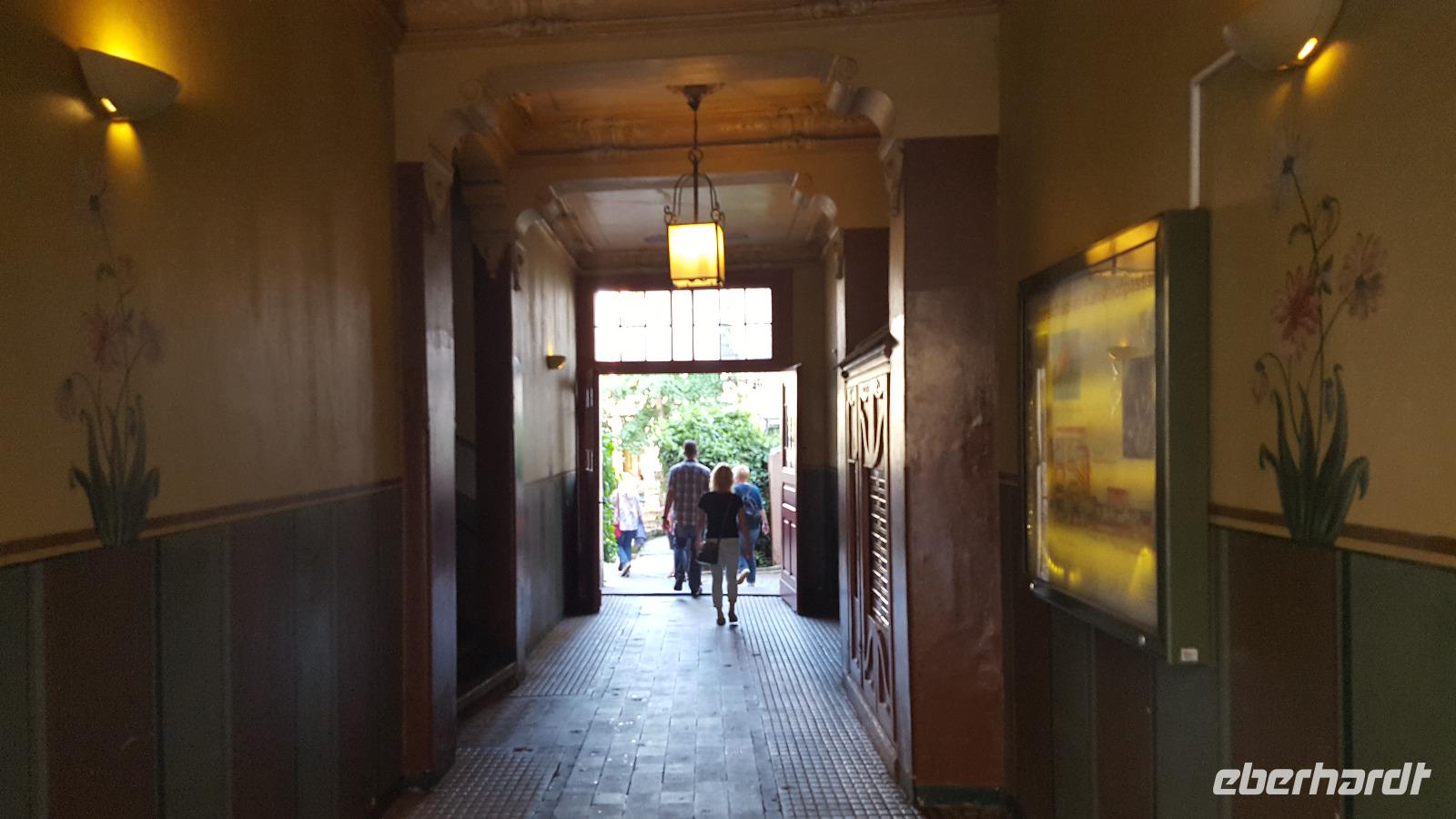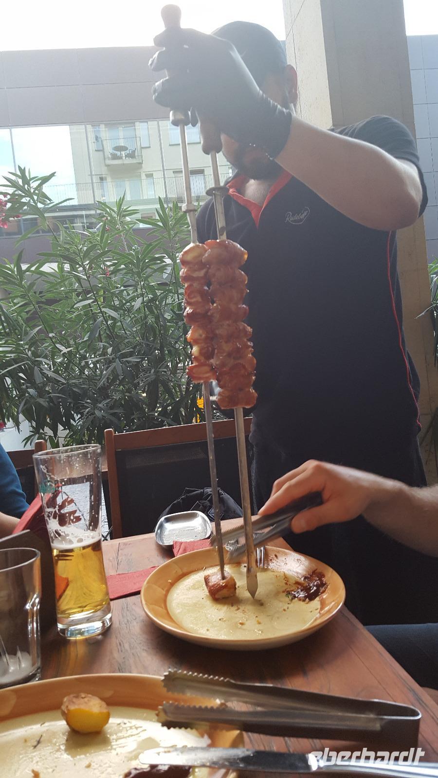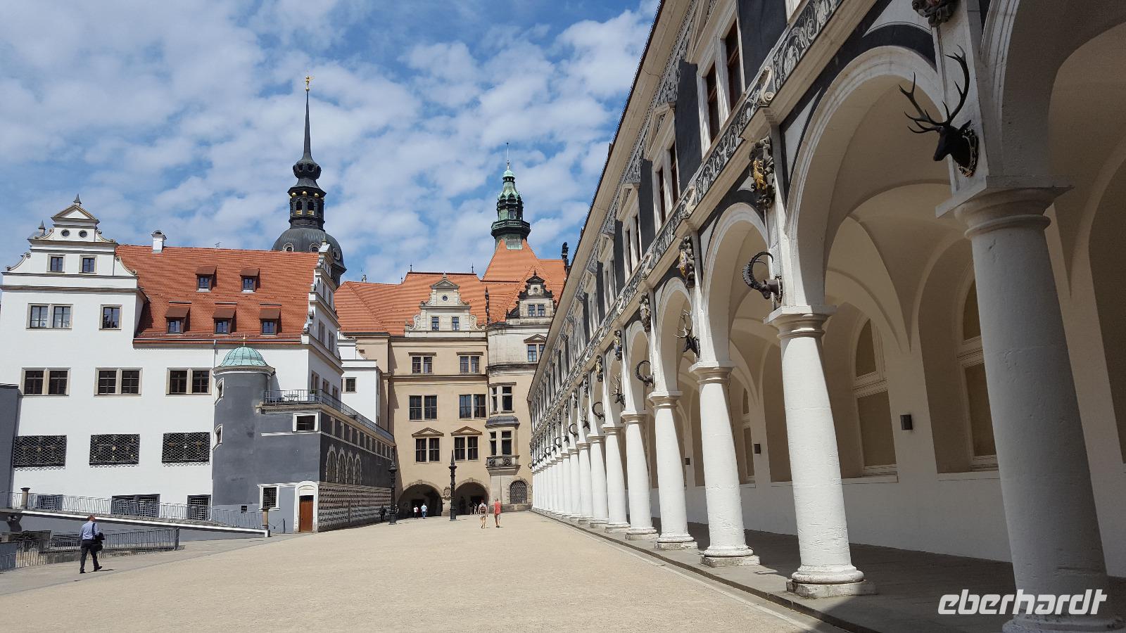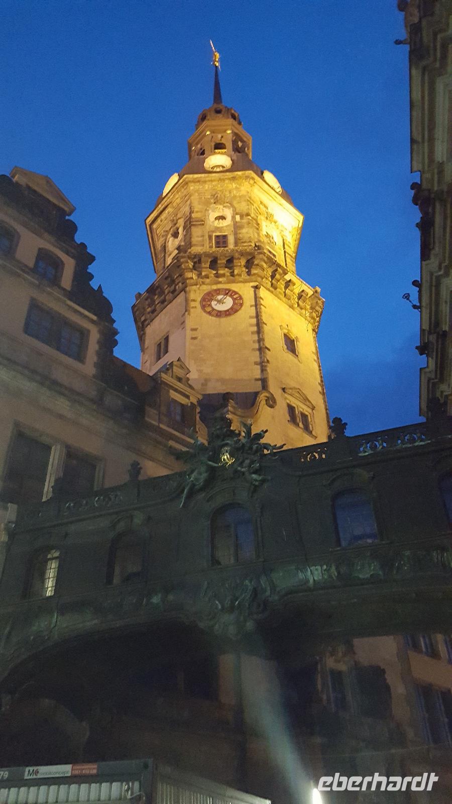 Nach der Kaffeepause in diesem Kleinod über der Elbe fahren wir mit dem Bus zurück in die Innenstadt, diesmal auf der Neustädter Seite. Einen kurzen Stopp in Pfunds Molkerei dürfen wir allerdings nicht verpassen! Der angeblich schönste Milchladen der Welt steht sogar im Guiness Buch der Rekorde und natürlich in jedem Dresden-Reiseführer. Wir werfen einen Blick in den wirklich schönen, mit handbemalten Villeroy & Boch Fliesen ausgeschmückten Laden. Dann geht unsere Rundfahrt auch gleich weiter durch die Neustadt, über den Albertplatz und die Königstraße mit ihren herrlichen restaurierten Barock-Bürgerhäusern. Es ist der einzige Straßenzug in Dresden, der noch die ursprüngliche barocke Bürgerhaus-Architektur wie zu Zeiten Augusts des Starken zeigt. Unsere Stadtrundfahrt führt schließlich zurück in die Altstadt mit Stopp am Albertinum und am Altmarkt zurück zum Zwinger, wo wir gegen 17 Uhr ankommen. Es bleibt ein bisschen Zeit, zum Hotel zurück zu gehen und sich etwas frisch zu machen, bevor Kristin uns zum Abendessen in der Dresdner Altstadt abholt. Heute werden wir zu unserem zweiten Spezialitäten-Abendessen eingeladen - im Restaurant und Steakhaus El Rodizio. Aufgrund des herrlichen Sommerabends können wir draußen sitzen und einen typischen südamerikanischen Rodizio-Grillabend genießen. Salat und verschiedene Dipsaucen werden auf unseren Tisch gestellt und die Kellner-Gauchos kommen alle paar Minuten mit gebackenem Gemüse oder einem großen Grillspieß verschiedenster Fleischsorten an den Tisch. Jeder kann nun entscheiden, ob und wie viel er von den Grillspezialitäten auf seinen Teller haben möchte. Wir schlemmen wieder über zwei Stunden lang bei lauer Sommerbrise, netten Gesprächen und kühlen Getränken. Wir könnten noch ewig hier sitzen ... wenn uns nicht noch ein kleiner Rundgang mit dem Nachtwächter erwarten würde. Gegen 22 Uhr spazieren wir daher gemütlich vom Restaurant hinüber zum Theaterplatz, wo uns die Nachtwächter erwarten. Auf unterhaltsame Weise erzählt uns der Nachtwächter noch einige Geschichten aus dem Leben der sächsischen Kurfürsten, zur Semperoper und zum Dresdner Residenzschloss. Auch ein kurzes Sommergewitter mit Regenguss macht uns unter dem Torbogen des Georgenbaus nichts aus. Die Führung und der Regen enden schließlich und wir spazieren zurück zum Hotel. Ein erlebnisreicher Reisetag geht zu Ende und wir fallen müde in die Betten.