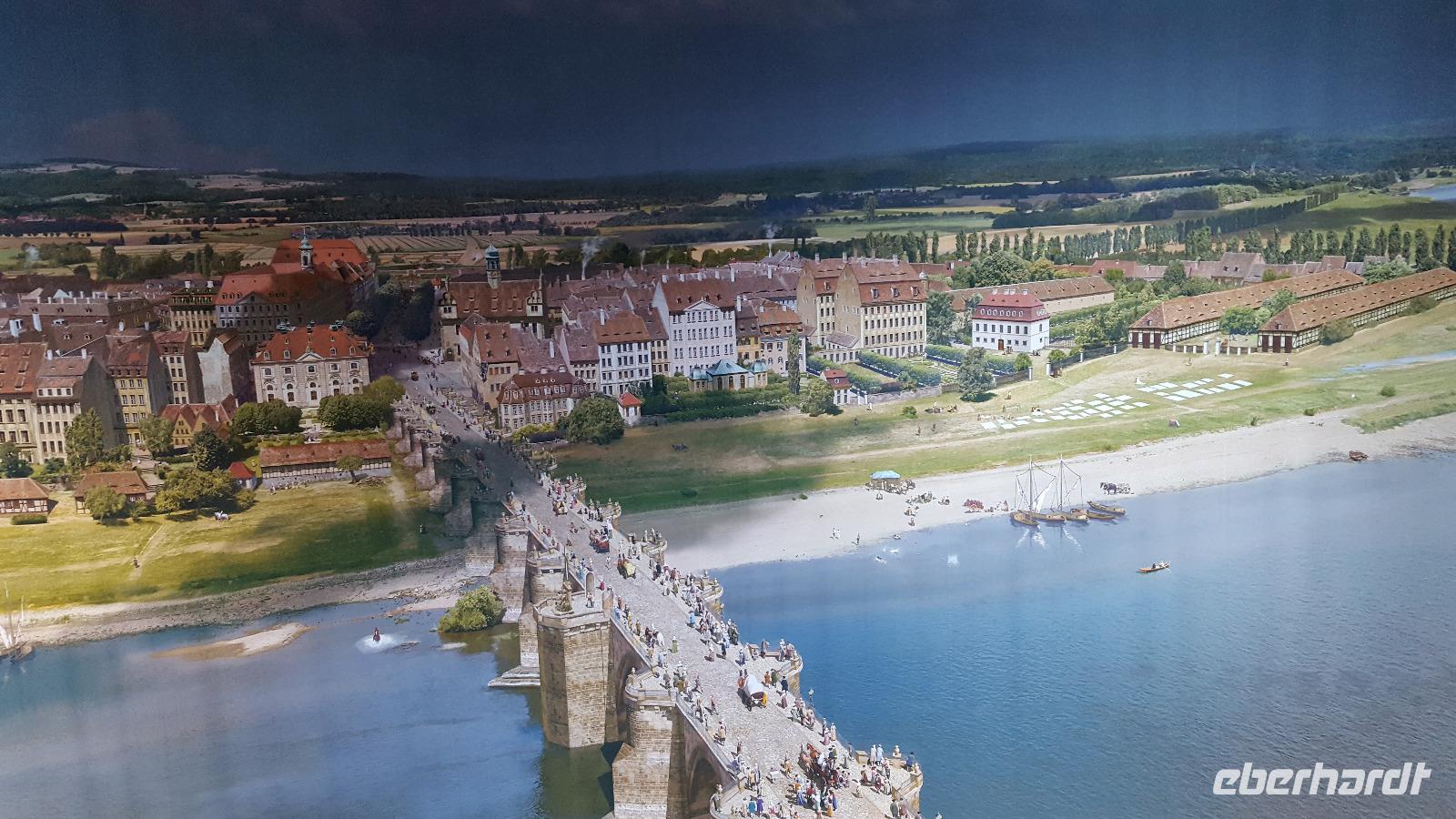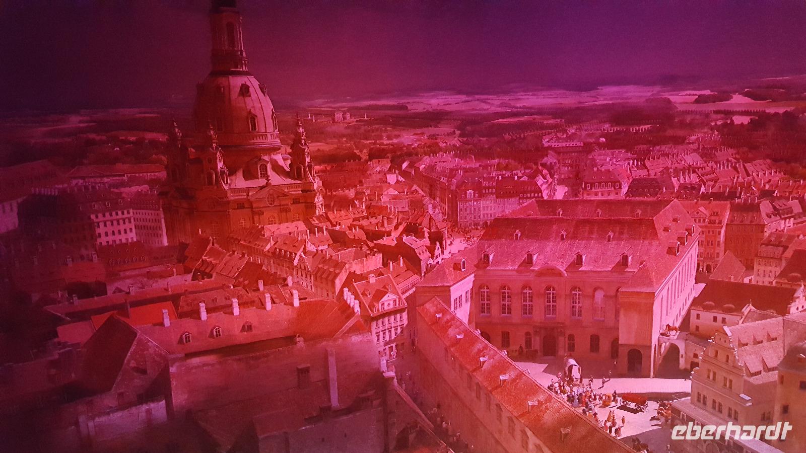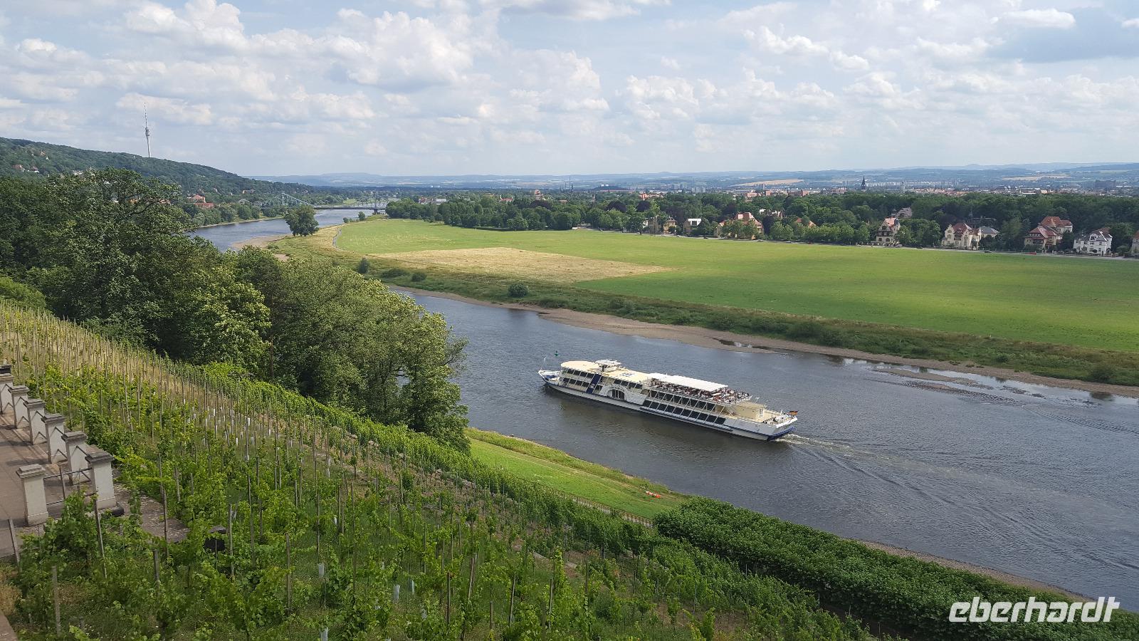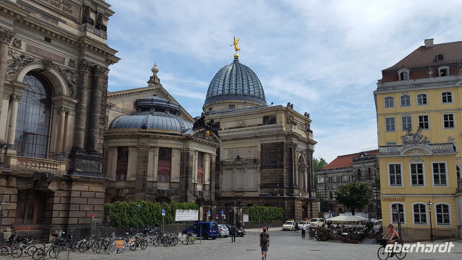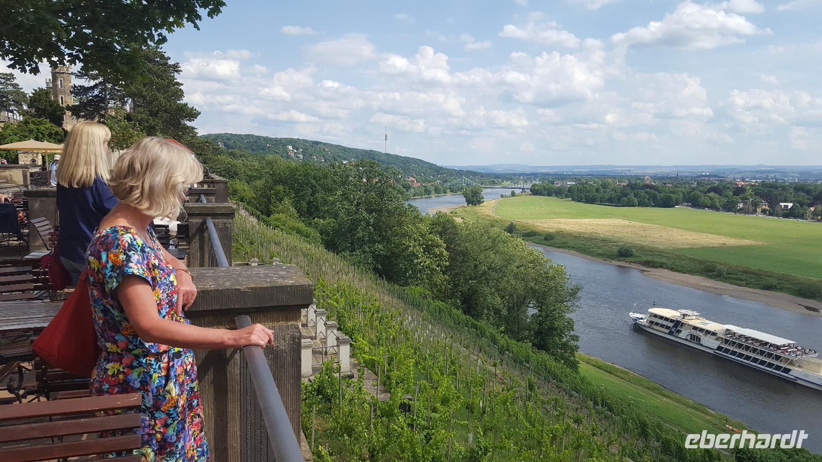 Der Samstag steht für eigene Erkundungen, zum Shoppen, zum Besuch der zahlreichen Museen und Kunstsammlungen in Dresden zur Verfügung - oder zur Teilnahme an einem geführten Fahrradausflug ins Dresdner Elbtal. Einige Gäste unserer Gruppe entscheiden sich sogar für den Besuch einer Vorstellung in der Semperoper. Wir haben Glück und bekommen die letzten verfügbaren Karten für Mozarts Zauberflöte! Ein Großteil unserer Reisegruppe hat sich aber für die Radtour entschieden. Gemeinsam mit Eberhardt-Reisebegleiterin Kristin geht es zum Radverleih direkt in der Dresdner Altstadt, wo die Fahrräder und E-Bikes bereits vorbestellt sind. Für jeden wird das Fahrrad individuell eingestellt und wir starten gegen 10 Uhr per Rad in Richtung Süden. Wir radeln aus der Altstadt heraus zu den weitläufigen und schattigen Grünanlagen des Großen Gartens. Wir legen einen Stopp am Carolaschlösschen ein, einem beliebten Ausflugslokal mit schöner Art Deco Einrichtung und gemütlichem Biergarten. Hier sehen wir auch, wie ein Minizug der Dresdner Parkeisenbahn in den kleinen Bahnhof einfährt. Vom Großen Garten geht es weiter zum Panometer Dresden, wo einige eine Pause im Grünen machen und die anderen das beeindruckende Panoramabild Yadegar Asisis bestaunen. Zum Thema "Dresden im Barock" bekommen wir einen realistischen Eindruck vom damaligen Stadtbild und fühlen uns fast in die Zeit Augusts des Starken zurückversetzt! Das sollte man sich nicht entgehen lassen!