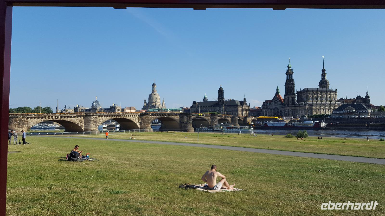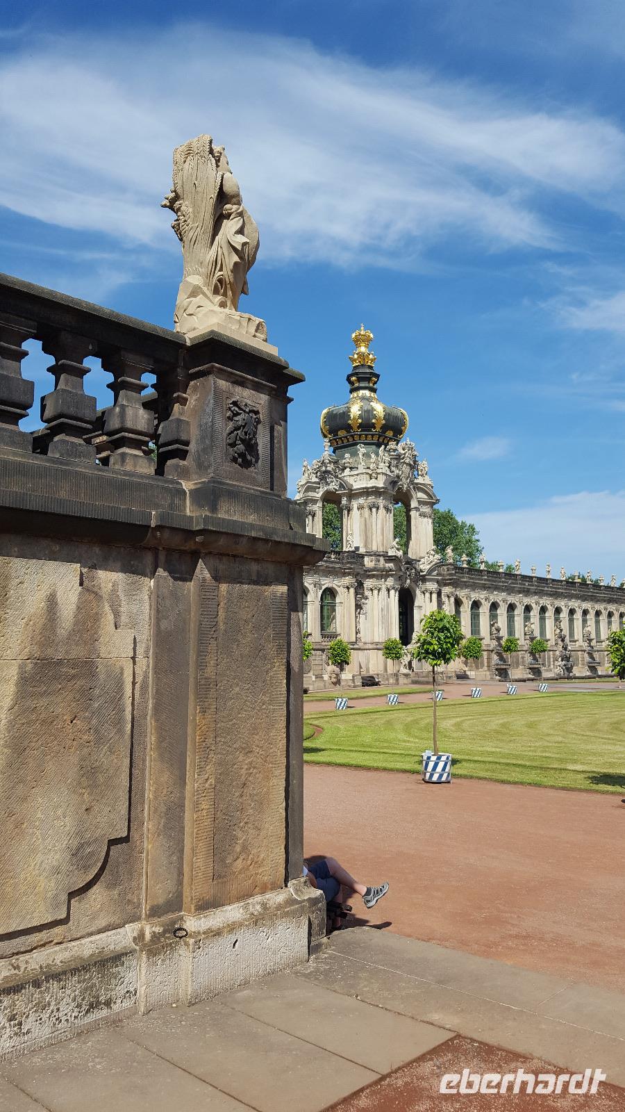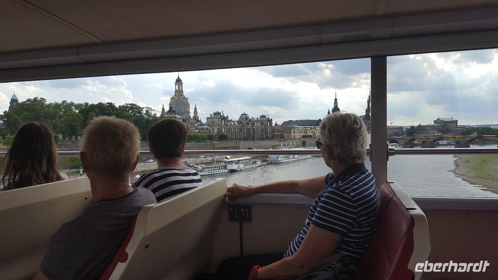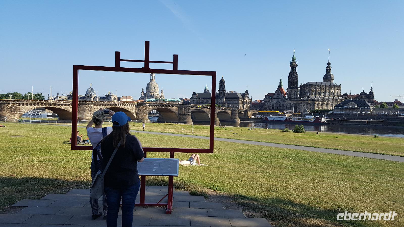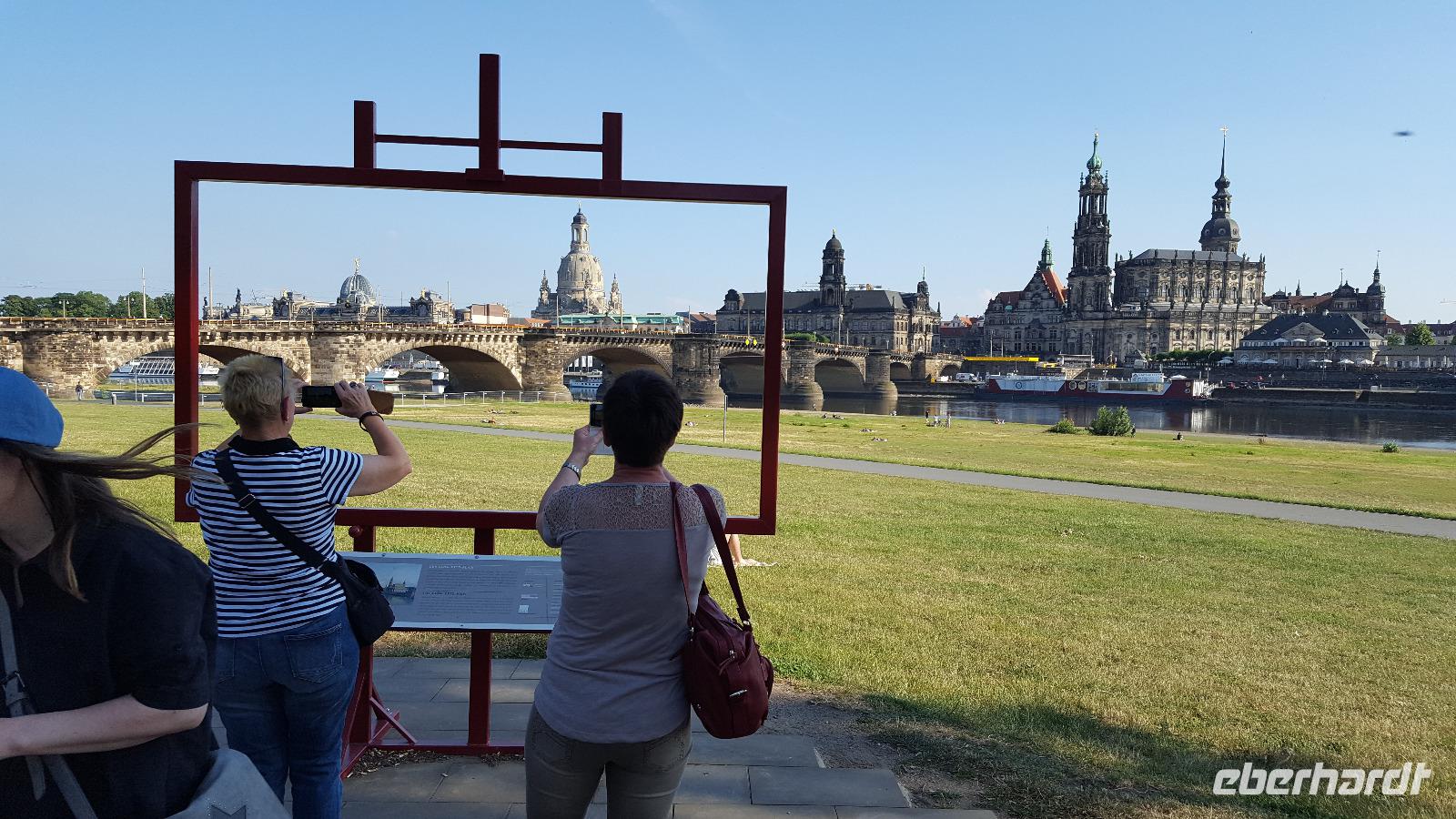 Da wir bei dieser Singlereise abends immer lange gemeinsam aus sind, starten wir die Tagesprogramme erst zwischen 9 Uhr und 9.30 Uhr. Kristin holt uns nach dem Frühstück am Ibis-Hotel ab und wir gehen gemeinsam in Richtung Altstadt, wo wir die anderen Gäste unserer Reisegruppe treffen. Zusammen spazieren wir zum Dresdner Zwinger, wo heute unsere Stadtbesichtigungstour beginnt. Das Wetter könnte schöner nicht sein und wir starten mit einer Führung im bekannten Dresdner Zwinger. Unser örtlicher Fremdenführer Bart führt uns in den Innengarten des Zwingers und erzählt uns allerlei Wissenswertes zur Geschichte dieses barocken Bauwerkes, zu den Festlichkeiten in der Zeit August des Starken und zu Zerstörung und Wiederaufbau nach dem zweiten Weltkrieg. Zwischendurch hören wir auch das Glockenspiel der Meißner Porzellanglöckchen im barock-verzierten Glockentor des Zwingers. Nach diesem Ausflug in die Geschichte besteigen wir den Hop on - hopp off Bus und beginnen unsere Erlebnis-Stadtrundfahrt in Dresden. Zunächst fahren wir vom Zwinger, vorbei an Yenidze, Sächsischem Landtag und Semperoper durch die historische Altstadt mit Taschenbergpalais, Katholischer Hofkirche, Dresdner Schloss und Brühlscher Terrasse. Dann geht es im Bus aus der Innenstadt heraus zum Großen Garten, der größten Parkanlage und grünen Lunge der Stadt. An der Gläsernen VW Manufaktur steigen wir aus (Hop off) und spazieren gemeinsam vorbei am Wochenmarkt und dem Dynamo-Stadion ein Stück durch den Großen Garten bis zum Palais und dem Palaisteich. Im Schatten der Alleen lässt es sich hier gut aushalten und wir genießen die Blicke in die grüne Umgebung mit Blumenbeeten, Springbrunnen, Skulpturen und natürlich der niedlichen Parkeisenbahn, die mit hellem Gebimmel ab und an zu hören und zu sehen ist. An der nächsten Haltestelle steigen wir wieder in den nächsten Bus (Hop on) und fahren ein Stück weiter in Richtung Elbe. Im Bus erfahren wir immer wieder Wissenswertes zu den Sehenswürdigkeiten und Gebäuden, an denen wir vorbei kommen. Vorbei an der Universitätsklinik und mit Blick auf die drei Elbschlösser am anderen Ufer der Elbe erreichen wir den grünen Stadtteil Dresden Blasewitz im Süden der Stadt, der mit sehenswerten Gründerzeit-Villen der wohlhabenden Bevölkerung aufwartet. Hier ist unser nächster Ausstiegspunkt am Schillerplatz. Es ist Mittagszeit und so kehren wir in einen der bekanntesten und ältesten der Dresdner Biergärten ein, den Schillergarten. Unter großen Bäumen und Sonnenschirmen sitzen wir draußen mit direktem Blick auf das berühmte Blaue Wunder - die Loschwitzer Brücke über die Elbe. Hier soll einst auch der deutsche Schriftsteller Friedrich Schiller geweilt haben! Nach der Mittagspause bei gutem Essen und kühlen Getränken spazieren wir gemeinsam über das Blaue Wunder zum Körnerplatz und zur nächsten Haltestelle unserer Stadtrundfahrt. Mit dem Bus geht es weiter aus dem Elbtal durch den Loschwitzer Grund nach oben in den grünen Stadtteil Weißer Hirsch, der direkt an das große Waldgebiet der Dresdner Heide grenzt. Entlang der Bautzner Landstraße geht es stadteinwärts. Unser nächster Ausstiegspunkt sind die Dresdner Elbschlösser, die wir bereits von unten und der anderen Elbseite bewundert haben. Wir spazieren zum mittleren der drei Schlösser, dem Lingner-Schloss. Es wurde um 1850 als Villa Stockhausen erbaut und erhielt im Volksmund den Namen Lingner-Schloss nach seinem zwischenzeitlichen Besitzer. Lingner hatte einst das Odol-Mundwasser erfunden und war so zu Reichtum gekommen, welchen er im Lingner-Schloss und als großzügiger Stifter des Dresdner Hygiene-Museums auch der Stadt zu Gute kommen ließ. Nach seinem Tod vermachte er das Lingner-Schloss der Stadt Dresden, unter der Auflage, dass der Park und das Schloss der Öffentlichkeit zugänglich bleiben und dass eine Gastronomie mit erschwinglichen Preisen eingerichtet werden sollte. Heute zählen die Lingner-Terrassen zu den schönsten Ausflugslokalen und Biergärten Dresdens, denn man genießt einen fantastischen Blick über das Elbtal und die Stadt. Was kann es im Sommer schöneres geben, als bei einem Kaffee oder Bier draußen zu sitzen, den Ausblick zu genießen, die Elbe-Raddampfer unter sich tuten zu hören und mit netten Menschen unterwegs zu sein?