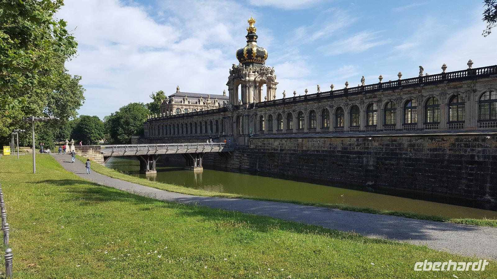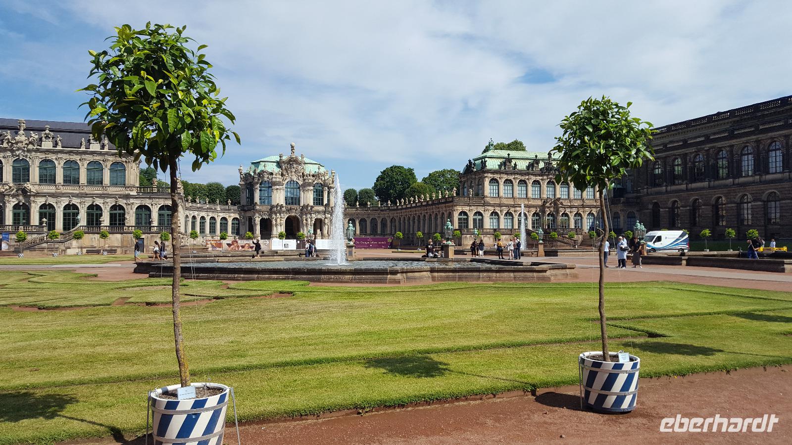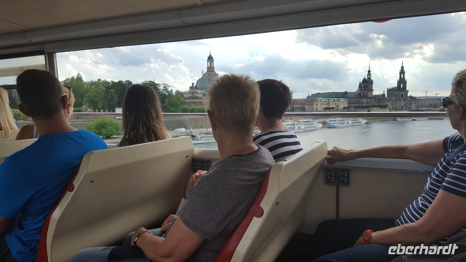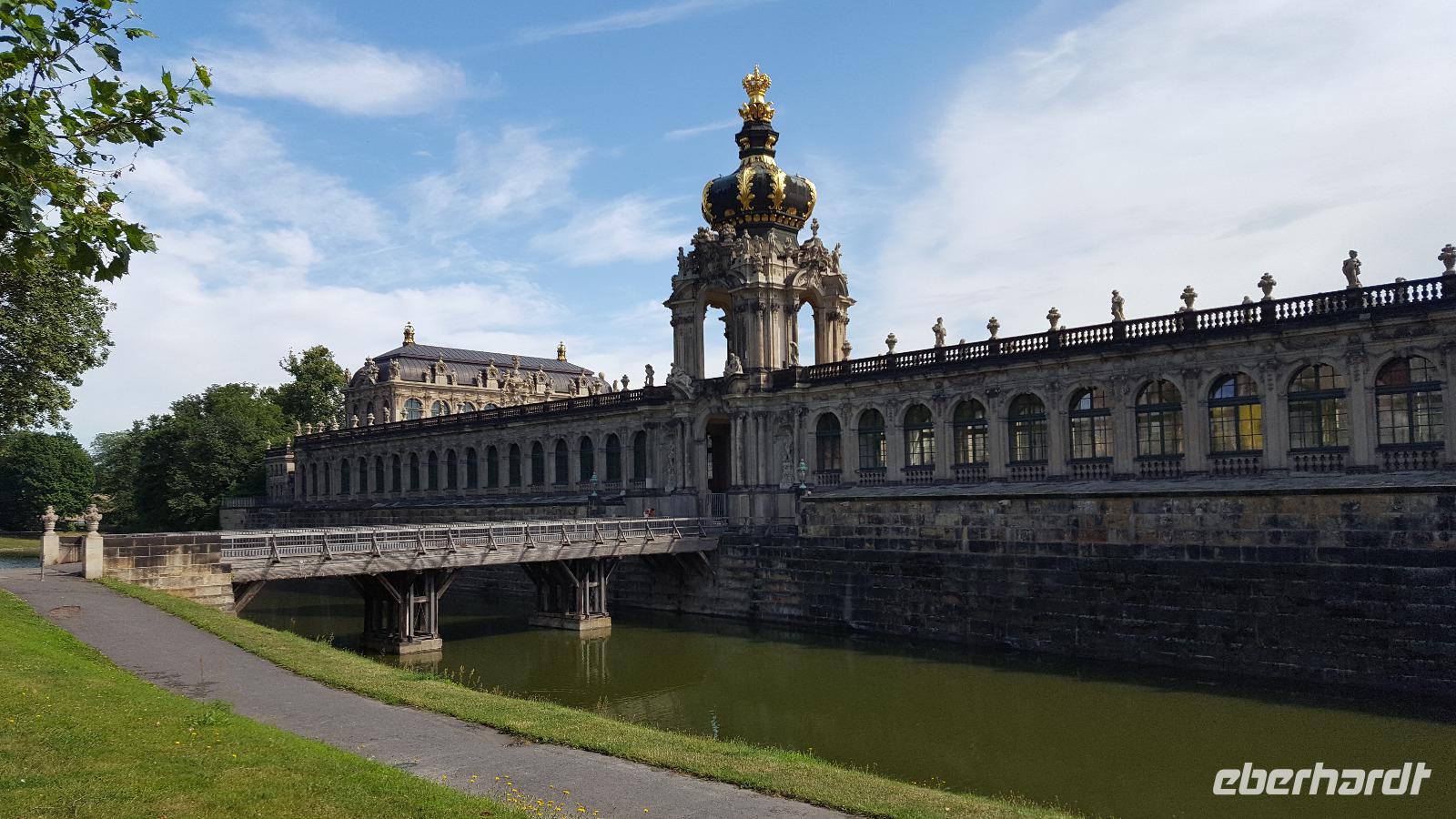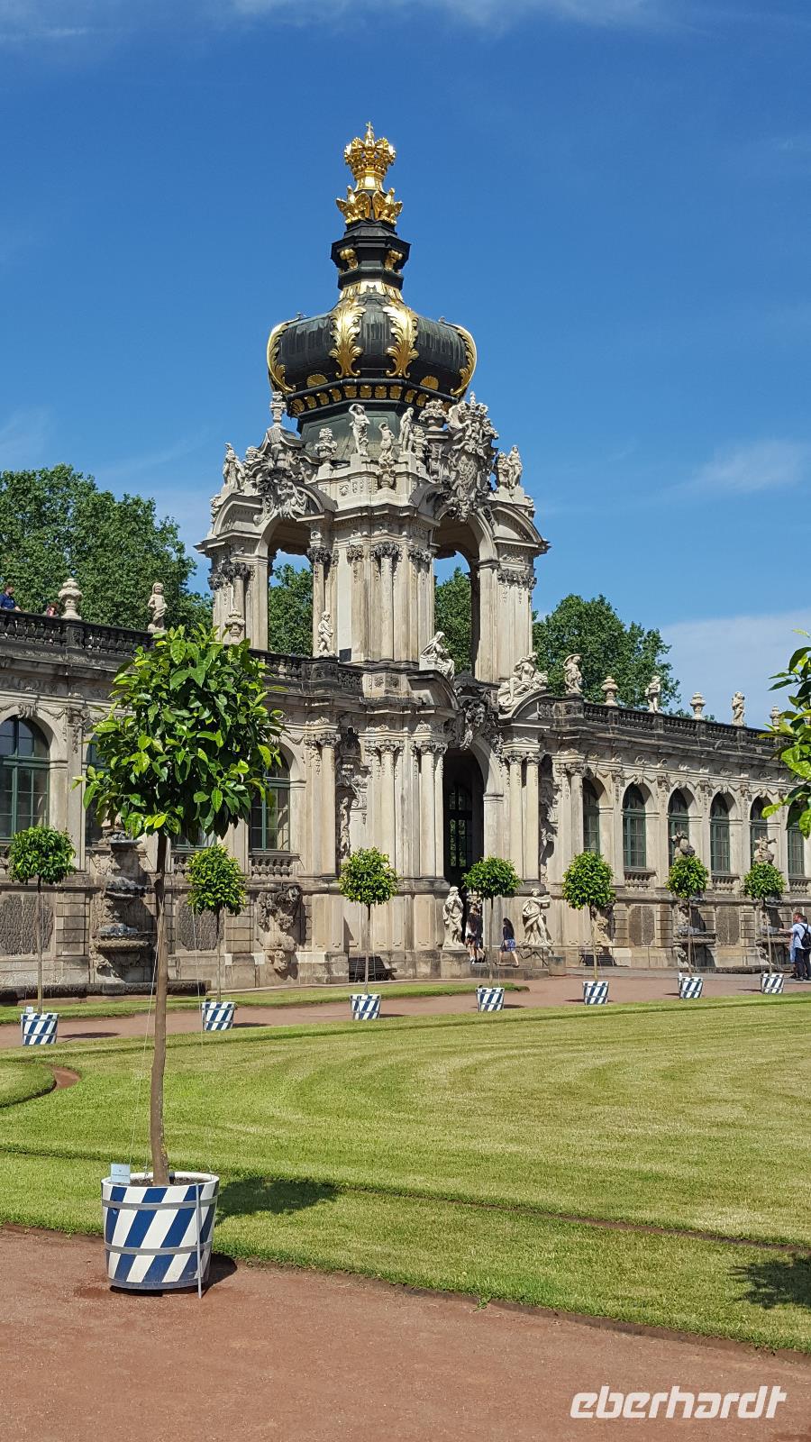 Da wir bei dieser Singlereise abends immer lange gemeinsam aus sind, starten wir die Tagesprogramme erst zwischen 9 Uhr und 9.30 Uhr. Kristin holt uns nach dem Frühstück am Ibis-Hotel ab und wir gehen gemeinsam in Richtung Altstadt, wo wir die anderen Gäste unserer Reisegruppe treffen. Zusammen spazieren wir zum Dresdner Zwinger, wo heute unsere Stadtbesichtigungstour beginnt. Das Wetter könnte schöner nicht sein und wir starten mit einer Führung im bekannten Dresdner Zwinger. Unser örtlicher Fremdenführer Bart führt uns in den Innengarten des Zwingers und erzählt uns allerlei Wissenswertes zur Geschichte dieses barocken Bauwerkes, zu den Festlichkeiten in der Zeit August des Starken und zu Zerstörung und Wiederaufbau nach dem zweiten Weltkrieg. Zwischendurch hören wir auch das Glockenspiel der Meißner Porzellanglöckchen im barock-verzierten Glockentor des Zwingers. Nach diesem Ausflug in die Geschichte besteigen wir den Hop on - hopp off Bus und beginnen unsere Erlebnis-Stadtrundfahrt in Dresden. Zunächst fahren wir vom Zwinger, vorbei an Yenidze, Sächsischem Landtag und Semperoper durch die historische Altstadt mit Taschenbergpalais, Katholischer Hofkirche, Dresdner Schloss und Brühlscher Terrasse. Dann geht es im Bus aus der Innenstadt heraus zum Großen Garten, der größten Parkanlage und grünen Lunge der Stadt. An der Gläsernen VW Manufaktur steigen wir aus (Hop off) und spazieren gemeinsam vorbei am Wochenmarkt und dem Dynamo-Stadion ein Stück durch den Großen Garten bis zum Palais und dem Palaisteich. Im Schatten der Alleen lässt es sich hier gut aushalten und wir genießen die Blicke in die grüne Umgebung mit Blumenbeeten, Springbrunnen, Skulpturen und natürlich der niedlichen Parkeisenbahn, die mit hellem Gebimmel ab und an zu hören und zu sehen ist. An der nächsten Haltestelle steigen wir wieder in den nächsten Bus (Hop on) und fahren ein Stück weiter in Richtung Elbe. Im Bus erfahren wir immer wieder Wissenswertes zu den Sehenswürdigkeiten und Gebäuden, an denen wir vorbei kommen. Vorbei an der Universitätsklinik und mit Blick auf die drei Elbschlösser am anderen Ufer der Elbe erreichen wir den grünen Stadtteil Dresden Blasewitz im Süden der Stadt, der mit sehenswerten Gründerzeit-Villen der wohlhabenden Bevölkerung aufwartet. Hier ist unser nächster Ausstiegspunkt am Schillerplatz. Es ist Mittagszeit und so kehren wir in einen der bekanntesten und ältesten der Dresdner Biergärten ein, den Schillergarten. Unter großen Bäumen und Sonnenschirmen sitzen wir draußen mit direktem Blick auf das berühmte Blaue Wunder - die Loschwitzer Brücke über die Elbe. Hier soll einst auch der deutsche Schriftsteller Friedrich Schiller geweilt haben! Nach der Mittagspause bei gutem Essen und kühlen Getränken spazieren wir gemeinsam über das Blaue Wunder zum Körnerplatz und zur nächsten Haltestelle unserer Stadtrundfahrt. Mit dem Bus geht es weiter aus dem Elbtal durch den Loschwitzer Grund nach oben in den grünen Stadtteil Weißer Hirsch, der direkt an das große Waldgebiet der Dresdner Heide grenzt. Entlang der Bautzner Landstraße geht es stadteinwärts. Unser nächster Ausstiegspunkt sind die Dresdner Elbschlösser, die wir bereits von unten und der anderen Elbseite bewundert haben. Wir spazieren zum mittleren der drei Schlösser, dem Lingner-Schloss. Es wurde um 1850 als Villa Stockhausen erbaut und erhielt im Volksmund den Namen Lingner-Schloss nach seinem zwischenzeitlichen Besitzer. Lingner hatte einst das Odol-Mundwasser erfunden und war so zu Reichtum gekommen, welchen er im Lingner-Schloss und als großzügiger Stifter des Dresdner Hygiene-Museums auch der Stadt zu Gute kommen ließ. Nach seinem Tod vermachte er das Lingner-Schloss der Stadt Dresden, unter der Auflage, dass der Park und das Schloss der Öffentlichkeit zugänglich bleiben und dass eine Gastronomie mit erschwinglichen Preisen eingerichtet werden sollte. Heute zählen die Lingner-Terrassen zu den schönsten Ausflugslokalen und Biergärten Dresdens, denn man genießt einen fantastischen Blick über das Elbtal und die Stadt. Was kann es im Sommer schöneres geben, als bei einem Kaffee oder Bier draußen zu sitzen, den Ausblick zu genießen, die Elbe-Raddampfer unter sich tuten zu hören und mit netten Menschen unterwegs zu sein?