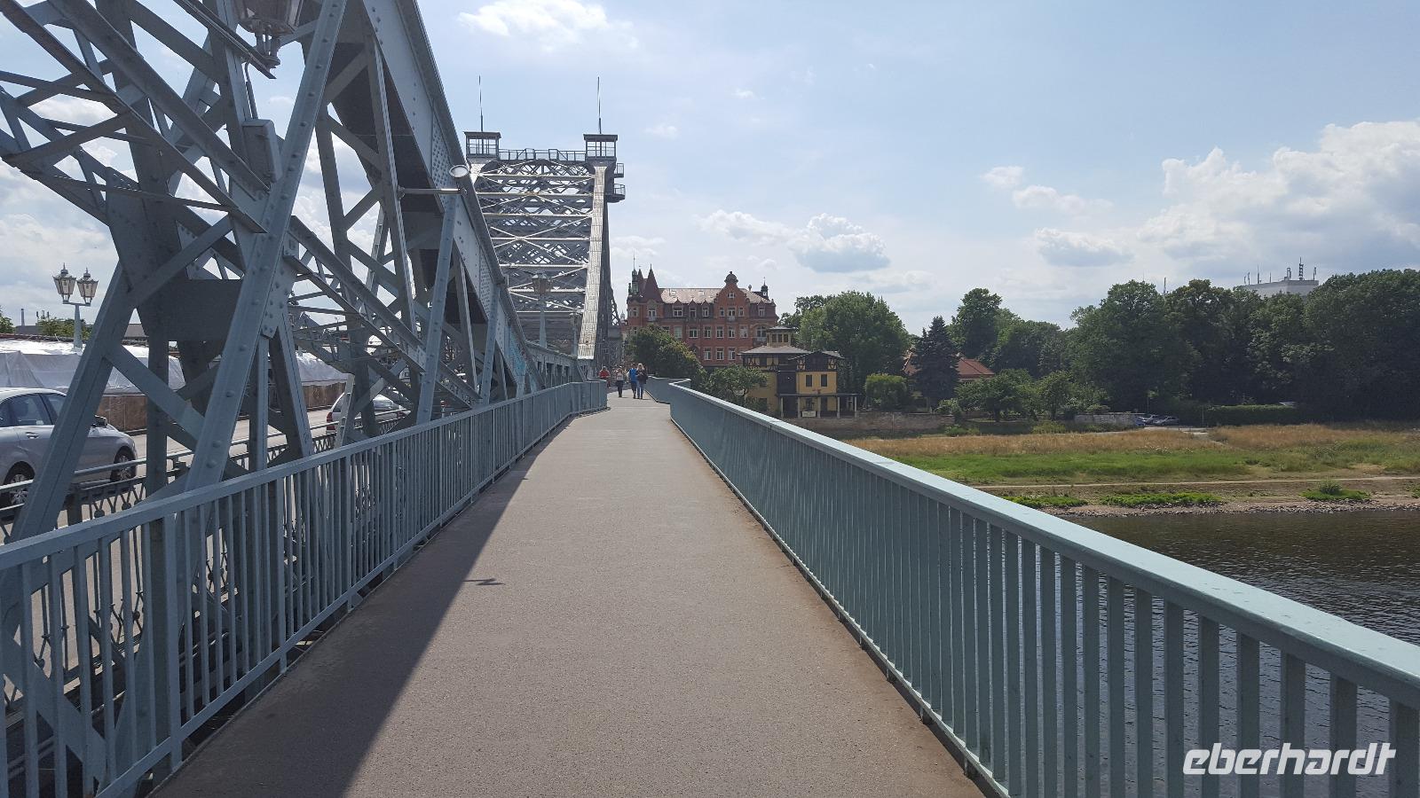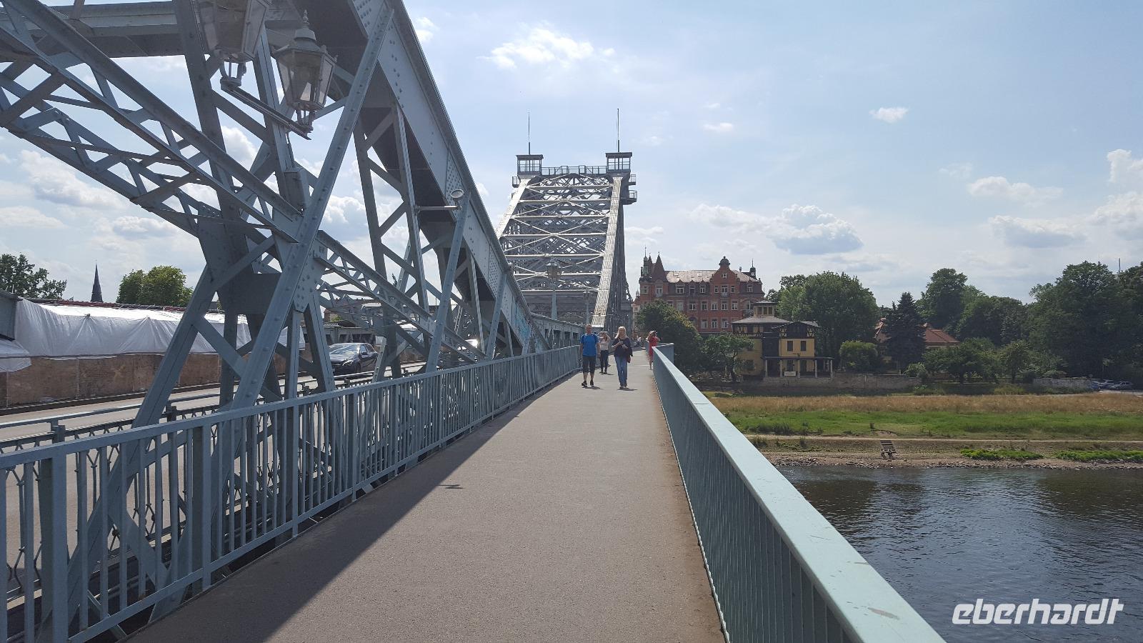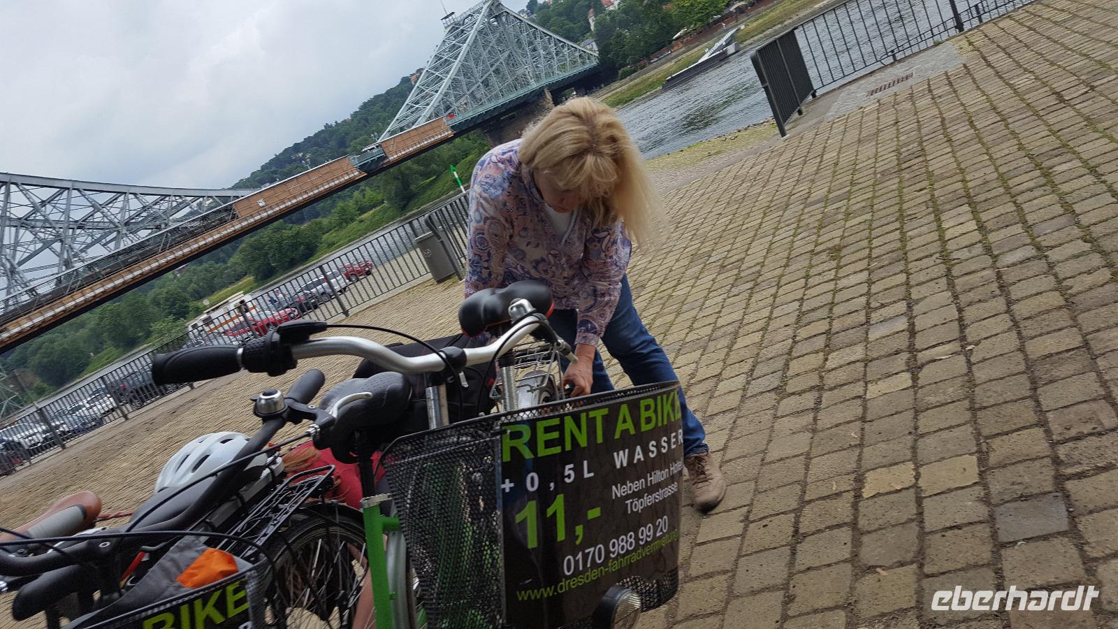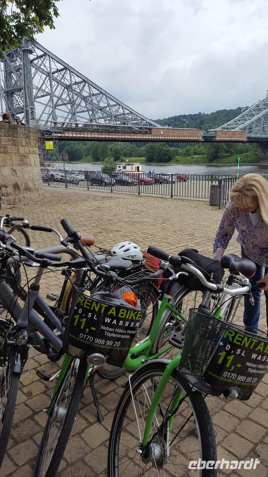 Nach dem Besichtigungsstopp geht unsere Radtour weiter durch den Stadtteil Dresden Tolkewitz in Richtung Elbe. Hier erreichen wir den Elbe-Radweg am linken Elbufer und radeln bis zum Biergarten im Schillergarten direkt am Blauen Wunder. Nach einer Erfrischungspause geht es heute per Rad über die Loschwitzer Elbbrücke, das Blaue Wunder. Rechtselbisch führt uns die Radtour vorbei am Körnergarten, am Schillerhäuschen, den Elbschlössern und am ehemaligen Wasserwerk Saloppe auf dem Elbe-Radweg zum Waldschlösschen. Hier legen wir noch eine Mittagspause im Biergarten über der Elbe ein, bevor wir über die Carolabrücke zurück in die Innenstadt radeln.