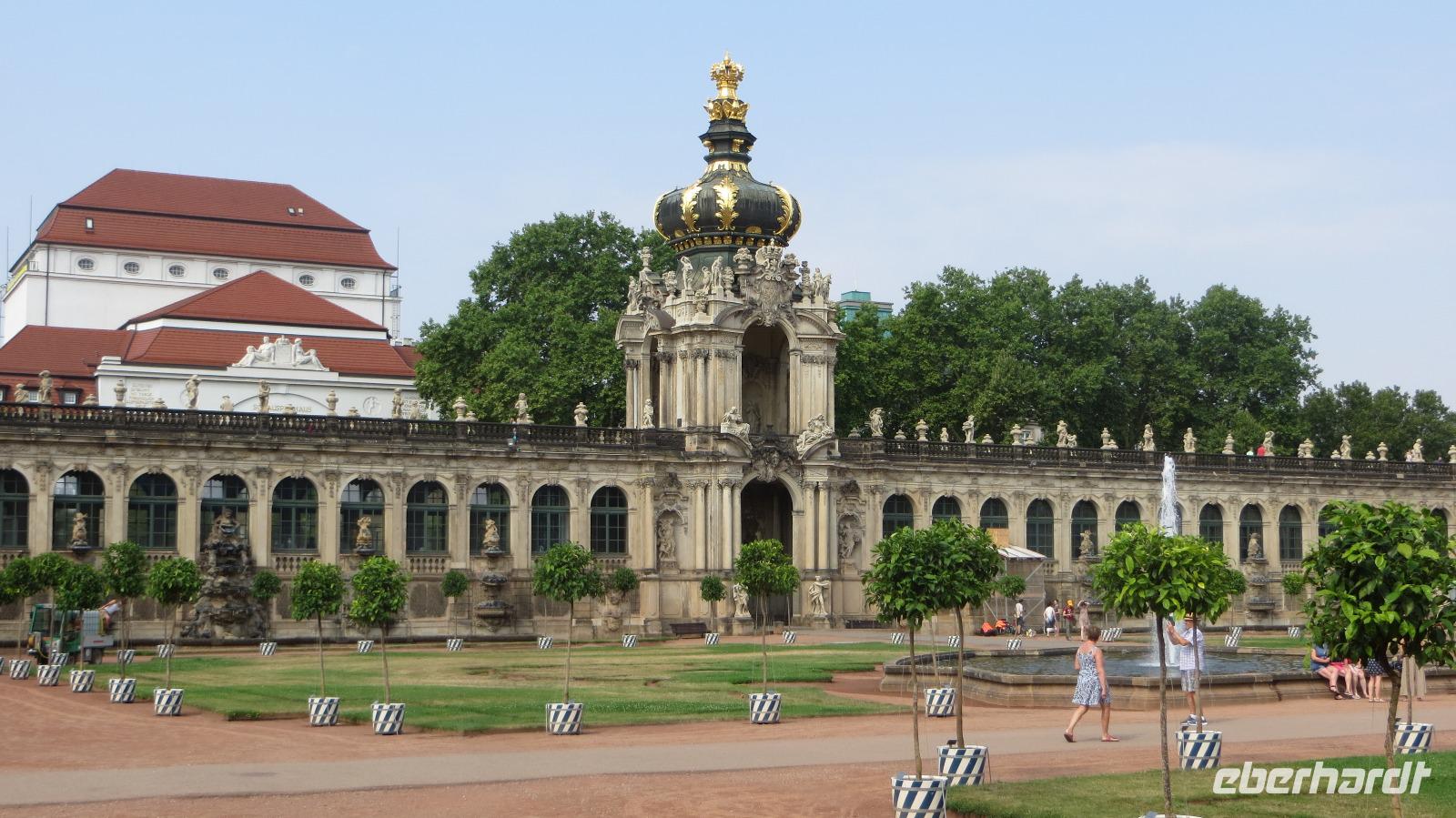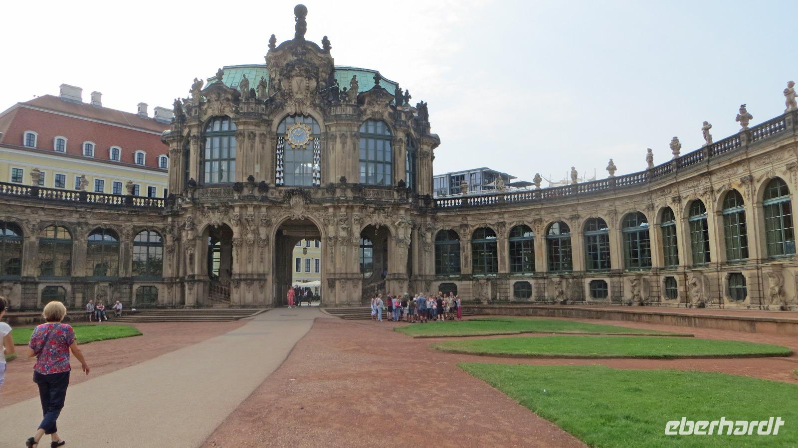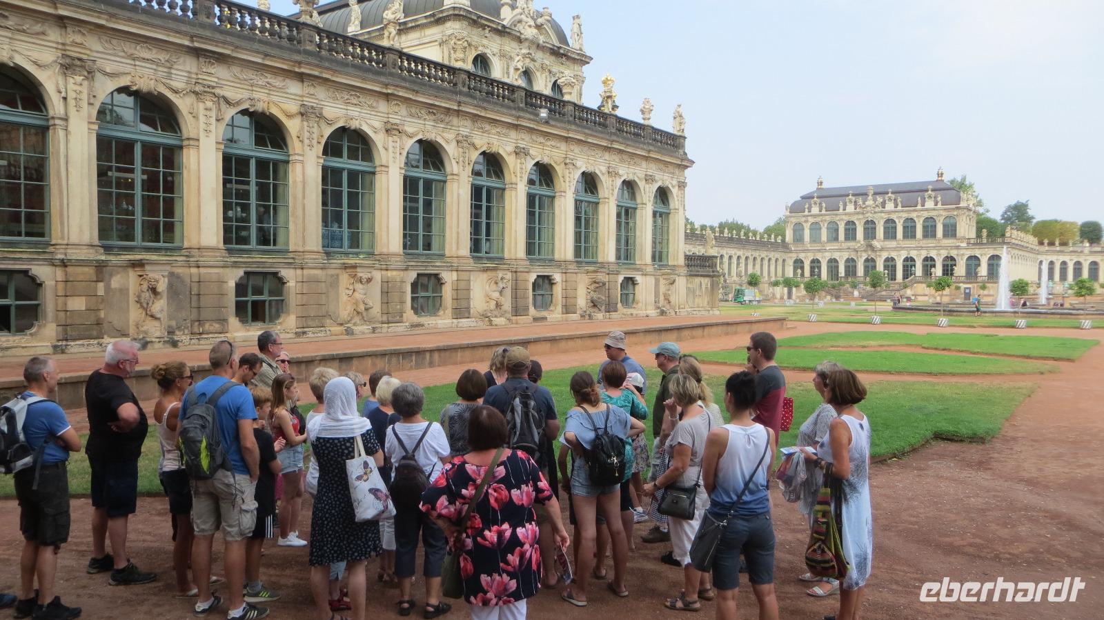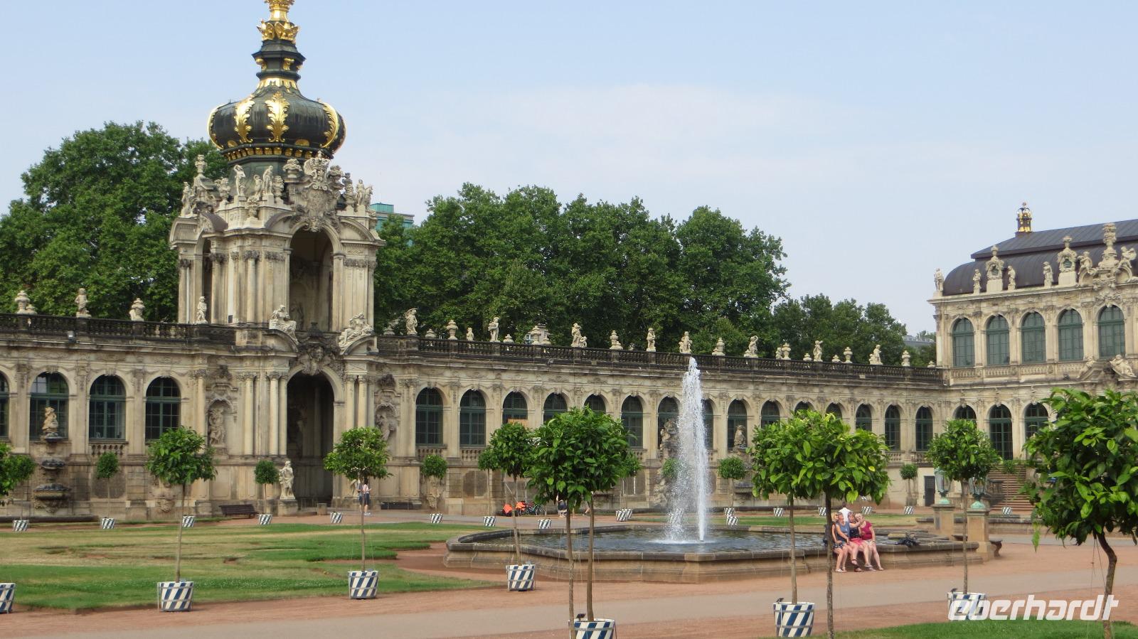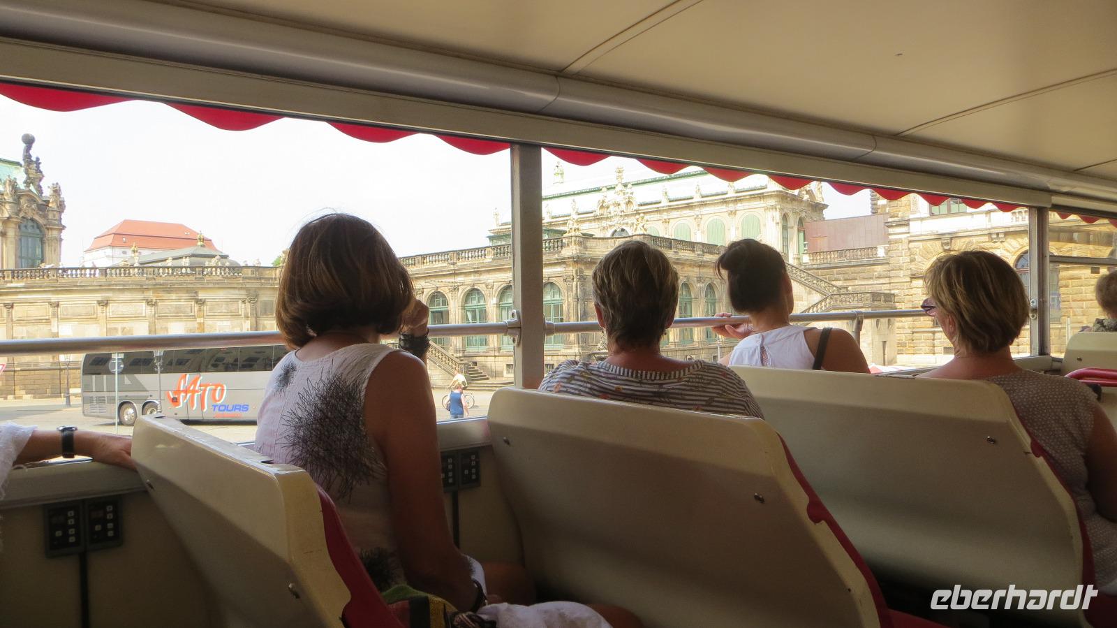 Nach dem gemütlichen Frühstück vom reichhaltigen Buffet holte uns Reiseleiterin Kristin gegen halb Zehn wieder am Hotel ab und wir starteten bei herrlichem Sonnenschein und warmen Temperaturen zu unserer heutigen Stadtbesichtigung. Zu Fuß ging es zunächst zum Dresdner Zwinger, wo wir an einer kleinen Führung durch den ehemaligen Festplatz August des Starken teinahmen. Der Dresdner Zwinger ist eines der bekanntesten barocken Bauwerke in Deutschland und besticht durch gepflegte Gartenanlagen, barocke Pavilions und das liebliche Glockenspiel aus Meißner Porzellan. Dann stiegen wir in den Doppeldecker-Bus und es ging mit kühlendem Fahrtwind auf zur Erlebnis-Stadtrundfahrt. Der Bus fährt zunächst durch die Altstadt vorbei an Yenidze, Theaterplatz, Semperoper, Hofkirche und Brühlscher Terrasse. Dazu gibt es im Bus begleitende Kommentare mit Wissenswertem zu den einzelnen Sehenswürdigkeiten. Dann führte uns die Fahrt aus der Innestadt hinaus zum Großen Garten, der "grünen Lunge" der Stadt Dresden. Wir stiegen an der Gläsernen VW Manufaktur aus und unternahmen einen Spaziergang im etwa zwei Quadratkilometer großen Park. Neben den historischen Torhäusern kamen wir auch am Mosaikbrunnen und dem barocken Sommerpalais vorbei. Dann stiegen wir in den nächsten "Hop on-Hop off" Bus und weiter ging die Rundfahrt links-elbisch in die noblen Stadtteile Striesen und Blasewitz. Hier sieht man schöne Villen aus der Gründerzeit, die den Zweiten Weltkrieg zum großen Teil überlebt haben. Am berühmtesten Bauwerk des Stadtteils Blasewitz und Loschwitz stiegen wir erneut aus: am berühmten Blauen Wunder. Direkt am linken Ende der Brücke kehrten wir zum Mittagessen in einen größten und ältesten Biergärten Dresdens ein, den Schillergarten. Bei kühlen Getränken und typischen sächsischen Gerichten genossen wir unsere Mittagsrast. Zu Fuß ging es dann über das Blaue Wunder auf die andere Seite der Elbe und wir stiegen am Körnerplatz wieder in den Hop on-Bus. Durch den grünen Loschwitzgrund, in dem es früher viele Wassermühlen gab, schlängelte sich die Straße aus dem Elbtal hinauf zum Nobelviertel Weißer Hirsch. Auf der rechten Elbseite befinden sich die drei Elbschlösser Schloss Eckberg, das Lingnerschloss und Schloss Albrechtsberg. Das Lingnerschloss war unser nächstes Ausflugsziel. Nach einem kurzen Spaziergang im schattigen Schlosspark kehrten wir zum Kaffee auf den Lingnerterrassen ein. Von einem der schönsten Biergärten Dresdens hat man hier einen wunderbaren Blick über das Elbtal - ein echter Geheimtipp. Mit dem Bus ging es anschließend zurück in die Innenstadt, diemal aber auf der Neustädter Seite. Einen letzten Hop off legten wir am schönsten Milchladen der Welt ein, Pfunds Molkerei. Über den Albertplatz, die Königsstraße und die Carolabrücke brachte uns der Bus schließlich zurück in die Altstadt, wo unsere Erlebnis-Stadtrundfahrt endete. Wir legten eine kleine Pause im Hotel ein, um uns frischzumachen. Am Abend holte uns Kristin ab und wir spazierten zu unserem zweiten Spezialitäten-Restaurant, dem El Rodizio an der Wilsdruffer Straße. Hier waren wir zu einem typisch brasilianischen Rodizio-Abend eingeladen mit verschiedenen Salaten und Gemüsen sowie leckerem Fleisch von riesigen Grillspießen, die uns von den Gauchos an den Tisch serviert wurden. Bei angenehmen sommerlichen Temperaturen saßen wir im Außenbereich des Restaurants und genossen den Abend bei leckerem Essen "all yo can eat", bei kühlen Getränken und netten Gesprächen.