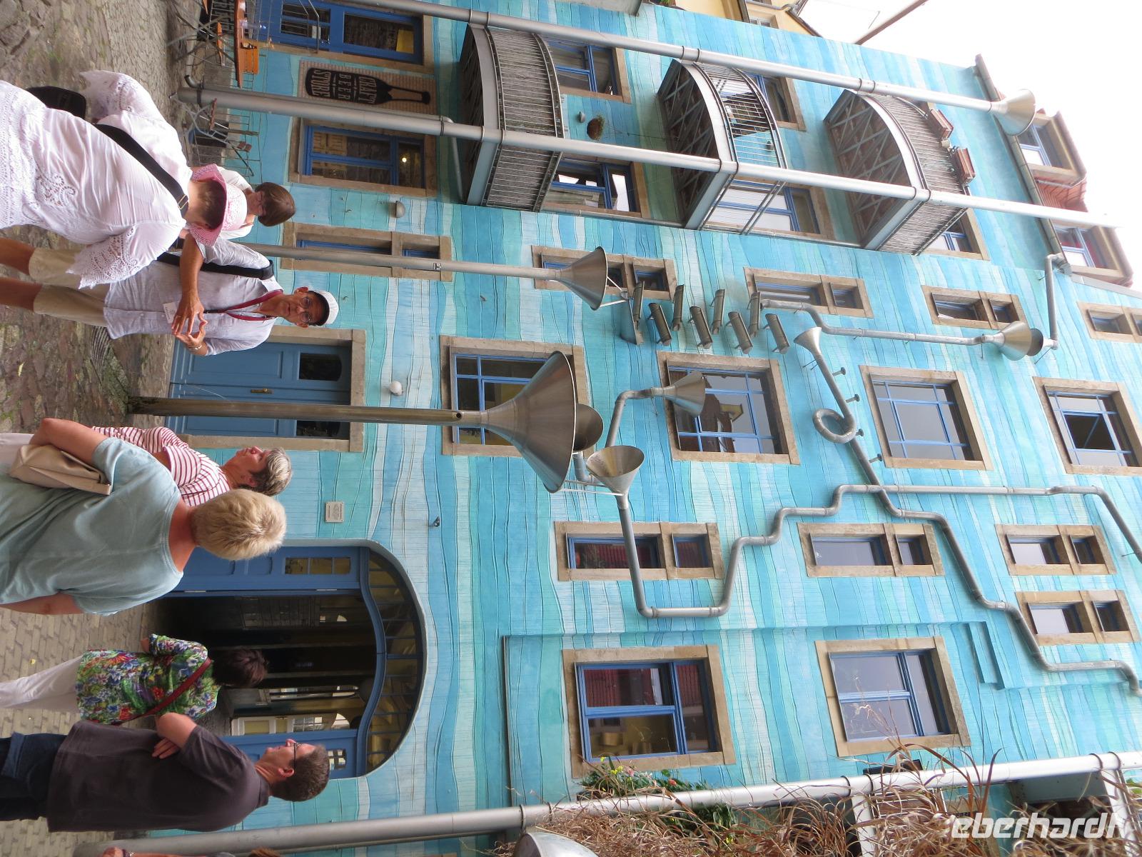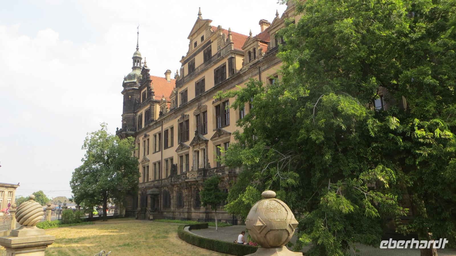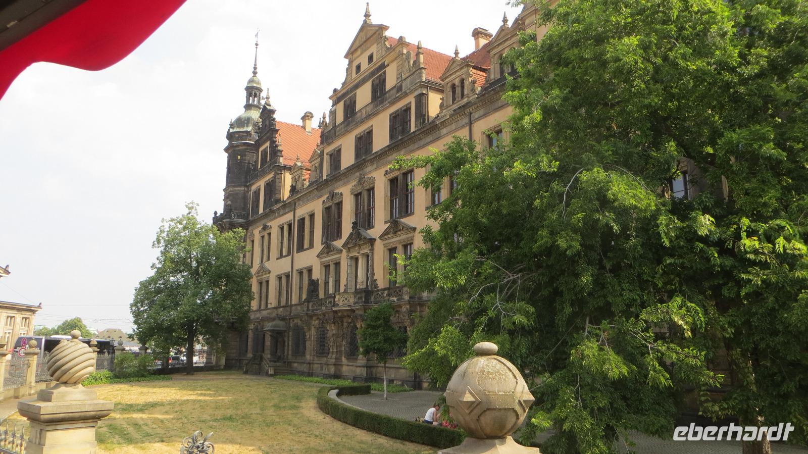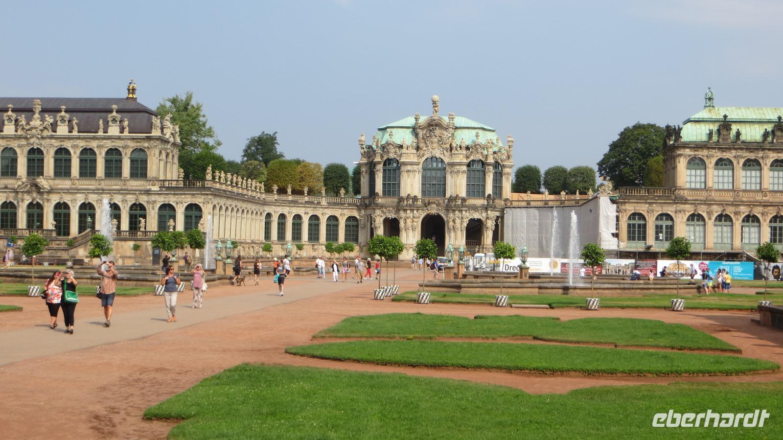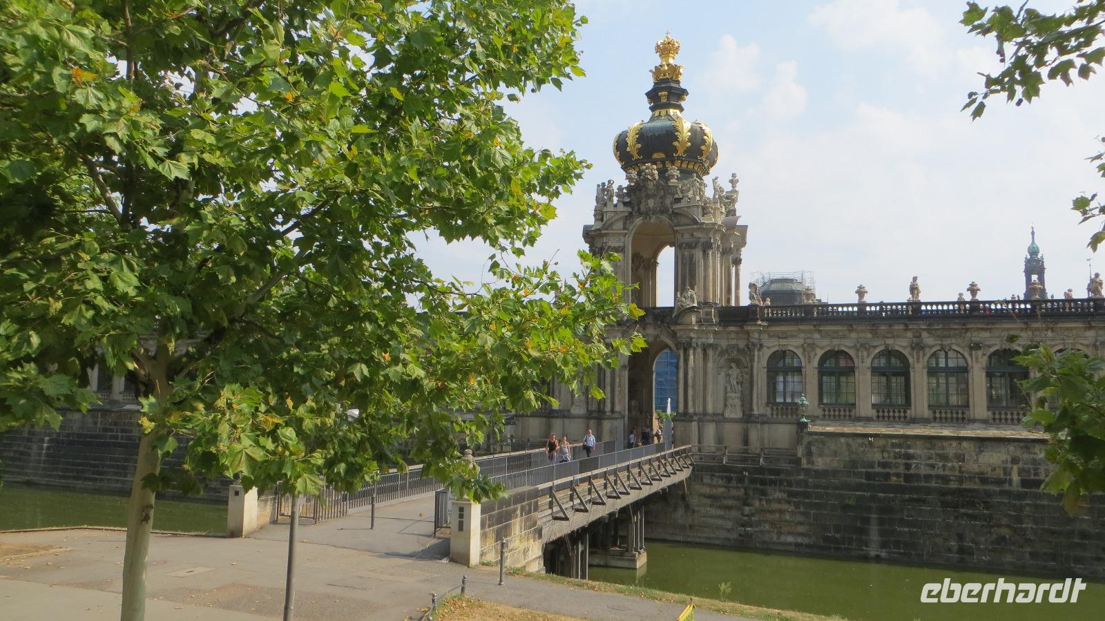 Nach dem gemütlichen Frühstück vom reichhaltigen Buffet holte uns Reiseleiterin Kristin gegen halb Zehn wieder am Hotel ab und wir starteten bei herrlichem Sonnenschein und warmen Temperaturen zu unserer heutigen Stadtbesichtigung. Zu Fuß ging es zunächst zum Dresdner Zwinger, wo wir an einer kleinen Führung durch den ehemaligen Festplatz August des Starken teinahmen. Der Dresdner Zwinger ist eines der bekanntesten barocken Bauwerke in Deutschland und besticht durch gepflegte Gartenanlagen, barocke Pavilions und das liebliche Glockenspiel aus Meißner Porzellan. Dann stiegen wir in den Doppeldecker-Bus und es ging mit kühlendem Fahrtwind auf zur Erlebnis-Stadtrundfahrt. Der Bus fährt zunächst durch die Altstadt vorbei an Yenidze, Theaterplatz, Semperoper, Hofkirche und Brühlscher Terrasse. Dazu gibt es im Bus begleitende Kommentare mit Wissenswertem zu den einzelnen Sehenswürdigkeiten. Dann führte uns die Fahrt aus der Innestadt hinaus zum Großen Garten, der "grünen Lunge" der Stadt Dresden. Wir stiegen an der Gläsernen VW Manufaktur aus und unternahmen einen Spaziergang im etwa zwei Quadratkilometer großen Park. Neben den historischen Torhäusern kamen wir auch am Mosaikbrunnen und dem barocken Sommerpalais vorbei. Dann stiegen wir in den nächsten "Hop on-Hop off" Bus und weiter ging die Rundfahrt links-elbisch in die noblen Stadtteile Striesen und Blasewitz. Hier sieht man schöne Villen aus der Gründerzeit, die den Zweiten Weltkrieg zum großen Teil überlebt haben. Am berühmtesten Bauwerk des Stadtteils Blasewitz und Loschwitz stiegen wir erneut aus: am berühmten Blauen Wunder. Direkt am linken Ende der Brücke kehrten wir zum Mittagessen in einen größten und ältesten Biergärten Dresdens ein, den Schillergarten. Bei kühlen Getränken und typischen sächsischen Gerichten genossen wir unsere Mittagsrast. Zu Fuß ging es dann über das Blaue Wunder auf die andere Seite der Elbe und wir stiegen am Körnerplatz wieder in den Hop on-Bus. Durch den grünen Loschwitzgrund, in dem es früher viele Wassermühlen gab, schlängelte sich die Straße aus dem Elbtal hinauf zum Nobelviertel Weißer Hirsch. Auf der rechten Elbseite befinden sich die drei Elbschlösser Schloss Eckberg, das Lingnerschloss und Schloss Albrechtsberg. Das Lingnerschloss war unser nächstes Ausflugsziel. Nach einem kurzen Spaziergang im schattigen Schlosspark kehrten wir zum Kaffee auf den Lingnerterrassen ein. Von einem der schönsten Biergärten Dresdens hat man hier einen wunderbaren Blick über das Elbtal - ein echter Geheimtipp. Mit dem Bus ging es anschließend zurück in die Innenstadt, diemal aber auf der Neustädter Seite. Einen letzten Hop off legten wir am schönsten Milchladen der Welt ein, Pfunds Molkerei. Über den Albertplatz, die Königsstraße und die Carolabrücke brachte uns der Bus schließlich zurück in die Altstadt, wo unsere Erlebnis-Stadtrundfahrt endete. Wir legten eine kleine Pause im Hotel ein, um uns frischzumachen. Am Abend holte uns Kristin ab und wir spazierten zu unserem zweiten Spezialitäten-Restaurant, dem El Rodizio an der Wilsdruffer Straße. Hier waren wir zu einem typisch brasilianischen Rodizio-Abend eingeladen mit verschiedenen Salaten und Gemüsen sowie leckerem Fleisch von riesigen Grillspießen, die uns von den Gauchos an den Tisch serviert wurden. Bei angenehmen sommerlichen Temperaturen saßen wir im Außenbereich des Restaurants und genossen den Abend bei leckerem Essen "all yo can eat", bei kühlen Getränken und netten Gesprächen.