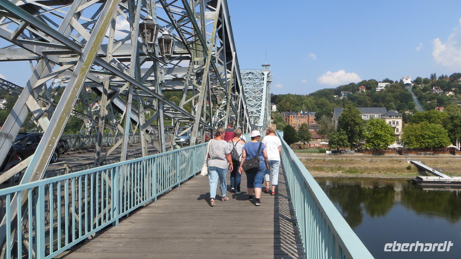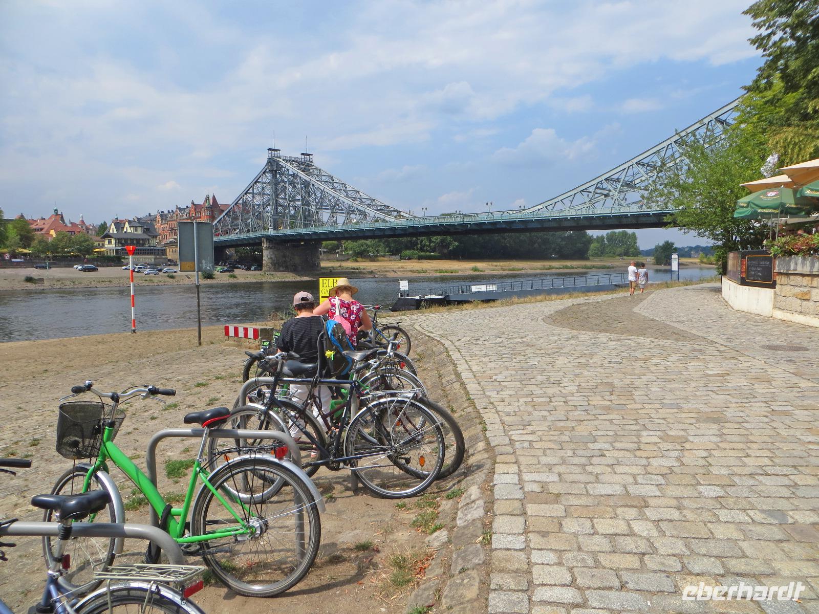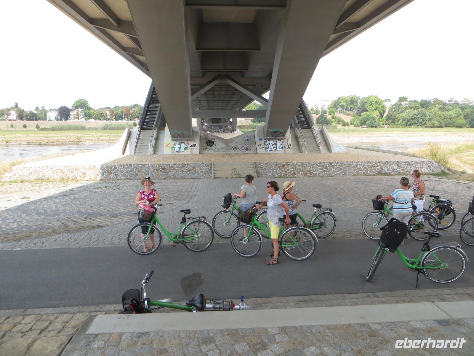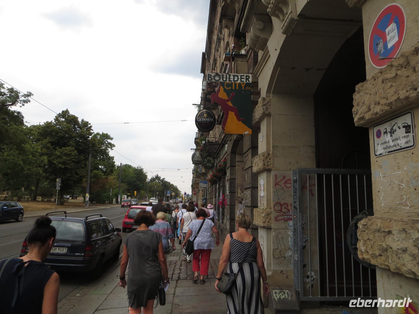 Auch der zweite Teil unserer Single-Gruppe kam später zum Panometer und wir radelten von hier gemeinsam durch die Stadtteile Seidnitz und Tolkewitz zur Elbe. Auf dem bekannten Elbe-Radweg ging es weiter bis zum Blauen Wunder. Wir überquerten die Brücke und kehrten zur Mittagspause in den Elbegarten auf der rechten Seite der Elbe ein. Aufgrund der hohen Temperaturen entschieden wir uns, auf der linken Elbseite zurück in die Altstadt zu radeln. Gegen 15.00 Uhr kamen wir wieder beim Radverleih an und konnten uns kurz im Hotel frischmachen, bevor es per Straßenbahn in die Dresdner Neustadt ging. Hier erwartete uns unser Stadtführer für die kulinarische Führung im größten Dresdner Kneipenviertel, einem der größten zusammenhängenden Gründerzeitviertel Deutschlands. Wir erfuhren allerlei Wissenswertes zur Geschichte, den Häusern und den Bewohnern des Szeneviertels. Hier wohnen heute vor allem junge Leute, Studenten und junge Familien. Dabei besuchten wir drei verschiedene Lokalitäten und durften je eine Kostprobe der hier angebotenen Spezialitäten genießen - vom vegetarisch belegten Brot über den Low Food Burger bis zu russischen Pelmenis. Zum Abschluss waren wir zum Abendessen in einem der typischen Neustädter Hinterhof-Biergärten eingeladen. Bei italienischen Spezialitäten, Wein und Plaudereien ließen wir den letzten Abend unserer Singlereise gemütlich ausklingen. Per Straßenbahn ging es am späten Abend zurück zum Hotel auf der Prager Straße oder zum Drink in einer der Cocktailbars.