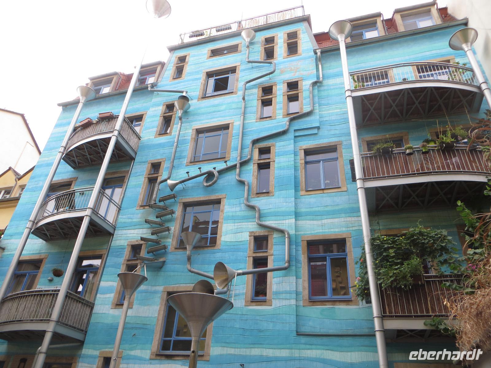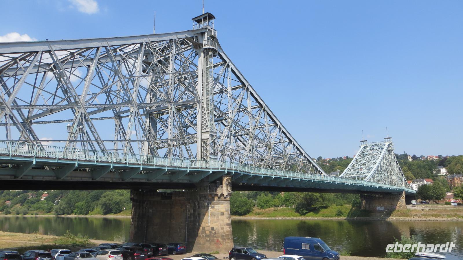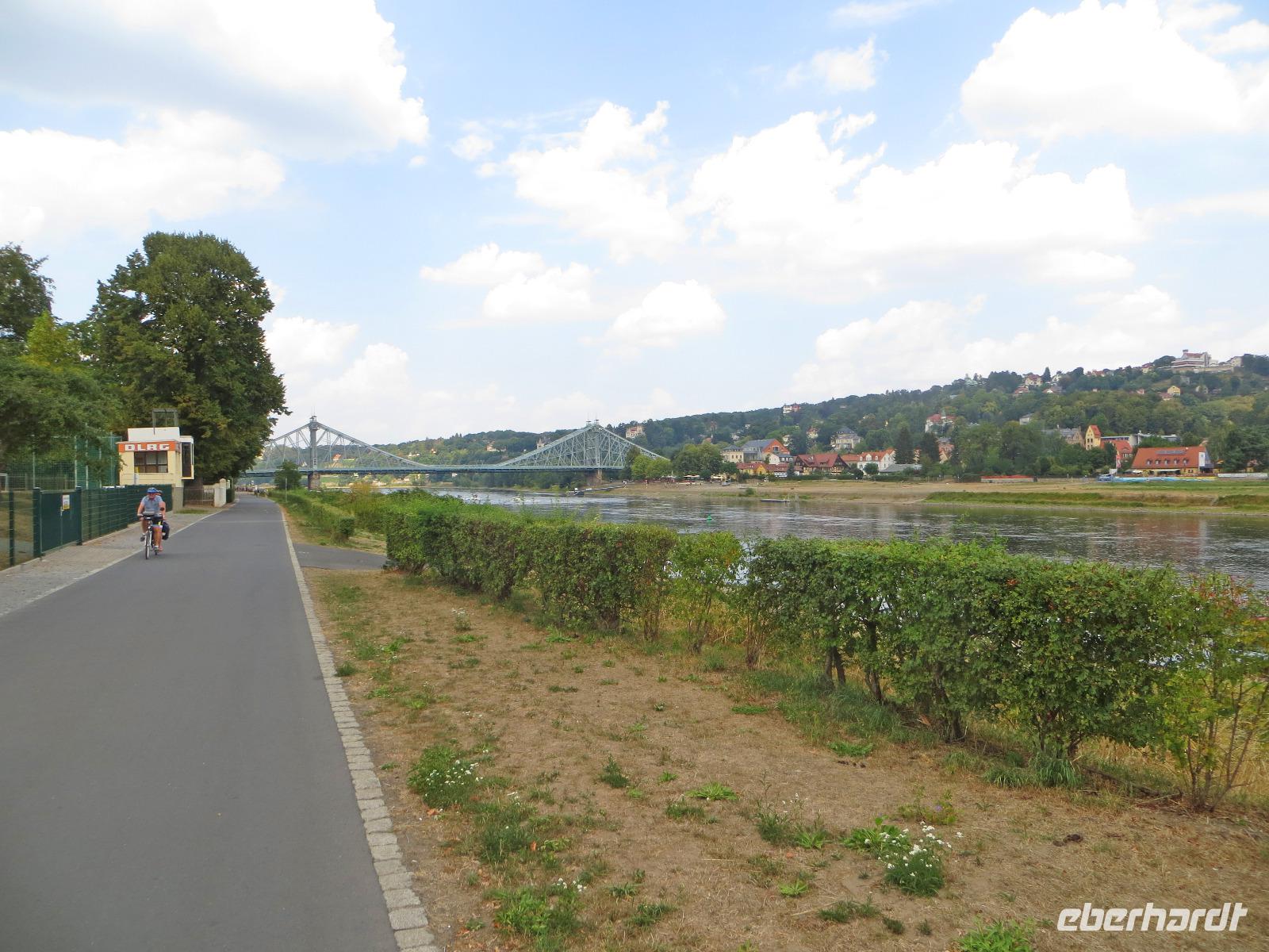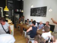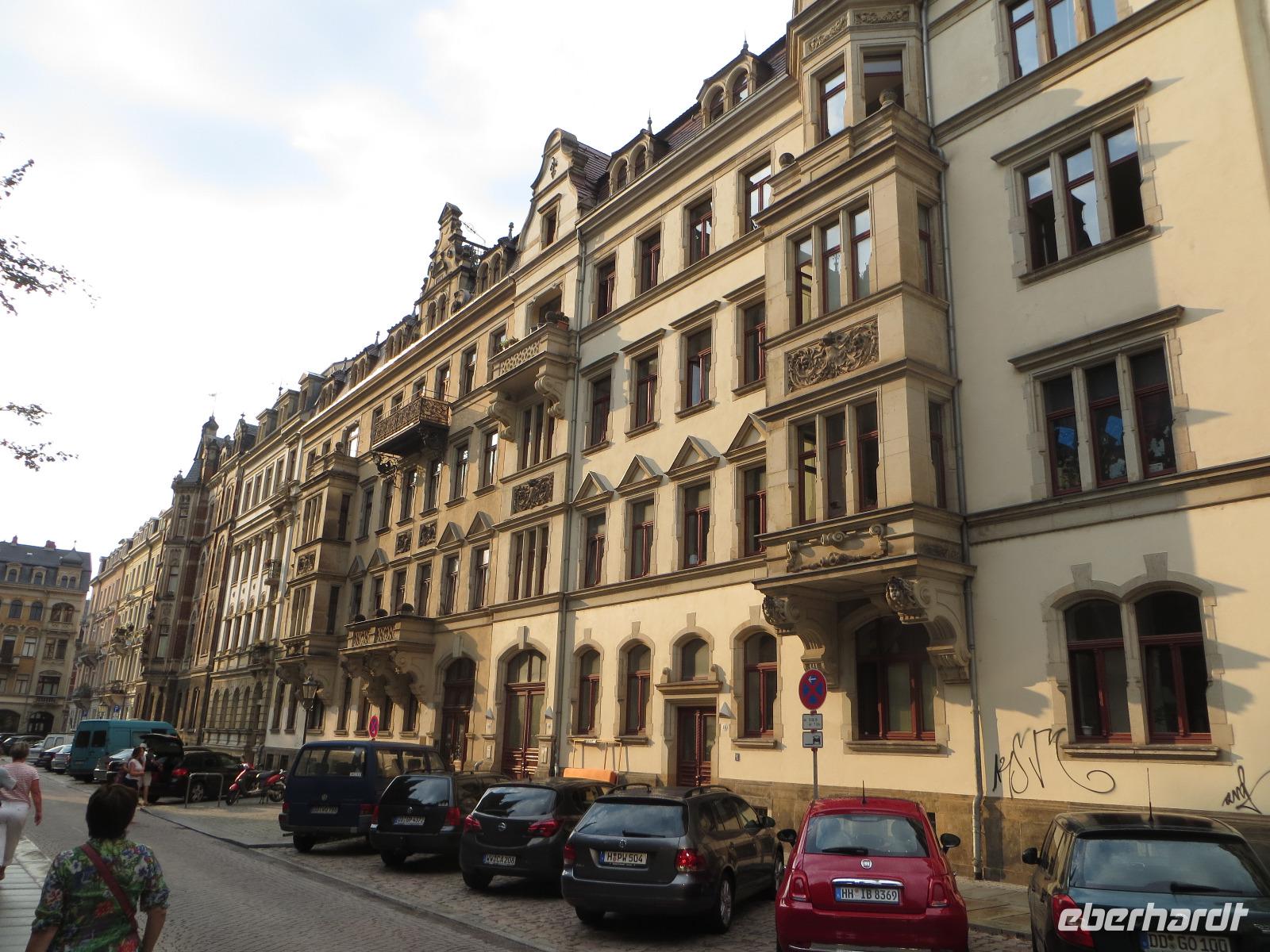 Auch der zweite Teil unserer Single-Gruppe kam später zum Panometer und wir radelten von hier gemeinsam durch die Stadtteile Seidnitz und Tolkewitz zur Elbe. Auf dem bekannten Elbe-Radweg ging es weiter bis zum Blauen Wunder. Wir überquerten die Brücke und kehrten zur Mittagspause in den Elbegarten auf der rechten Seite der Elbe ein. Aufgrund der hohen Temperaturen entschieden wir uns, auf der linken Elbseite zurück in die Altstadt zu radeln. Gegen 15.00 Uhr kamen wir wieder beim Radverleih an und konnten uns kurz im Hotel frischmachen, bevor es per Straßenbahn in die Dresdner Neustadt ging. Hier erwartete uns unser Stadtführer für die kulinarische Führung im größten Dresdner Kneipenviertel, einem der größten zusammenhängenden Gründerzeitviertel Deutschlands. Wir erfuhren allerlei Wissenswertes zur Geschichte, den Häusern und den Bewohnern des Szeneviertels. Hier wohnen heute vor allem junge Leute, Studenten und junge Familien. Dabei besuchten wir drei verschiedene Lokalitäten und durften je eine Kostprobe der hier angebotenen Spezialitäten genießen - vom vegetarisch belegten Brot über den Low Food Burger bis zu russischen Pelmenis. Zum Abschluss waren wir zum Abendessen in einem der typischen Neustädter Hinterhof-Biergärten eingeladen. Bei italienischen Spezialitäten, Wein und Plaudereien ließen wir den letzten Abend unserer Singlereise gemütlich ausklingen. Per Straßenbahn ging es am späten Abend zurück zum Hotel auf der Prager Straße oder zum Drink in einer der Cocktailbars.