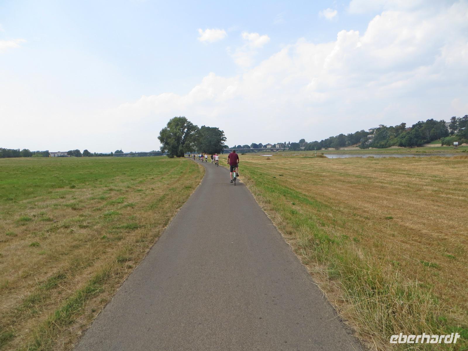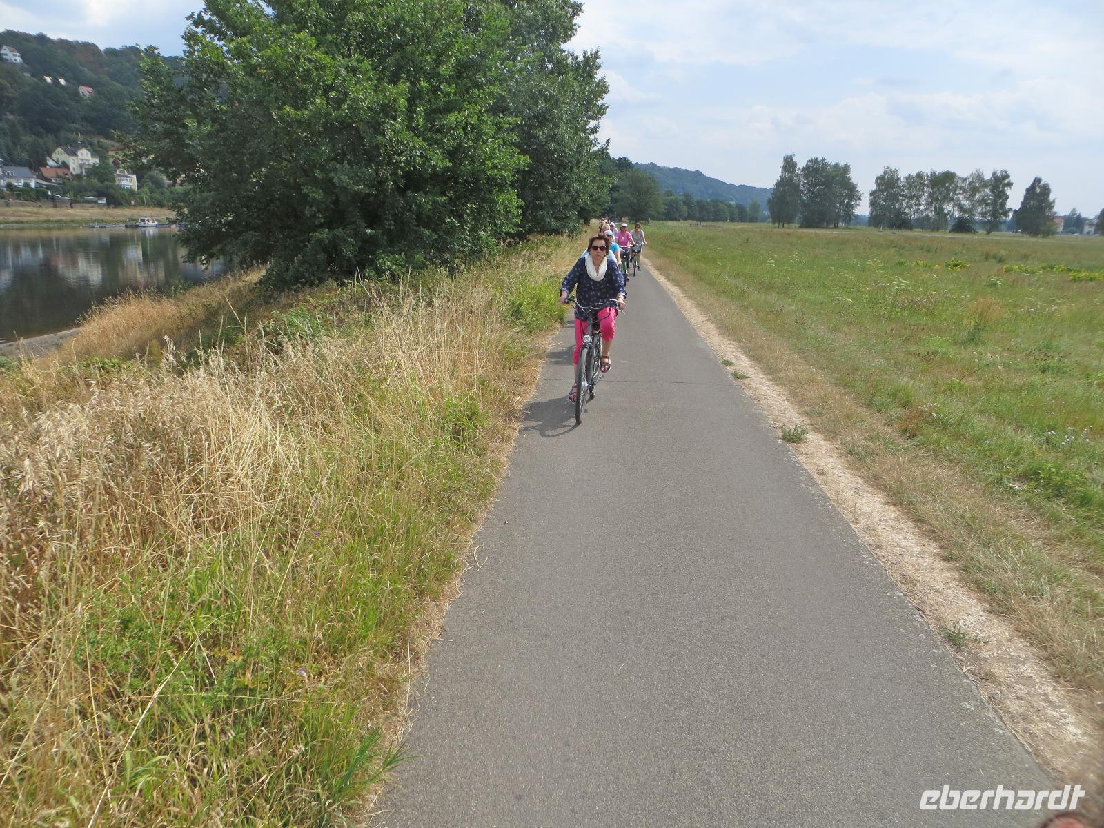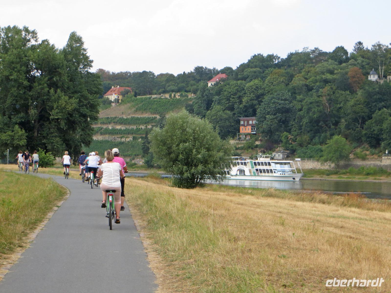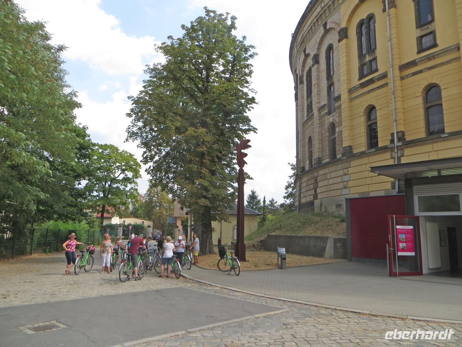 Den Vormittag nutzten einige Gäste zum Entspannen, Shoppen oder Baden im städtischen Arnoldbad am Großen Garten. Ein Großteil unserer Singlereise-Gruppe hatte sich trotz der hohen Sommertemperaturen aber doch für die gemeinsame Radtour ins Dresdner Elbtal entschieden. Kristin holte uns am Hotel ab und wir spazierten zum Fahrradverleih in der Dresdner Altstadt, in dem die Fahrräder für uns reserviert waren. Ausgestattet mit City Bikes und einer Flasche Wasser starteten wir mit Kristin und Ihrer Kollegin Franzi zu unserer Radtour. Von der Frauenkirche ging es zunächst zum Großen Garten. Hier teilten wir die Gruppe und einige Singles unternahmen mit Franzi eine Rundfahrt im Großen Garten. Wer das Panometer besuchen wollte, fuhr mit Kristin entlang der Hauptallee zu dem riesigen runden Gasspeicher, der nun für die Großbild-Panoramas des Künstler Yadegar Asisi genutzt wird. Hier sahen wir uns die aktuelle Ausstellung und das 27 Meter hohe 360° Panorama von "Dresden im Barock" an. Es zeigt das historische Dresden aus der Perspektive des Turms der Hofkirche um das Jahr 1756, kurz nach der Regierungszeit Augusts des Starken. Die Mischung aus Gemälde und Fotokunst, die Musik und die Lichteffekte schaffen ein beeindruckendes Erlebnis für alle Sinne. Bisher war jeder Gast begeistert, der zum ersten Mal ein Asisi-Panorama besucht hat und ich kann es wirklich empfehlen.