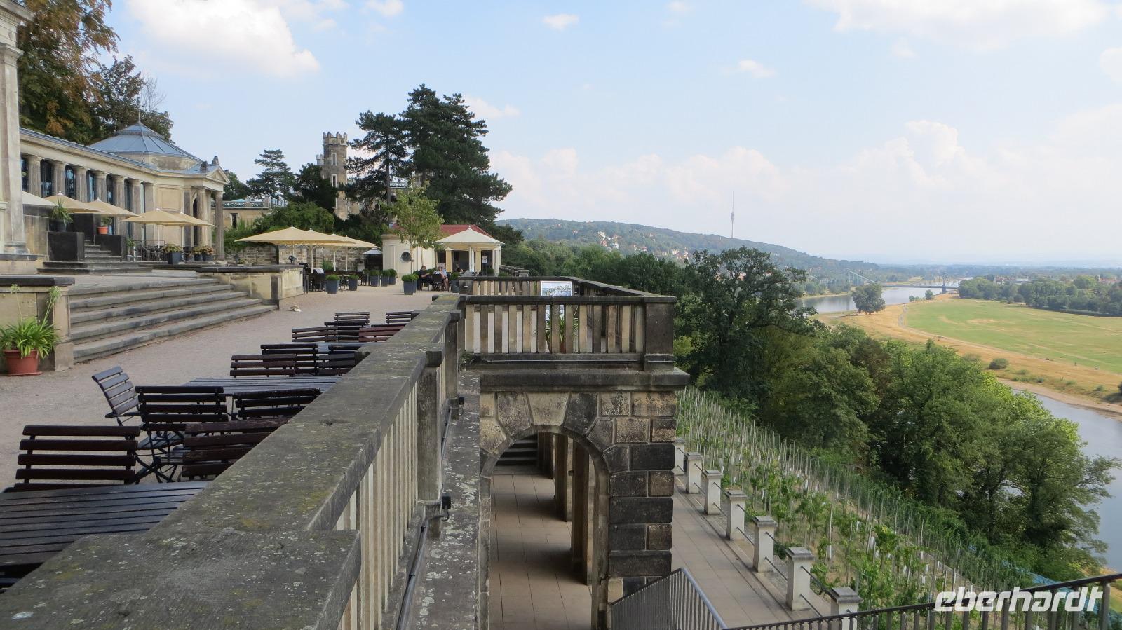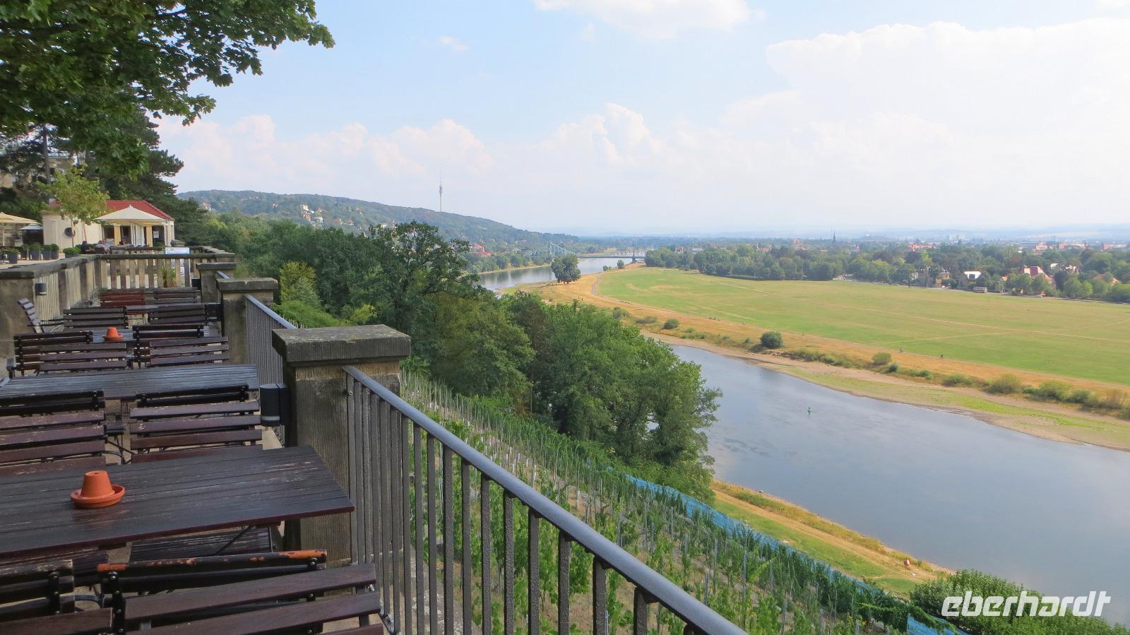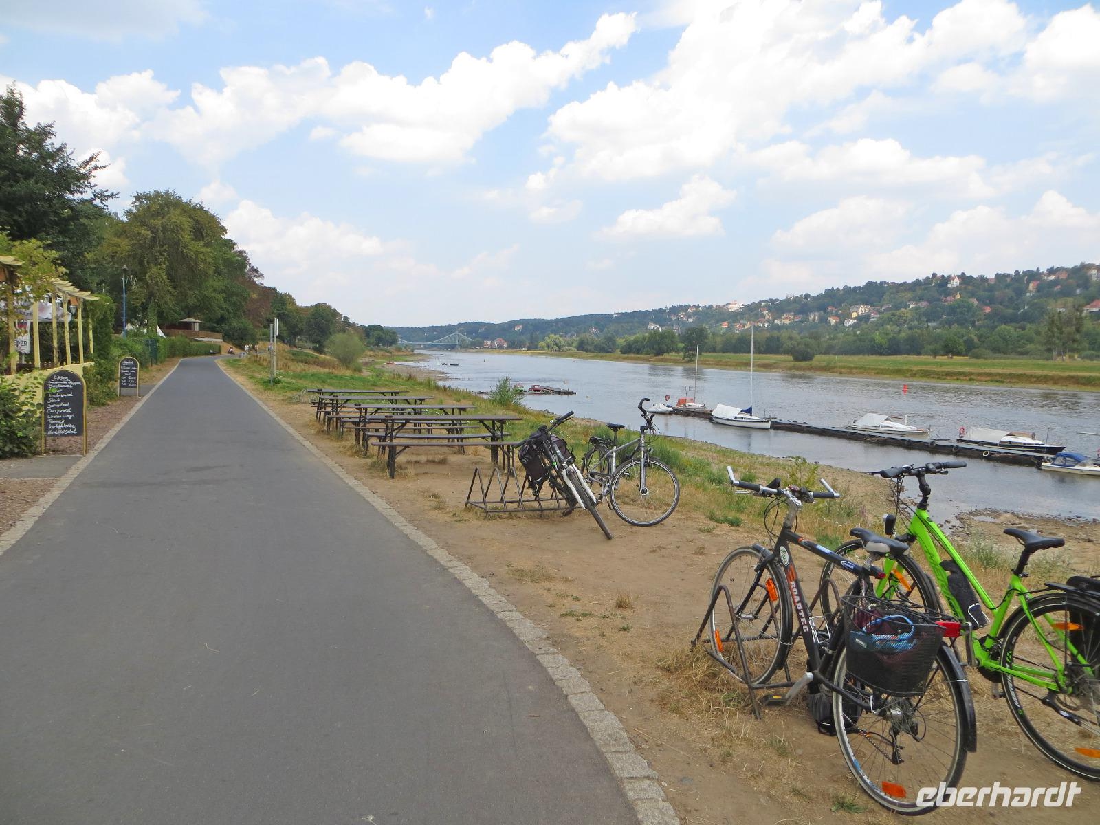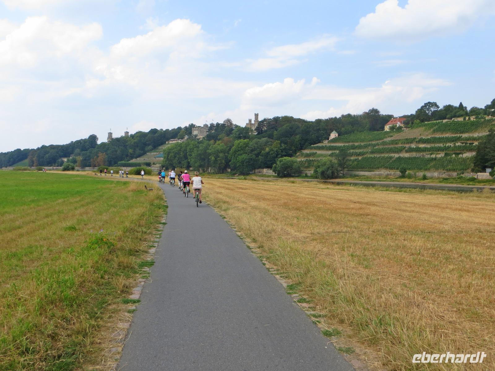 Den Vormittag nutzten einige Gäste zum Entspannen, Shoppen oder Baden im städtischen Arnoldbad am Großen Garten. Ein Großteil unserer Singlereise-Gruppe hatte sich trotz der hohen Sommertemperaturen aber doch für die gemeinsame Radtour ins Dresdner Elbtal entschieden. Kristin holte uns am Hotel ab und wir spazierten zum Fahrradverleih in der Dresdner Altstadt, in dem die Fahrräder für uns reserviert waren. Ausgestattet mit City Bikes und einer Flasche Wasser starteten wir mit Kristin und Ihrer Kollegin Franzi zu unserer Radtour. Von der Frauenkirche ging es zunächst zum Großen Garten. Hier teilten wir die Gruppe und einige Singles unternahmen mit Franzi eine Rundfahrt im Großen Garten. Wer das Panometer besuchen wollte, fuhr mit Kristin entlang der Hauptallee zu dem riesigen runden Gasspeicher, der nun für die Großbild-Panoramas des Künstler Yadegar Asisi genutzt wird. Hier sahen wir uns die aktuelle Ausstellung und das 27 Meter hohe 360° Panorama von "Dresden im Barock" an. Es zeigt das historische Dresden aus der Perspektive des Turms der Hofkirche um das Jahr 1756, kurz nach der Regierungszeit Augusts des Starken. Die Mischung aus Gemälde und Fotokunst, die Musik und die Lichteffekte schaffen ein beeindruckendes Erlebnis für alle Sinne. Bisher war jeder Gast begeistert, der zum ersten Mal ein Asisi-Panorama besucht hat und ich kann es wirklich empfehlen.