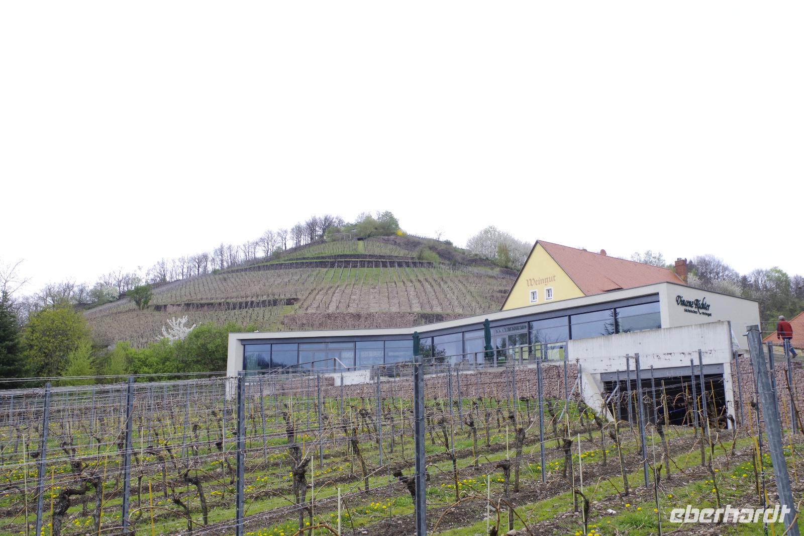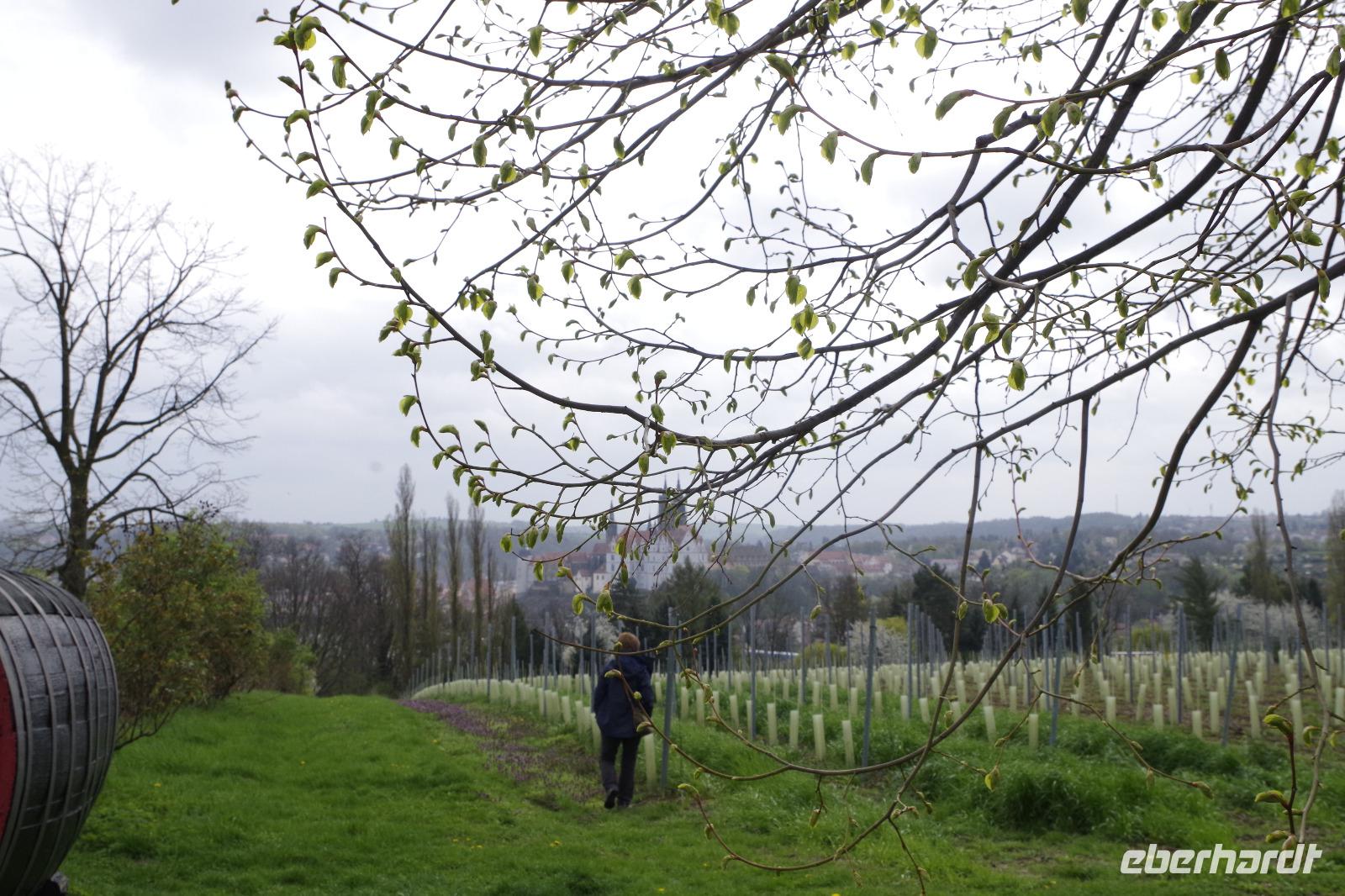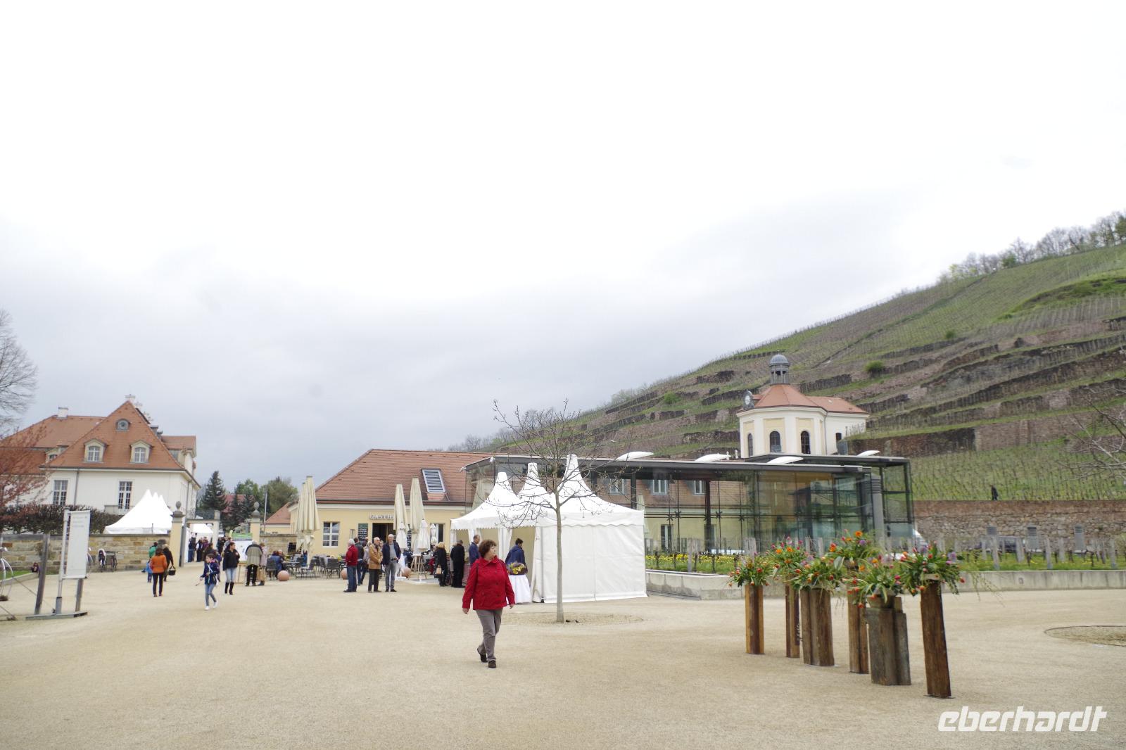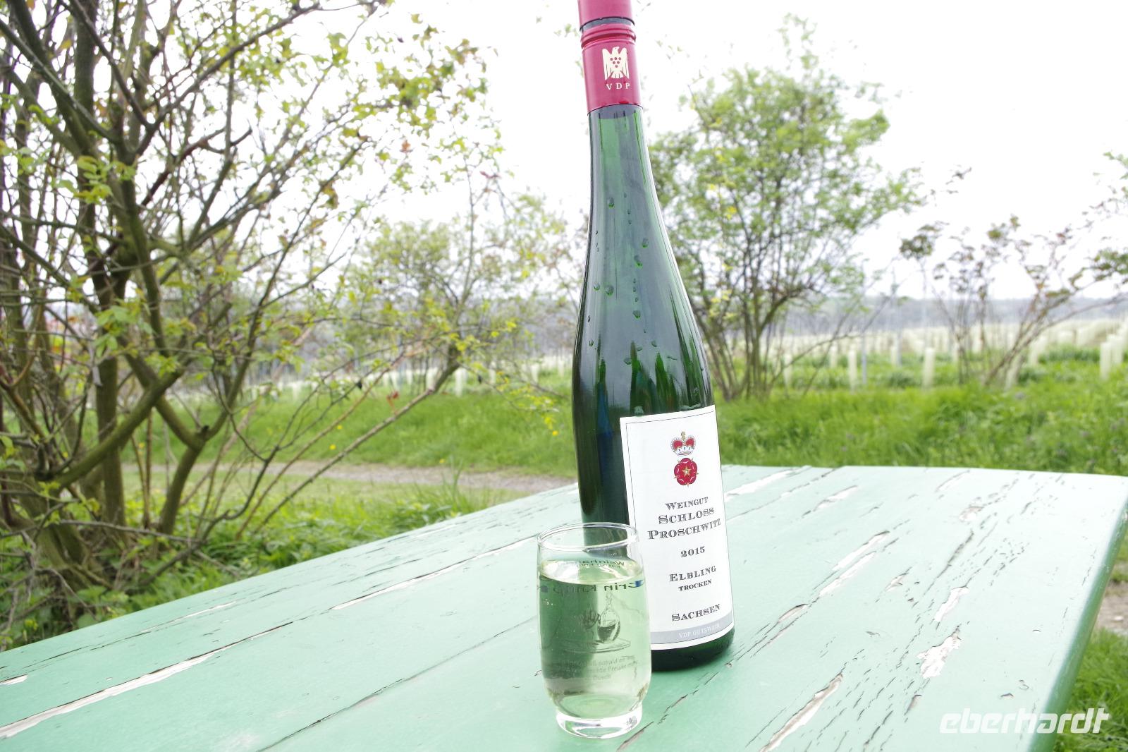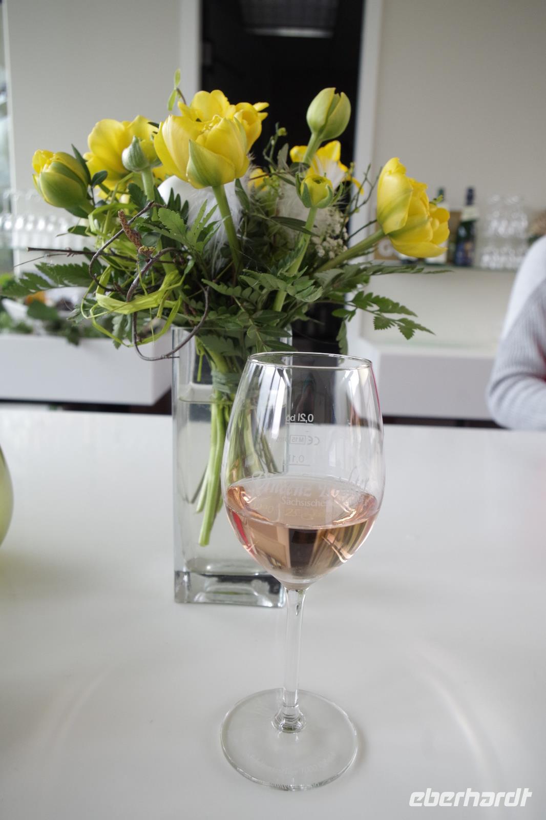 In Meißen begann anschließend unsere Bus-Rundfahrt entlang der Sächsischen Weinstraße. Zunächst fuhren wir im frühlingshaften Elbtal in die Weinorte rund um Diesbar-Seußlitz. Blühende Kirschbäume und Mandelbäumchen säumten den Weg und die Sonne brach ab und an durch den bewölkten Himmel. Unser nächstes Ziel war Schloss Proschwitz und die umliegenden Weinhänge, von denen wir einen wunderschönen Blick auf Meißen und das Elbtal genießen konnten. Dazu probierten wir einen Weißwein von Prinz zur Lippe, den unsere örtliche Gästeführerin mitgebracht hatte. Nach einem kleinem Rundgang durch den Garten des Schlosses Proschwitz ging unsere gemeinsame Rundfahrt weiter entlang der Elbe nach Sörnewitz. Hier waren wir zu einer Weinverkostung im Weingut Vincenz Richter eingeladen und erfuhren viel Wissenswertes zum Weinanbau und zur Weinverarbeitung im Sächsischen Elbland.