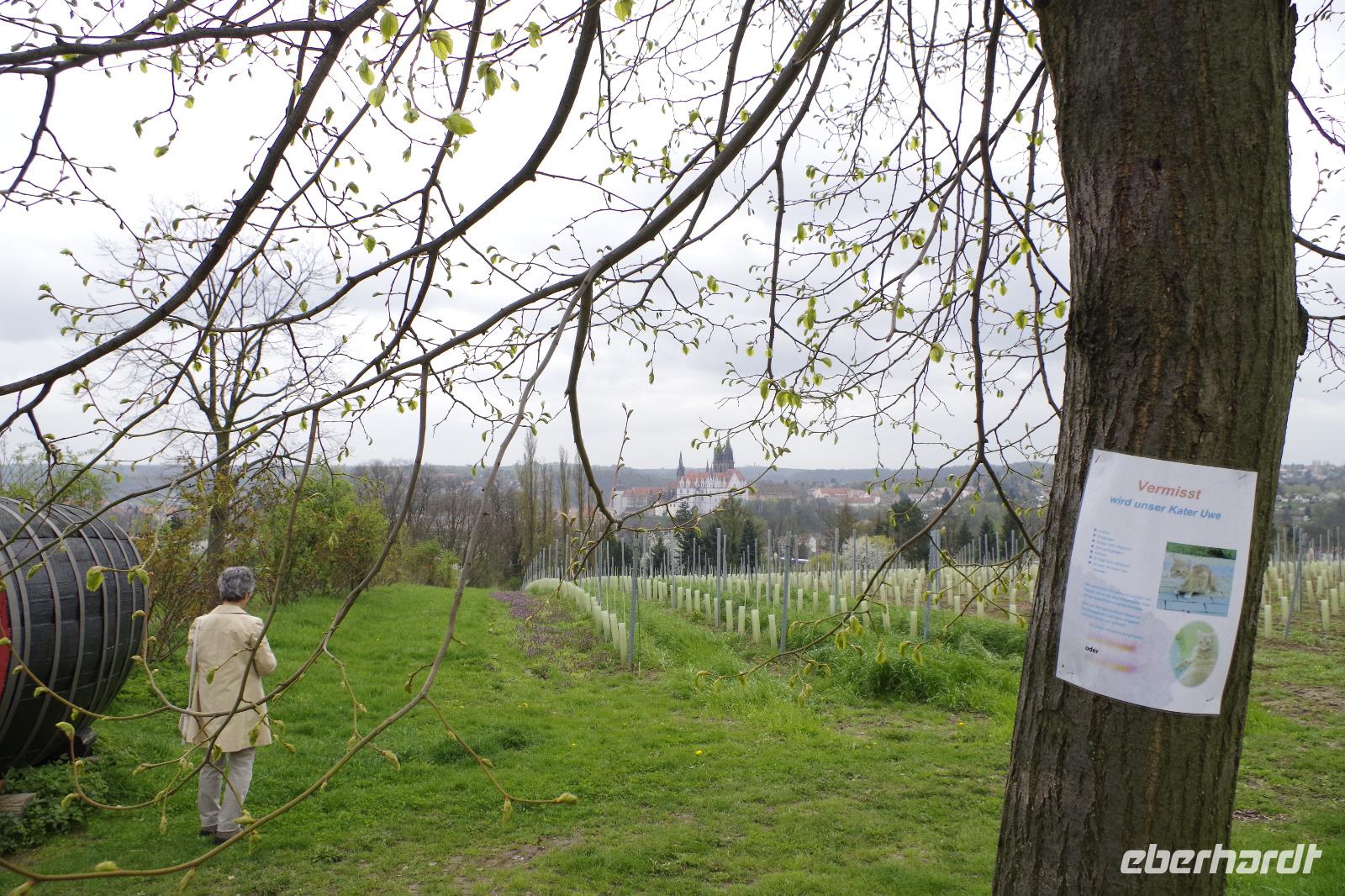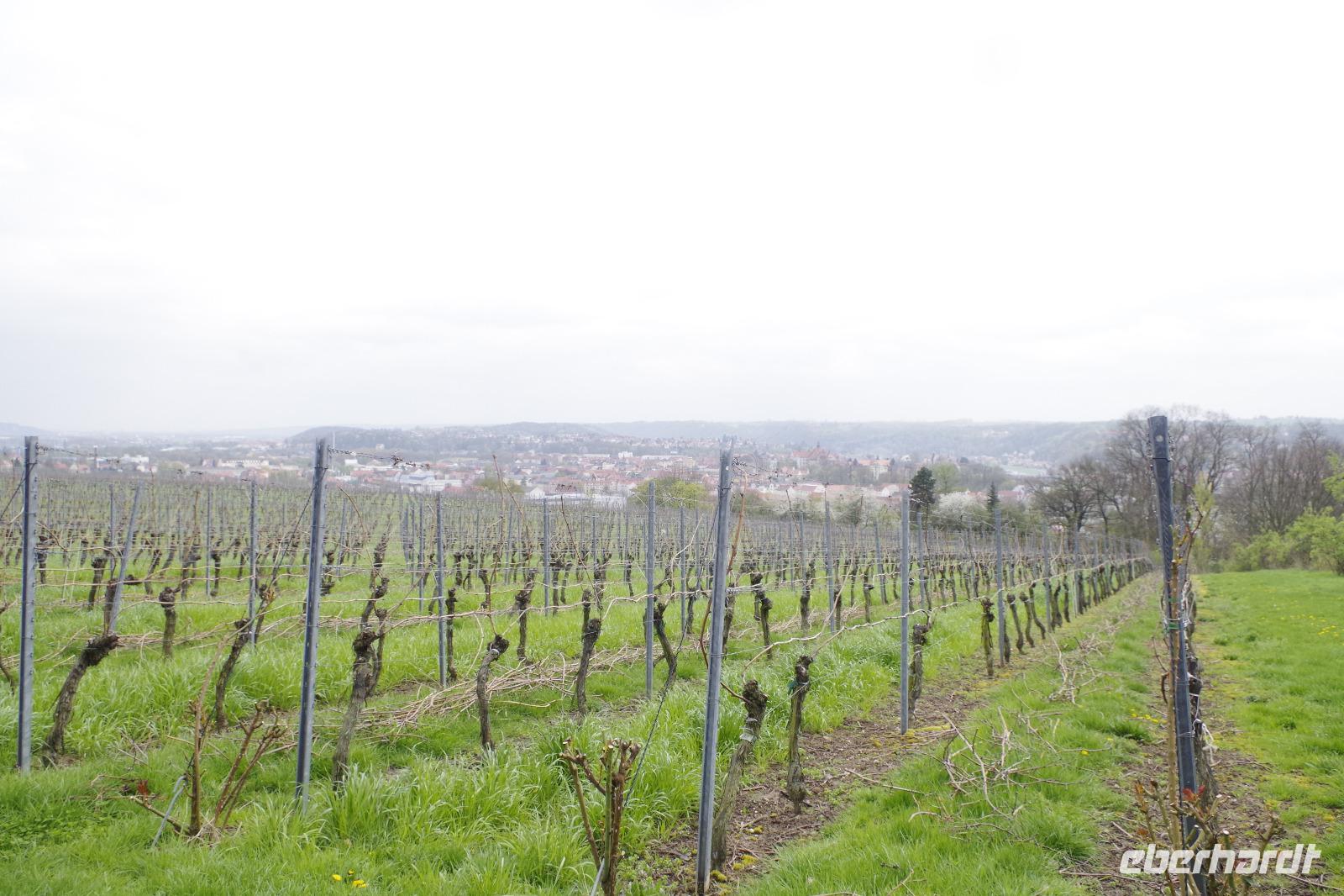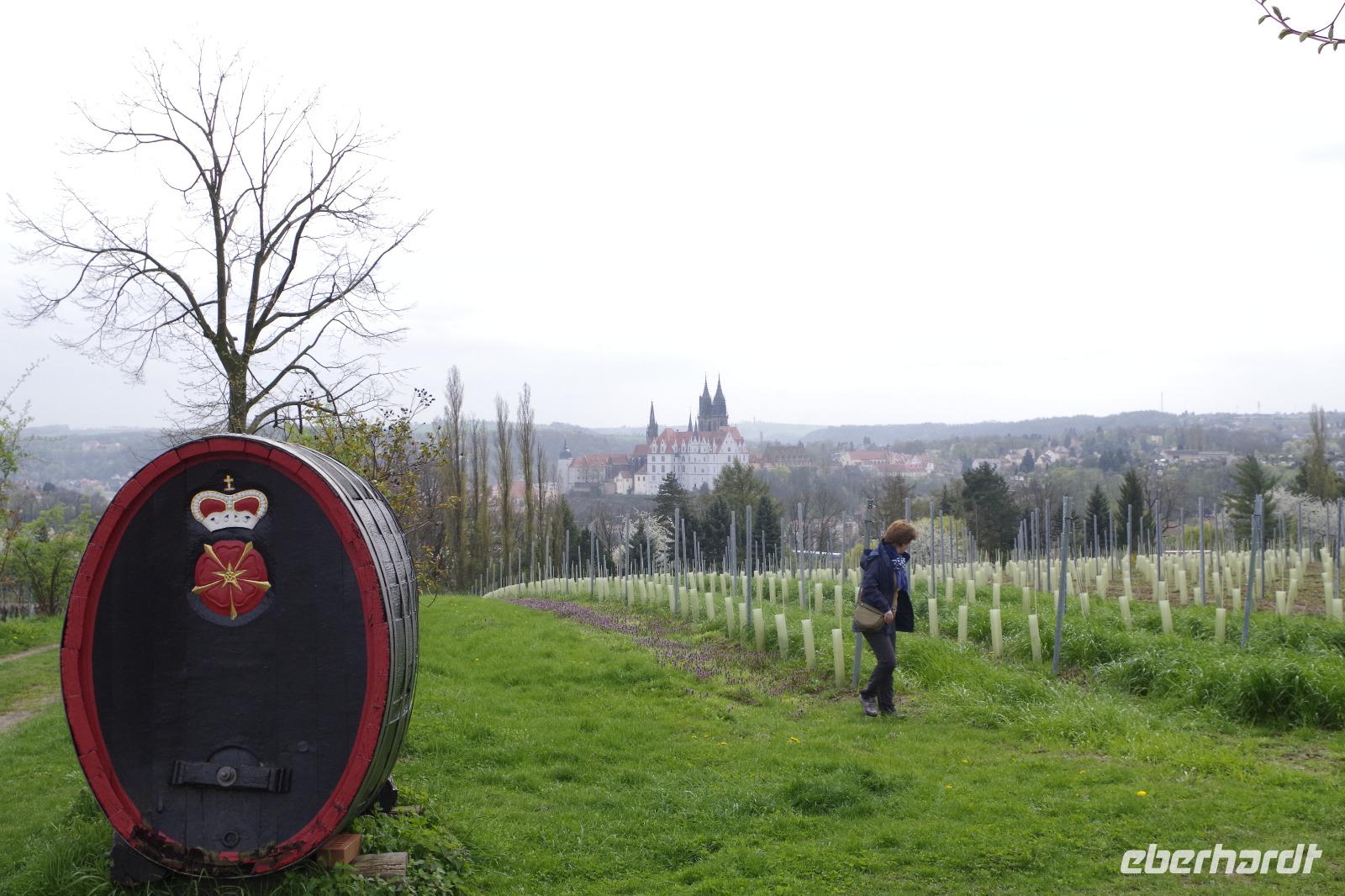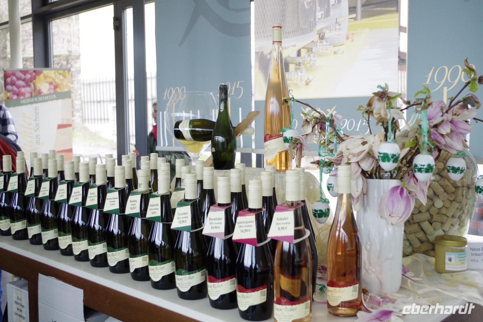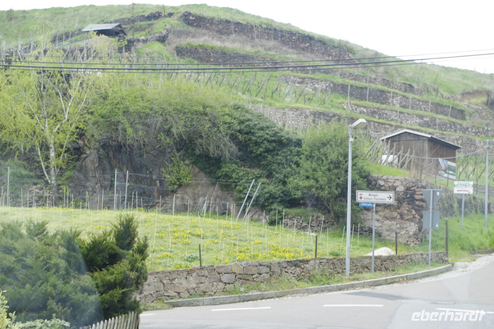 In Meißen begann anschließend unsere Bus-Rundfahrt entlang der Sächsischen Weinstraße. Zunächst fuhren wir im frühlingshaften Elbtal in die Weinorte rund um Diesbar-Seußlitz. Blühende Kirschbäume und Mandelbäumchen säumten den Weg und die Sonne brach ab und an durch den bewölkten Himmel. Unser nächstes Ziel war Schloss Proschwitz und die umliegenden Weinhänge, von denen wir einen wunderschönen Blick auf Meißen und das Elbtal genießen konnten. Dazu probierten wir einen Weißwein von Prinz zur Lippe, den unsere örtliche Gästeführerin mitgebracht hatte. Nach einem kleinem Rundgang durch den Garten des Schlosses Proschwitz ging unsere gemeinsame Rundfahrt weiter entlang der Elbe nach Sörnewitz. Hier waren wir zu einer Weinverkostung im Weingut Vincenz Richter eingeladen und erfuhren viel Wissenswertes zum Weinanbau und zur Weinverarbeitung im Sächsischen Elbland.