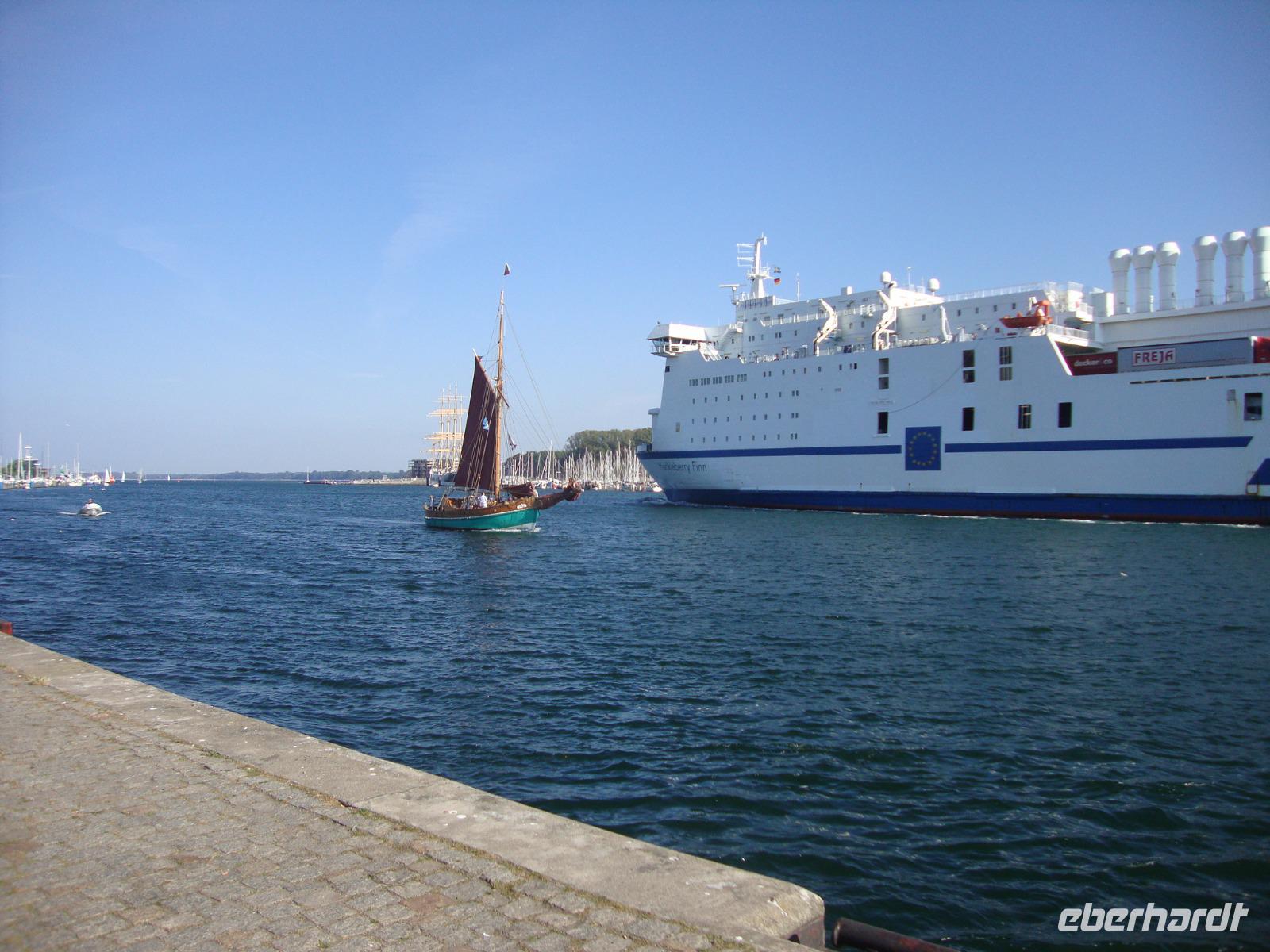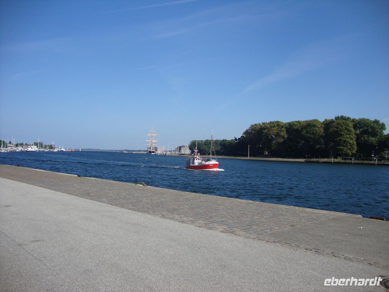 Weltweit kennt man die Stadt an der Förde als den Ort, an dem sich alles um den Segelsport dreht: Die international renommierte "Kieler Woche" versetzt die Stadt jeden Juni für 10 Tage in den Ausnahmezustand. Die Gästeführerin, Frau Gripp, stieg am Exerzierplatz in unseren Bus und fuhr mit uns zu den bekanntesten Sehenswürdigkeiten. Vorbei ging die Fahrt an der Holstenstrasse, die 1953 zu einer der ersten Fußgängerzonen Deutschlands wurde. Am Norwegenkai sahen wir die Color-Line, welche täglich nach Oslo fährt. Vom Besucherzentrum hat man einen Blick über den gesamten Kieler Hafen. Es lohnt sich , in Kiel-Holtenau einen Blick auf eine der größten Schleußenanlagen der Welt zu werfen. Rund 35000 Containerfrachter, Lastkähne, Kreuzfahrtschiffe, Segler und 15000 Sportboote werden jährlich zur Einfahrt in den Nord-Ostsee-Kanal in 4 Schleußenkammern bis zu 1,50 m gehoben oder gesenkt. Ein wahrhaft gewaltiges Unternehmen. Aber bei den hohen Temperaturen zogen wir es vor, im Bus zubleiben, Rene hatte angenehme 23°C mit der Klimaanlage eingestellt.
