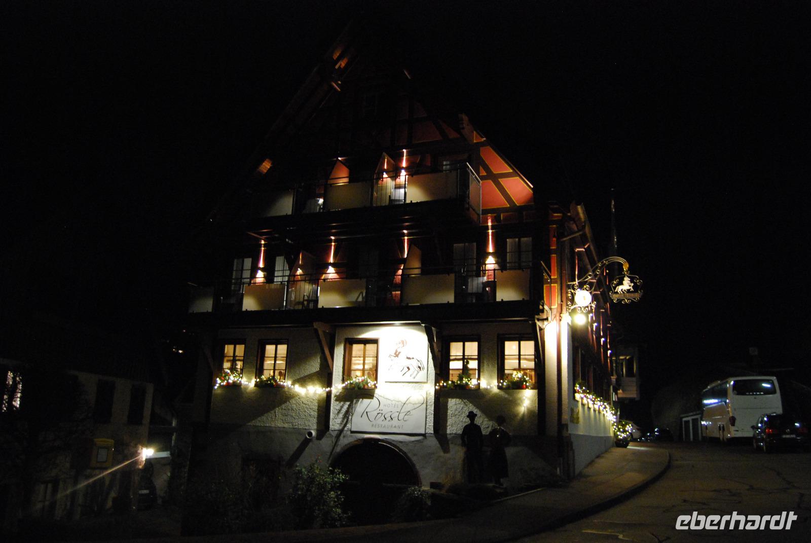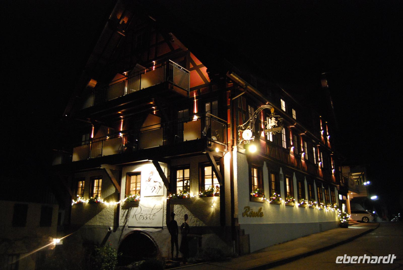 Zeitig startete der Bus von Pirna über Dresden in Richtung Süden. In süd-westlicher Richtung fuhren wir durch den Freistaat Bayern bis nach Baden-Württemberg. Bevor wir aber in die Region Freudenstadt einfuhren, machten wir noch eine Schleife über Pforzheim und Karlsruhe und sammelten dort noch weitere Gäste ein. Nun, da wir jetzt so ziemlich den ganzen Bus befüllt hatten ging es direkt zur Unterkunft. In Offenburg, nicht weit von der französischen Grenze entfernt, verließen wir die Autobahn und mussten nun über die gut ausgebauten Straßen den Schwarzwald von West nach Ost durchfahren. Müde von der langen Reise kamen wir in dem gemütlichen Schwarzwald-Örtchen Alpirsbach an. Das Hotel Rössle, mit der Familie Beilharz, empfing uns herzlich.