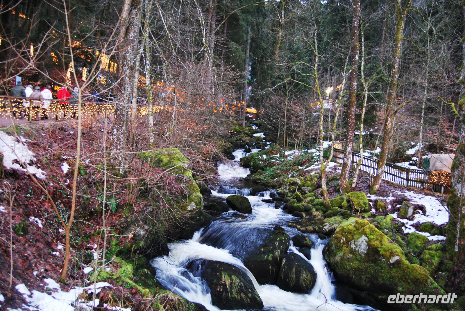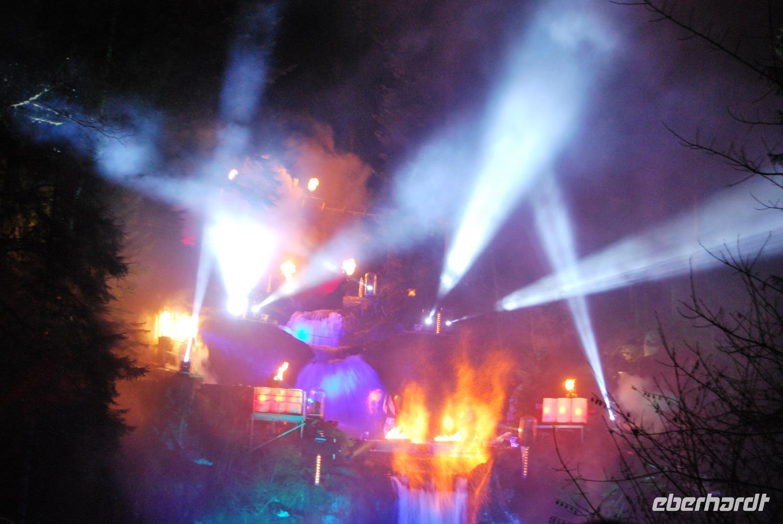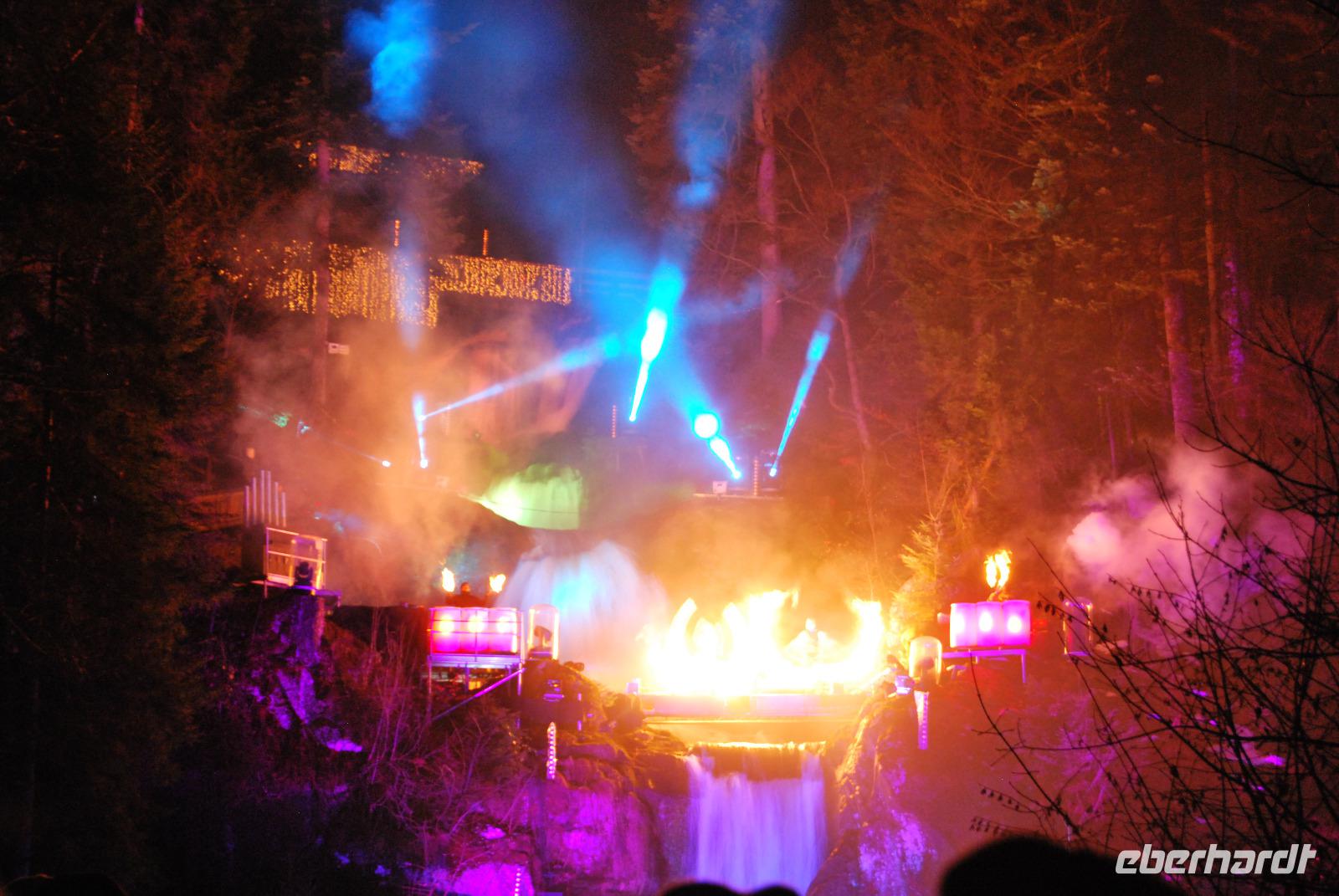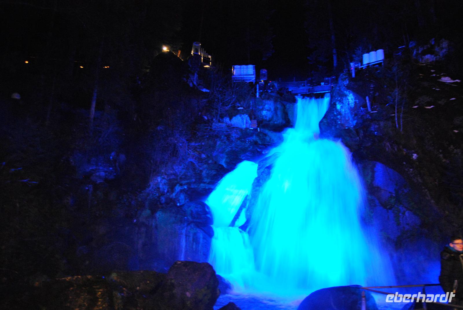 Gegen Abend, es wurde nun schon wieder dunkel, waren wir in Triberg. Nicht nur der imposante, höchste Wasserfall Deutschlands lockte uns, nein, auch das Fest um die Wasserkaskaden ließ uns an diesen Ort anreisen. Beeindruckend, durch und durch - Tausende, ja Millionen von Lichtern zogen sich durch den Wald die Hügel hinauf. Zahlreiche kleine Buden lockten mit Süßem, Deftigem und Flüssigem. Feuerkörbe wärmten die Menschen ein wenig. Viele Leute drängten sich über die schmalen Wege und Terrassen am Wasserfall entlang, denn es gab etwas zu sehen! Eine äußerst beeindruckende Feuer-Show direkt über dem Wasserfall faszinierte die Besucher des Triberger Winterzaubers. Eine Laser-Inszenierung, eine Feuerorgel und zahlreiche Feuerwalzen über dem Wasserfall beeindruckten.