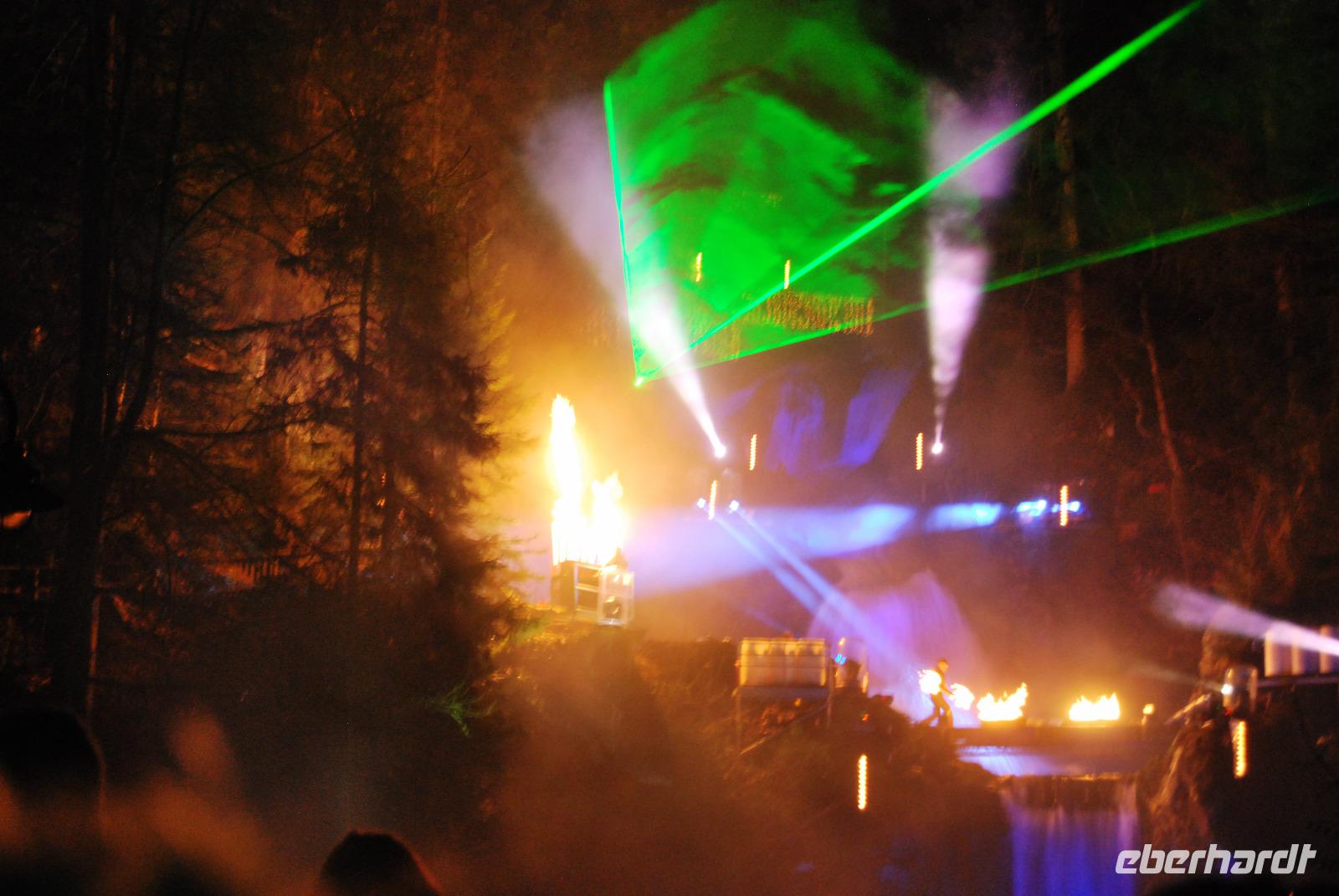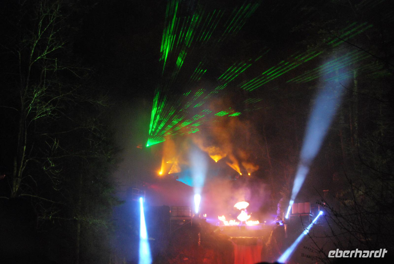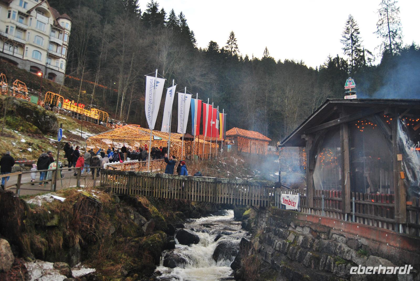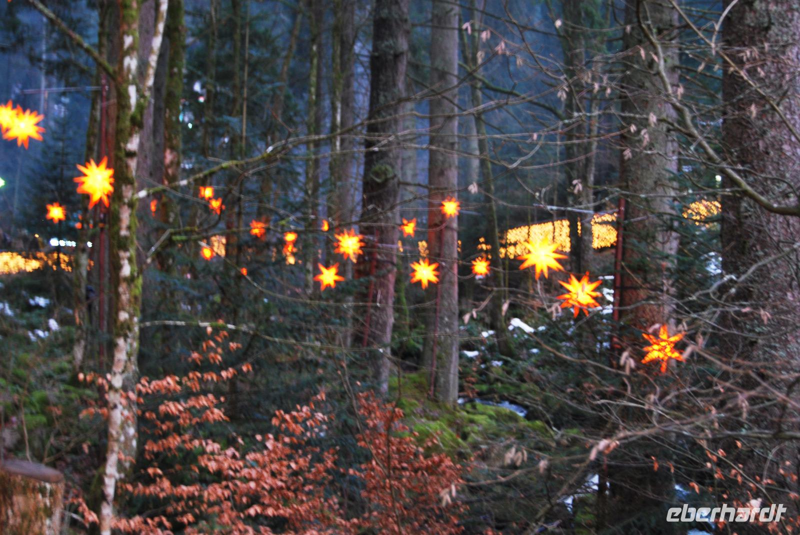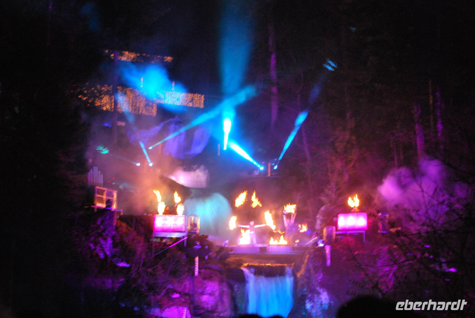 Gegen Abend, es wurde nun schon wieder dunkel, waren wir in Triberg. Nicht nur der imposante, höchste Wasserfall Deutschlands lockte uns, nein, auch das Fest um die Wasserkaskaden ließ uns an diesen Ort anreisen. Beeindruckend, durch und durch - Tausende, ja Millionen von Lichtern zogen sich durch den Wald die Hügel hinauf. Zahlreiche kleine Buden lockten mit Süßem, Deftigem und Flüssigem. Feuerkörbe wärmten die Menschen ein wenig. Viele Leute drängten sich über die schmalen Wege und Terrassen am Wasserfall entlang, denn es gab etwas zu sehen! Eine äußerst beeindruckende Feuer-Show direkt über dem Wasserfall faszinierte die Besucher des Triberger Winterzaubers. Eine Laser-Inszenierung, eine Feuerorgel und zahlreiche Feuerwalzen über dem Wasserfall beeindruckten.