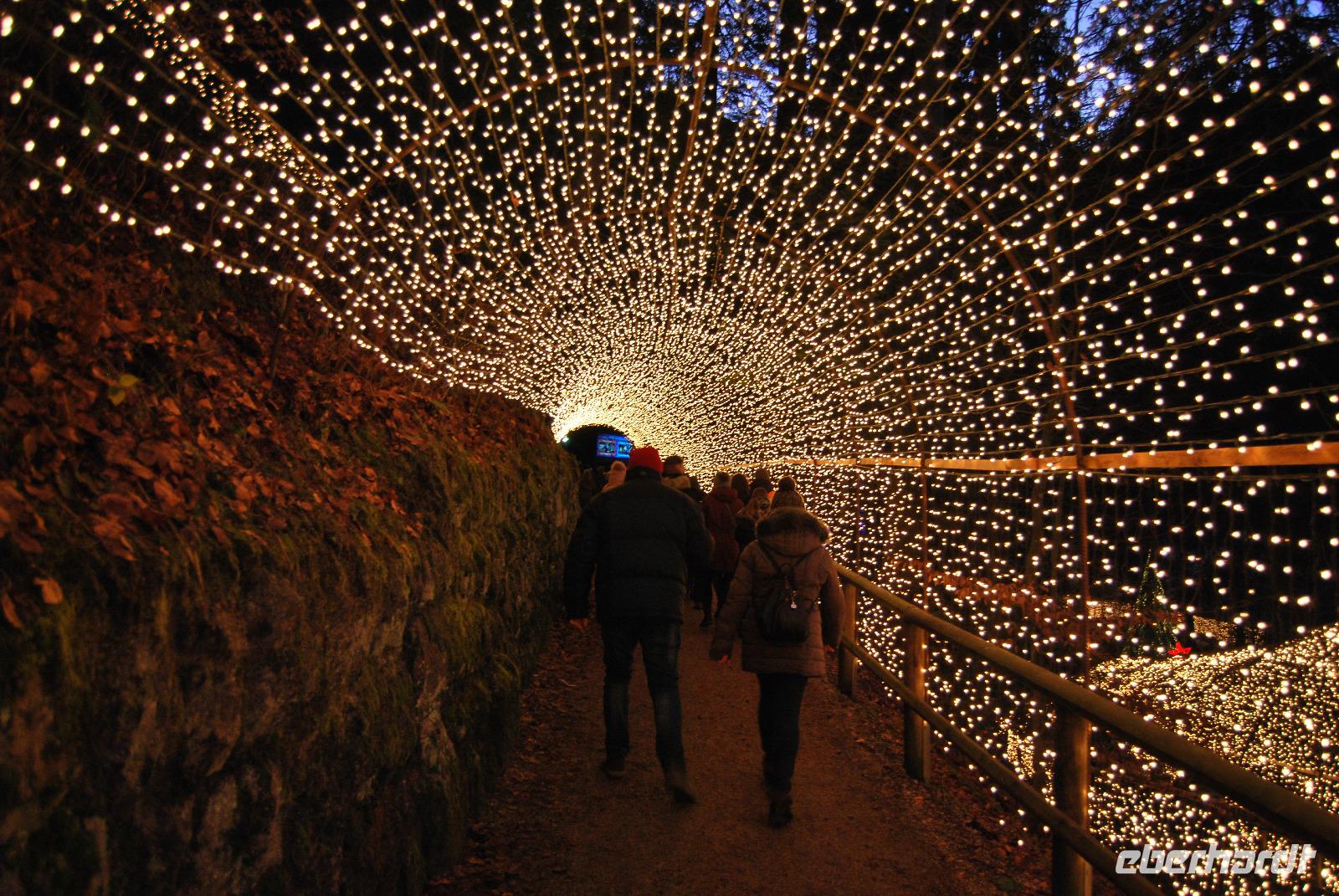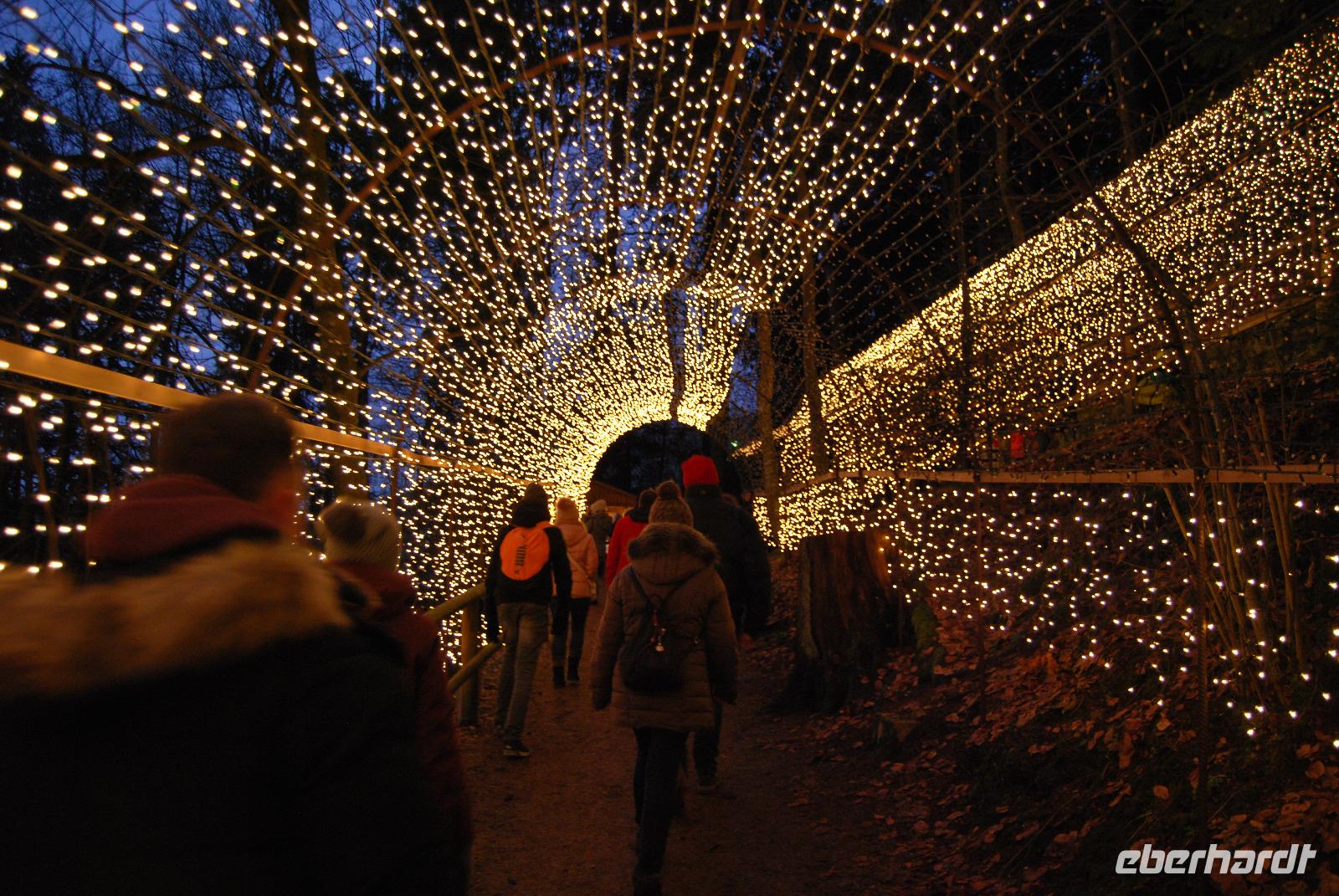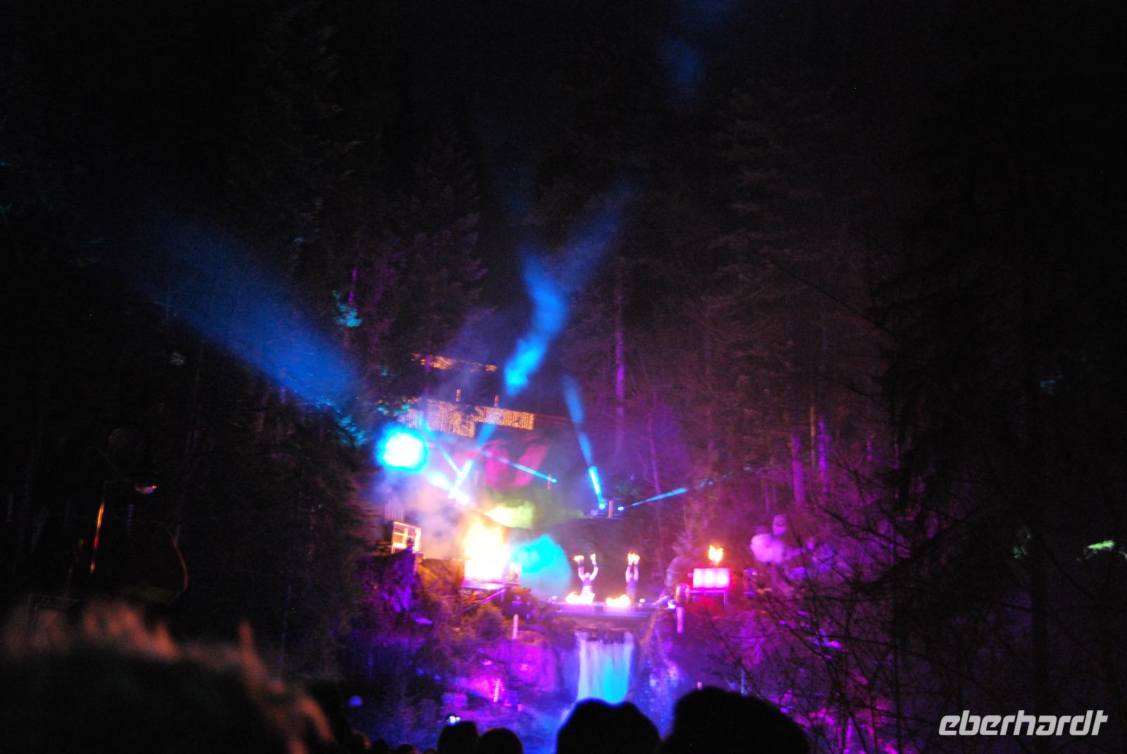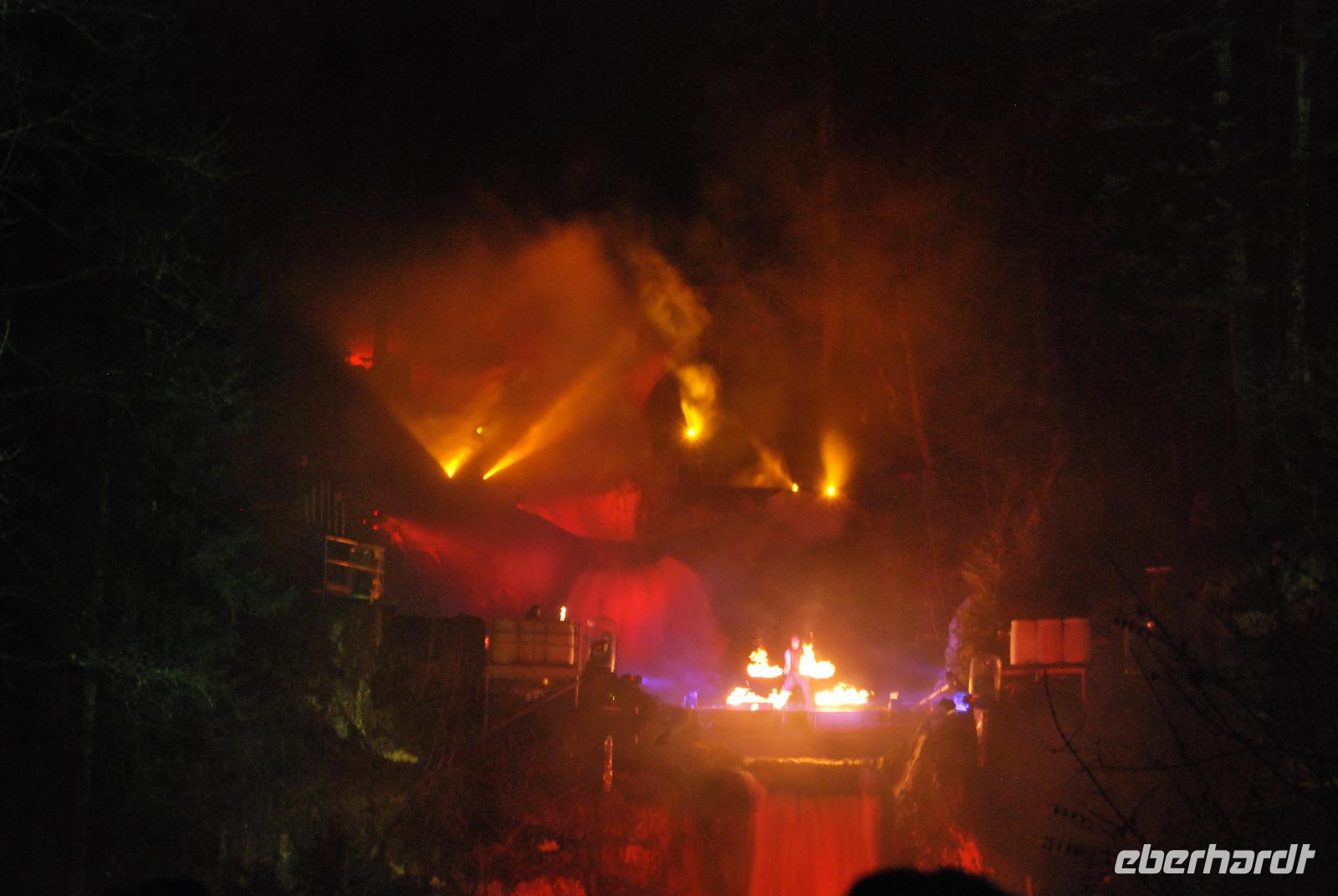 Gegen Abend, es wurde nun schon wieder dunkel, waren wir in Triberg. Nicht nur der imposante, höchste Wasserfall Deutschlands lockte uns, nein, auch das Fest um die Wasserkaskaden ließ uns an diesen Ort anreisen. Beeindruckend, durch und durch - Tausende, ja Millionen von Lichtern zogen sich durch den Wald die Hügel hinauf. Zahlreiche kleine Buden lockten mit Süßem, Deftigem und Flüssigem. Feuerkörbe wärmten die Menschen ein wenig. Viele Leute drängten sich über die schmalen Wege und Terrassen am Wasserfall entlang, denn es gab etwas zu sehen! Eine äußerst beeindruckende Feuer-Show direkt über dem Wasserfall faszinierte die Besucher des Triberger Winterzaubers. Eine Laser-Inszenierung, eine Feuerorgel und zahlreiche Feuerwalzen über dem Wasserfall beeindruckten.