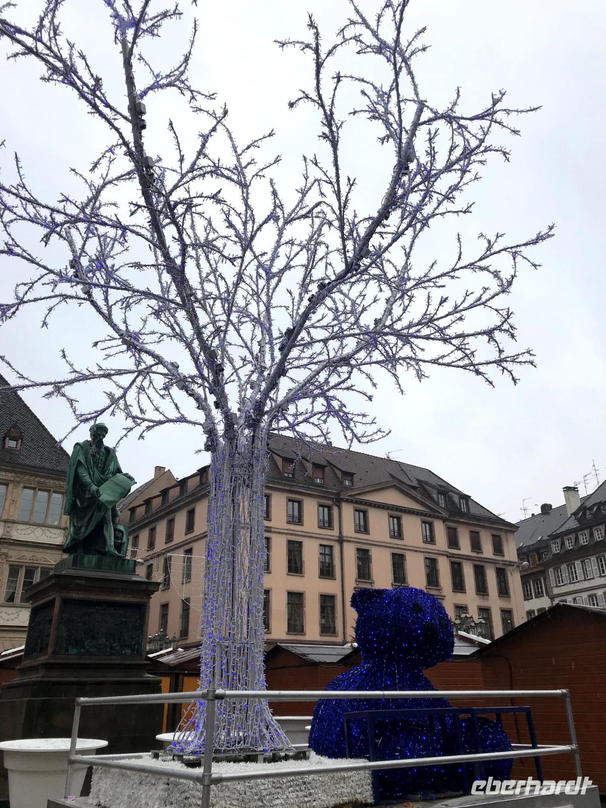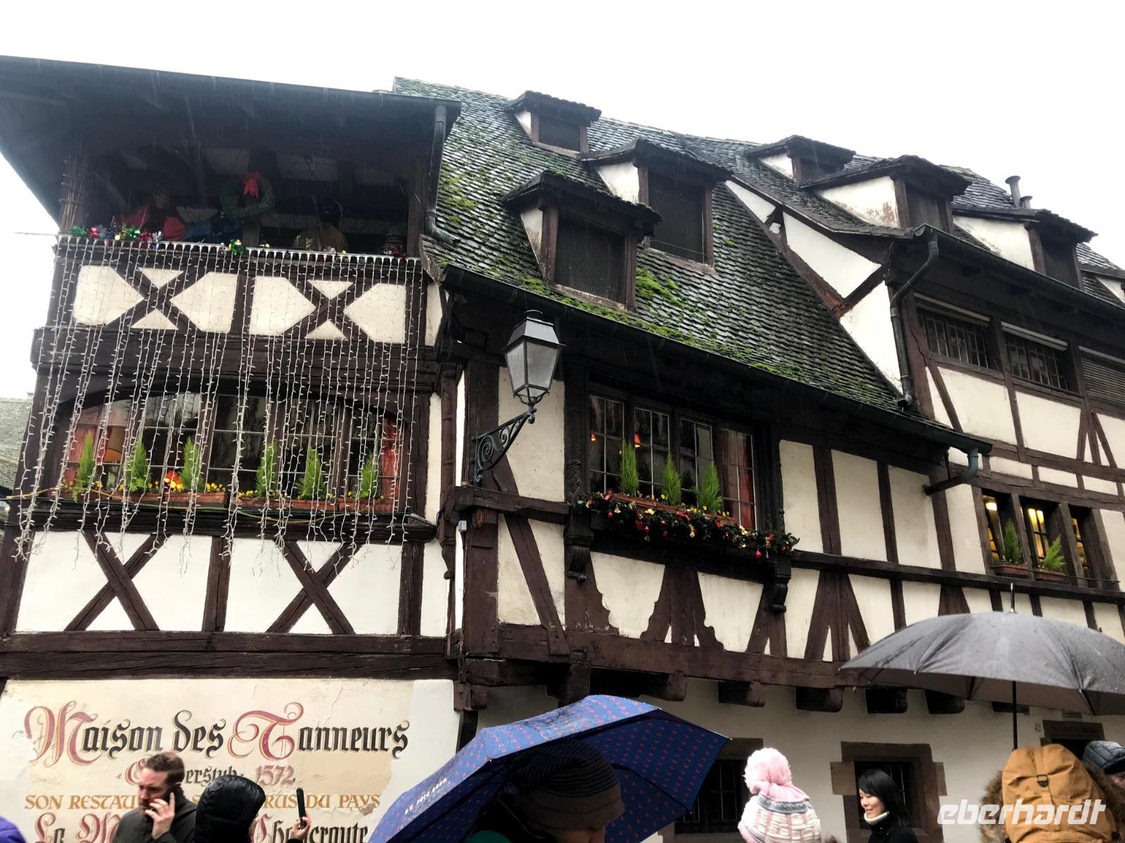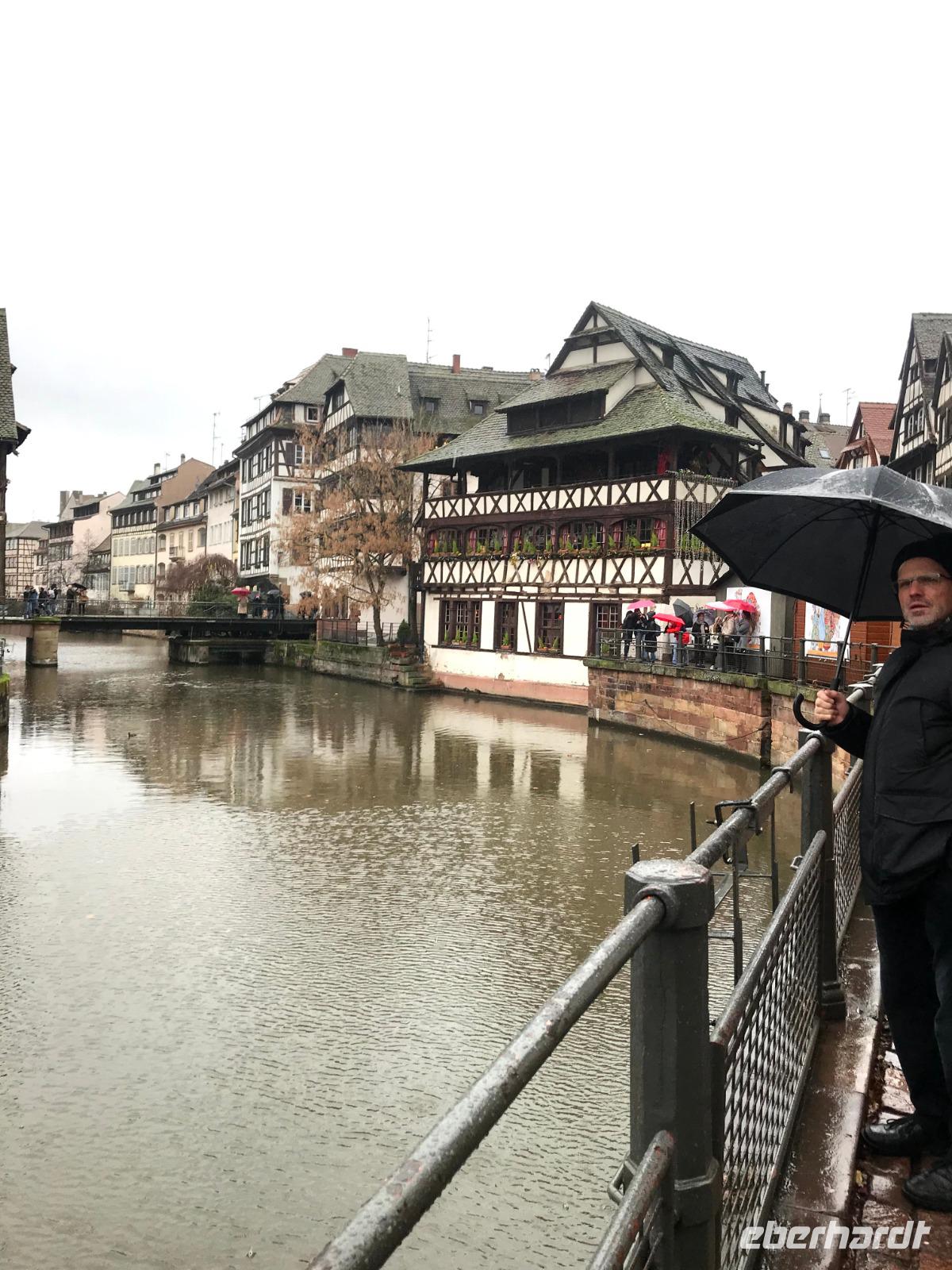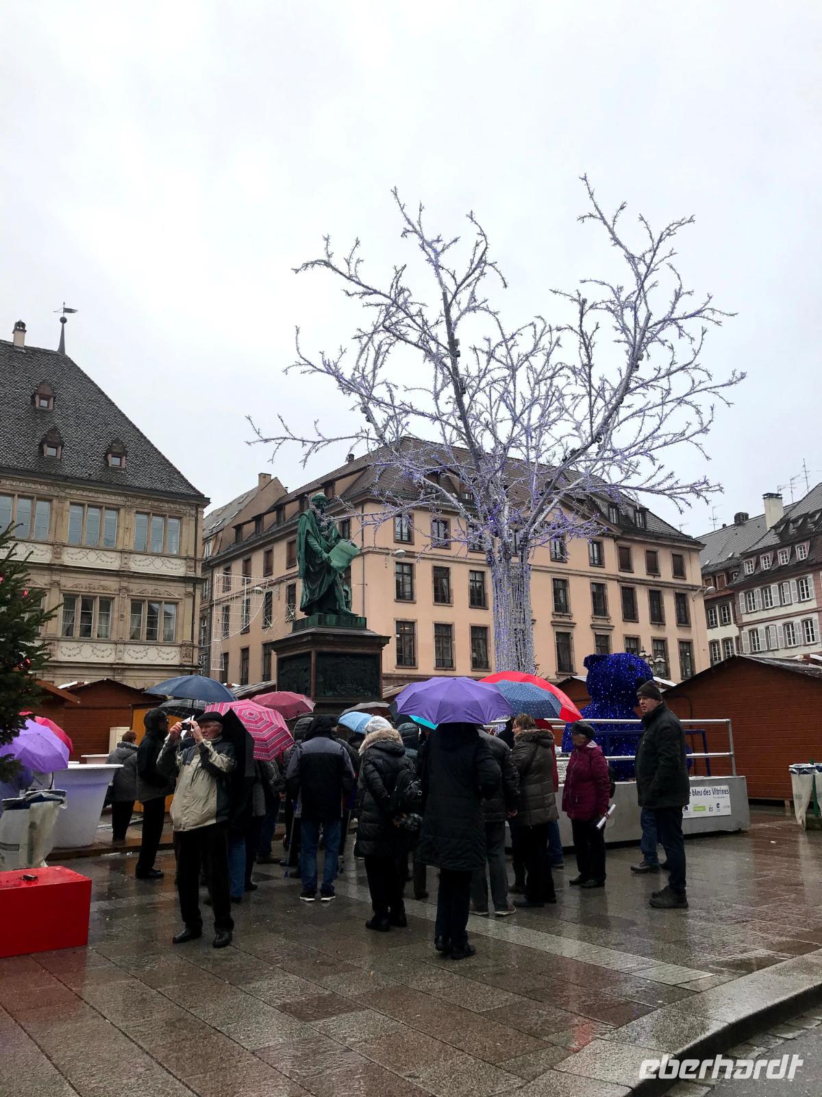 Natürlich bildet das sehenswerte gotische Münster mit seiner herrlich geschmückten Fassade den Mittelpunkt der Straßburger Altstadt! Auf dem Platz vor ihm tummelten sich trotz regnerischem Wetter auch die meisten Menschen auf dem größten der Festtagsmärkte. Hier gab es natürlich leckere Elsässer Spezialitäten und immer wieder Glühwein! Wir hatten Freizeit am Münsterplatz und auf dem Weihnachtsmarkt mit der Statue des Buchdruck-Erfinders Gutenberg, aber mit mir zogen einige Wetter-Unerschrockene noch zunächst auf einem Rundgang durch das als „Gerberviertel" bekannte Fachwerk-Areal von „Petite France". Hier gruppieren sich historische Häuser um kleinere Marktplätze, selbst zur Weihnachtszeit verkehren Ausflugsboote auf der Ill und man kann überall elsässische Spezialitäten wie etwa Flammekuchen, Sauerkraut oder „Knack" - einheimische, besonders gewürzte Knacker - probieren. Glühwein, aus Rot- oder Weißwein der Region ist natürlich ein Muss und man macht schnell die Erfahrung, dass der wirklich anders schmeckt als auf „unseren" Weihnachtsmärkten.